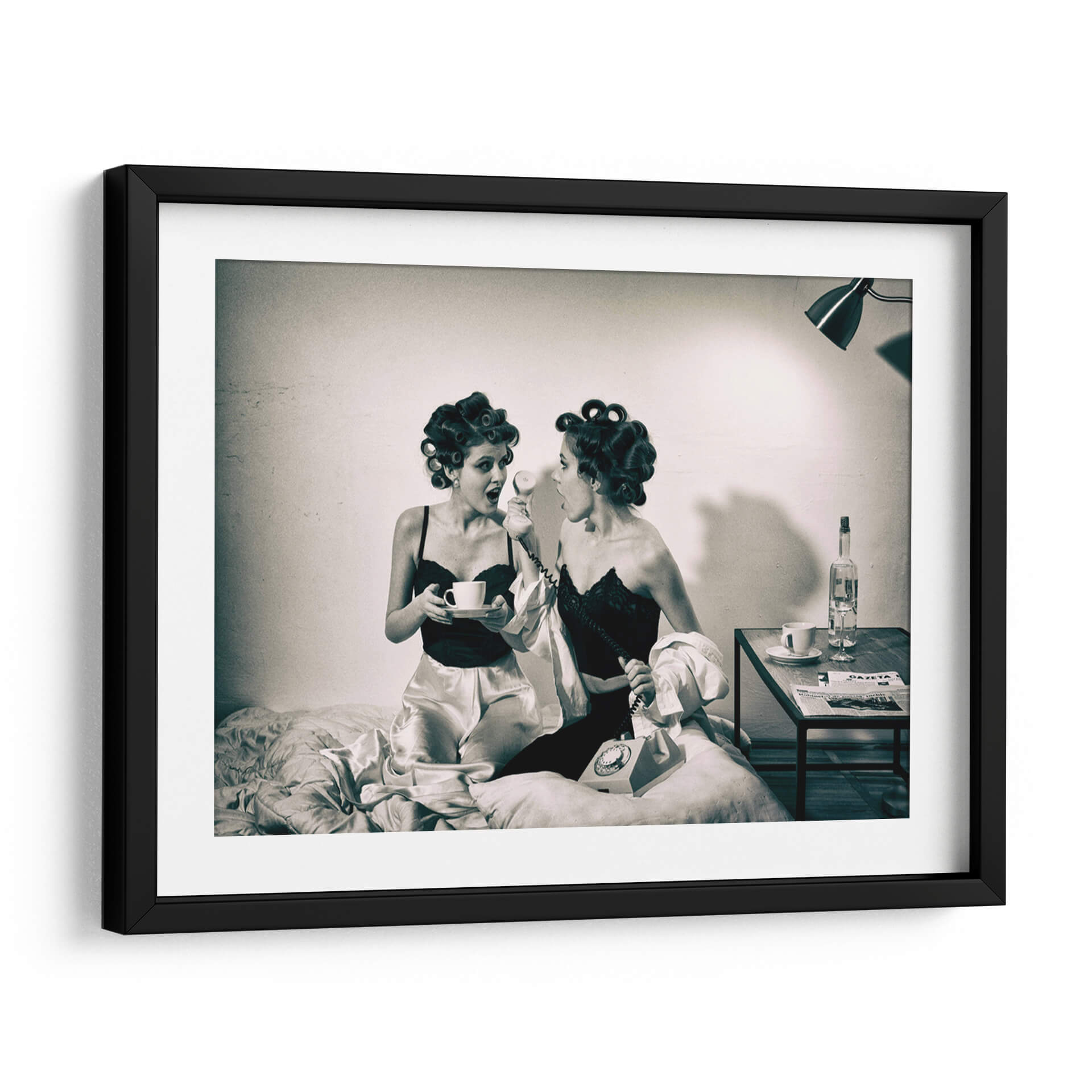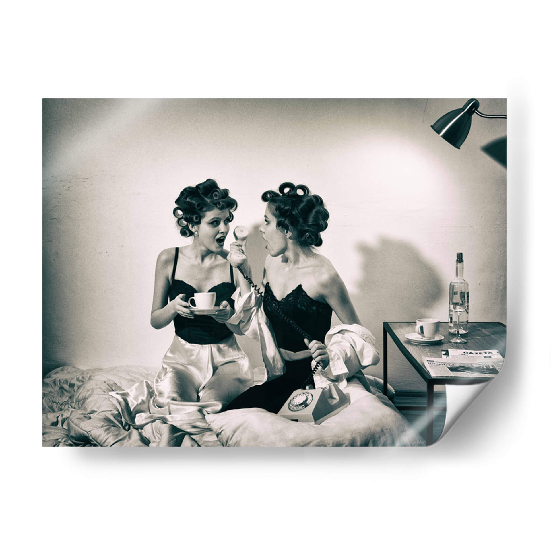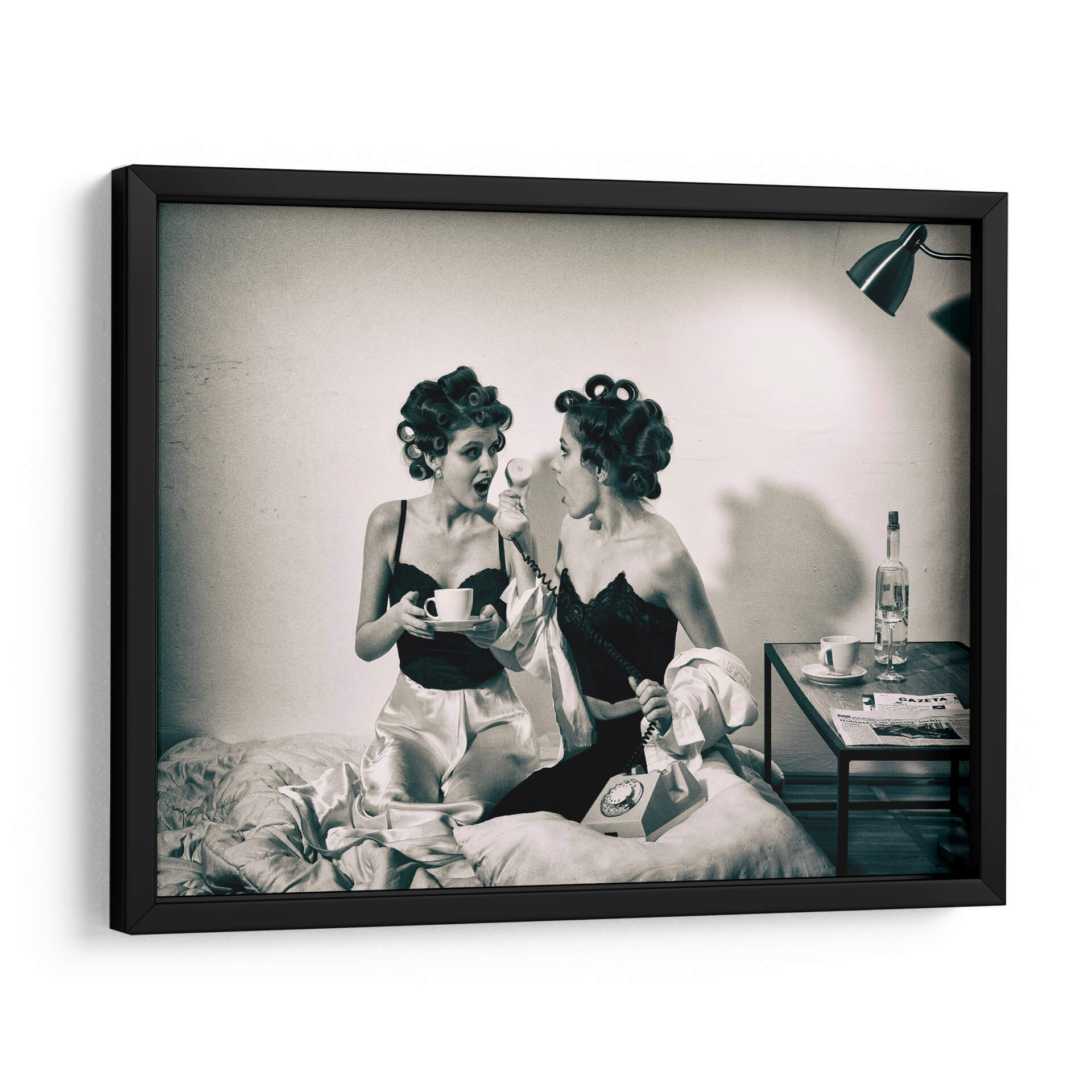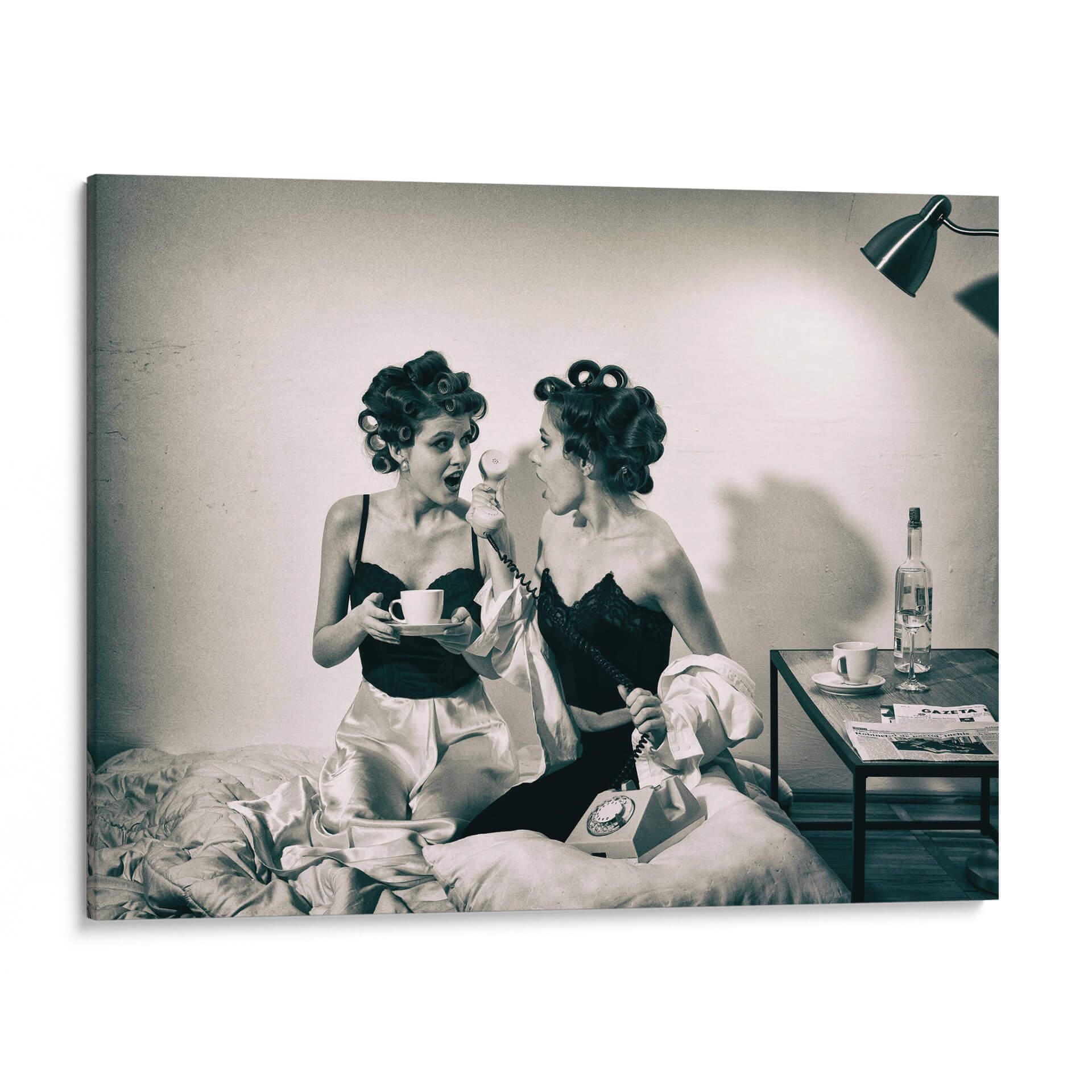 Captura la esencia de un momento íntimo y lleno de intriga con "Noticias previas a la televisión" de Mihai Bogdan R. Esta obra de arte, evocadora y estilizada, presenta a dos mujeres en un entorno retro, una sosteniendo una taza de café y la otra al teléfono, ambas con el cabello rizado y vestidas con lencería satinada y encaje. La fotografía en blanco y negro, con su iluminación dramática y atmósfera nostálgica, transporta al espectador a una época pasada, invitando a especular sobre la conversación y las noticias que están a punto de recibir. Los tonos sepia y las texturas sutiles añaden profundidad y un toque vintage. Este cuadro decorativo es perfecto para quienes buscan añadir un elemento de misterio y elegancia a su hogar u oficina. Ideal para salas de estar, dormitorios o incluso estudios, aportará un aire de sofisticación y una historia visual cautivadora. La composición centrada en las figuras y el diálogo implícito crea un punto focal intrigante que estimula la imaginación y genera conversaciones. Añade esta pieza única a tu colección y transforma tu espacio con su encanto atemporal y su narrativa sugerente.