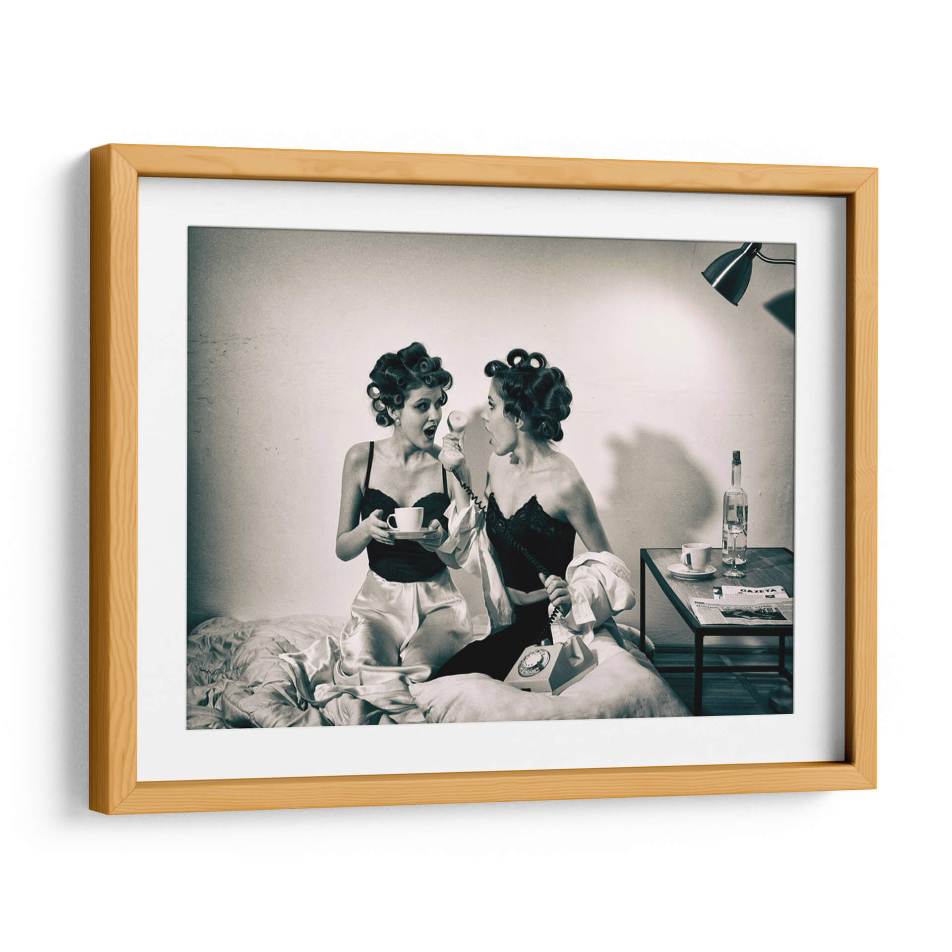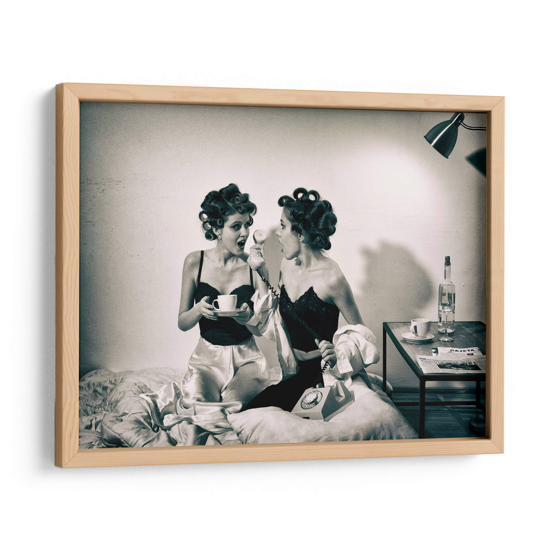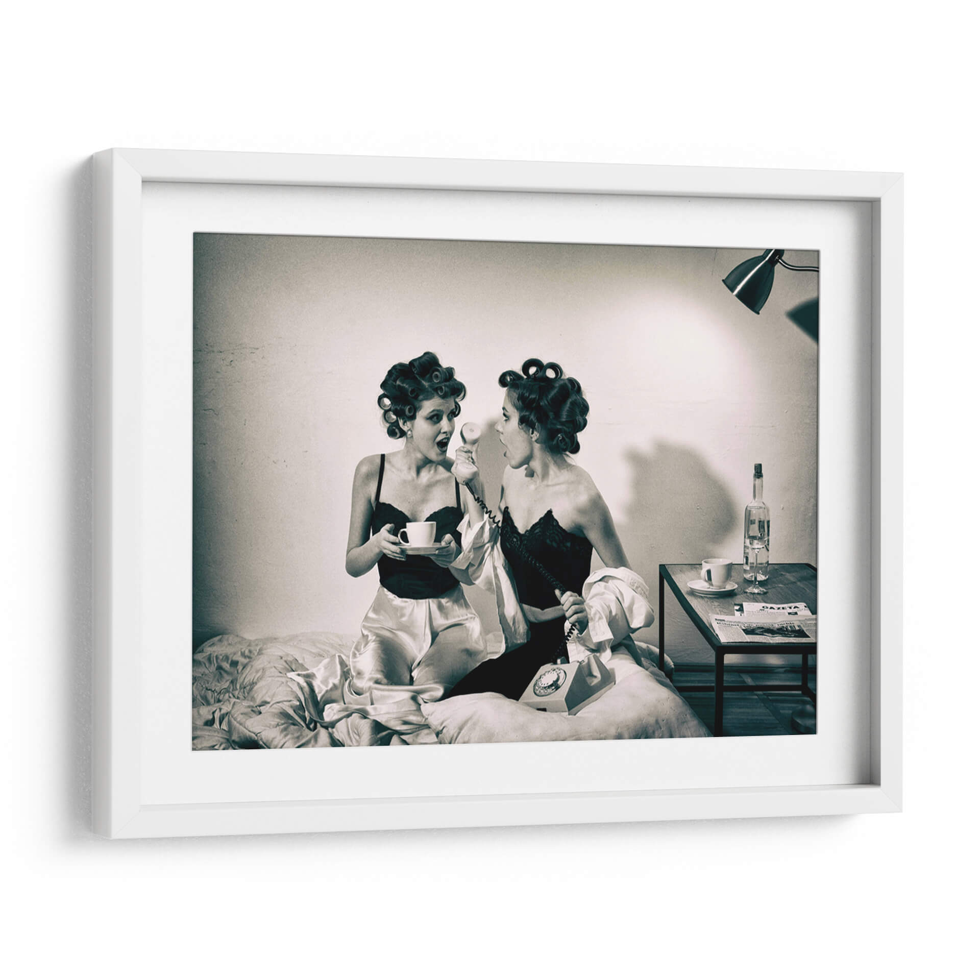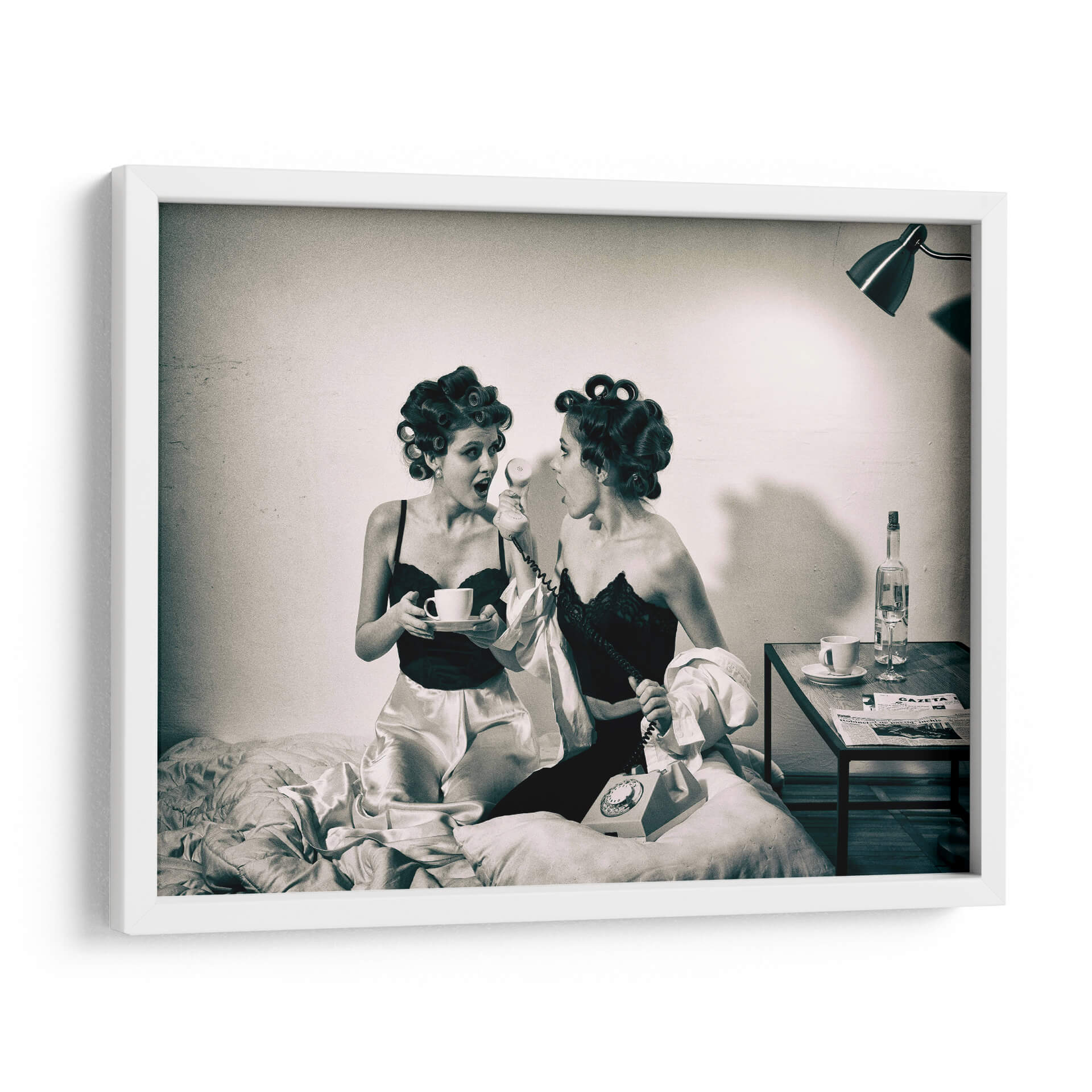Captura la esencia de un momento íntimo y lleno de intriga con "Noticias previas a la televisión" de Mihai Bogdan R. Esta obra de arte, evocadora y estilizada, presenta a dos mujeres en un entorno retro, una sosteniendo una taza de café y la otra al teléfono, ambas con el cabello rizado y vestidas con lencería satinada y encaje. La fotografía en blanco y negro, con su iluminación dramática y atmósfera nostálgica, transporta al espectador a una época pasada, invitando a especular sobre la conversación y las noticias que están a punto de recibir. Los tonos sepia y las texturas sutiles añaden profundidad y un toque vintage. Este cuadro decorativo es perfecto para quienes buscan añadir un elemento de misterio y elegancia a su hogar u oficina. Ideal para salas de estar, dormitorios o incluso estudios, aportará un aire de sofisticación y una historia visual cautivadora. La composición centrada en las figuras y el diálogo implícito crea un punto focal intrigante que estimula la imaginación y genera conversaciones. Añade esta pieza única a tu colección y transforma tu espacio con su encanto atemporal y su narrativa sugerente.
