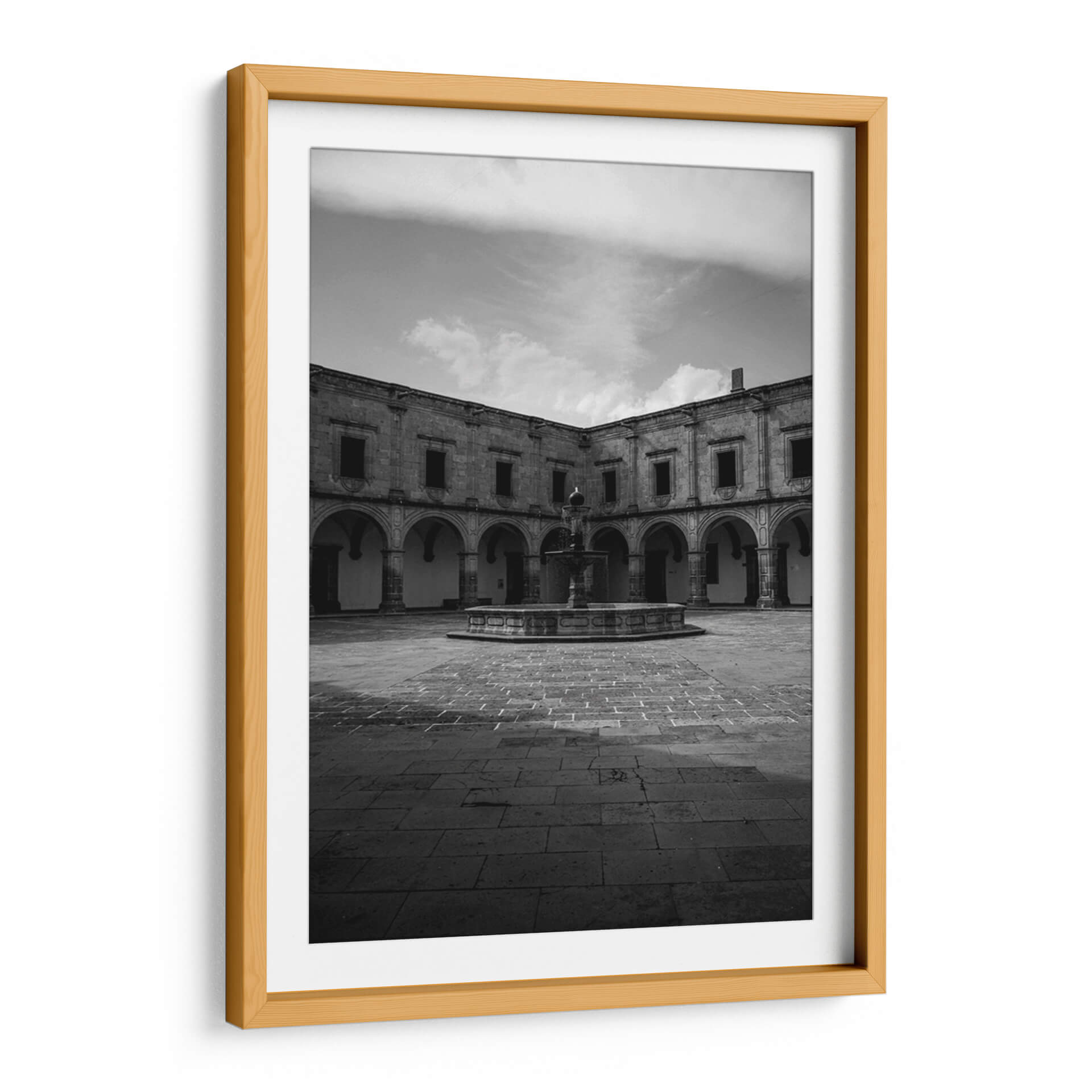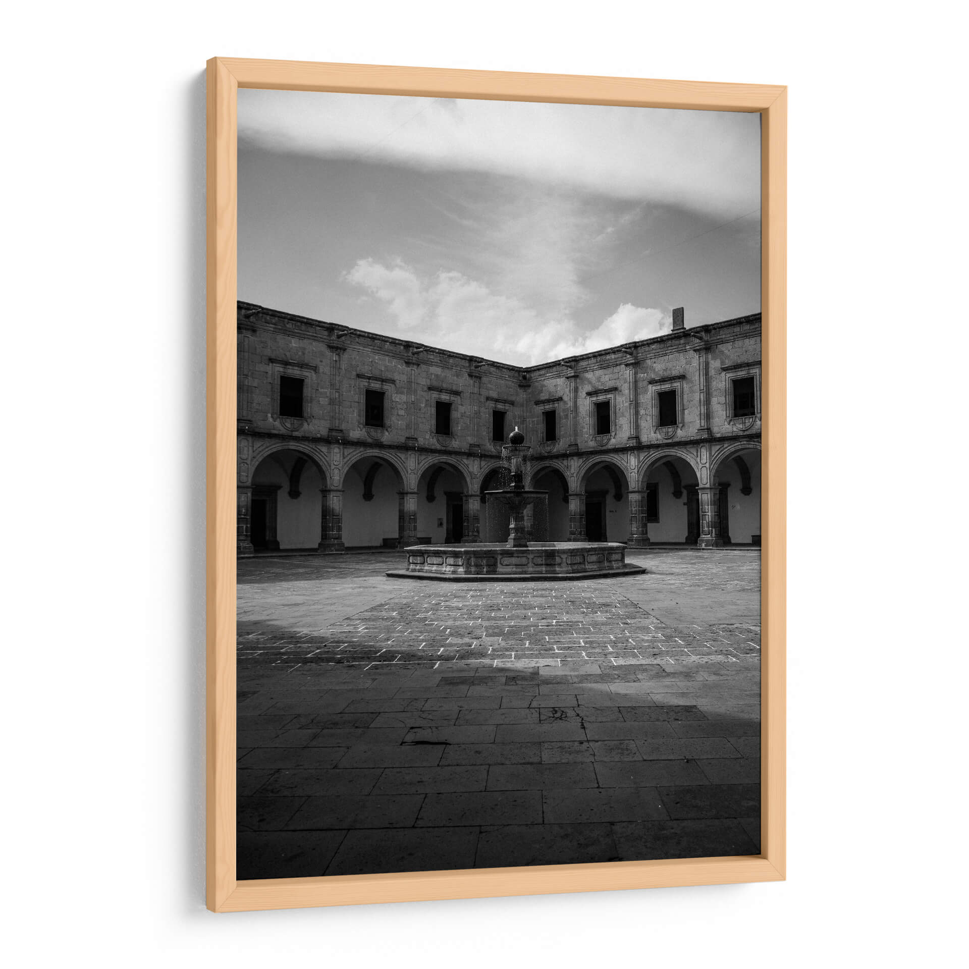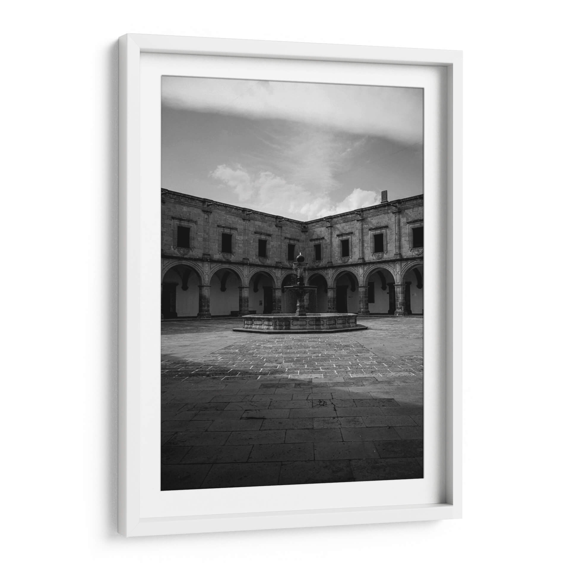 Sumérgete en la serenidad arquitectónica con nuestro cuadro "Silencio eterno en el patio del Palacio Clavijero". Esta fotografía en blanco y negro captura la majestuosidad de un patio colonial, destacando la simetría de sus arcos, la textura de la piedra y el juego de luces y sombras que evocan una profunda calma. La fuente central, rodeada por el empedrado clásico, actúa como el corazón de esta escena atemporal, invitando a la contemplación y la paz. La ausencia de color realza la riqueza de las formas y la atmósfera introspectiva, haciendo de esta obra un elemento decorativo sofisticado para cualquier espacio que busque transmitir elegancia y tranquilidad. Ideal para salones, estudios u oficinas, este cuadro decorativo en blanco y negro es perfecto para añadir un toque de historia y serenidad a tu hogar. Su composición equilibrada y el detallado trabajo arquitectónico ofrecen una ventana a un momento de quietud, invitando a la reflexión y al disfrute del arte visual.
