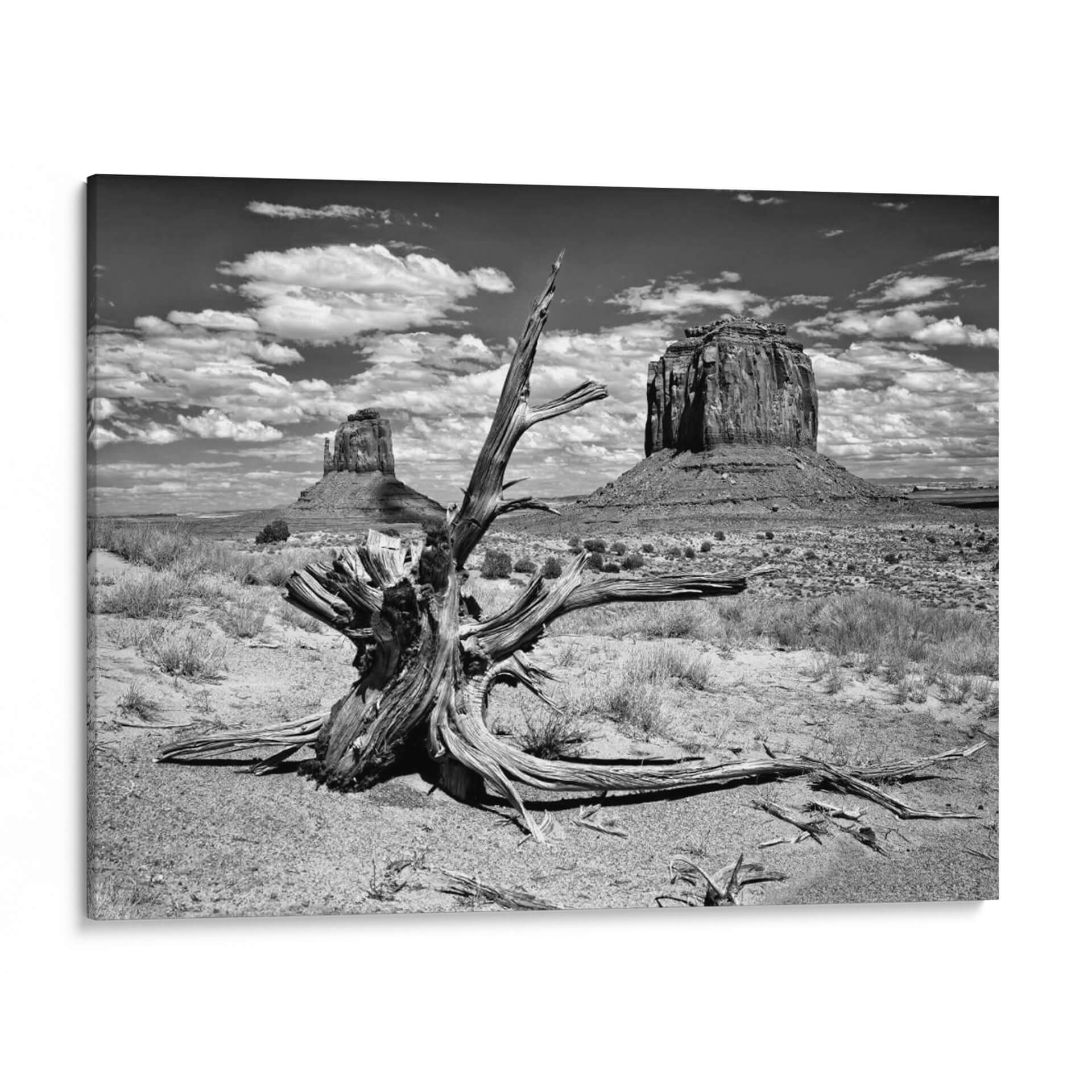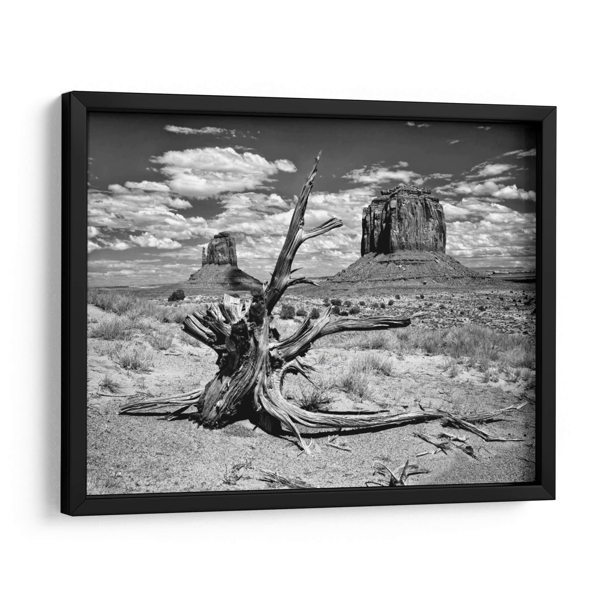 Sumérgete en la aridez majestuosa y la belleza cruda del desierto con "Visión Del Desierto De Bandw V" de David Drost. Esta obra maestra fotográfica en blanco y negro captura la esencia de un paisaje implacable pero fascinante. En primer plano, un tronco de árbol seco y retorcido se alza como un centinela silente, sus formas intrincadas y texturas desgastadas por el tiempo cuentan historias de resistencia y transformación. Al fondo, las imponentes formaciones rocosas del desierto, bañadas por la luz dramática y las nubes turbulentas, crean una sensación de escala épica y atemporalidad. La paleta monocromática, acentuada por los contrastes entre luces y sombras, intensifica la atmósfera de soledad y grandeza, invitando a la contemplación profunda. Este cuadro decorativo es perfecto para añadir un toque de carácter y serenidad a cualquier espacio, ya sea una sala de estar moderna, un estudio o una oficina que busque inspiración en la fuerza de la naturaleza. Ideal para amantes de la fotografía de paisajes y del arte que evoca emociones potentes y reflexivas, "Visión Del Desierto De Bandw V" es una adición impactante a tu colección de arte mural.