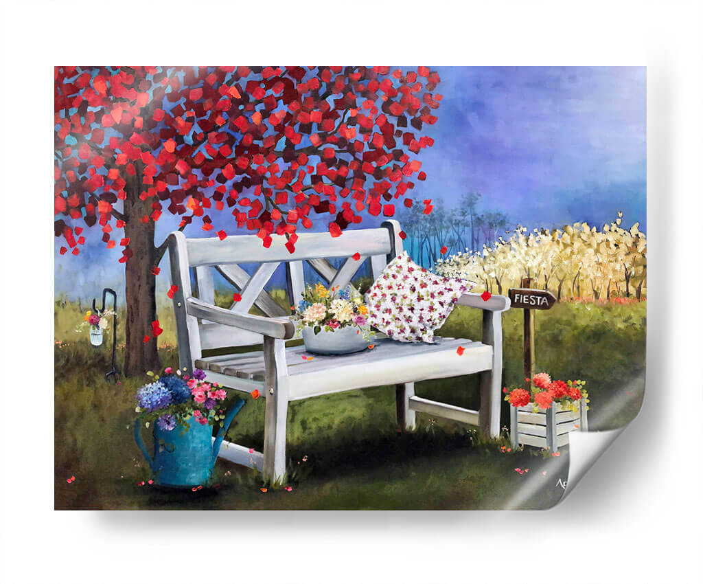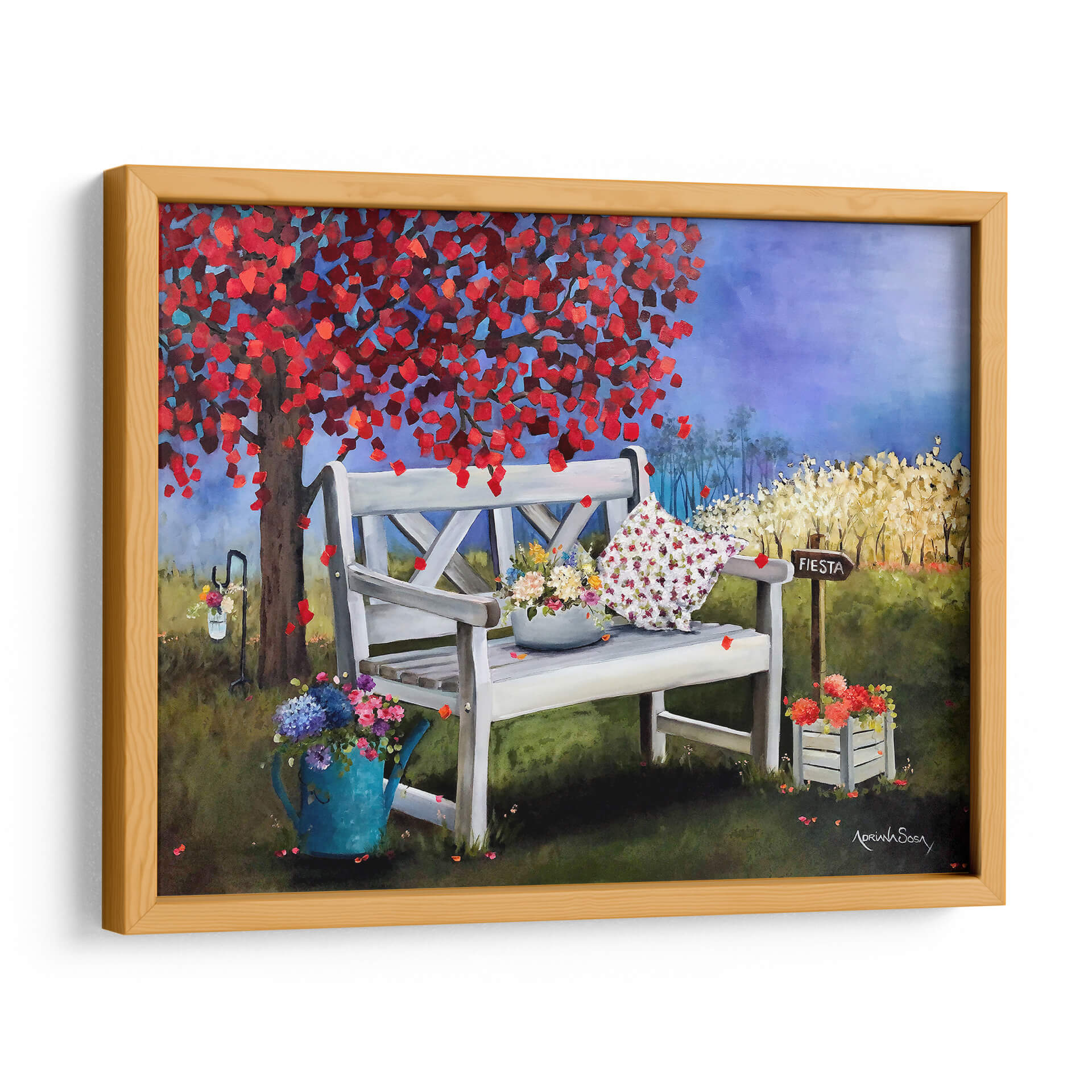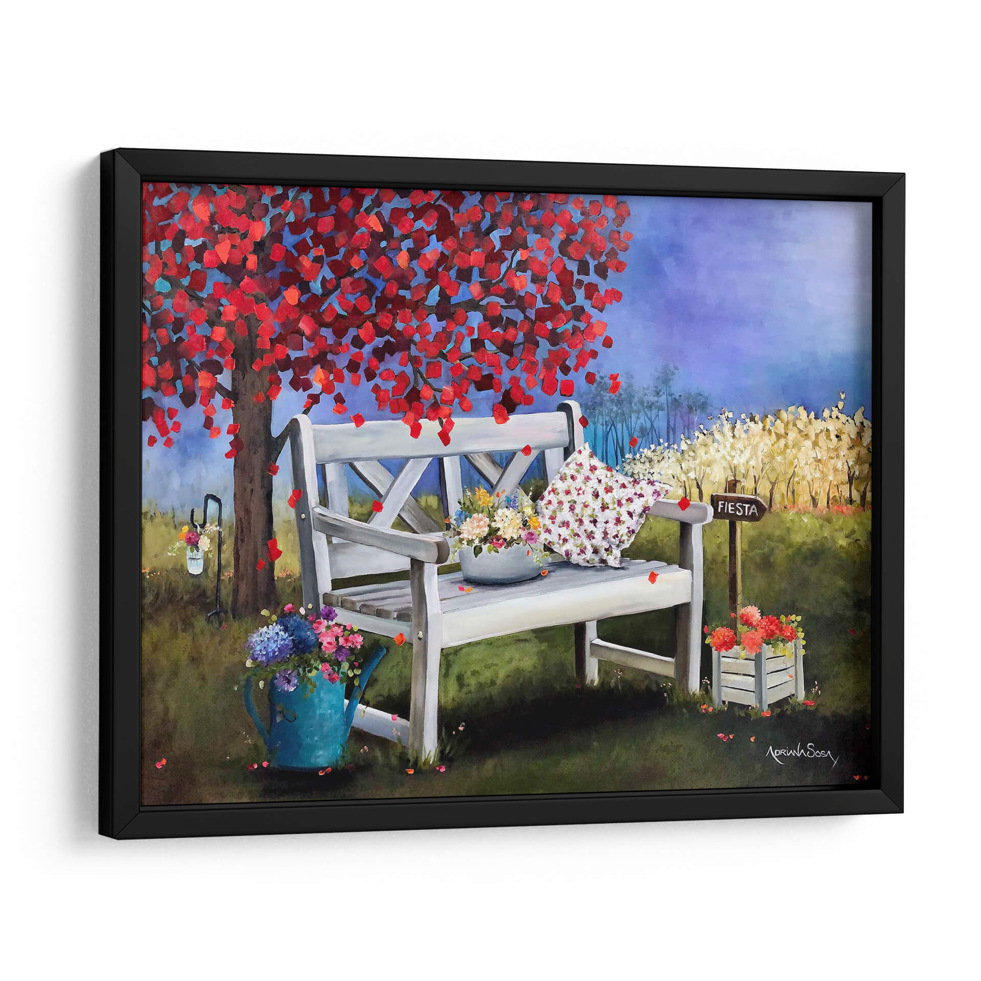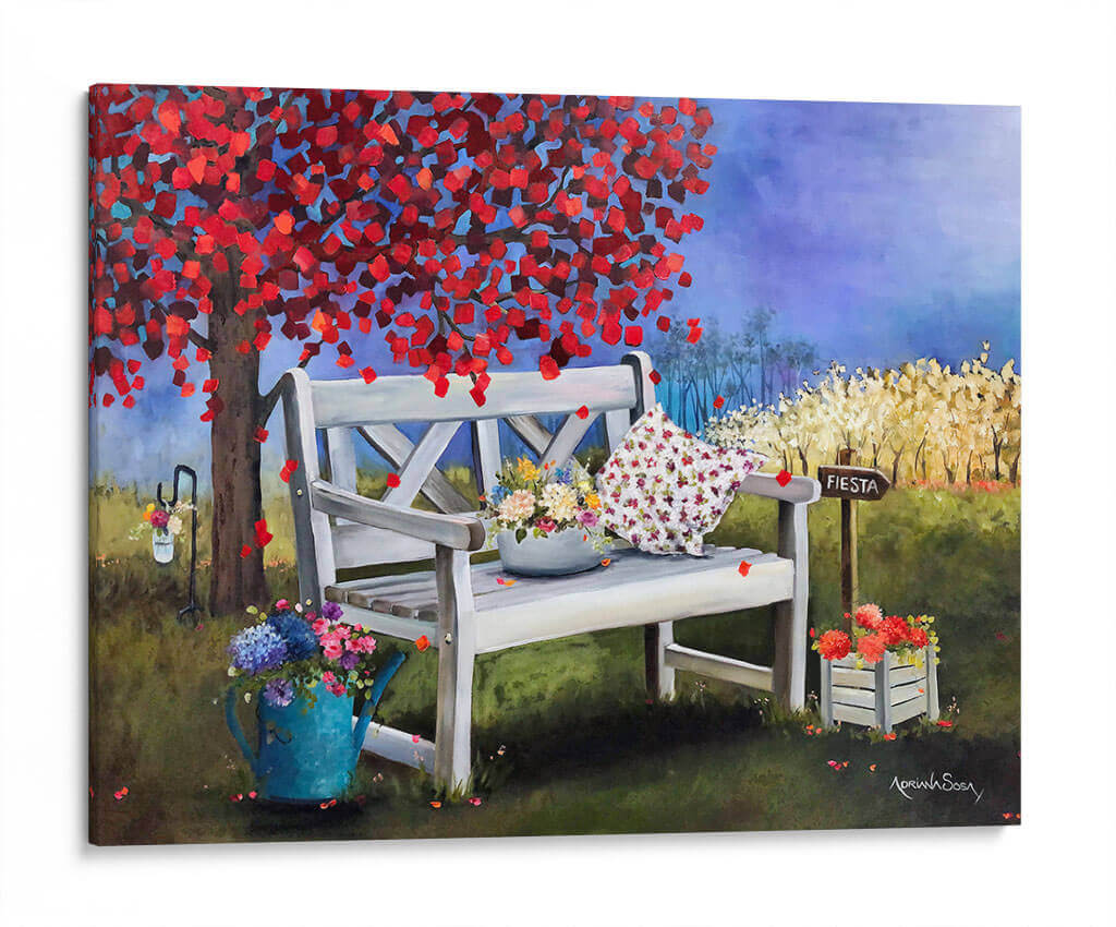 Sumérgete en la serenidad y el encanto de "A tu encuentro", una obra de Adriana Sosa que captura la esencia de un jardín idílico y acogedor. Este cuadro decorativo te transporta a un remanso de paz, donde un banco de madera espera bajo la sombra de un árbol frondoso cuyas hojas rojas caen suavemente, creando un efecto de pétalos danzantes en el aire. La vibrante paleta de colores, dominada por el azul profundo del cielo, los intensos rojos de las hojas y la multitud de tonos florales, inunda la escena con vida y alegría. Detalle de flores en un cubo de riego azul y una caja de madera añaden un toque rústico y auténtico. La composición, con el banco como punto central, invita a la contemplación y al descanso, mientras que el letrero "Fiesta" añade un guiño juguetón y festivo. Ideal para quienes buscan infundir calidez, color y una atmósfera de ensueño en sus hogares u oficinas, esta pieza es perfecta para salas de estar, comedores o incluso estudios, aportando un toque de naturaleza y optimismo. Descubre la belleza atemporal de la pintura figurativa contemporánea con "A tu encuentro", una invitación a celebrar la vida y los pequeños placeres.