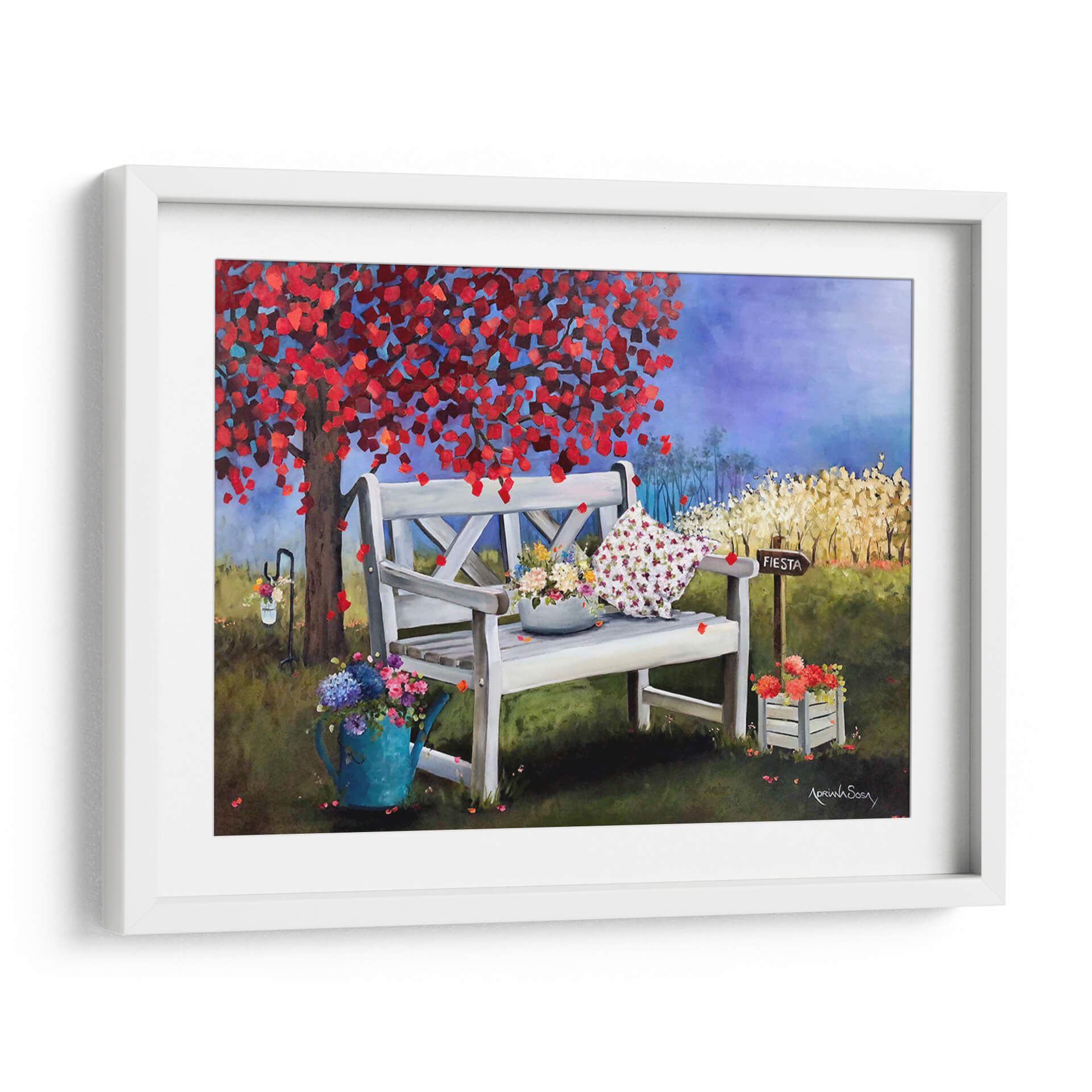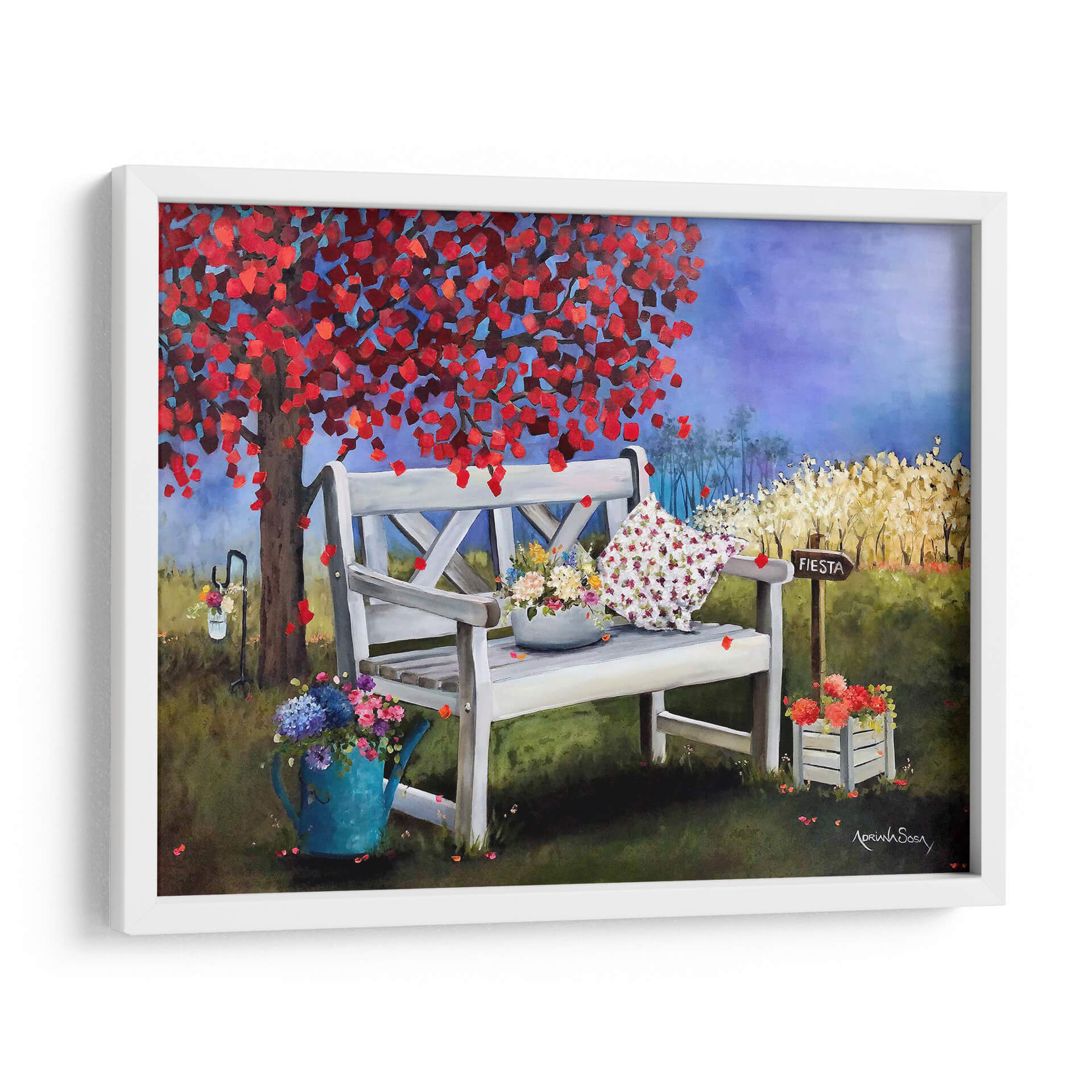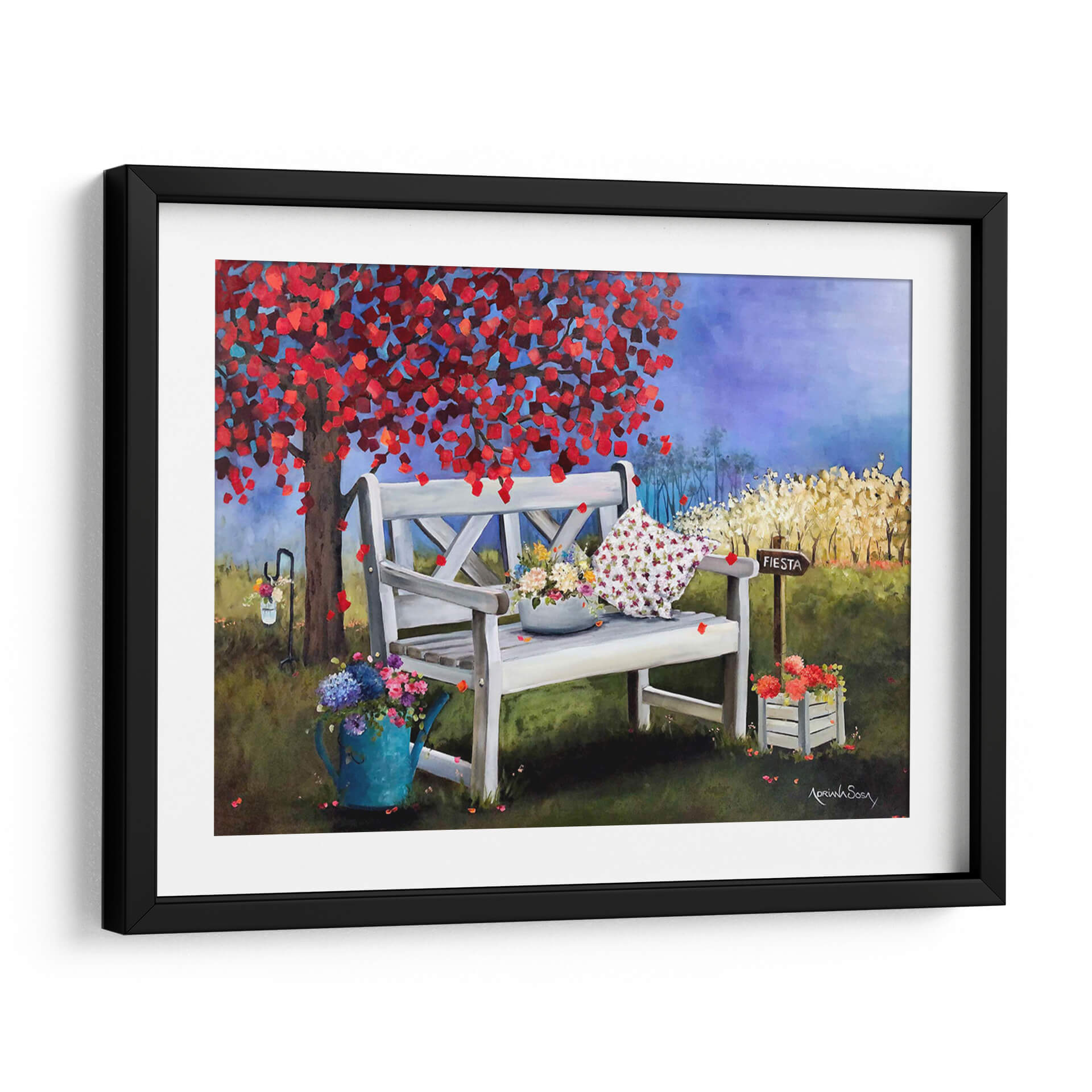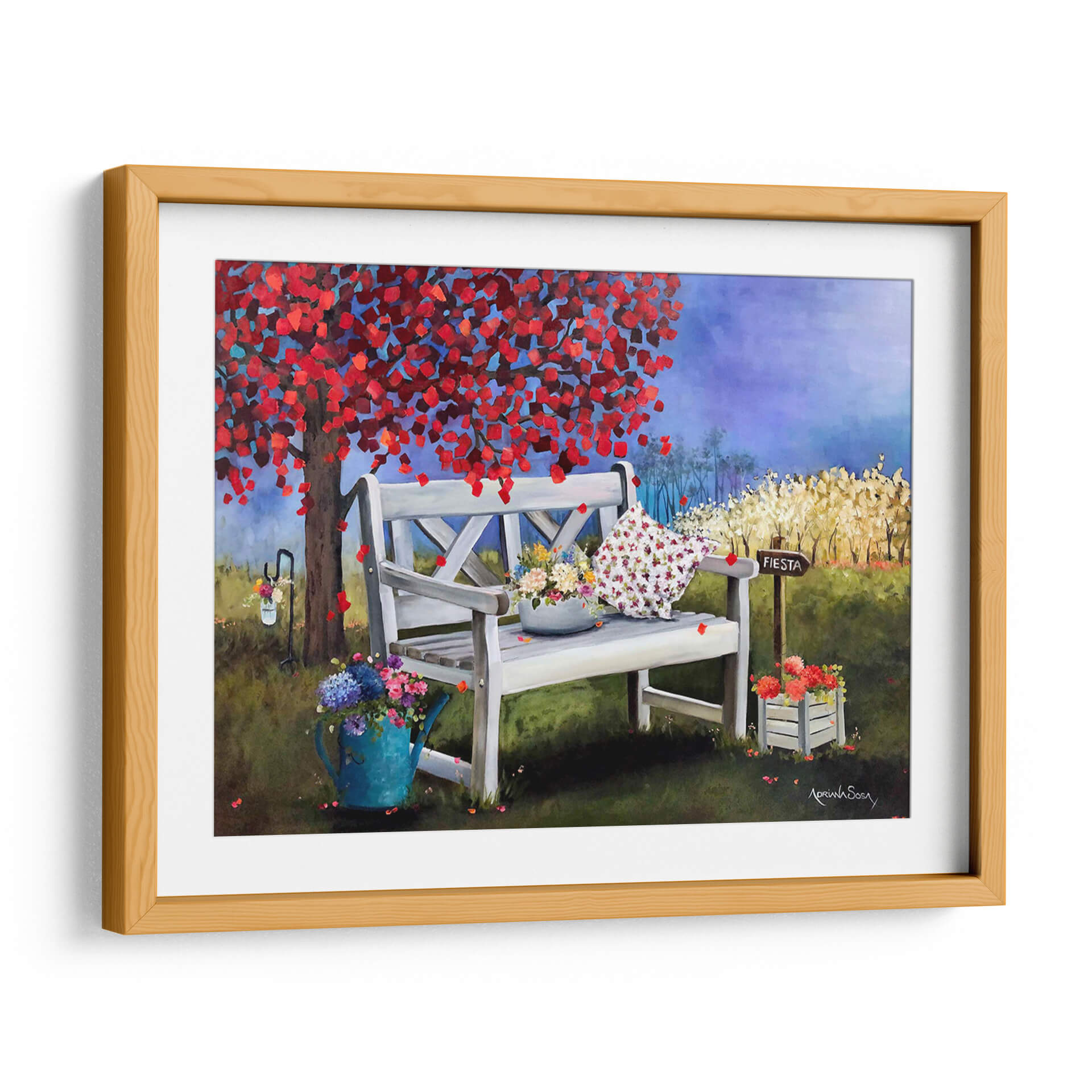 Sumérgete en la serenidad y el encanto de "A tu encuentro", una obra de Adriana Sosa que captura la esencia de un jardín idílico y acogedor. Este cuadro decorativo te transporta a un remanso de paz, donde un banco de madera espera bajo la sombra de un árbol frondoso cuyas hojas rojas caen suavemente, creando un efecto de pétalos danzantes en el aire. La vibrante paleta de colores, dominada por el azul profundo del cielo, los intensos rojos de las hojas y la multitud de tonos florales, inunda la escena con vida y alegría. Detalle de flores en un cubo de riego azul y una caja de madera añaden un toque rústico y auténtico. La composición, con el banco como punto central, invita a la contemplación y al descanso, mientras que el letrero "Fiesta" añade un guiño juguetón y festivo. Ideal para quienes buscan infundir calidez, color y una atmósfera de ensueño en sus hogares u oficinas, esta pieza es perfecta para salas de estar, comedores o incluso estudios, aportando un toque de naturaleza y optimismo. Descubre la belleza atemporal de la pintura figurativa contemporánea con "A tu encuentro", una invitación a celebrar la vida y los pequeños placeres.