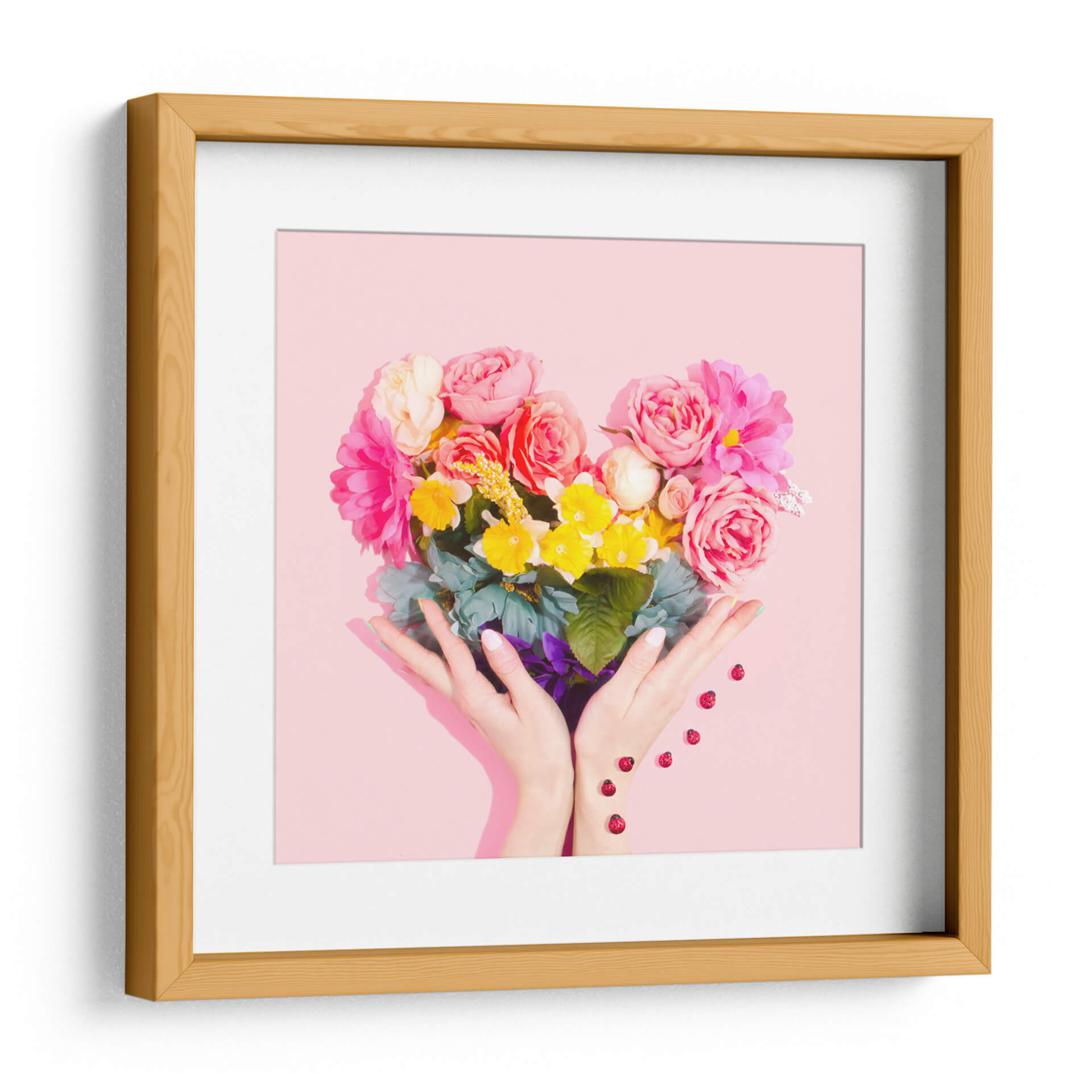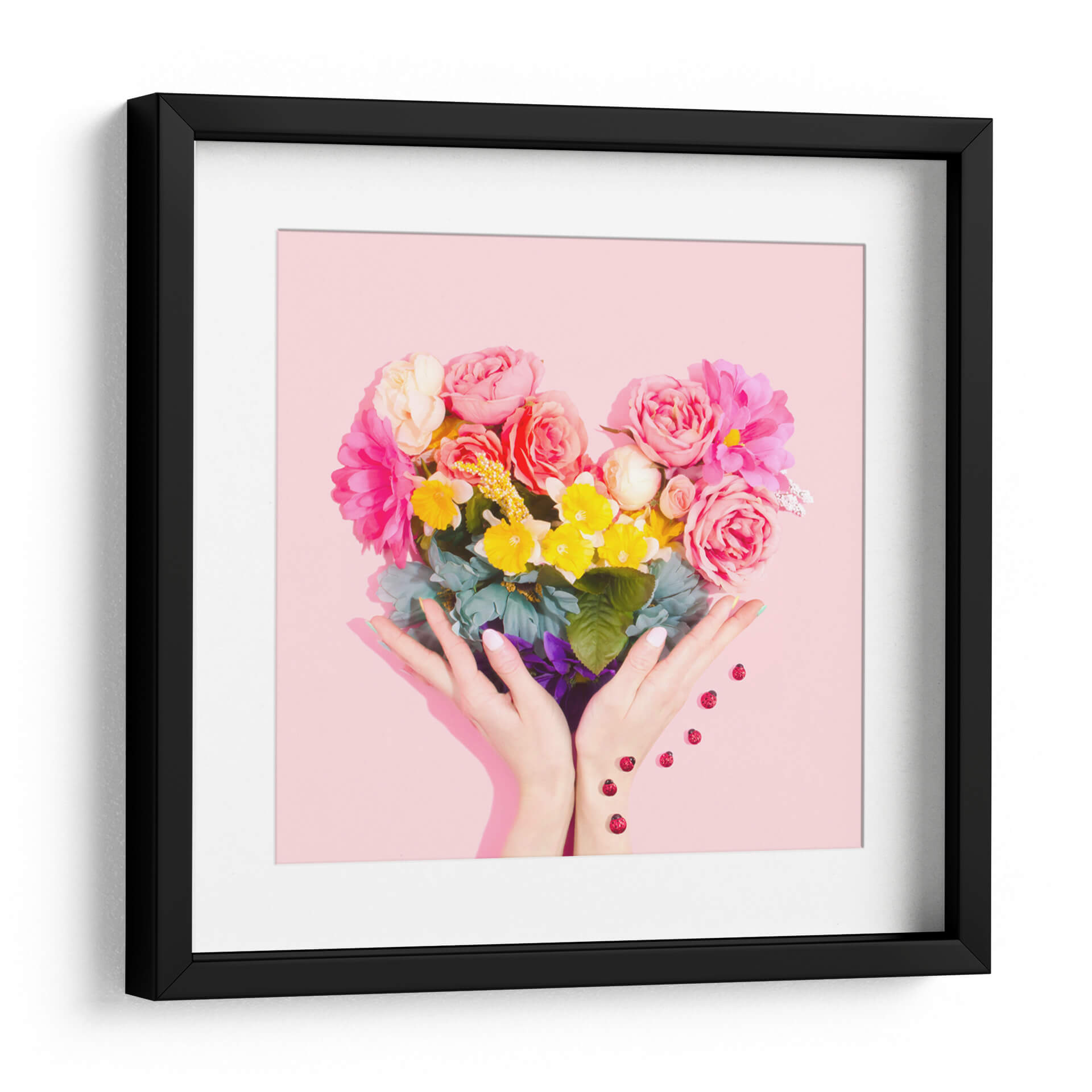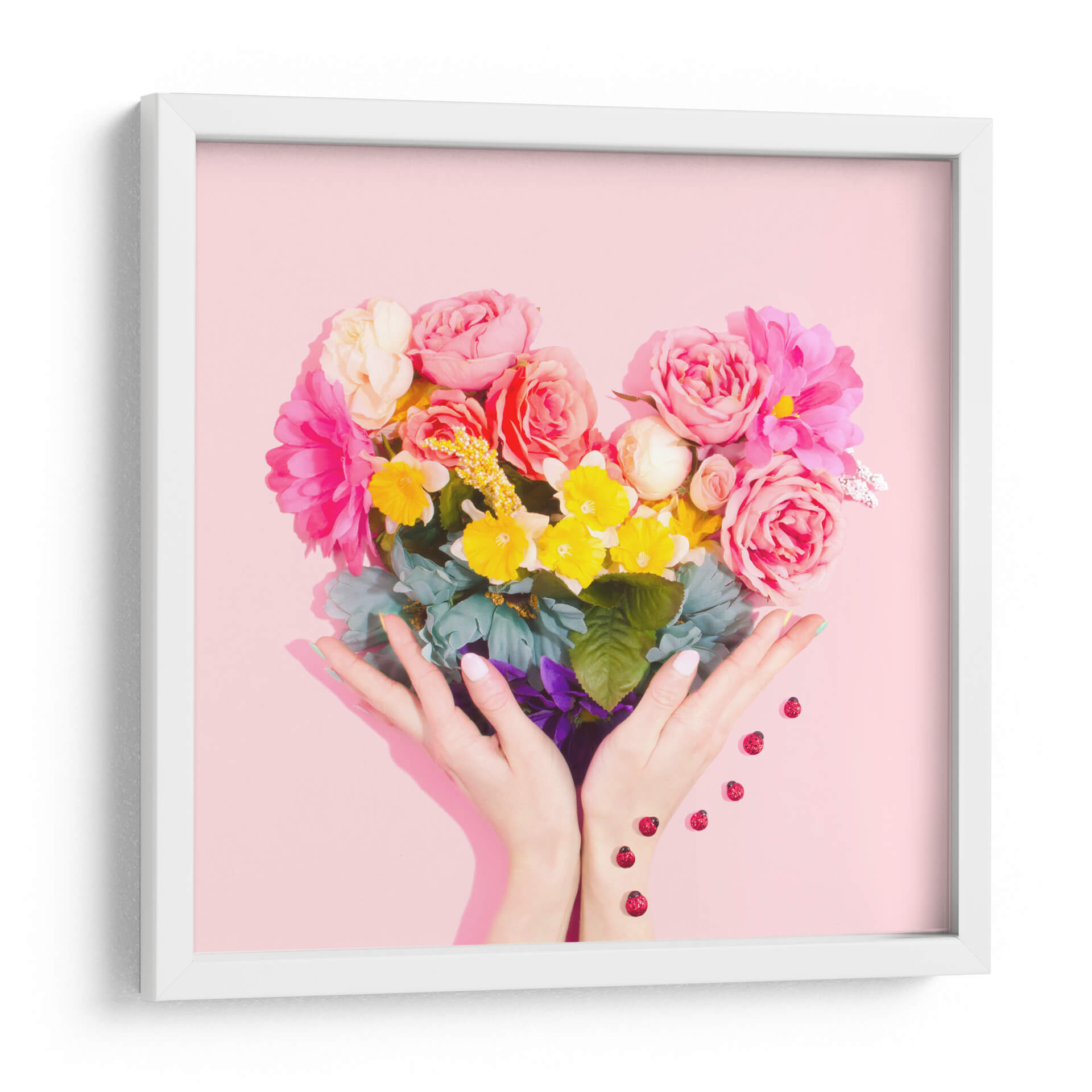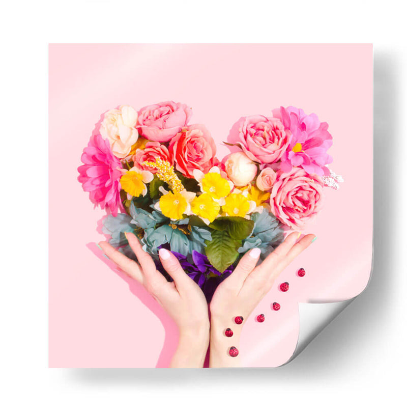 Sumérgete en la dulzura y la vitalidad con nuestro cuadro decorativo "Amor Floral". Esta cautivadora obra de arte presenta un exuberante ramo de flores dispuesto en una forma de corazón, sostenido delicadamente por unas manos. La paleta de colores es un festín visual, con rosas vibrantes, amarillos alegres y toques de verde y azul que crean una atmósfera de pura felicidad y amor. El fondo de color rosa suave complementa a la perfección la explosión de color de las flores, haciendo de esta pieza un punto focal encantador para cualquier espacio. Las pequeñas mariquitas que caen suavemente añaden un toque de fantasía y buena suerte a la composición. "Amor Floral" es más que una simple decoración de pared; es una celebración de la vida, el amor y la belleza de la naturaleza. Este cuadro decorativo es ideal para añadir un toque de alegría y calidez a tu sala de estar, dormitorio o cualquier rincón que necesite una dosis de positividad. Su estilo contemporáneo y su mensaje inspirador lo convierten en una elección perfecta para quienes buscan arte que eleve el espíritu y embellezca su hogar.