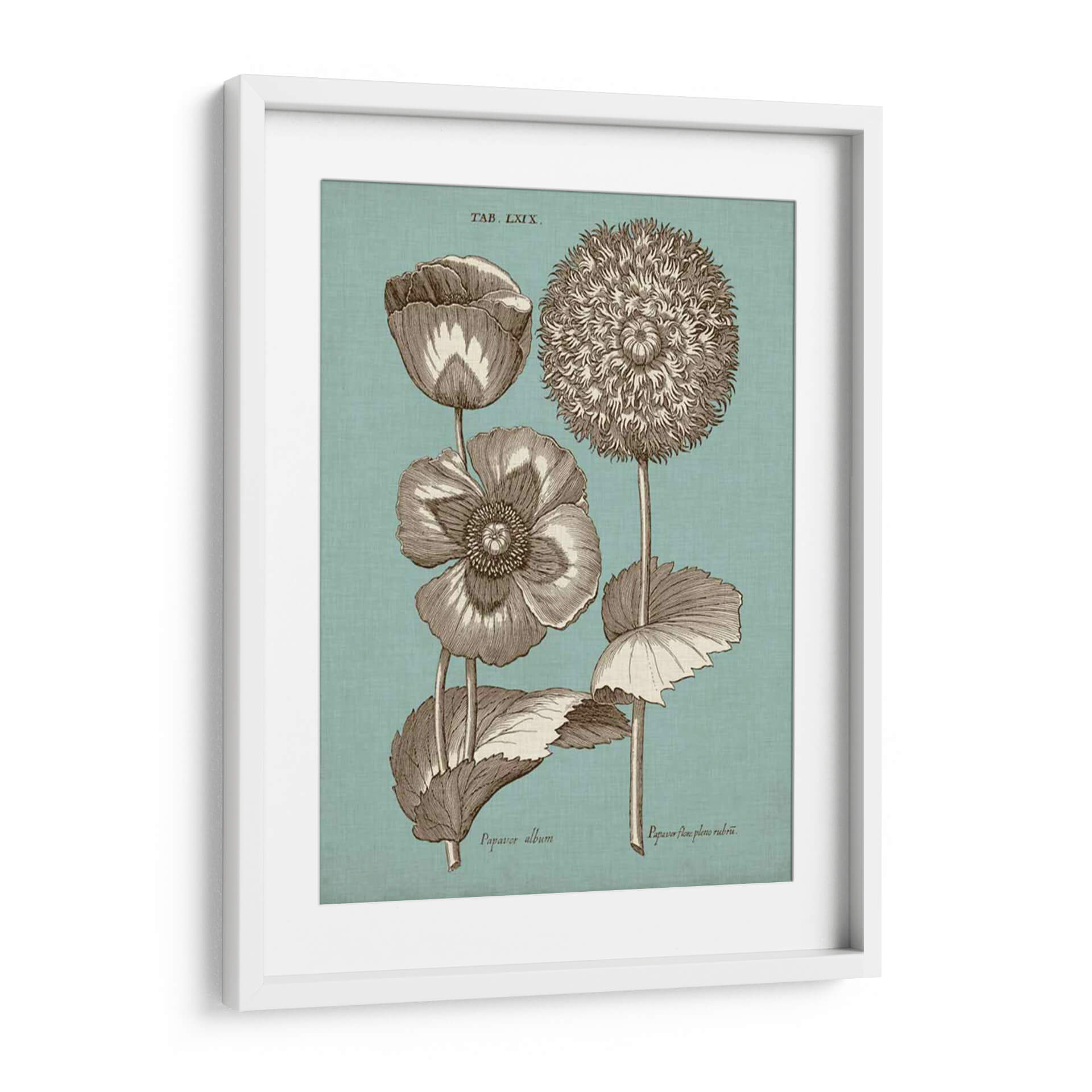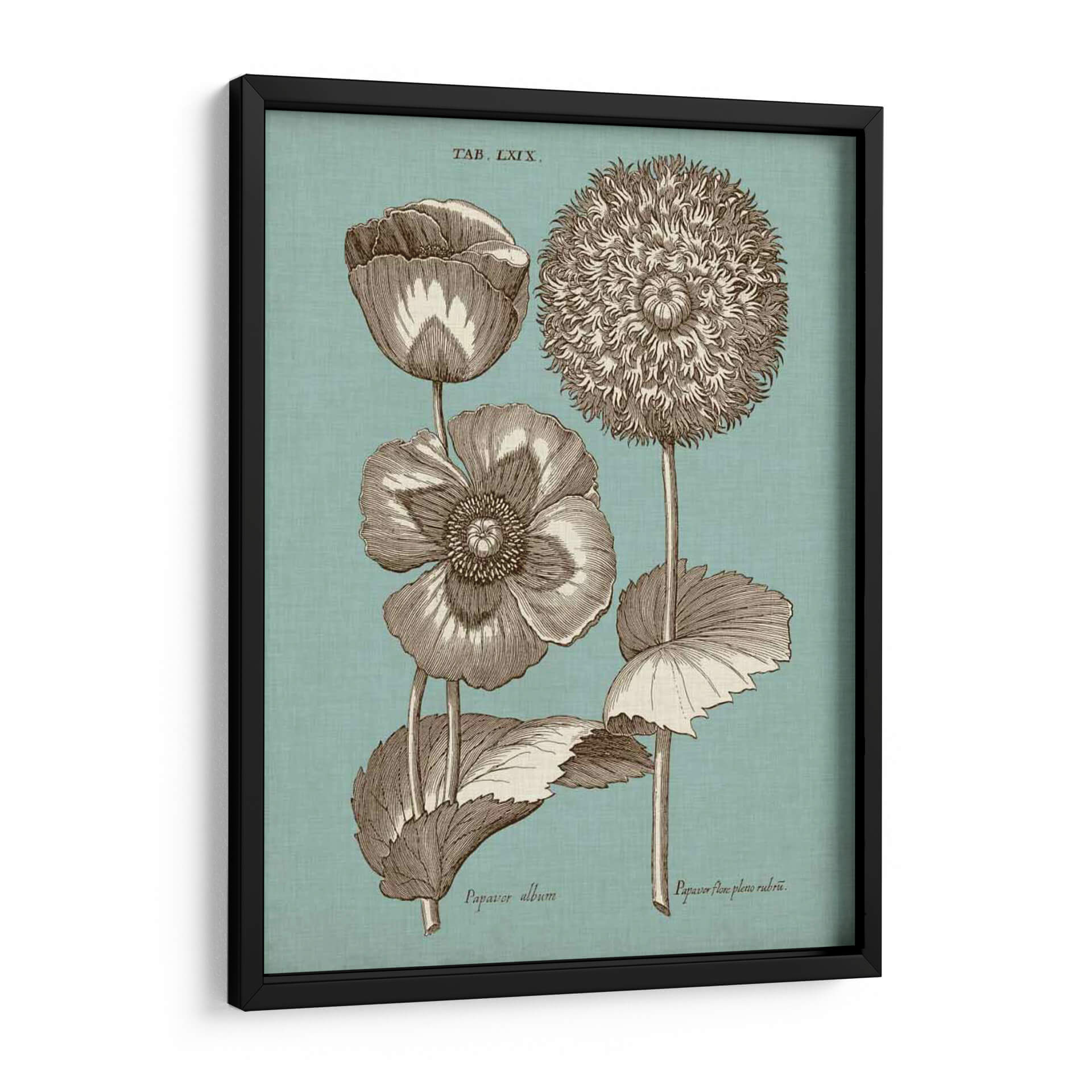 Transforma tu espacio con el encanto atemporal de 'Chambray Chintz III', una obra de arte que celebra la belleza botánica con un toque de sofisticación vintage. Este cuadro decorativo presenta un detallado grabado de dos variedades de amapolas sobre un sereno fondo azul aguamarina. Las intrincadas líneas del dibujo capturan la delicadeza de los pétalos y la textura de las hojas, evocando la precisión de las ilustraciones científicas clásicas. La paleta de colores, dominada por tonos sepia y el suave azul del fondo, crea una atmósfera de calma y elegancia, ideal para cualquier estancia que busque un aire de refinamiento natural. La composición vertical resalta la gracia de las flores, haciendo de esta pieza un punto focal sutil pero cautivador. Perfecta para salas de estar, estudios o dormitorios, este cuadro decorativo aporta un toque de historia y naturaleza a la decoración moderna. Su estilo clásico y su ejecución detallada lo convierten en una elección excepcional para quienes aprecian la belleza perdurable de la botánica y el arte retro.
