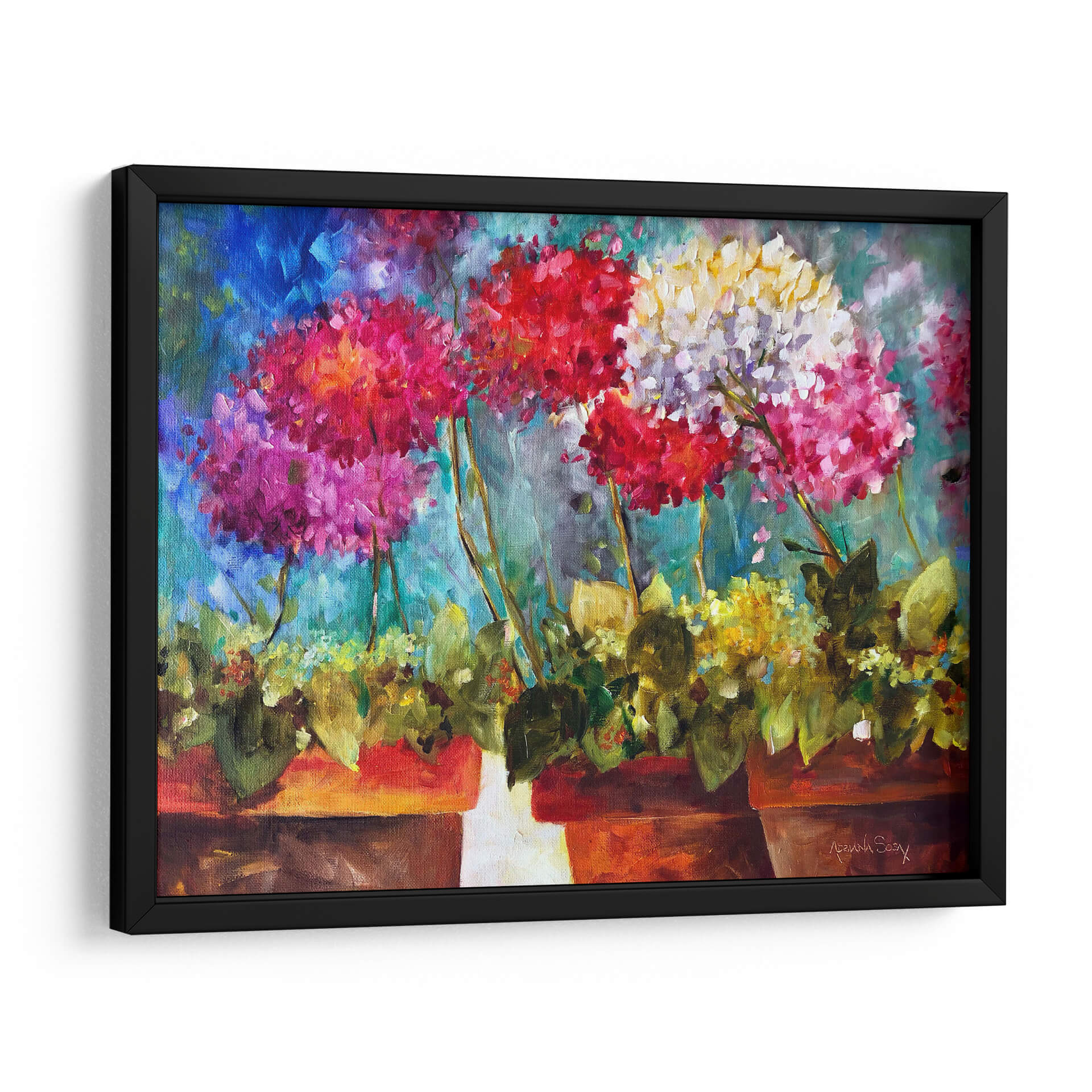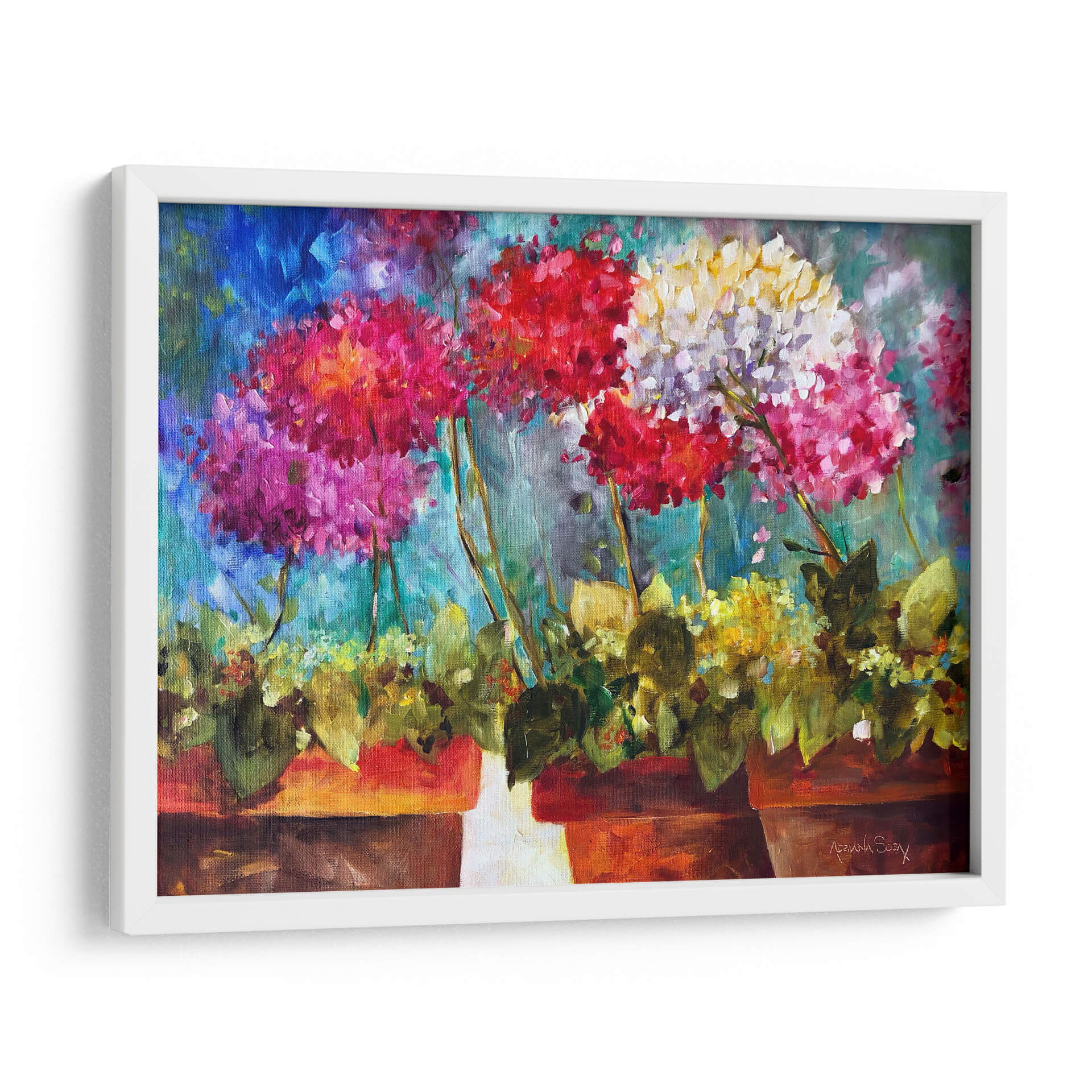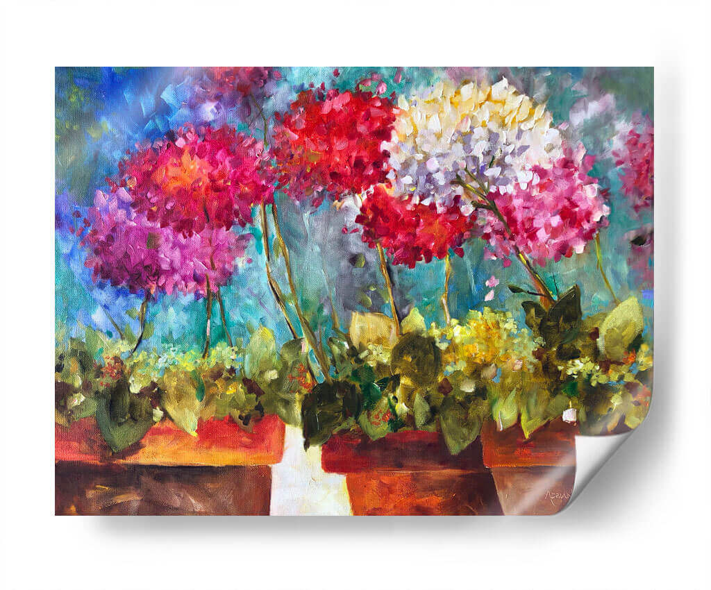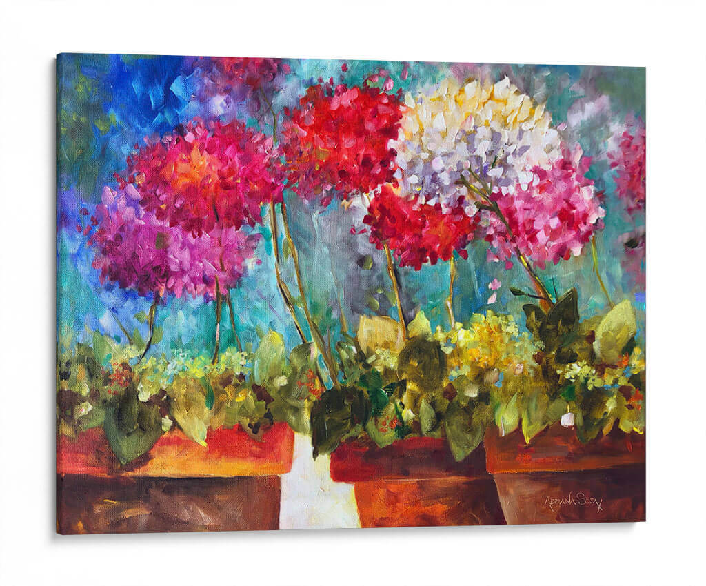 Sumérgete en la vibrante explosión de color y vida que ofrece el cuadro decorativo "Encuadre Perfecto" de Adriana Sosa. Esta obra maestra captura la esencia de un jardín exuberante, donde las hortensias en tonos fucsia, rojo intenso y blanco cremoso se alzan majestuosamente sobre un fondo de azules y turquesas vibrantes. La técnica impresionista de Sosa, con pinceladas sueltas y expresivas, confiere a las flores una textura casi palpable y un movimiento dinámico, invitando al espectador a sentir la brisa y el aroma de las flores. Los verdes intensos de las hojas y los tonos terrosos de las macetas contrastan armoniosamente, anclando la composición y aportando profundidad. "Encuadre Perfecto" es más que una simple representación floral; es una celebración de la belleza natural y la alegría de vivir. Este cuadro decorativo es ideal para infundir energía y un toque de frescura a cualquier espacio, ya sea una sala de estar moderna, un comedor acogedor o un estudio inspirador. Deja que la vitalidad y el encanto de esta pieza transformen tu hogar en un oasis de color y serenidad.