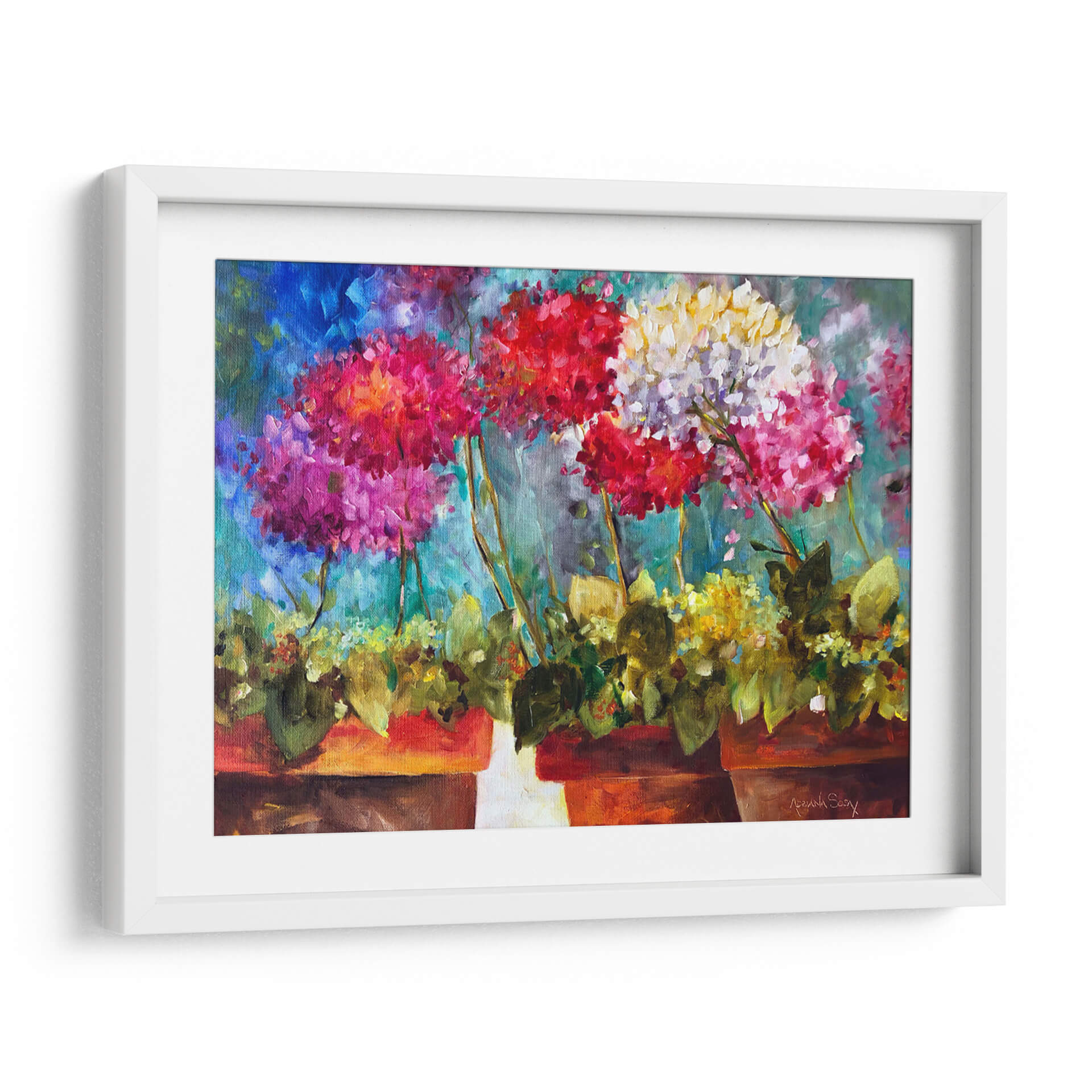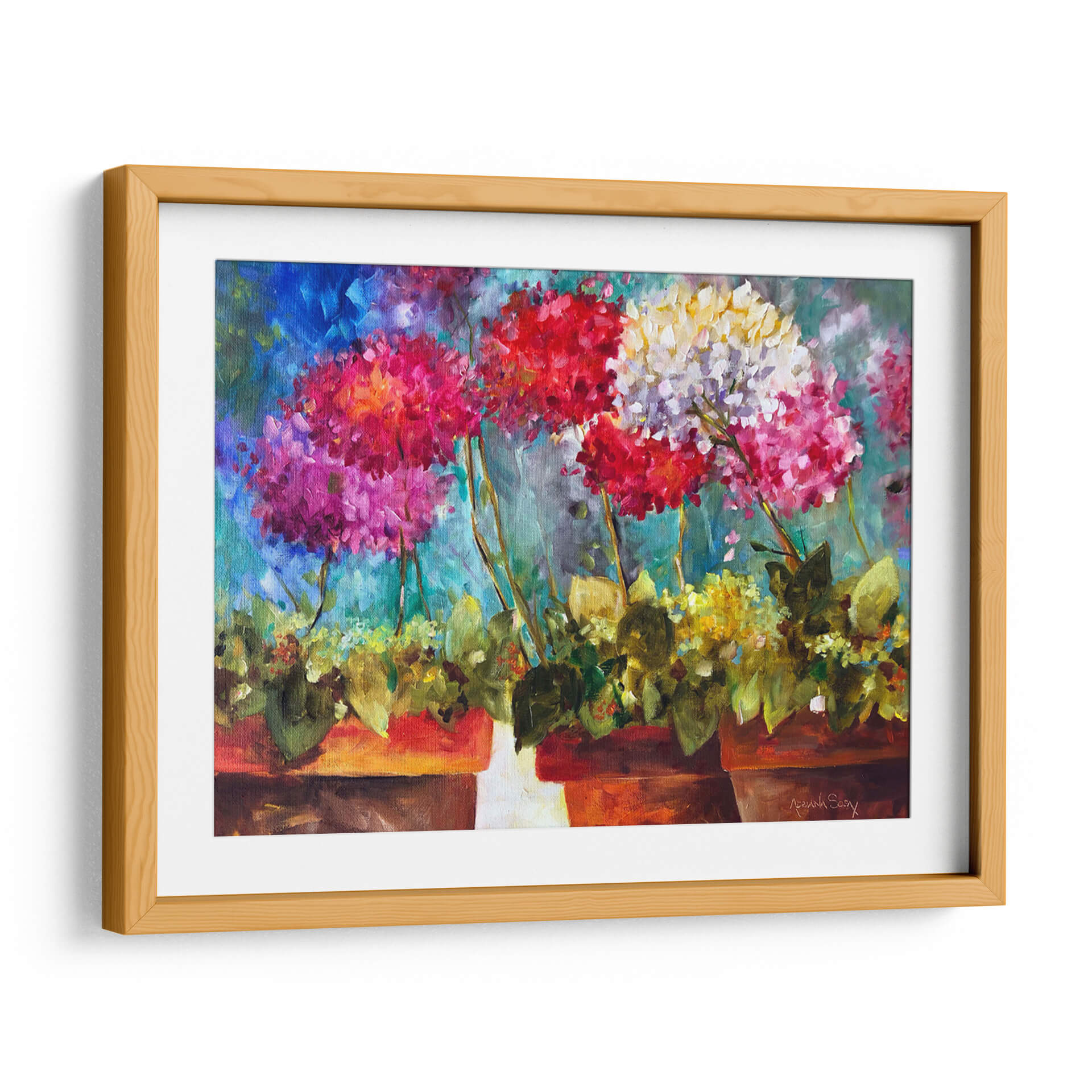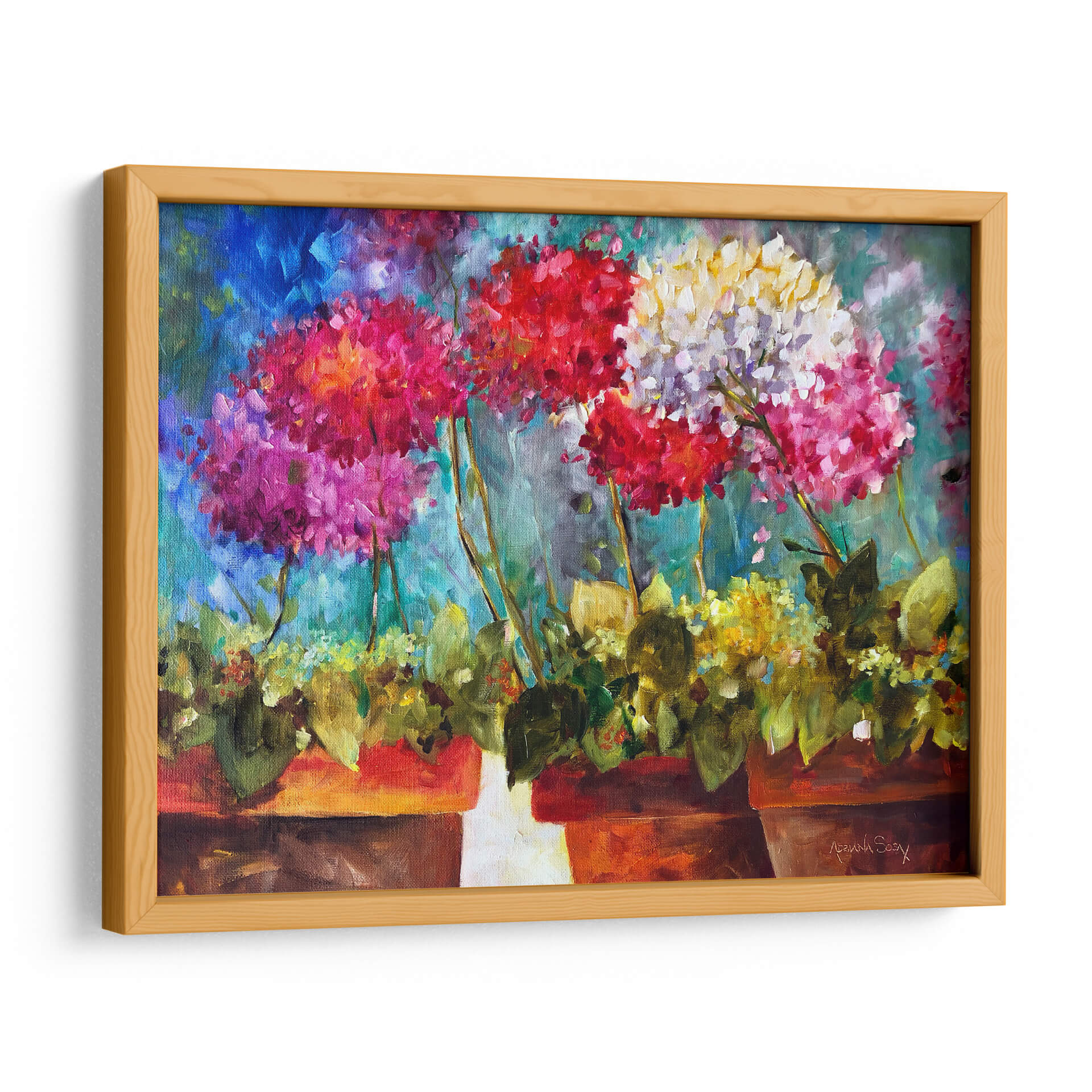 Sumérgete en la vibrante explosión de color y vida que ofrece el cuadro decorativo "Encuadre Perfecto" de Adriana Sosa. Esta obra maestra captura la esencia de un jardín exuberante, donde las hortensias en tonos fucsia, rojo intenso y blanco cremoso se alzan majestuosamente sobre un fondo de azules y turquesas vibrantes. La técnica impresionista de Sosa, con pinceladas sueltas y expresivas, confiere a las flores una textura casi palpable y un movimiento dinámico, invitando al espectador a sentir la brisa y el aroma de las flores. Los verdes intensos de las hojas y los tonos terrosos de las macetas contrastan armoniosamente, anclando la composición y aportando profundidad. "Encuadre Perfecto" es más que una simple representación floral; es una celebración de la belleza natural y la alegría de vivir. Este cuadro decorativo es ideal para infundir energía y un toque de frescura a cualquier espacio, ya sea una sala de estar moderna, un comedor acogedor o un estudio inspirador. Deja que la vitalidad y el encanto de esta pieza transformen tu hogar en un oasis de color y serenidad.