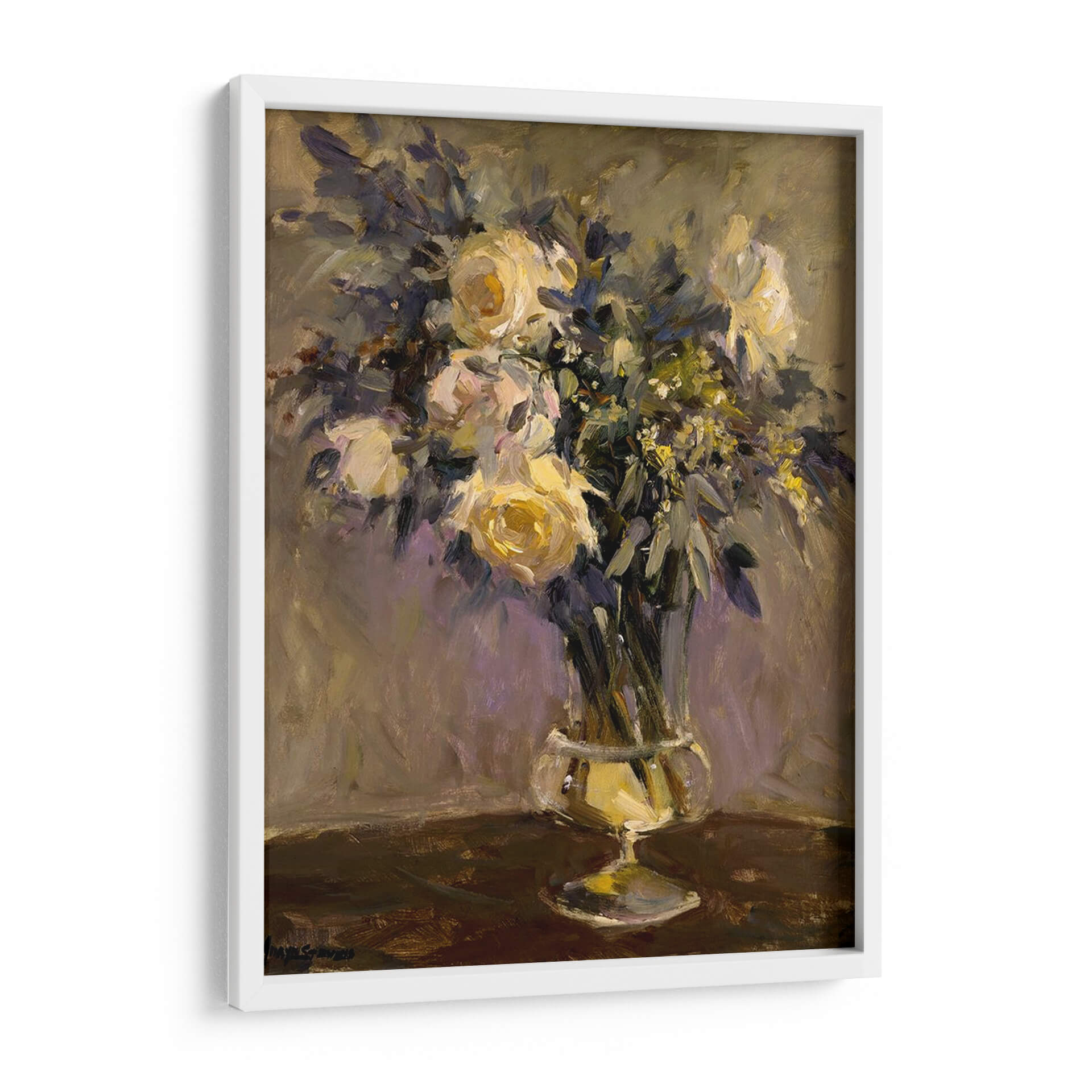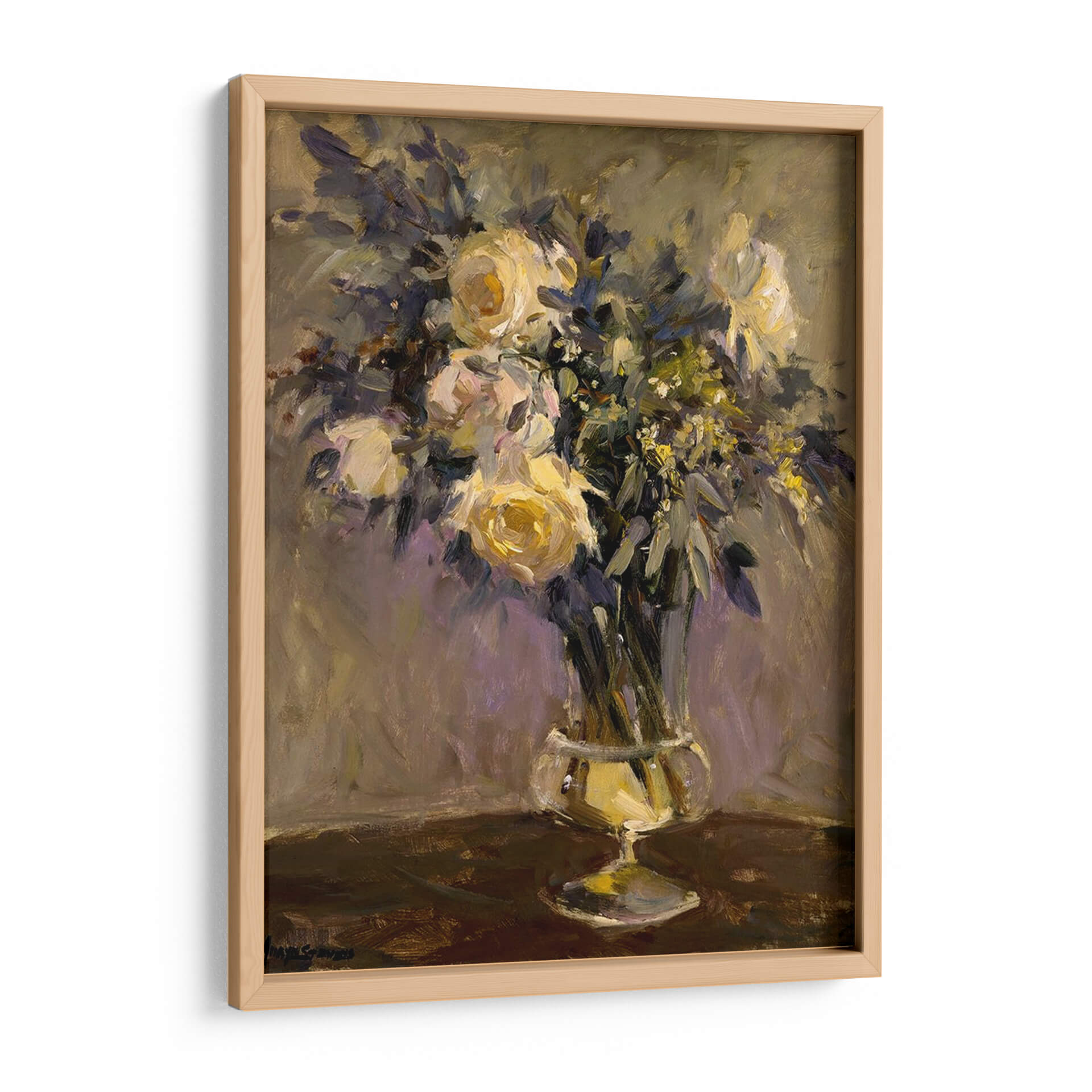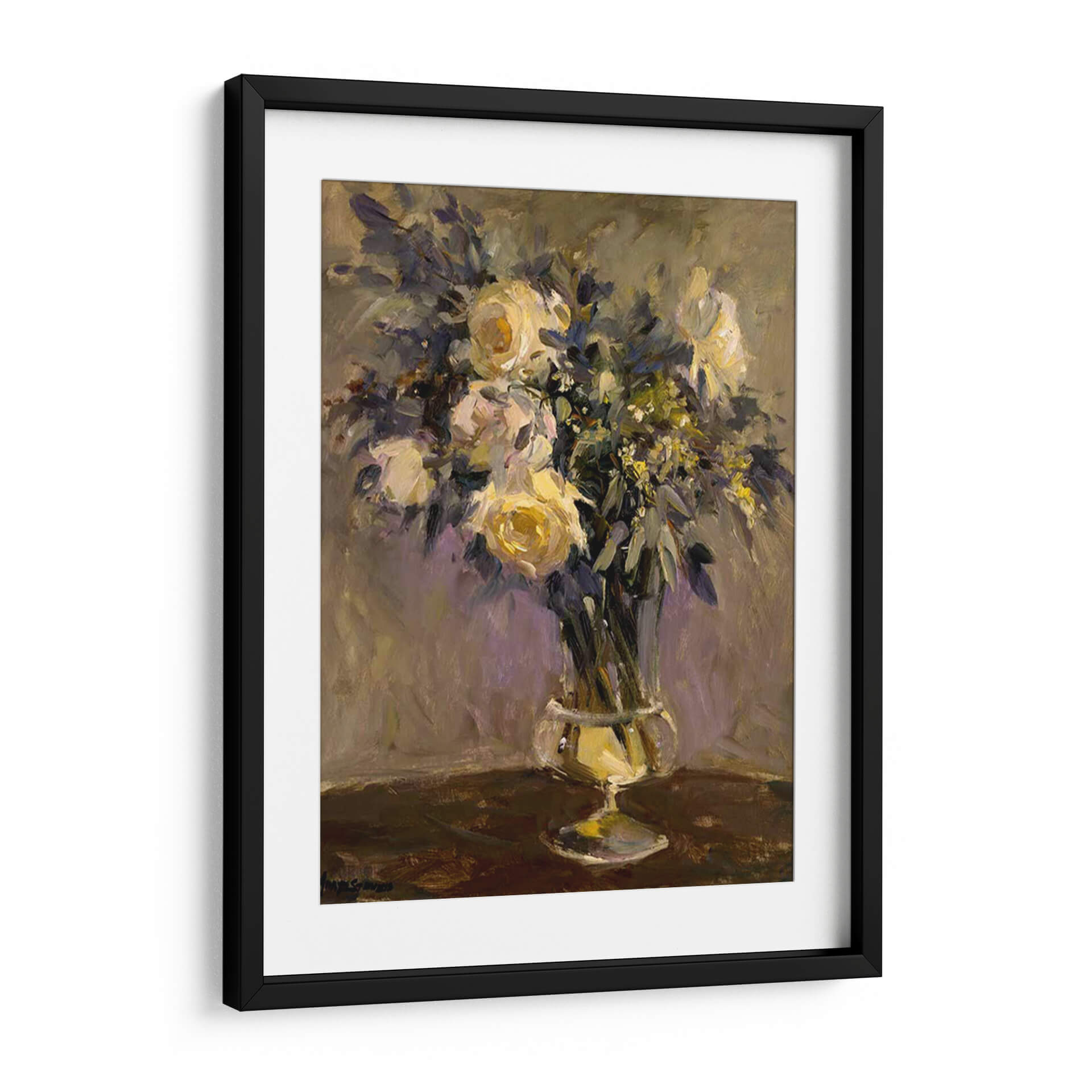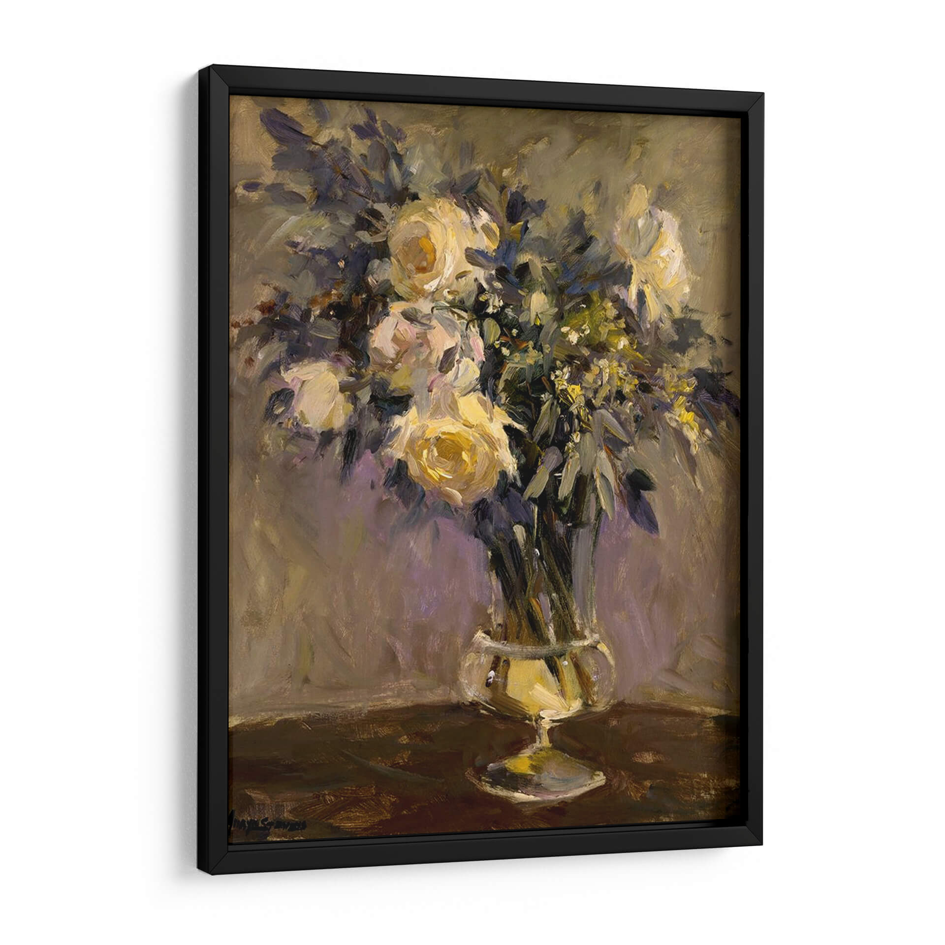 Adéntrate en la serenidad y la belleza atemporal con "Jarrón de Noche", una exquisita obra de arte que captura la delicadeza de un ramo de rosas en plena floración. El artista Allayn Stevens utiliza una paleta de colores suaves y cálidos, dominada por tonos cremosos y amarillos pálidos de las rosas, contrastando con los profundos verdes y azules de las hojas y el follaje, creando una atmósfera íntima y acogedora. La técnica pictórica, rica en textura y con pinceladas visibles, otorga a la pieza una cualidad impresionista que invita a la contemplación. La composición se centra en el jarrón de cristal, que refleja la luz y añade un toque de elegancia, mientras que el fondo neutro permite que el arreglo floral sea el protagonista indiscutible. Este cuadro decorativo es perfecto para añadir un toque de sofisticación y calma a cualquier espacio, ya sea una sala de estar, un dormitorio o un estudio. Su naturaleza evocadora y su ejecución magistral lo convierten en una pieza ideal para quienes buscan infundir a su hogar una sensación de paz y belleza natural. Descubre la magia de las flores capturada en un instante eterno, una adición encantadora a tu colección de arte de pared.