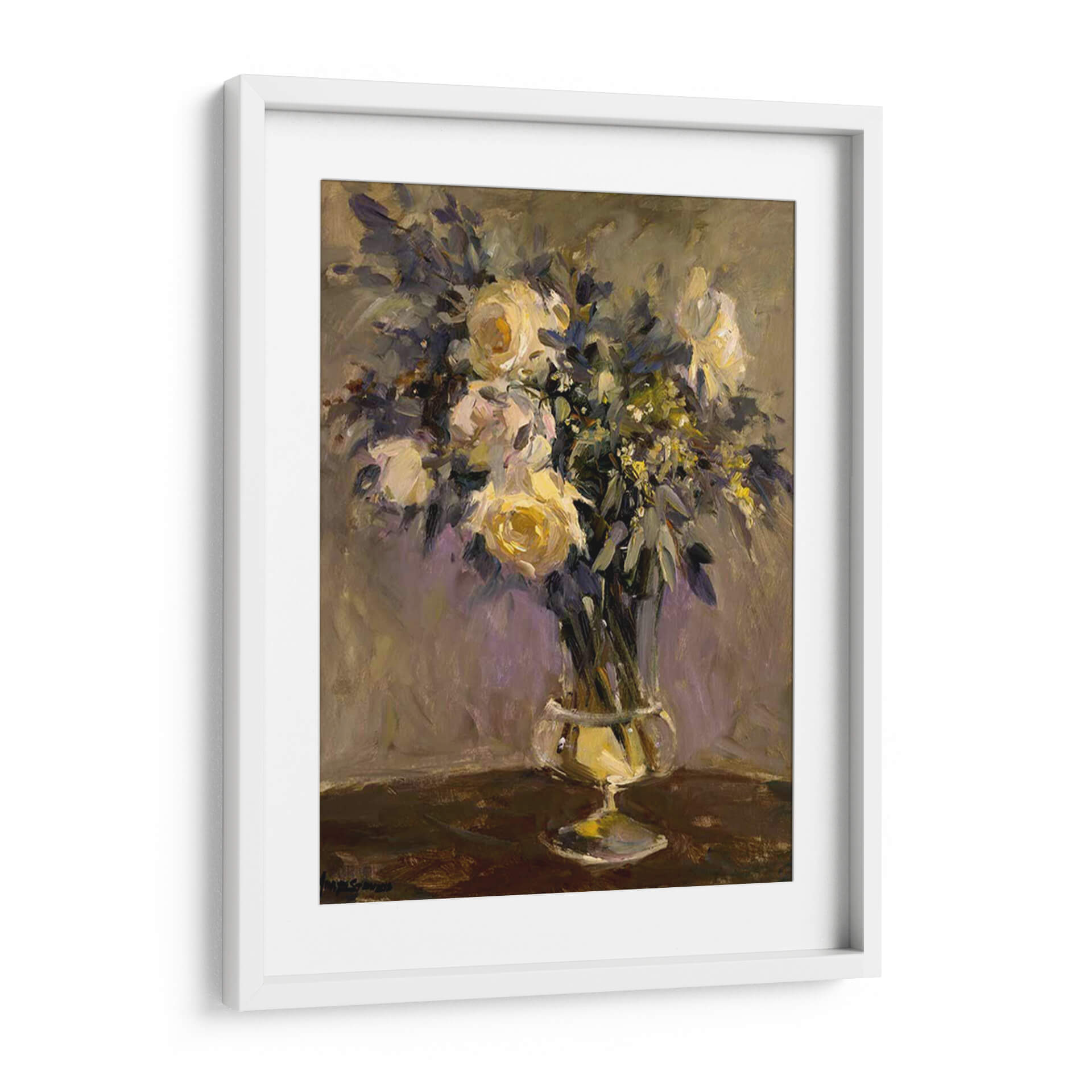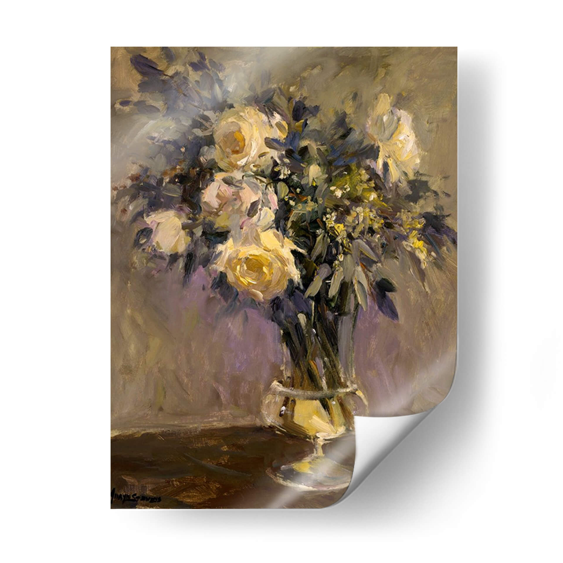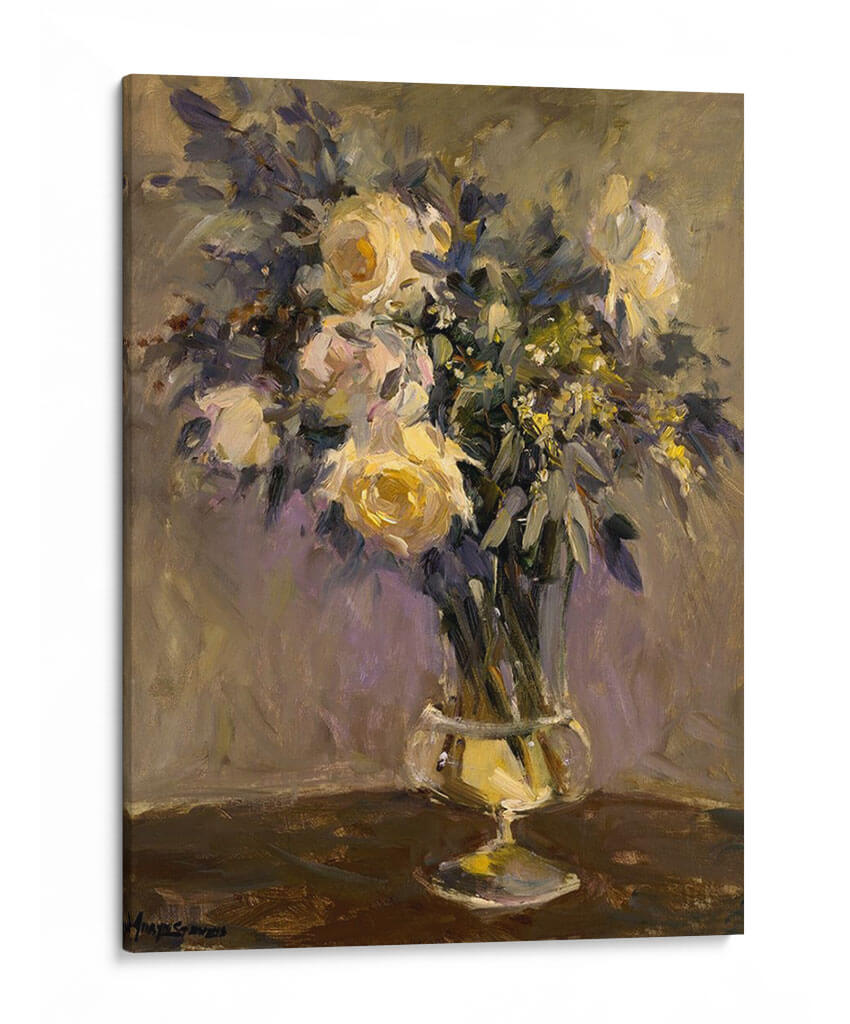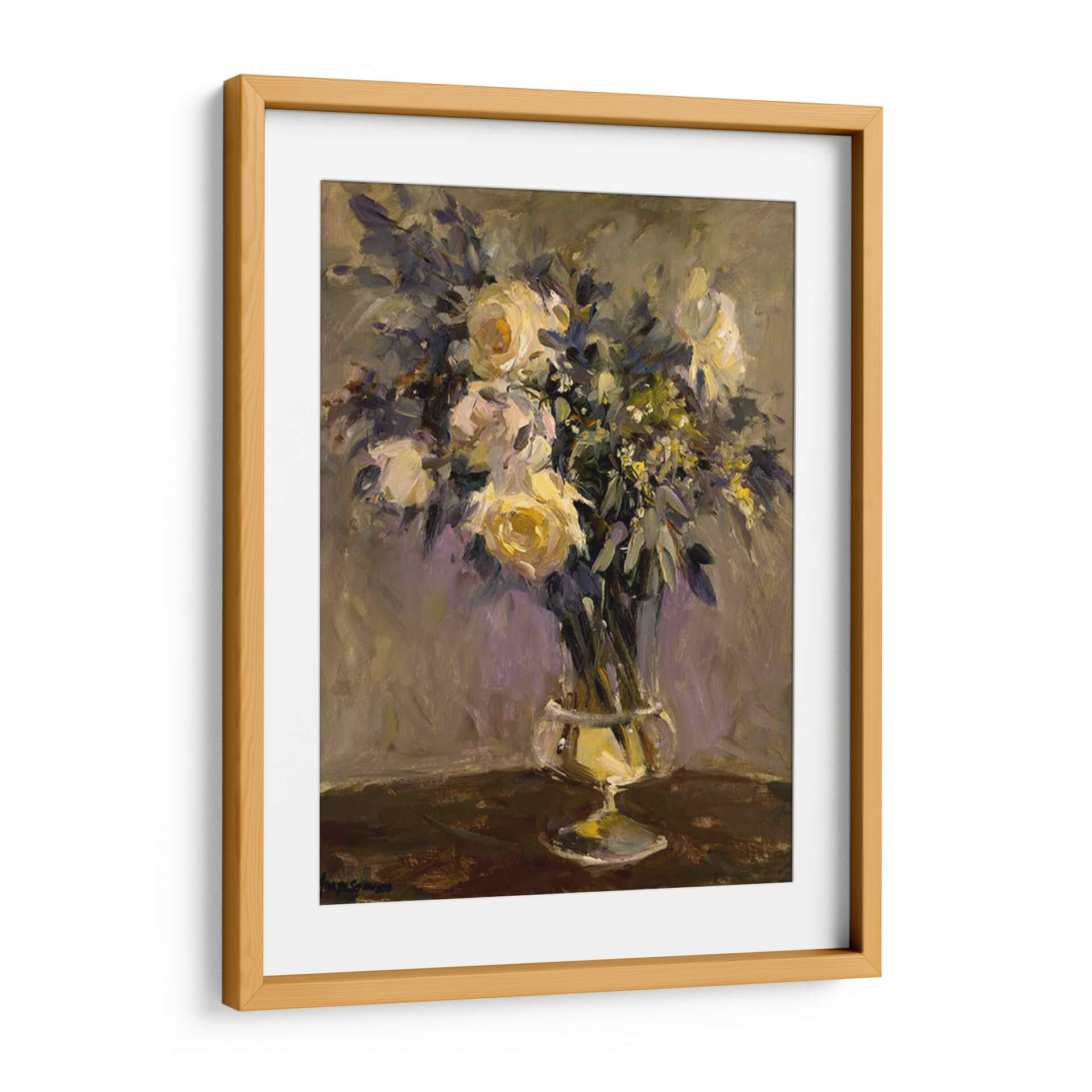 Adéntrate en la serenidad y la belleza atemporal con "Jarrón de Noche", una exquisita obra de arte que captura la delicadeza de un ramo de rosas en plena floración. El artista Allayn Stevens utiliza una paleta de colores suaves y cálidos, dominada por tonos cremosos y amarillos pálidos de las rosas, contrastando con los profundos verdes y azules de las hojas y el follaje, creando una atmósfera íntima y acogedora. La técnica pictórica, rica en textura y con pinceladas visibles, otorga a la pieza una cualidad impresionista que invita a la contemplación. La composición se centra en el jarrón de cristal, que refleja la luz y añade un toque de elegancia, mientras que el fondo neutro permite que el arreglo floral sea el protagonista indiscutible. Este cuadro decorativo es perfecto para añadir un toque de sofisticación y calma a cualquier espacio, ya sea una sala de estar, un dormitorio o un estudio. Su naturaleza evocadora y su ejecución magistral lo convierten en una pieza ideal para quienes buscan infundir a su hogar una sensación de paz y belleza natural. Descubre la magia de las flores capturada en un instante eterno, una adición encantadora a tu colección de arte de pared.