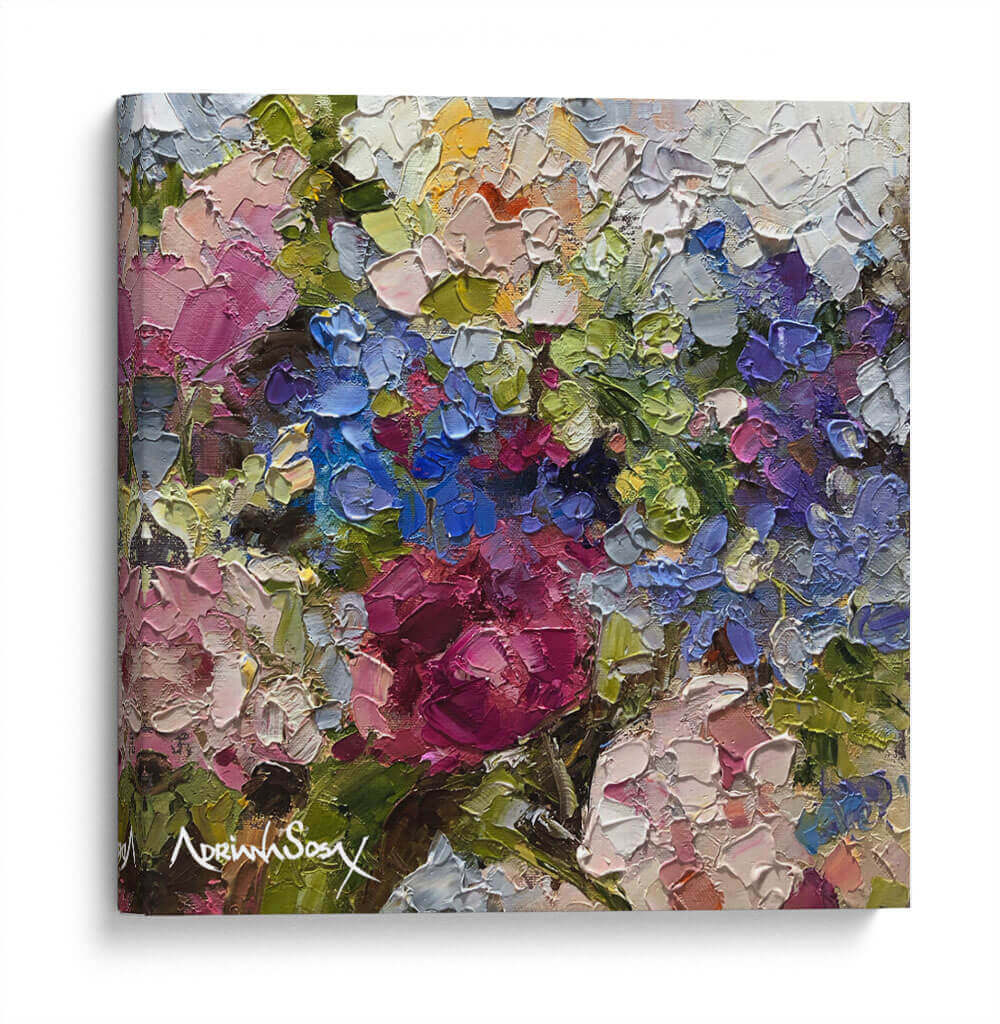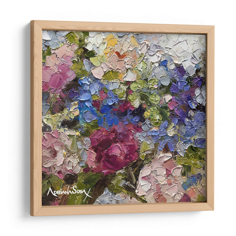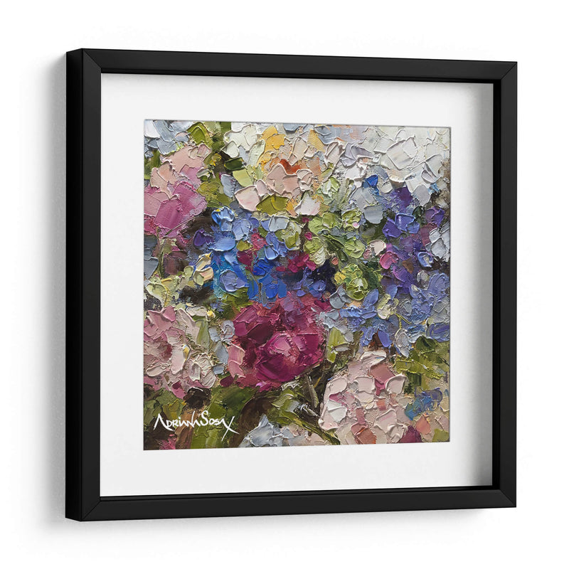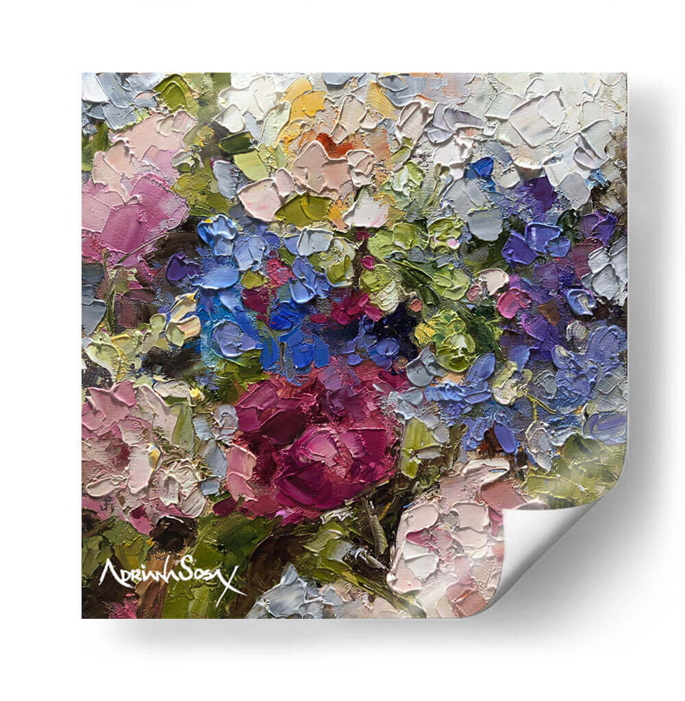 Sumérgete en la vibrante obra "Secreto" de Adriana Sosa, una explosión de color y textura que captura la esencia de la naturaleza con una técnica impasto audaz. Este cuadro decorativo floral te transportará a un jardín exuberante, donde cada pincelada gruesa y empastada da vida a pétalos de rosas intensas, hortensias celestes y toques de amarillo soleado. Los verdes profundos y los tonos rosados y púrpuras crean una sinfonía visual que evoca sentimientos de alegría, vitalidad y un toque de misterio, tal como sugiere su título. La composición, rica y detallada, invita a la contemplación, permitiendo descubrir nuevas sutilezas con cada mirada. "Secreto" es ideal para añadir un punto focal de color y sofisticación a cualquier sala de estar, comedor o dormitorio, infundiendo el espacio con una energía positiva y un aire de elegancia artística. Su estilo postimpresionista moderno, con énfasis en la aplicación de pintura tridimensional, la convierte en una pieza única que no pasará desapercibida. Transforma tu hogar en una galería personal con este cautivador cuadro de flores que celebra la belleza efímera y la pasión por el arte.