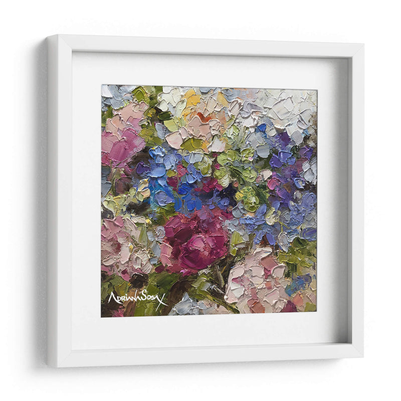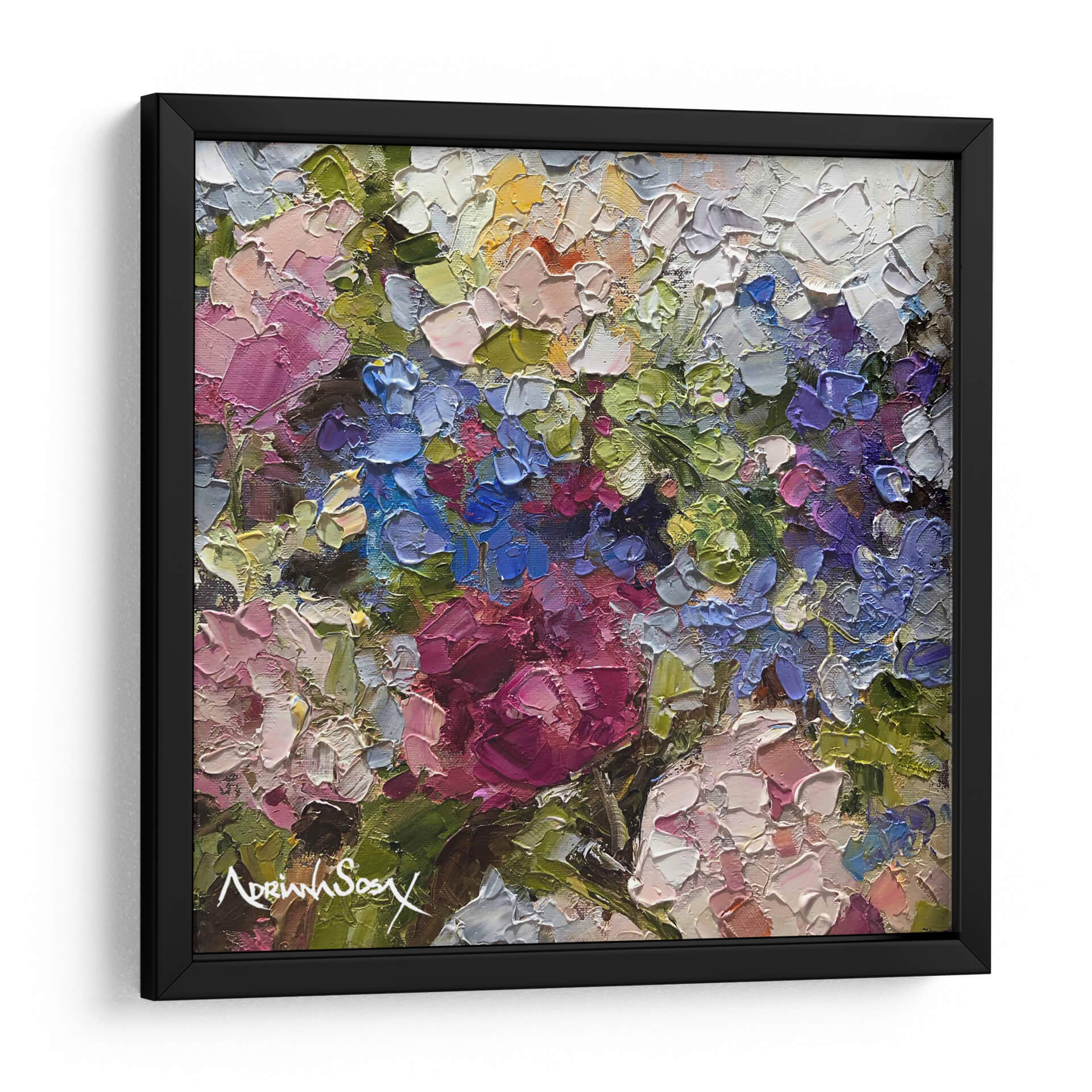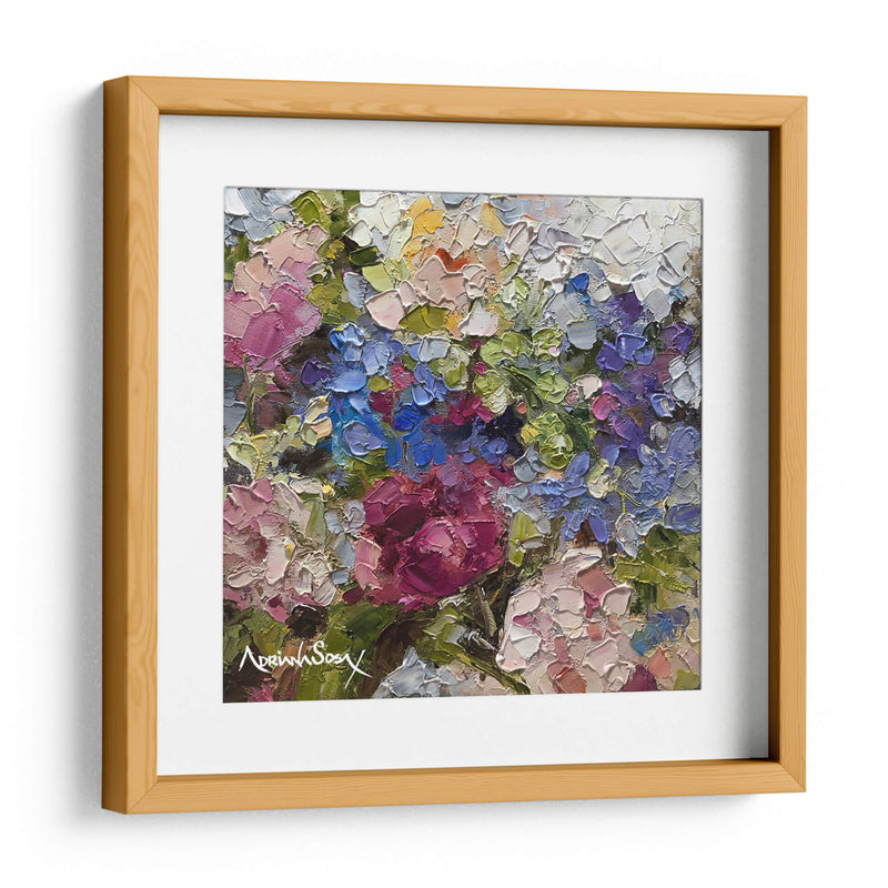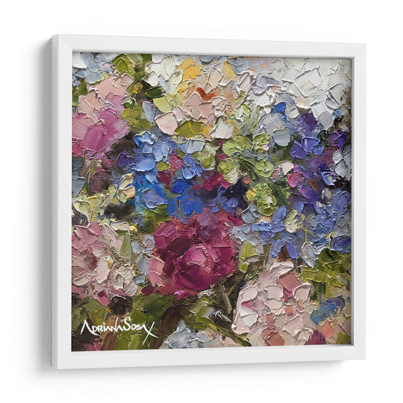 Sumérgete en la vibrante obra "Secreto" de Adriana Sosa, una explosión de color y textura que captura la esencia de la naturaleza con una técnica impasto audaz. Este cuadro decorativo floral te transportará a un jardín exuberante, donde cada pincelada gruesa y empastada da vida a pétalos de rosas intensas, hortensias celestes y toques de amarillo soleado. Los verdes profundos y los tonos rosados y púrpuras crean una sinfonía visual que evoca sentimientos de alegría, vitalidad y un toque de misterio, tal como sugiere su título. La composición, rica y detallada, invita a la contemplación, permitiendo descubrir nuevas sutilezas con cada mirada. "Secreto" es ideal para añadir un punto focal de color y sofisticación a cualquier sala de estar, comedor o dormitorio, infundiendo el espacio con una energía positiva y un aire de elegancia artística. Su estilo postimpresionista moderno, con énfasis en la aplicación de pintura tridimensional, la convierte en una pieza única que no pasará desapercibida. Transforma tu hogar en una galería personal con este cautivador cuadro de flores que celebra la belleza efímera y la pasión por el arte.