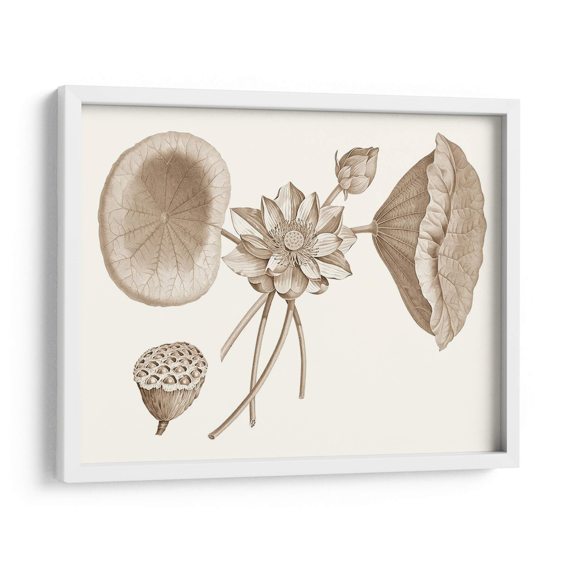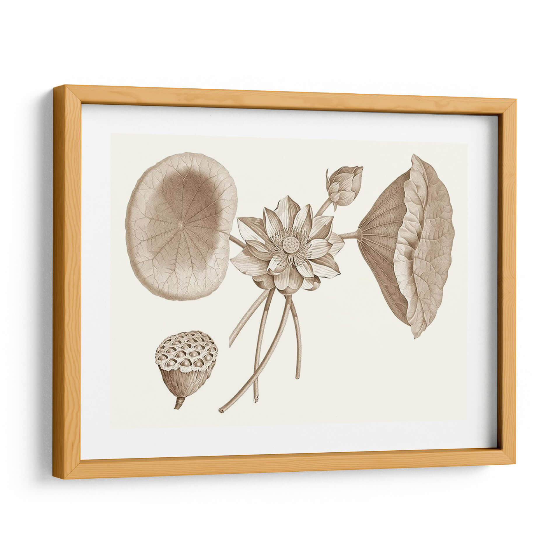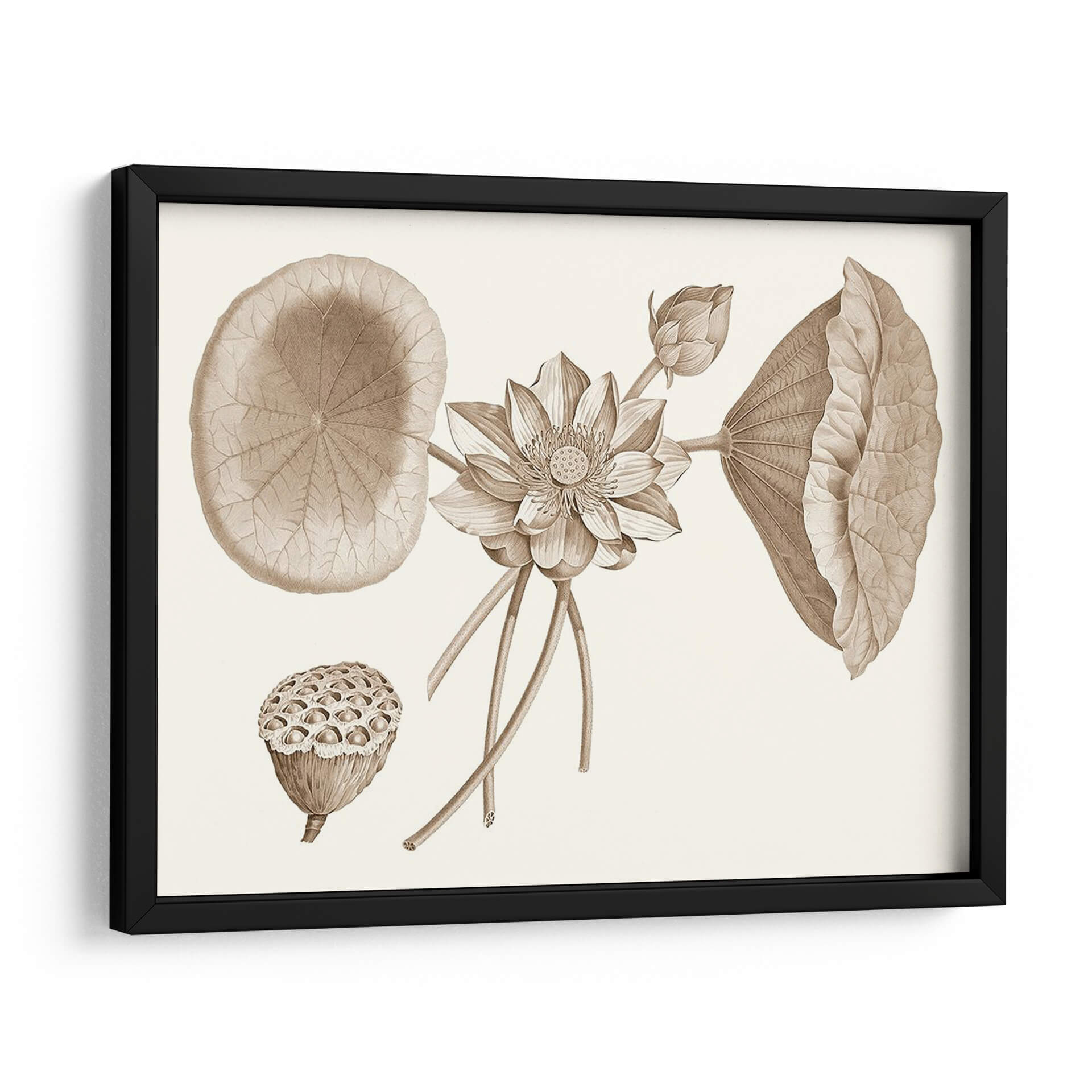 Embellece tu espacio con la serenidad y el encanto botánico de "Sepia Agua Lirio Yo", una obra de arte que captura la delicadeza de la naturaleza en tonos sepia. Este cuadro decorativo presenta una detallada ilustración de un lirio de agua en pleno florecimiento, acompañado de sus característicos grandes hojas y un capullo en ciernes. La composición se enriquece con la presencia de la cabeza de semillas del loto, aportando una dimensión textural y un recordatorio del ciclo de la vida. La paleta de colores sepia, rica en matices tierra, confiere a la pieza una atmósfera de calma, elegancia y un toque vintage, ideal para espacios que buscan transmitir tranquilidad y sofisticación. Su estilo, que evoca las antiguas láminas botánicas, añade un aire de autenticidad y aprecio por la ciencia y la belleza natural. Este cuadro es perfecto para salones, dormitorios o estudios, aportando un punto focal de inspiración orgánica. Integra "Sepia Agua Lirio Yo" en tu decoración para crear un ambiente de paz y admiración por los detalles botánicos, una pieza que invita a la contemplación y al disfrute de la belleza atemporal.