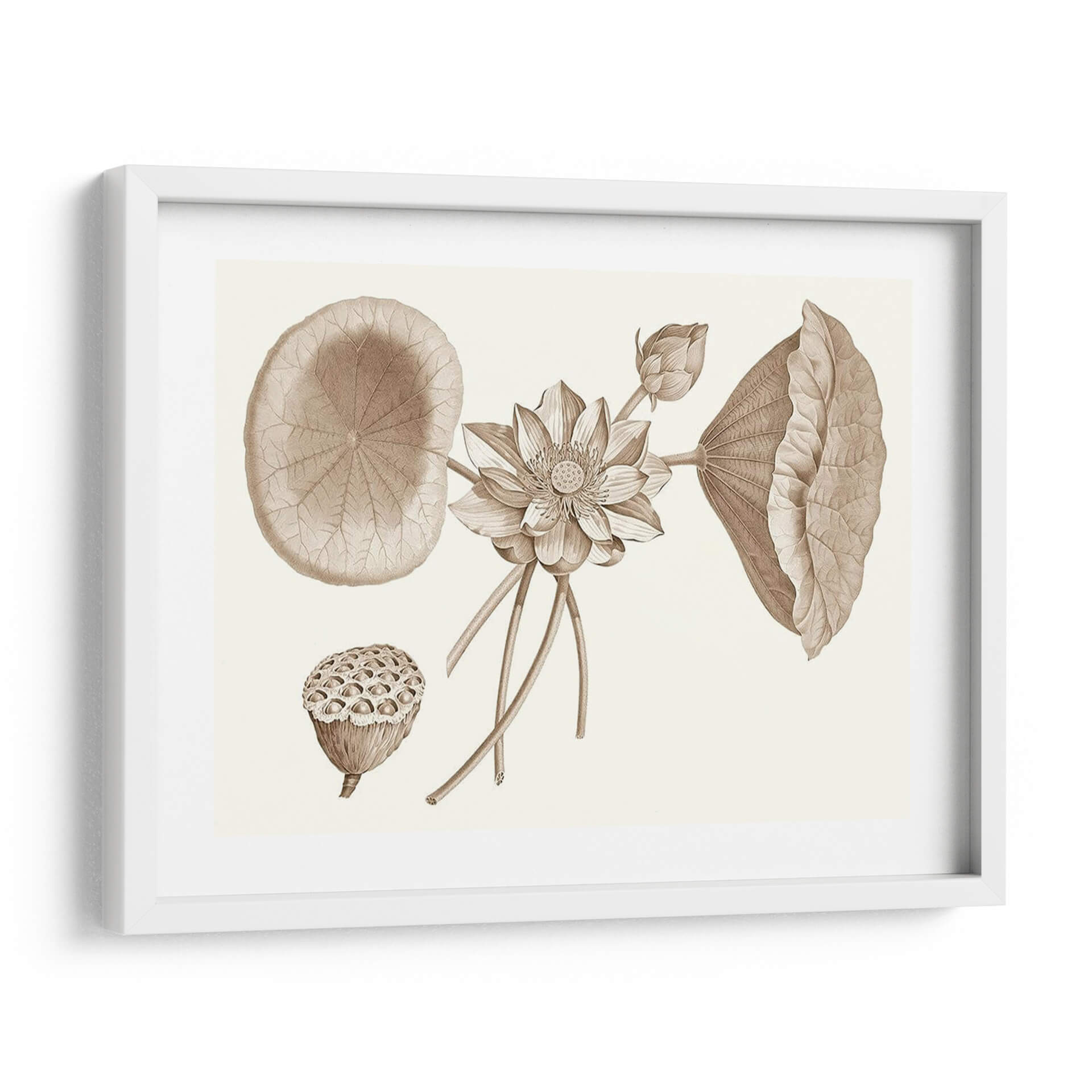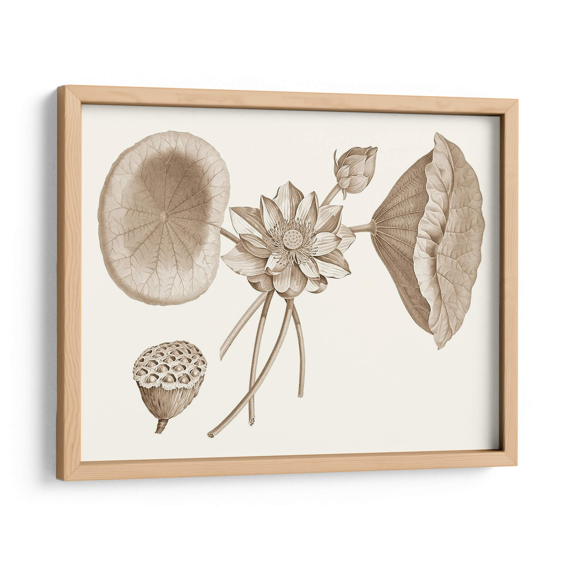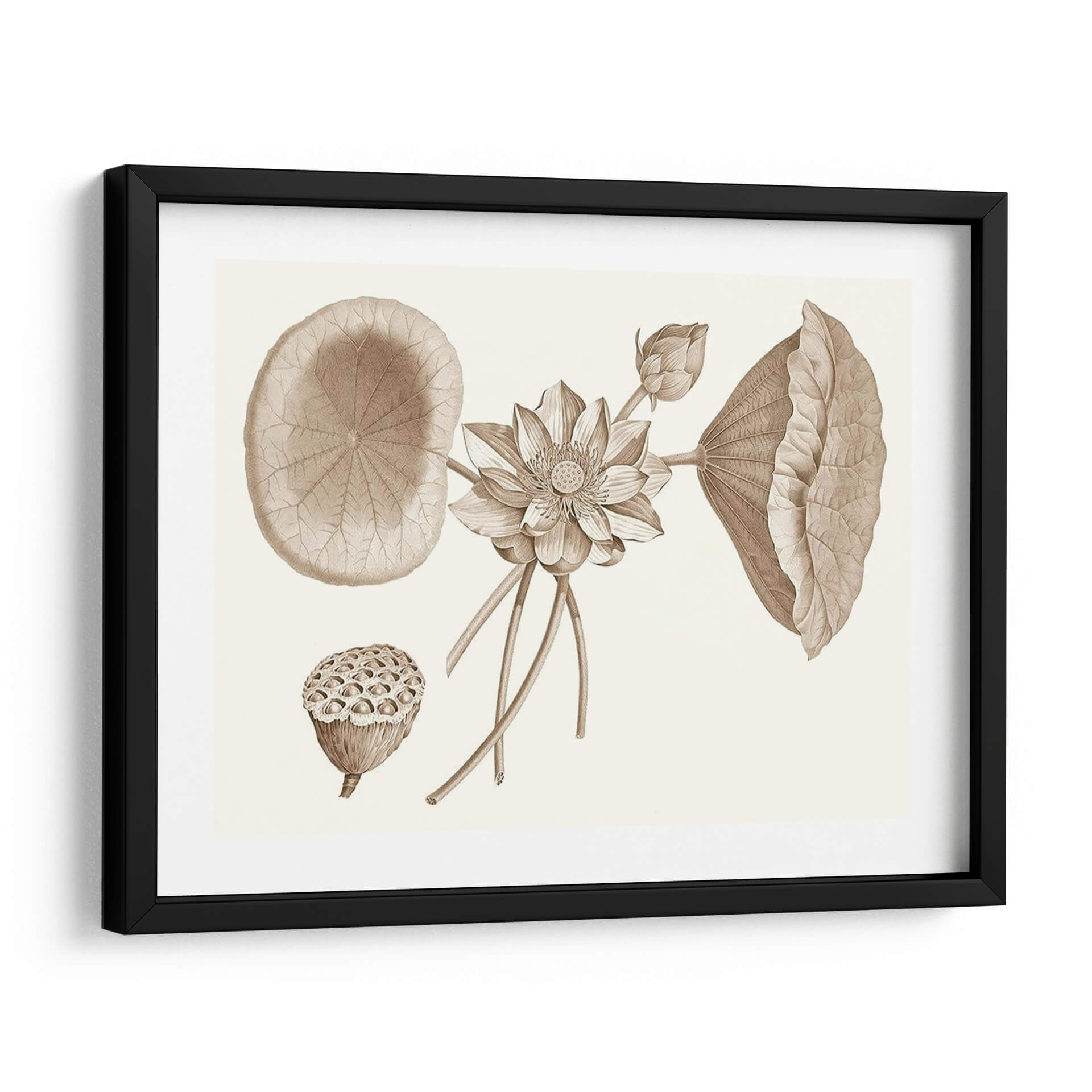 Embellece tu espacio con la serenidad y el encanto botánico de "Sepia Agua Lirio Yo", una obra de arte que captura la delicadeza de la naturaleza en tonos sepia. Este cuadro decorativo presenta una detallada ilustración de un lirio de agua en pleno florecimiento, acompañado de sus característicos grandes hojas y un capullo en ciernes. La composición se enriquece con la presencia de la cabeza de semillas del loto, aportando una dimensión textural y un recordatorio del ciclo de la vida. La paleta de colores sepia, rica en matices tierra, confiere a la pieza una atmósfera de calma, elegancia y un toque vintage, ideal para espacios que buscan transmitir tranquilidad y sofisticación. Su estilo, que evoca las antiguas láminas botánicas, añade un aire de autenticidad y aprecio por la ciencia y la belleza natural. Este cuadro es perfecto para salones, dormitorios o estudios, aportando un punto focal de inspiración orgánica. Integra "Sepia Agua Lirio Yo" en tu decoración para crear un ambiente de paz y admiración por los detalles botánicos, una pieza que invita a la contemplación y al disfrute de la belleza atemporal.