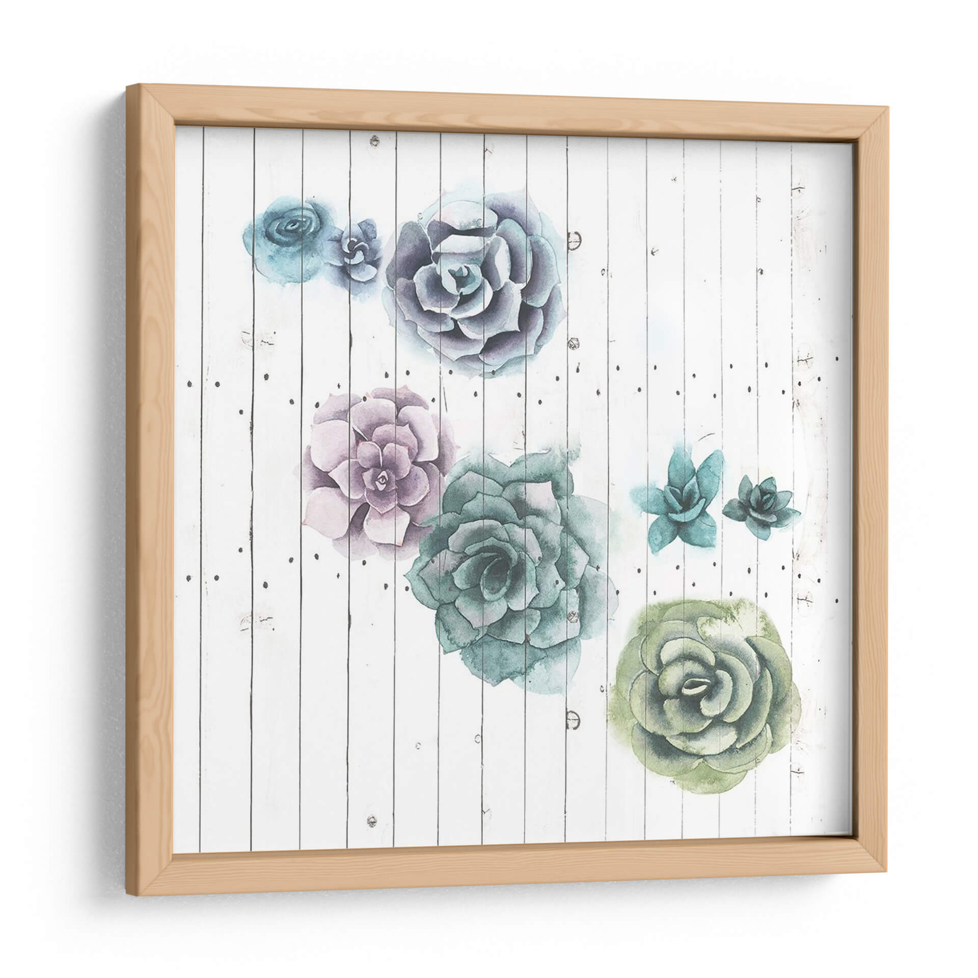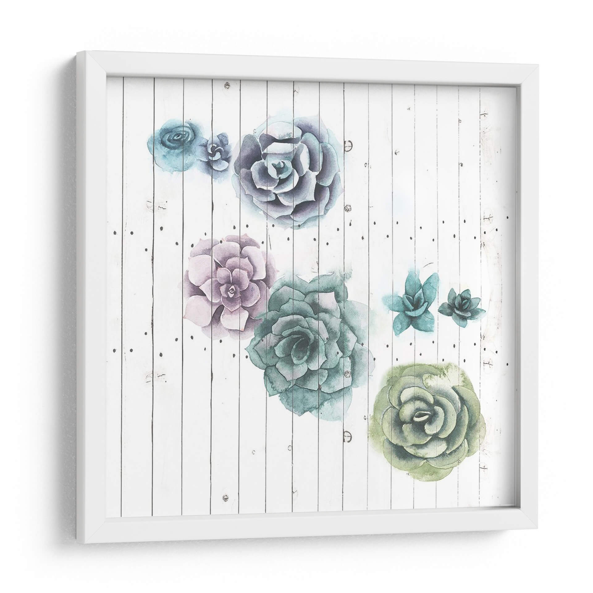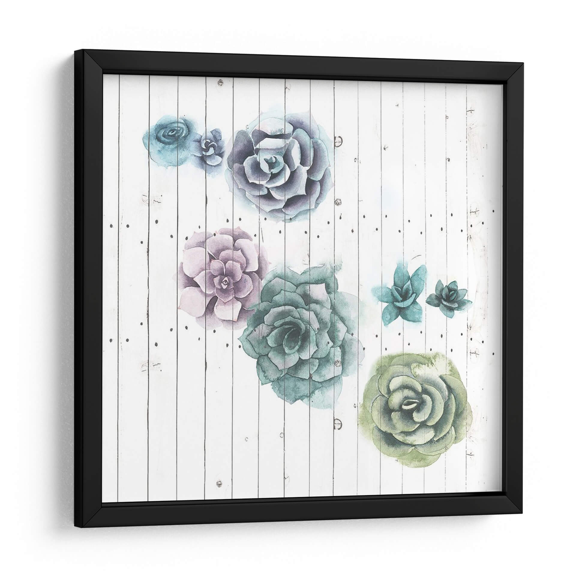 Este encantador cuadro decorativo, titulado 'Shiplap Succulent Cluster IV' y obra del artista Grace Popp, captura la delicada belleza de las suculentas en una composición serena y moderna. Las plantas, representadas con acuarelas etéreas, despliegan sus pétalos en tonos pastel de azul, morado, verde azulado y verde suave, creando una paleta de colores calmante y refrescante. El fondo, imitando la textura rústica de tablones de madera blanca desgastada con sutiles detalles de puntos, proporciona un contraste nítido que realza la frescura y vitalidad de las suculentas. La disposición dispersa de los racimos de suculentas añade un toque orgánico y equilibrado a la pieza, sugiriendo un crecimiento natural y armonioso. Esta obra de arte es perfecta para añadir un toque de naturaleza y tranquilidad a cualquier espacio, ideal para dormitorios, salas de estar, estudios o incluso baños, aportando una atmósfera de calma y bienestar. Su estilo contemporáneo y su estética botánica la convierten en una adición versátil y atemporal a la decoración del hogar, resonando con aquellos que aprecian la belleza sutil y los tonos pastel.