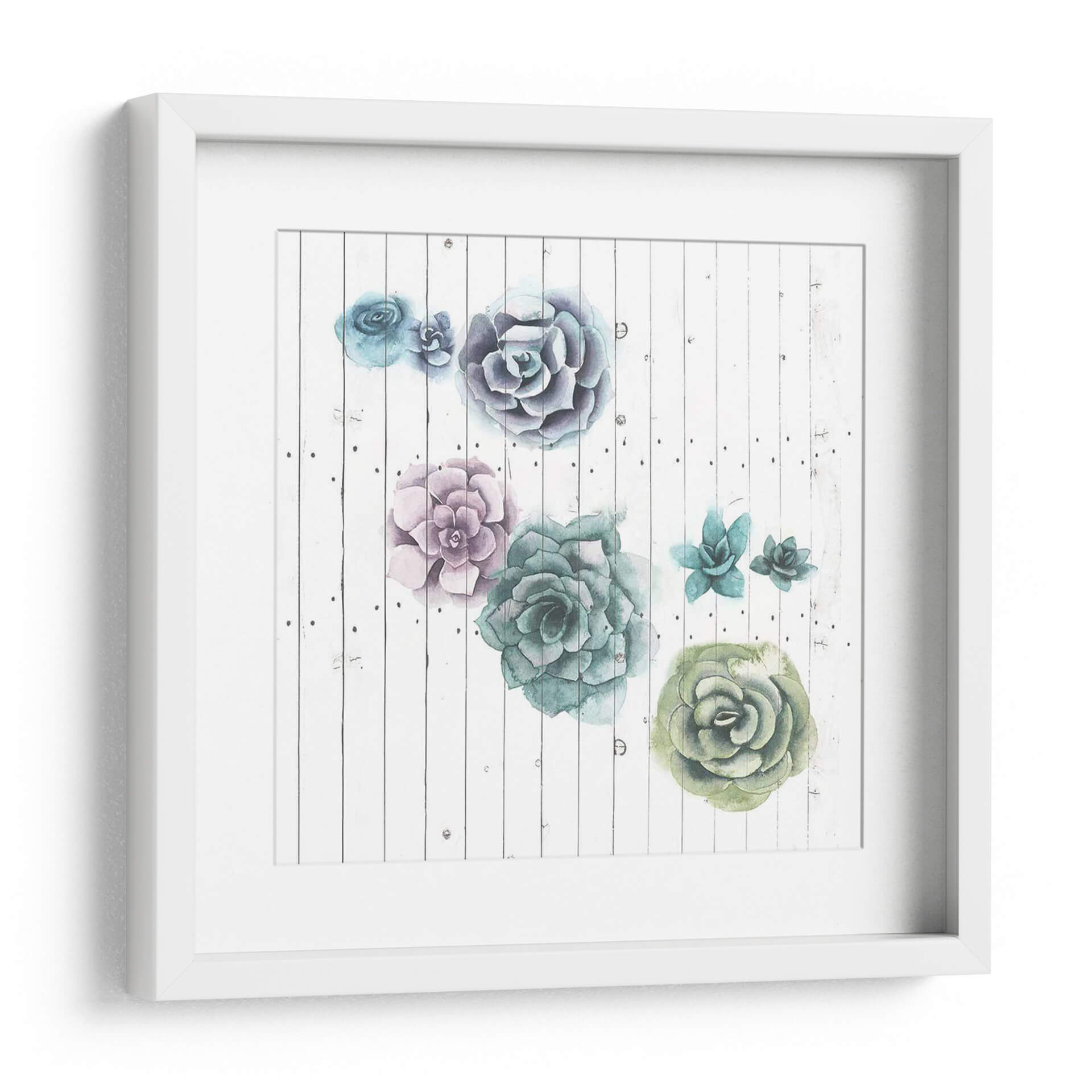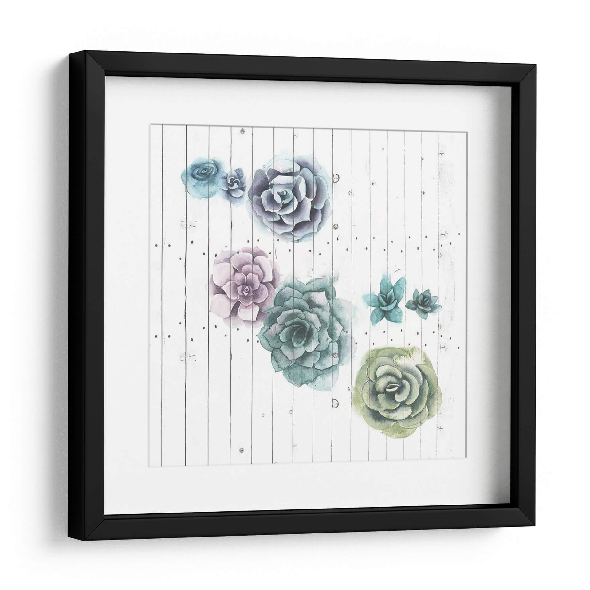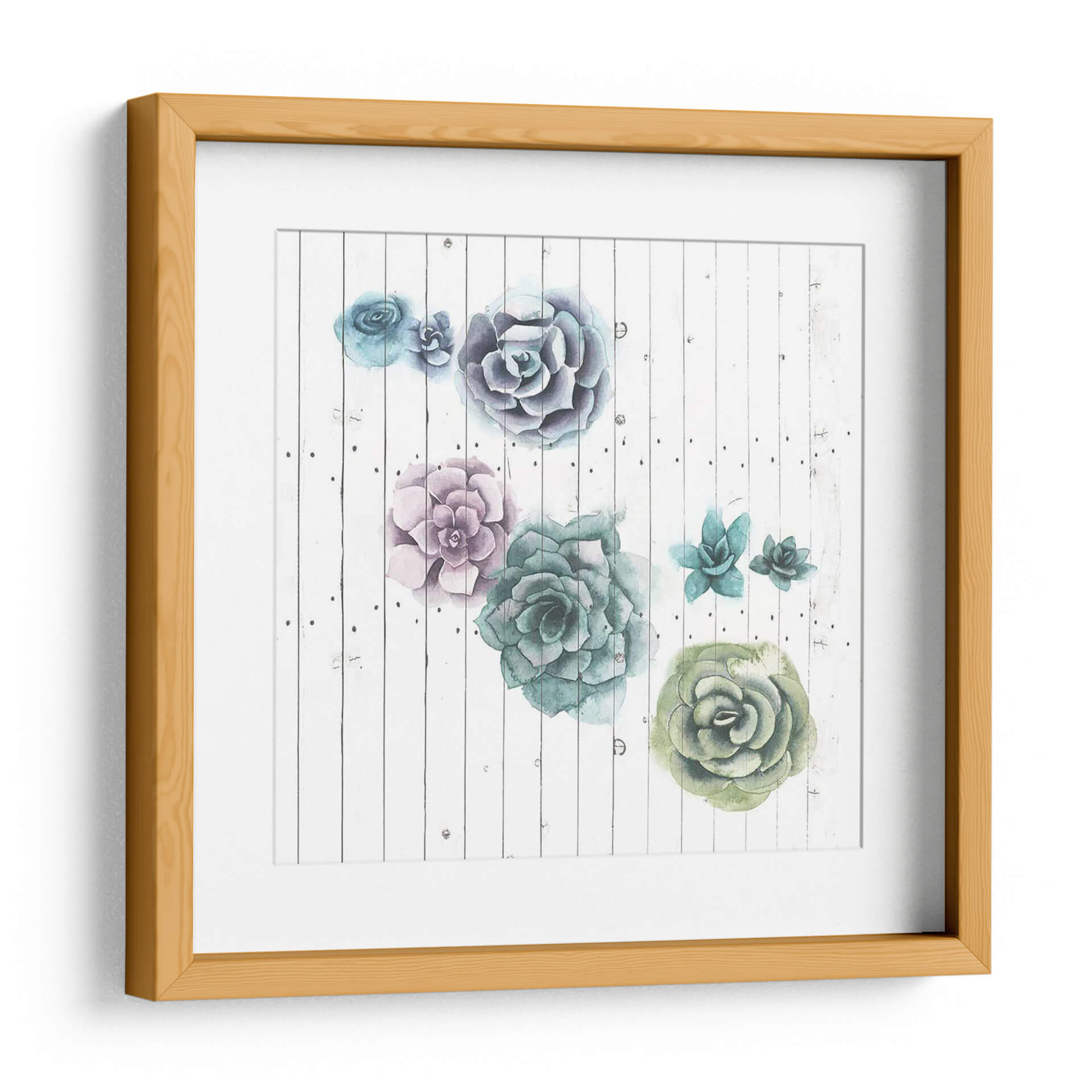 Este encantador cuadro decorativo, titulado 'Shiplap Succulent Cluster IV' y obra del artista Grace Popp, captura la delicada belleza de las suculentas en una composición serena y moderna. Las plantas, representadas con acuarelas etéreas, despliegan sus pétalos en tonos pastel de azul, morado, verde azulado y verde suave, creando una paleta de colores calmante y refrescante. El fondo, imitando la textura rústica de tablones de madera blanca desgastada con sutiles detalles de puntos, proporciona un contraste nítido que realza la frescura y vitalidad de las suculentas. La disposición dispersa de los racimos de suculentas añade un toque orgánico y equilibrado a la pieza, sugiriendo un crecimiento natural y armonioso. Esta obra de arte es perfecta para añadir un toque de naturaleza y tranquilidad a cualquier espacio, ideal para dormitorios, salas de estar, estudios o incluso baños, aportando una atmósfera de calma y bienestar. Su estilo contemporáneo y su estética botánica la convierten en una adición versátil y atemporal a la decoración del hogar, resonando con aquellos que aprecian la belleza sutil y los tonos pastel.