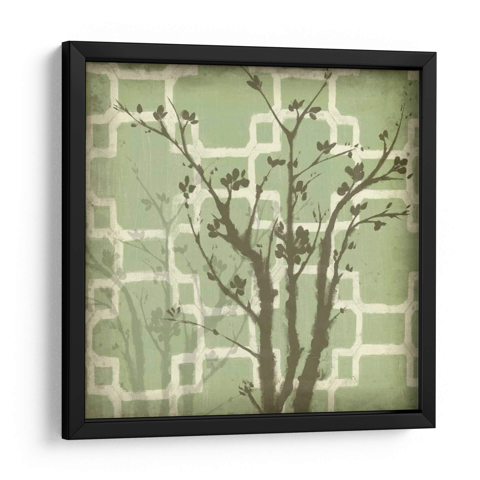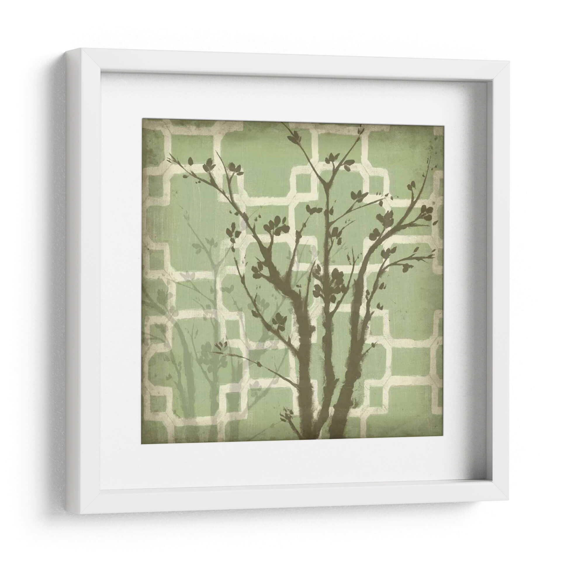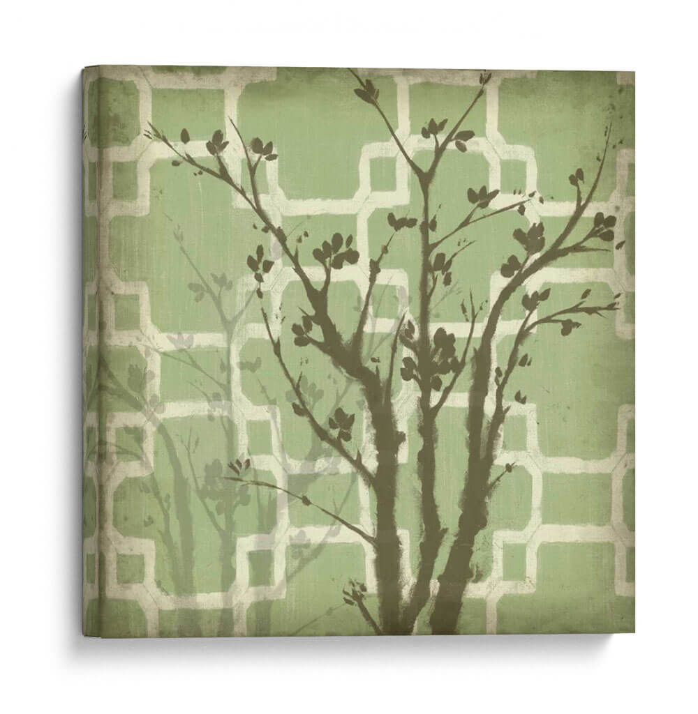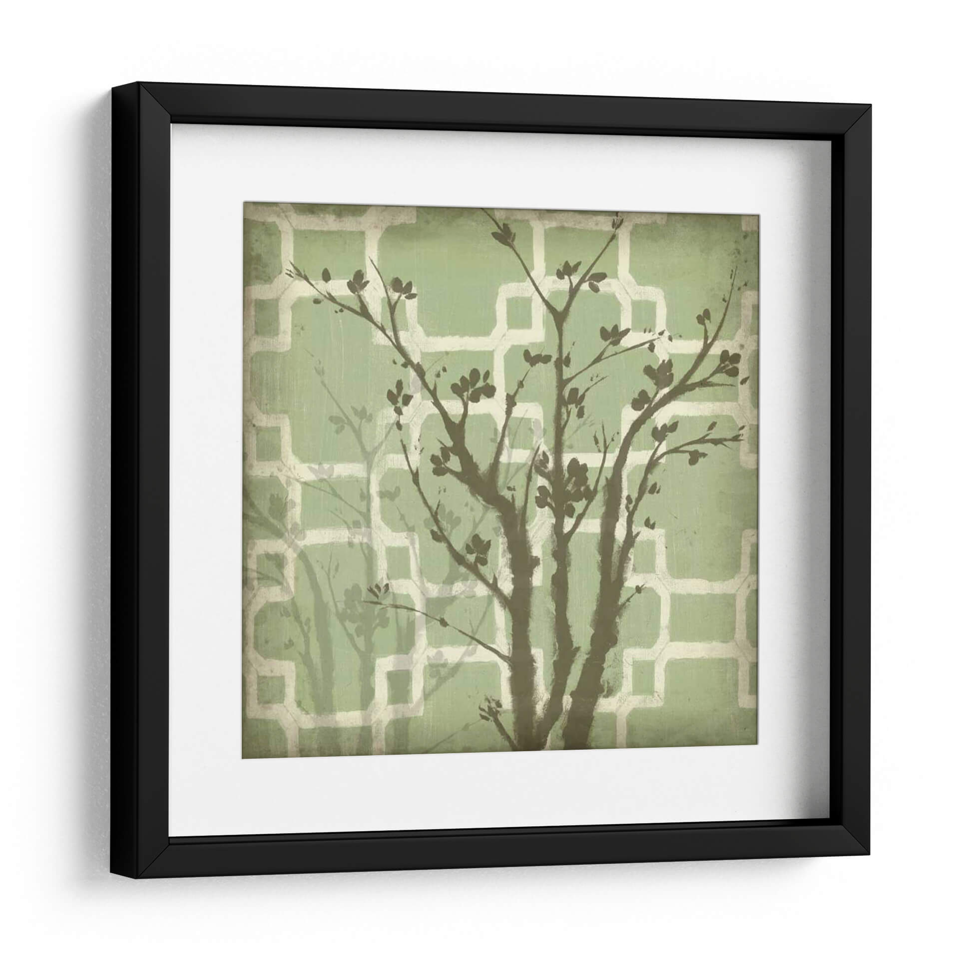 Sumérgete en la serenidad de "Silueta Y Patrón Iii", una cautivadora obra de arte contemporáneo de Jennifer Goldberger. Este cuadro decorativo presenta una delicada silueta de un árbol en flor, con ramas oscuras y sutiles hojas que se alzan sobre un fondo texturizado de patrones geométricos en tonos verdes y crema. La composición evoca una sensación de calma y conexión con la naturaleza, ideal para añadir un toque de sofisticación y tranquilidad a cualquier espacio. Los suaves matices verdes del fondo crean una atmósfera relajante, mientras que el contraste con las siluetas oscuras del árbol aporta profundidad y un elemento visual intrigante. Perfecto para salones modernos, dormitorios acogedores u oficinas que buscan un oasis de paz. "Silueta Y Patrón Iii" es más que una simple decoración; es una invitación a la contemplación y al disfrute estético, transformando tus paredes en un lienzo de serenidad y estilo contemporáneo.