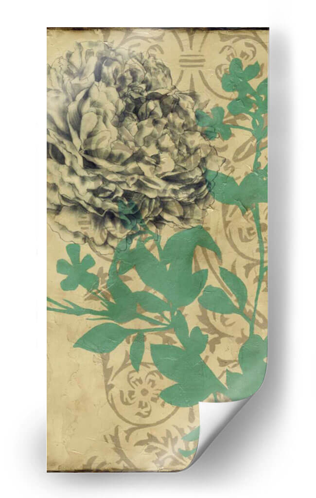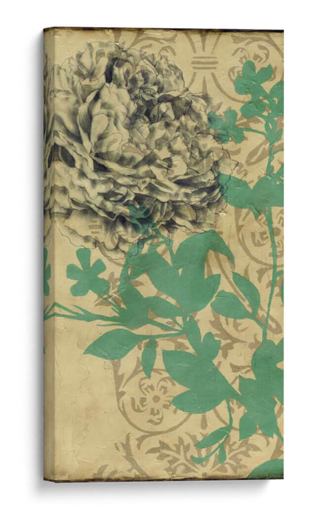 Sumérgete en la delicadeza botánica con "Tandem Blooms II", una obra de arte que captura la esencia de la naturaleza a través de una estética contemporánea. Este cuadro decorativo presenta una flor central ricamente detallada en tonos grises y negros, evocando un estudio botánico clásico, sobre un fondo texturizado en tonos arena. Contrastando sutilmente, hojas y ramas en un vibrante verde azulado (teal) se entrelazan, añadiendo un toque de modernidad y frescura a la composición. El diseño general combina un patrón damascado sutil y antiguo en el fondo, que aporta profundidad y un aire de sofisticación. "Tandem Blooms II" es ideal para quienes buscan infundir sus espacios con una sensación de calma y elegancia natural. Su paleta de colores versátil y su estilo que fusiona lo tradicional con lo moderno lo convierten en una pieza perfecta para salones, dormitorios o estudios que deseen un acento visual impactante pero sereno. Transforma tu hogar en una galería personal con esta pieza única de Jennifer Goldberger, un recordatorio de la belleza atemporal de las formas florales.