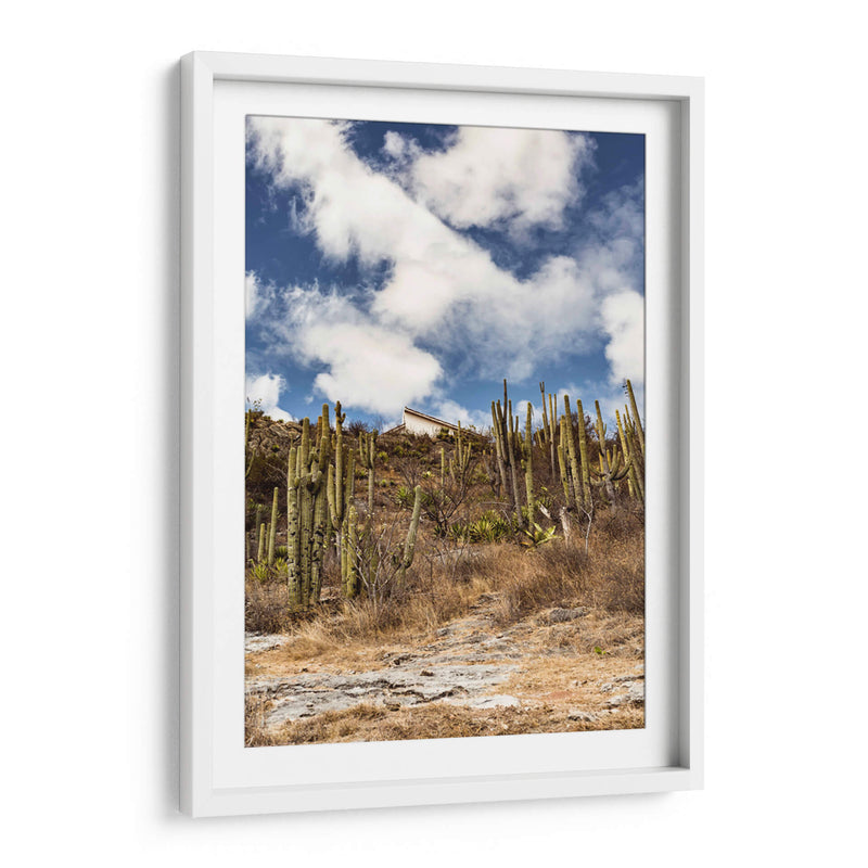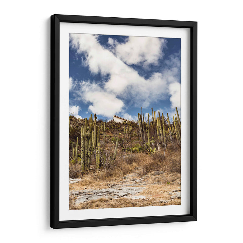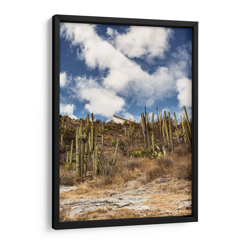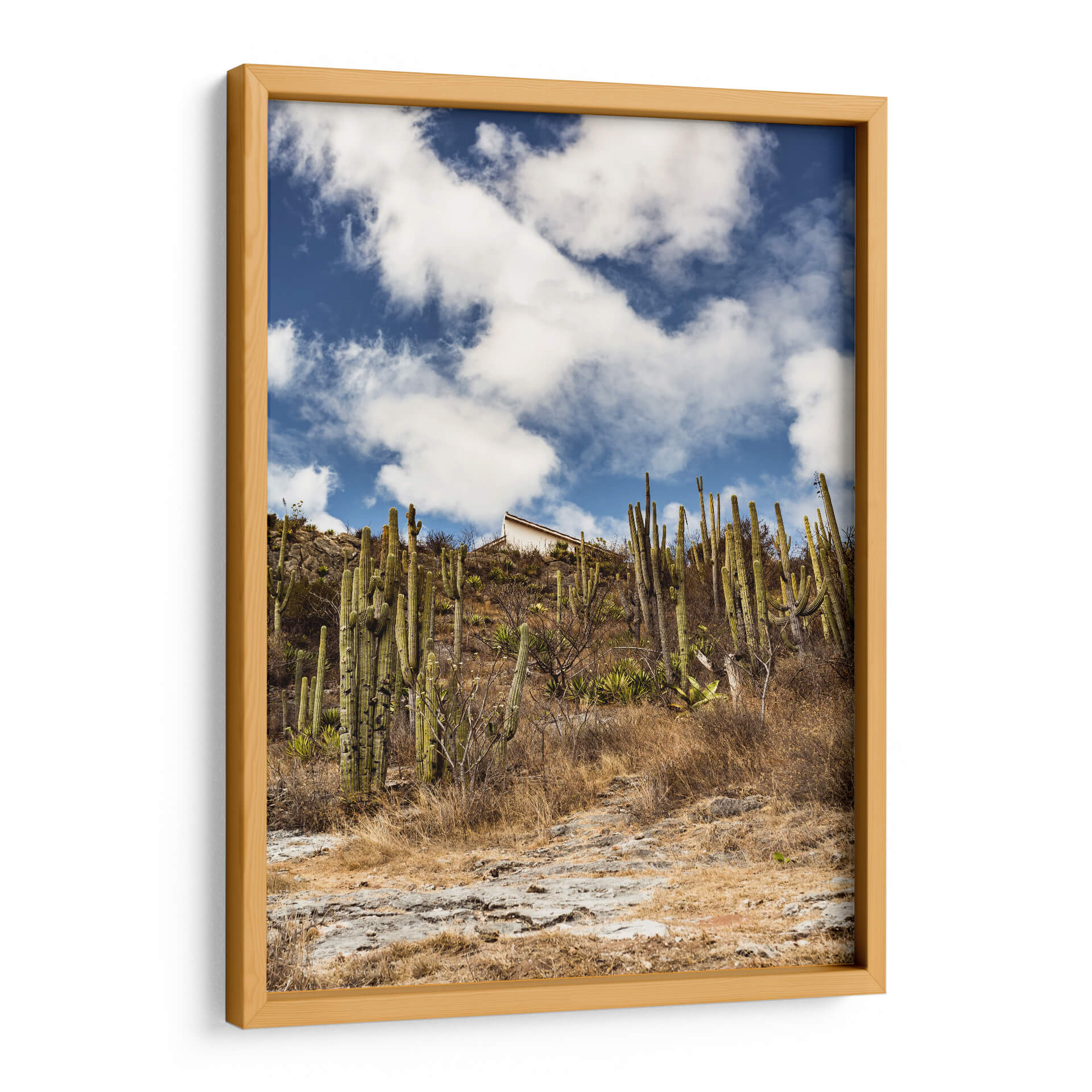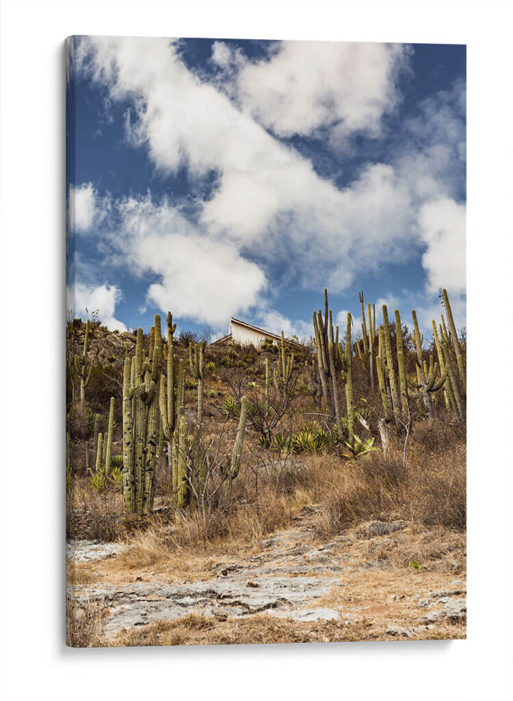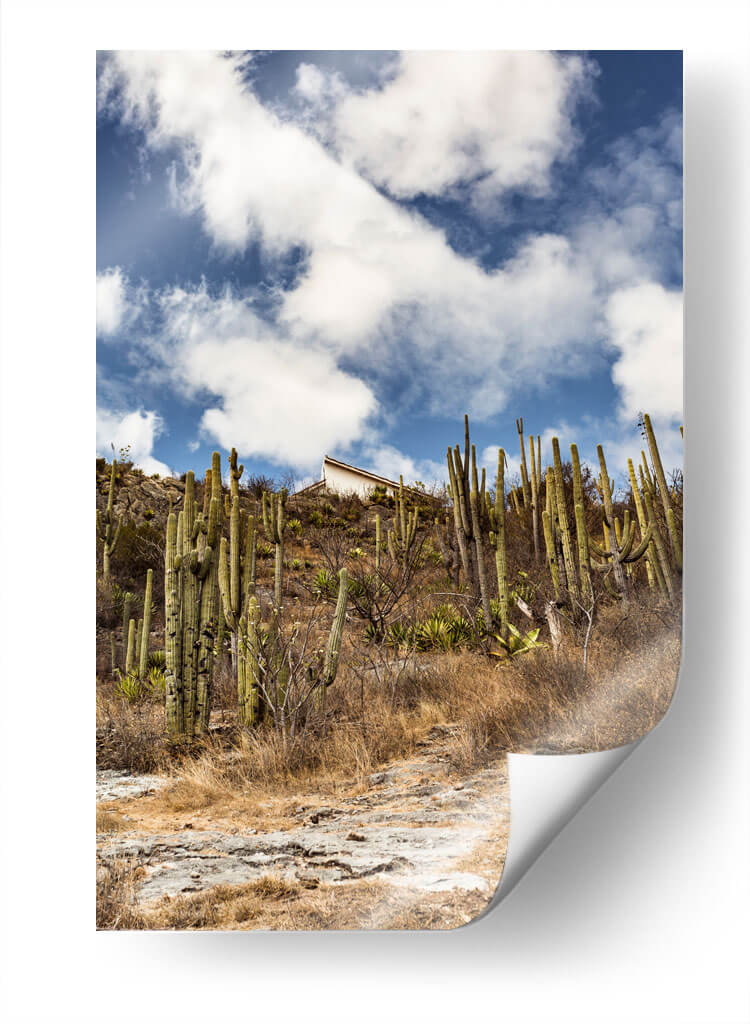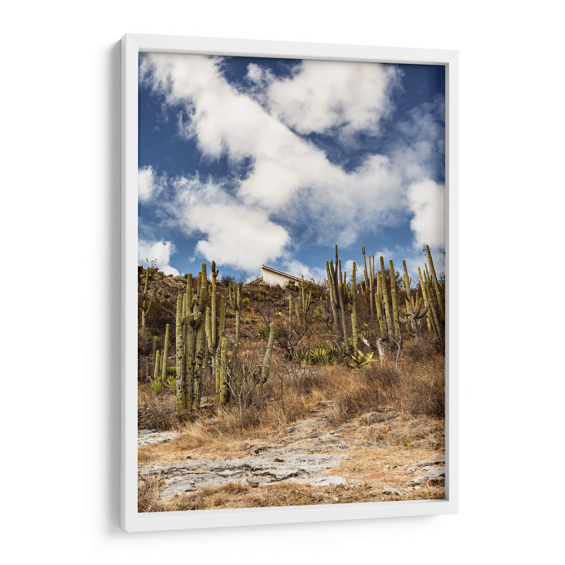 Sumérgete en la serena belleza del desierto con "Mixe Haus", una obra de arte que captura la majestuosidad de un paisaje árido bajo un cielo vibrante. Este cuadro decorativo presenta una densa arboleda de cactus saguaro que se alza orgullosa sobre un terreno seco y rocoso, coronado por una arquitectura minimalista que se integra armónicamente con la naturaleza. La paleta de colores, dominada por los tonos tierra, ocres y verdes profundos de los cactus, se complementa con el azul intenso del cielo y las nubes algodonosas, creando una atmósfera de paz y aislamiento contemplativo. La composición, que enfatiza la verticalidad de los cactus frente a la extensión del cielo, invita a la reflexión sobre la resiliencia y la belleza que se encuentra en los entornos más desafiantes. "Mixe Haus" es ideal para añadir un toque de naturaleza indómita y serenidad a cualquier espacio, ya sea un salón moderno, una oficina o un rincón tranquilo en el hogar. Su estética fotográfica y detallada, con una iluminación natural que resalta las texturas del desierto, lo convierte en una pieza de arte de pared cautivadora y duradera que transportará a tu hogar a un oasis de calma y estilo.