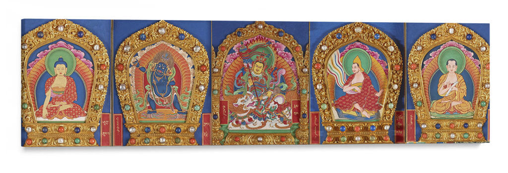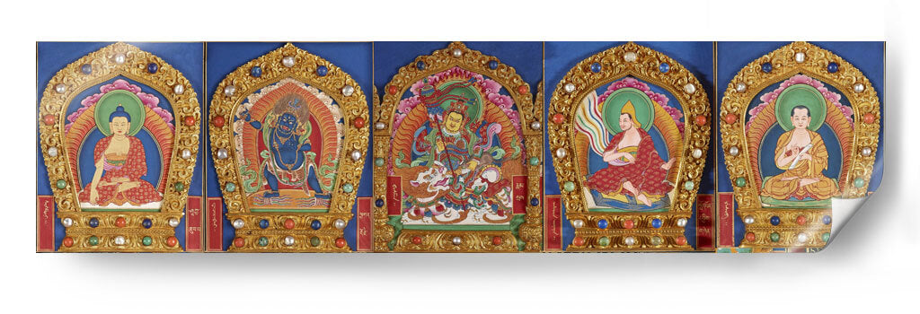 Sumérgete en la serenidad y el misticismo del Tíbet con este cautivador cuadro decorativo, inspirado en el arte budista tibetano. La obra presenta una composición panorámica de cinco paneles, cada uno enmarcado por intrincados detalles dorados y adornado con gemas de colores vibrantes, que evoca la riqueza visual de las mandalas y las thangkas tradicionales. En el centro, una figura principal irradia poder y espiritualidad, rodeada por otras representaciones de deidades y figuras iluminadas en posturas meditativas. La paleta de colores, dominada por azules profundos, rojos intensos, dorados resplandecientes y toques de verde esmeralda y turquesa, crea una atmósfera de profunda calma y reverencia. Los detalles finos en los rostros, las vestimentas y los atributos simbólicos de las figuras invitan a la contemplación. Este cuadro decorativo es ideal para infundir paz y una energía espiritual elevada en tu hogar, oficina o espacio de meditación. Su diseño intrincado y su temática espiritual lo convierten en una pieza central que atraerá miradas y fomentará la introspección, añadiendo un toque de autenticidad y profundidad cultural a tu decoración.