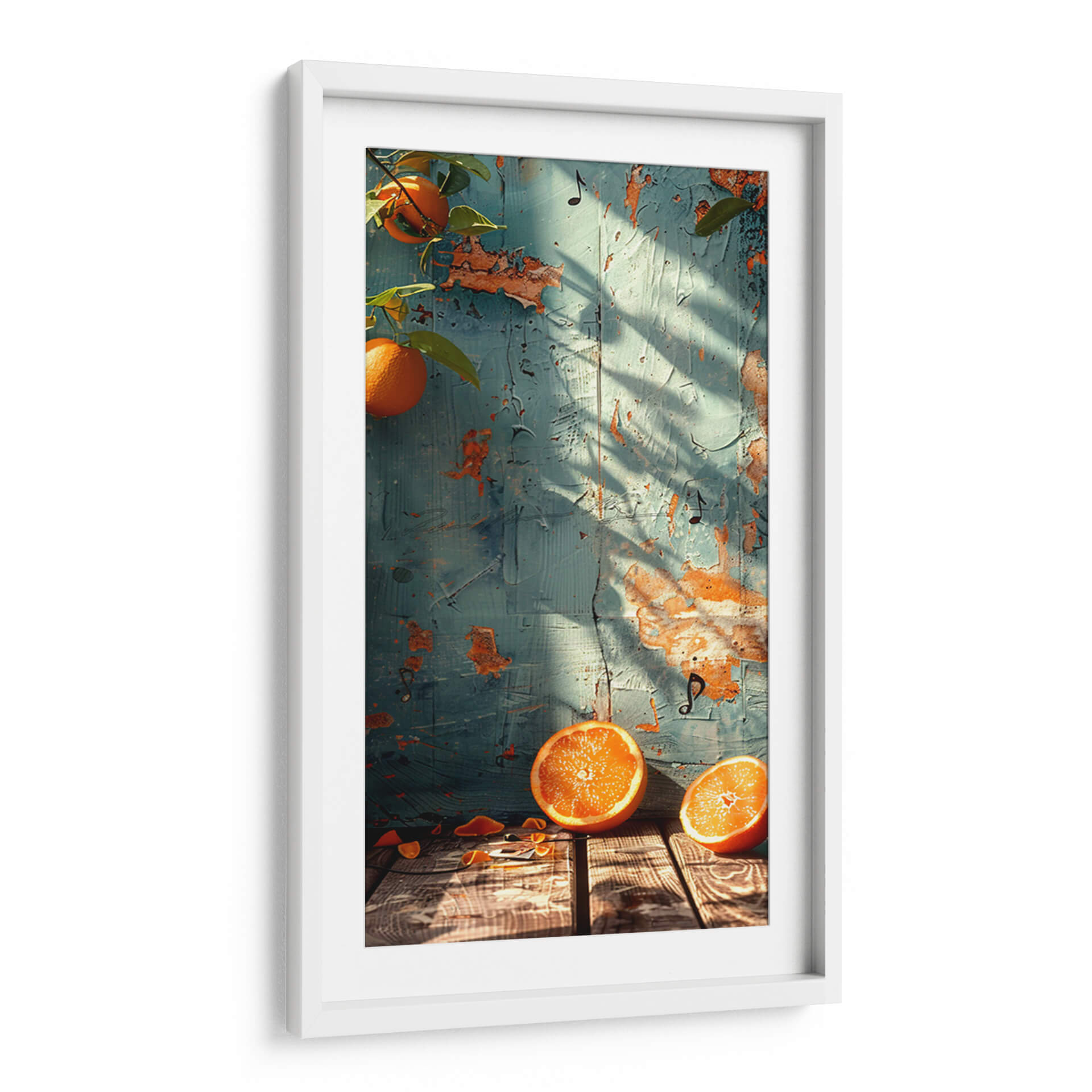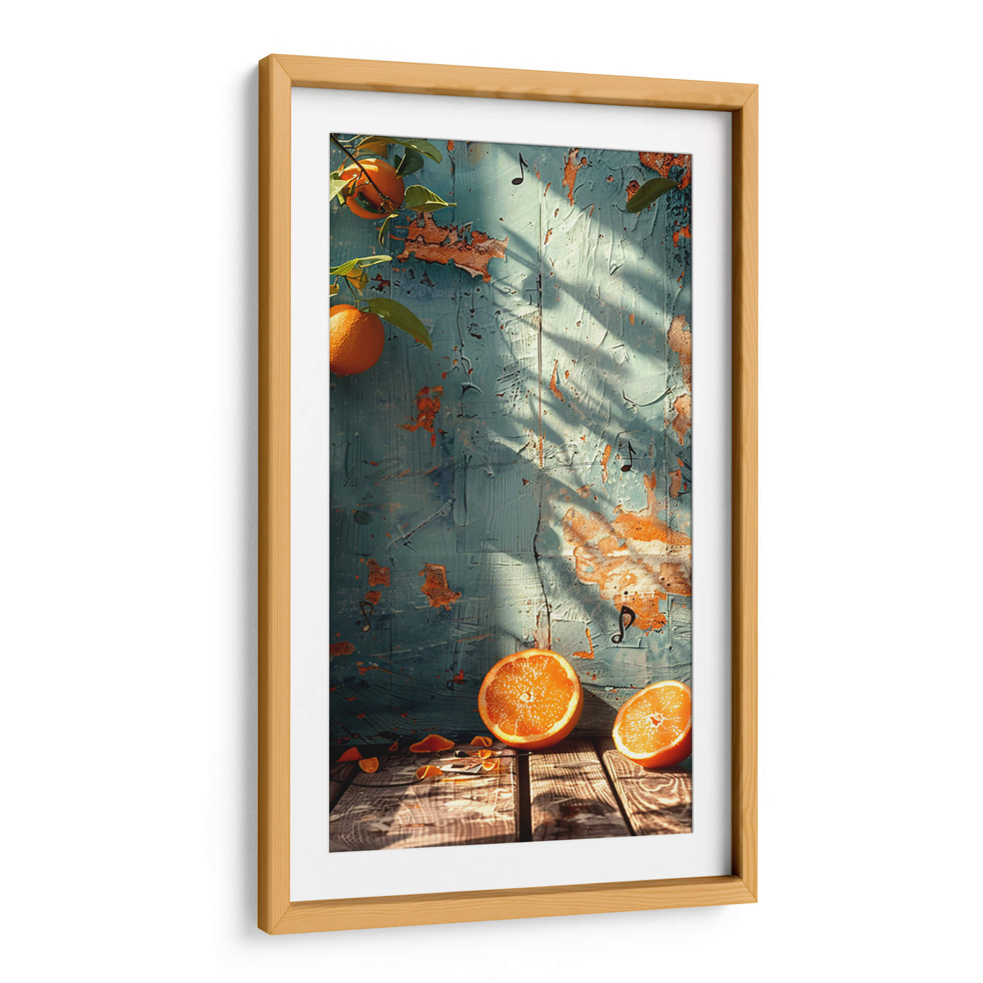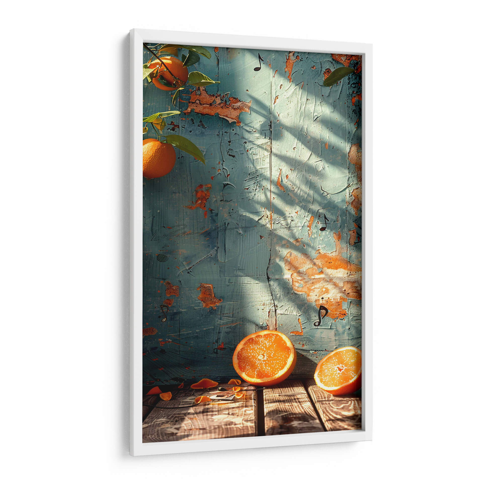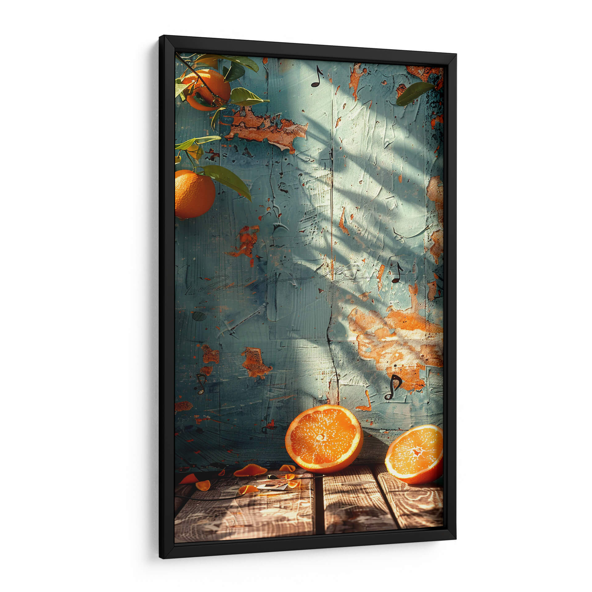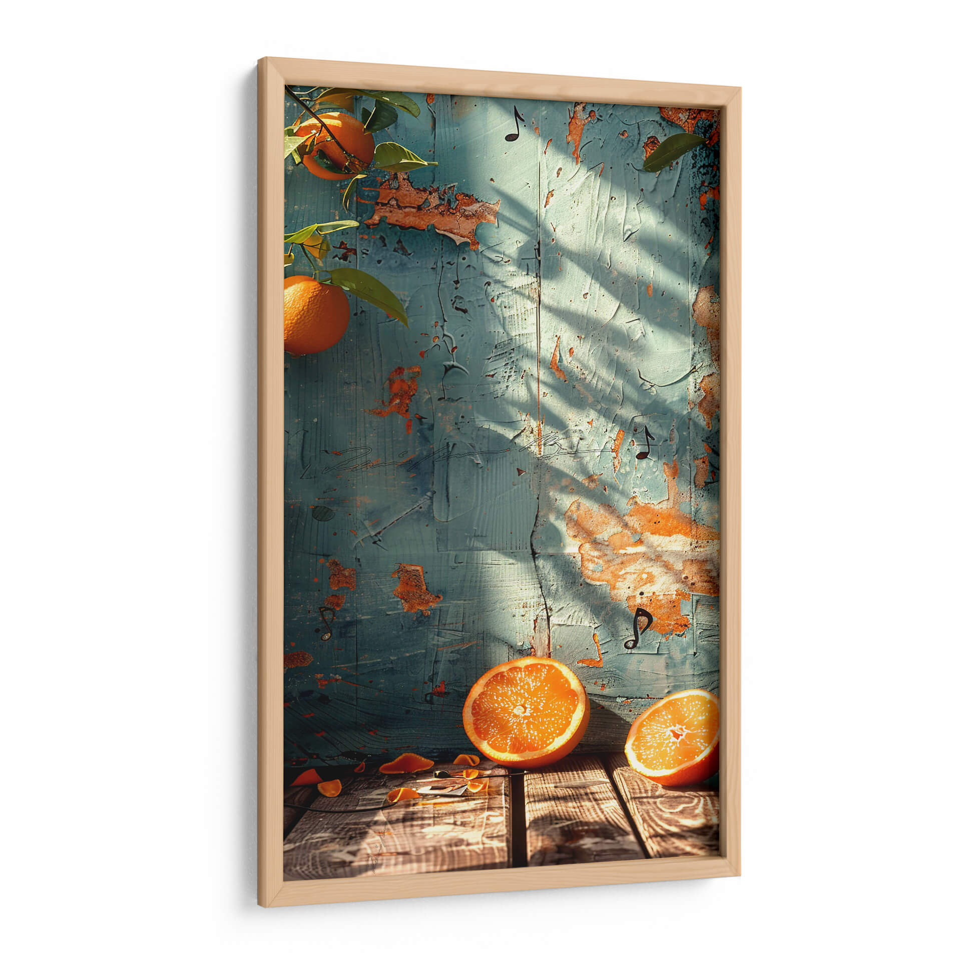 Sumérgete en la frescura y vitalidad de "Orancello", una obra de arte que captura la esencia cítrica con una paleta de colores vibrante y texturas evocadoras. Este cuadro decorativo presenta naranjas jugosas colgando de sus ramas, bañadas por la luz del sol que crea un juego de sombras danzantes sobre un fondo texturizado de azul verdoso descarapelado. La composición, que evoca una escena rústica y a la vez moderna, se complementa con sutiles notas musicales que añaden un toque de armonía y misterio. Las naranjas cortadas sobre una base de madera rústica invitan a sentir su aroma y frescura, convirtiendo esta pieza en un festín visual. "Orancello" es ideal para añadir un estallido de color y energía a tu sala de estar, cocina o comedor, creando un ambiente alegre y sofisticado. Su estilo único, que fusiona elementos de bodegón con una atmósfera casi pictórica, lo convierte en una adición perfecta para espacios que buscan un toque de originalidad y buen gusto. Deja que esta obra transporte tus sentidos a un jardín soleado, llenando tu hogar de luz y optimismo.