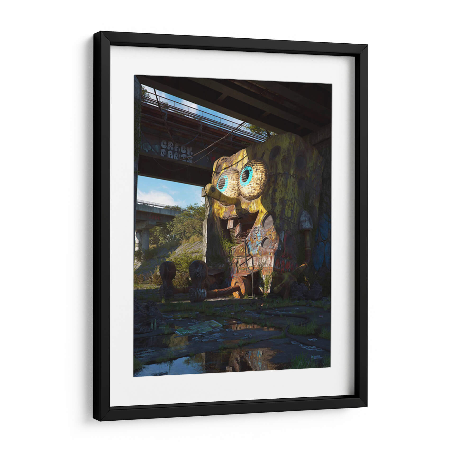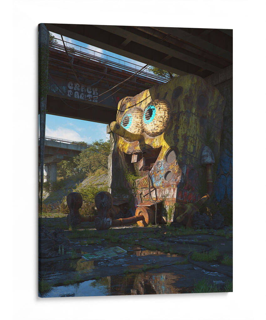 Sumérgete en la atmósfera post-apocalíptica y melancólica de "Bob Esponja Abandonado", un cuadro decorativo que redefine la nostalgia a través de una lente cruda y artística. Esta obra de arte digital presenta una figura icónica de la cultura pop, reimaginada como una estructura colosal y oxidada, olvidada bajo el peso de un puente de autopista. La paleta de colores se centra en tonos ocres, amarillos apagados y óxido, contrastando con los vibrantes toques de azul eléctrico en los ojos de la figura, que parecen mirar al vacío. La composición, con su perspectiva baja, enfatiza la monumentalidad y la desolación del escenario, realzado por la vegetación que reclama lo que una vez fue. El suelo, cubierto de escombros y charcos de agua, refleja la decadencia y el abandono. "Bob Esponja Abandonado" evoca una profunda sensación de melancolía, reflexión y el paso del tiempo, ideal para espacios que buscan un punto focal intrigante y con carácter. Es una pieza perfecta para salas de estar modernas, estudios o cualquier lugar donde se aprecie el arte contemporáneo con un giro conceptual y una narrativa visual potente. Añade un toque de arte urbano y surrealismo a tu decoración.