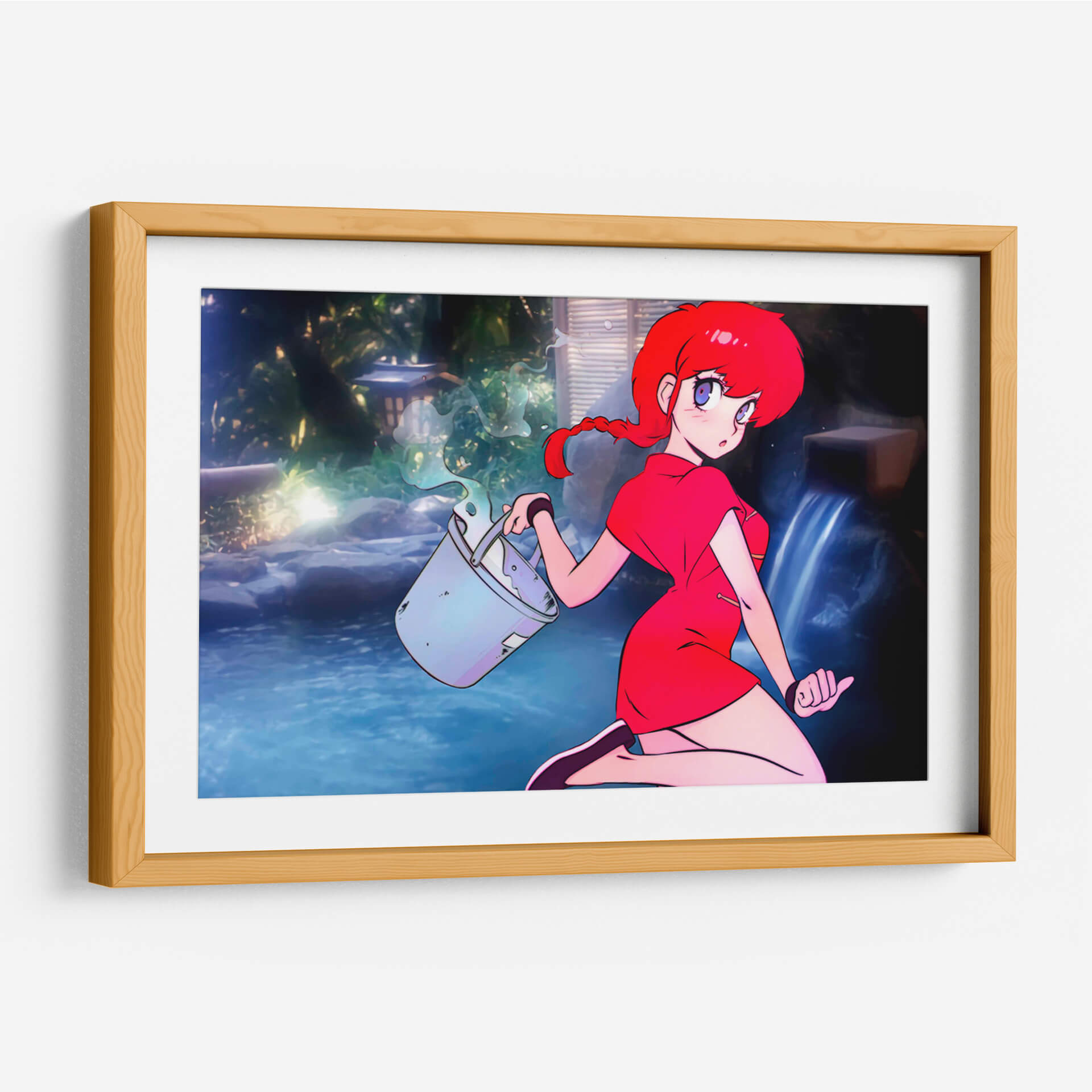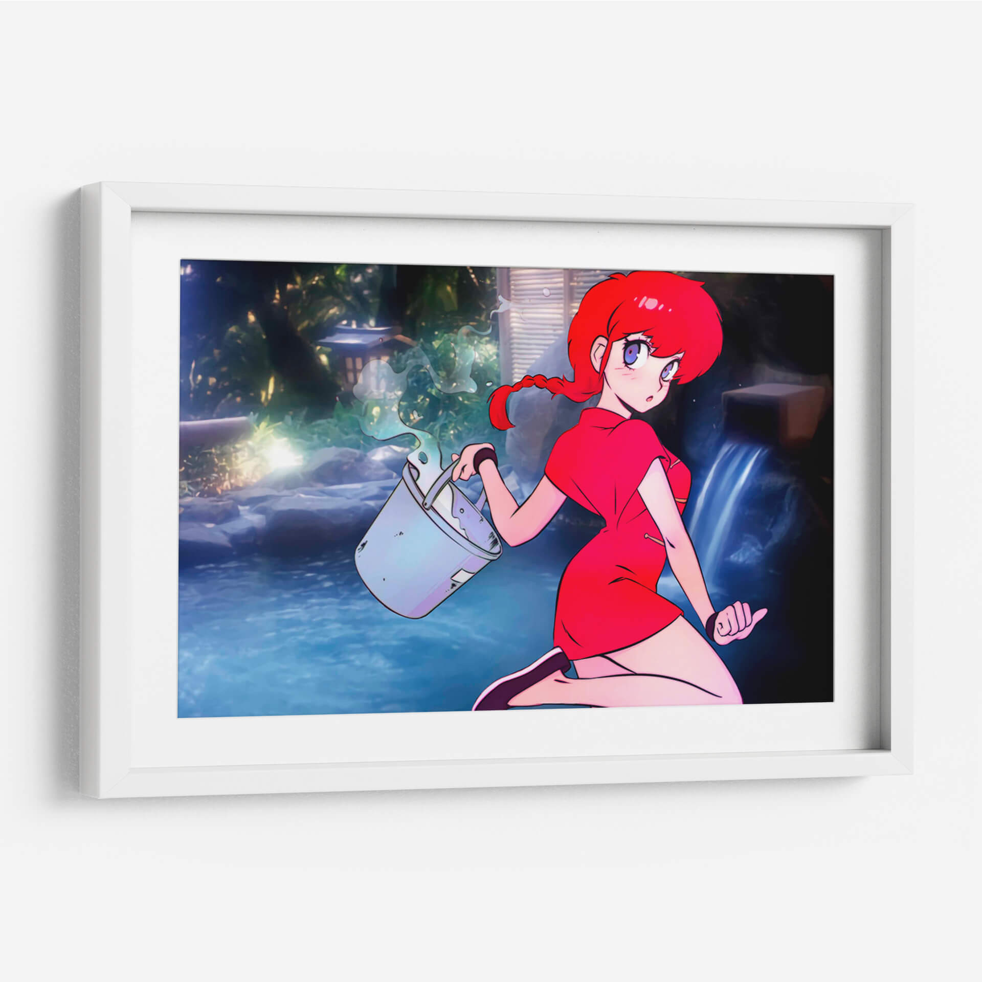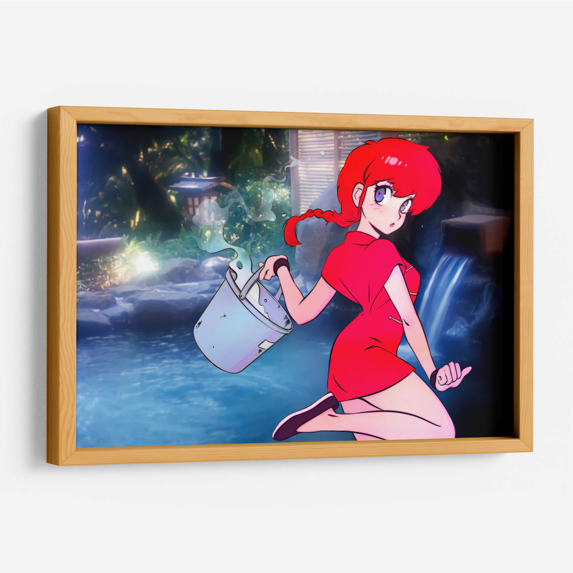 Sumérgete en la atmósfera vibrante de "Ranco con Cubeta", una obra de arte digital que captura la esencia de un momento fugaz con un estilo anime cautivador. La pieza presenta a una joven de cabello rojo intenso y ojos expresivos, vestida con un llamativo traje rojo, quien se encuentra en un entorno sereno que evoca un jardín japonés o un onsen. El azul profundo del agua, contrastando con la vegetación exuberante y las luces tenues, crea un escenario de tranquilidad y misterio. La composición se centra en la figura de la chica y el gesto dinámico de llevar una cubeta de la que se derrama agua, añadiendo un toque de acción a la escena. Esta obra es ideal para quienes buscan inyectar color y un aire de fantasía a sus espacios, ya sea una sala de estar moderna, una oficina creativa o un dormitorio personal. "Ranco con Cubeta" no es solo una decoración, es una ventana a un mundo de fantasía y serenidad, perfecta para añadir un toque único y personal a cualquier ambiente, atrayendo miradas y generando conversaciones. Su estética anime contemporánea la convierte en una pieza versátil para diversos estilos de decoración.