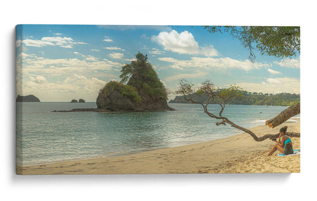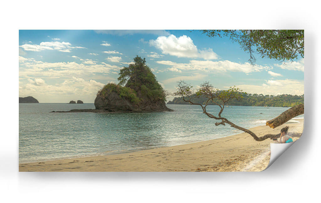 Sumérgete en la serenidad de la playa Espadilla con este evocador cuadro decorativo, 'Roca Tortuga'. La obra captura la majestuosidad de una formación rocosa que emerge del mar turquesa, evocando la forma de una tortuga, mientras una figura solitaria se refugia bajo la sombra de un árbol retorcido en la arena dorada. Los tonos azules del océano y el cielo, salpicados de nubes blancas y etéreas, contrastan armoniosamente con los verdes vibrantes de la vegetación que corona la roca y el cálido abrazo de la playa. La composición panorámica invita a la contemplación, transportándote a un oasis de paz y tranquilidad. Ideal para crear un rincón de relajación en tu hogar u oficina, este cuadro añade un toque de naturaleza y sosiego a cualquier espacio. La luz del sol baña la escena, realzando la belleza natural y la atmósfera de calma, perfecta para desconectar del ajetreo diario y conectar con la esencia de un paraíso tropical. Añade esta pieza única a tu colección y disfruta de la brisa marina y la serenidad de la costa en tu propia pared.