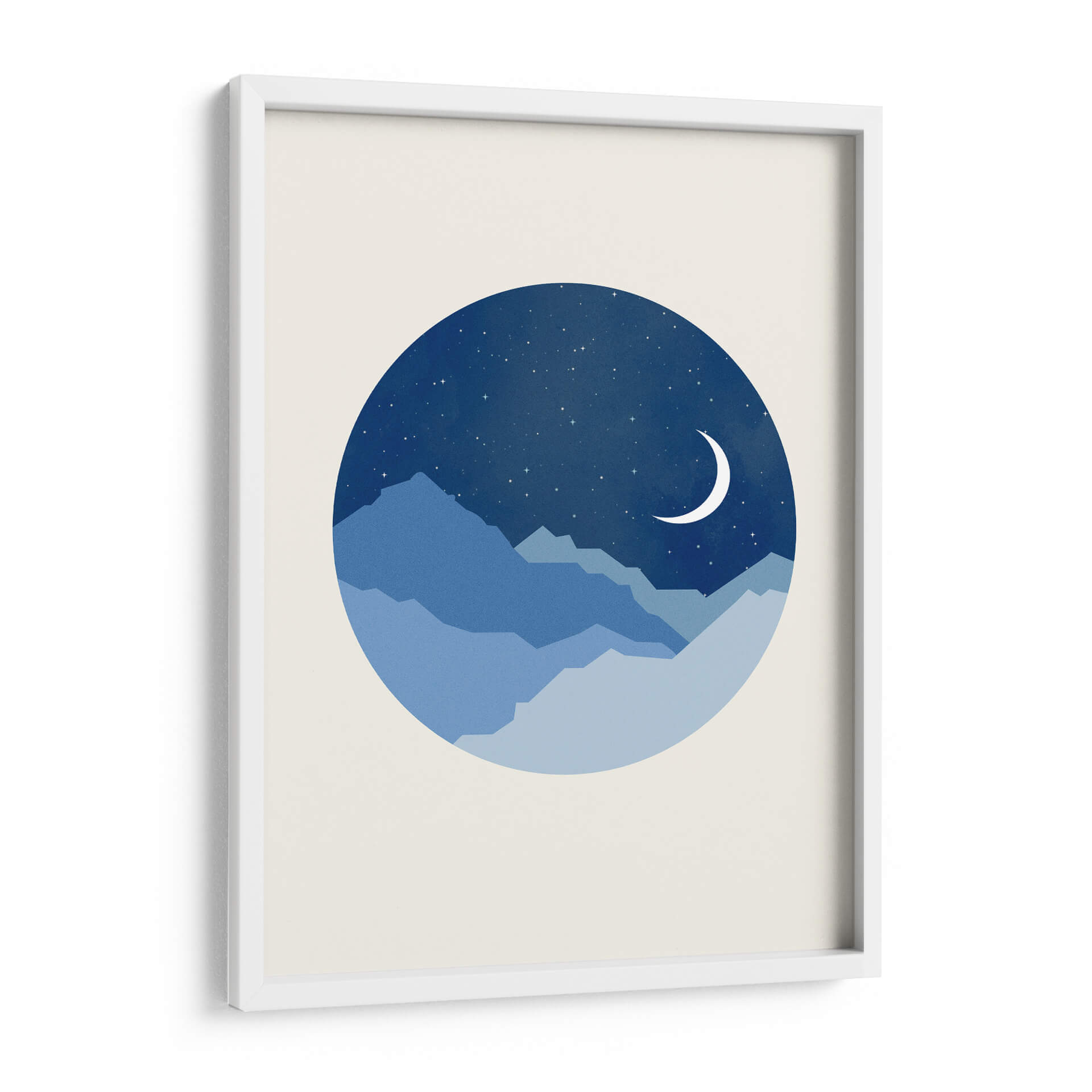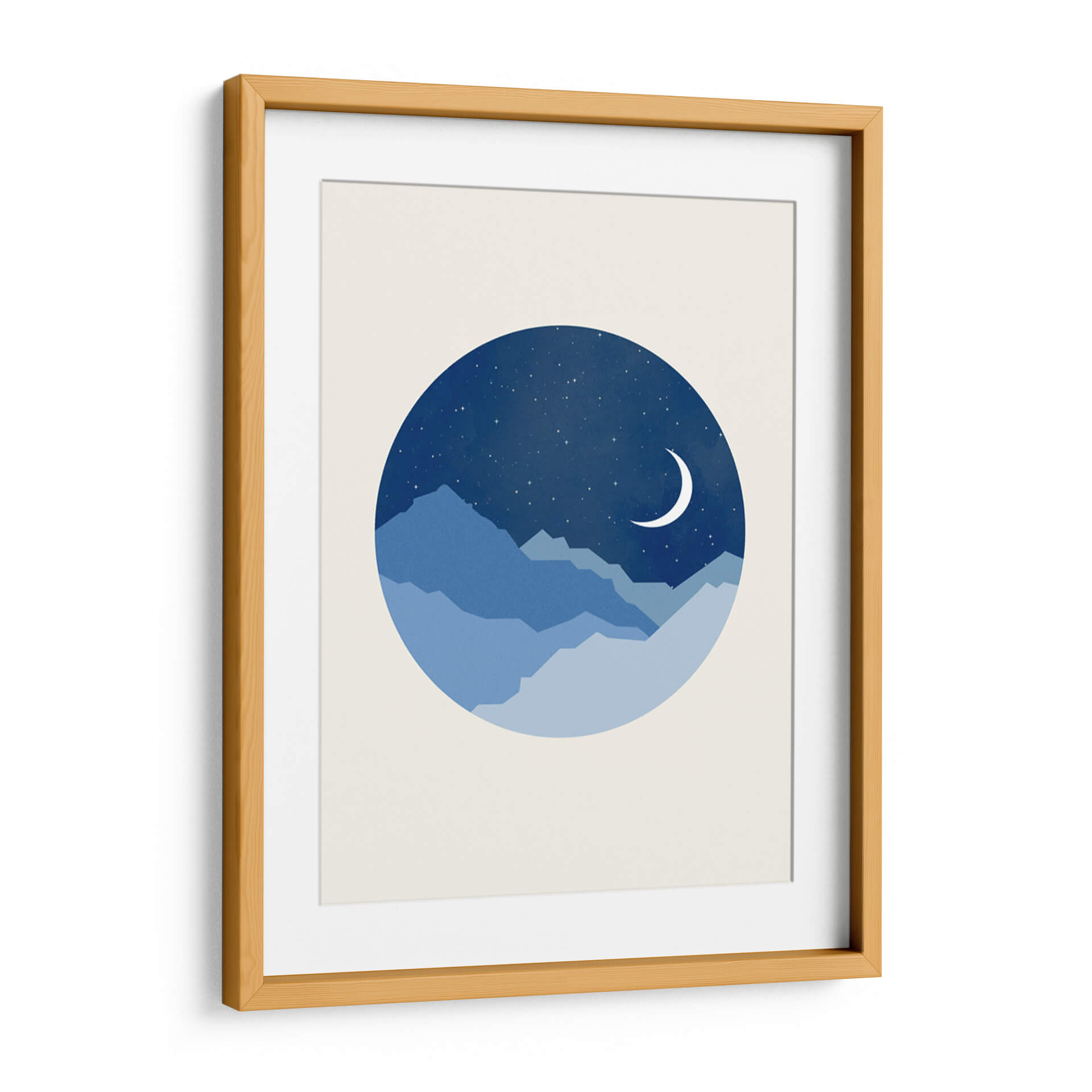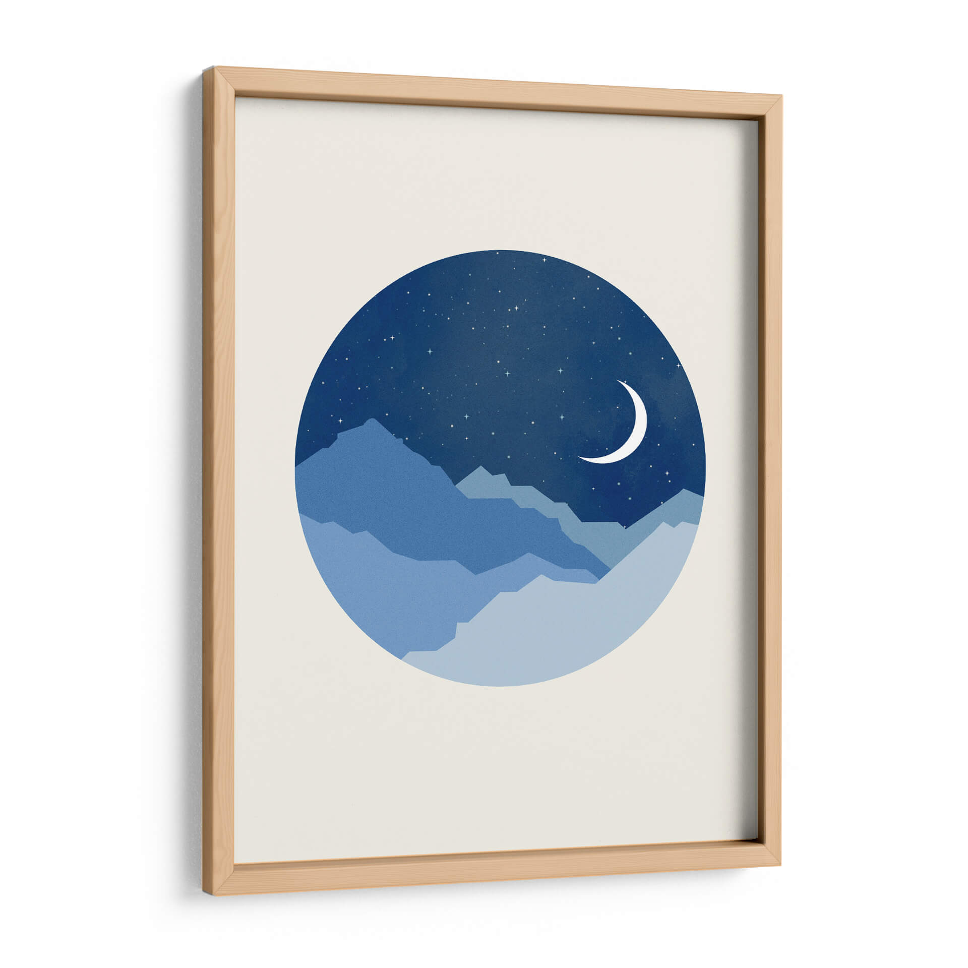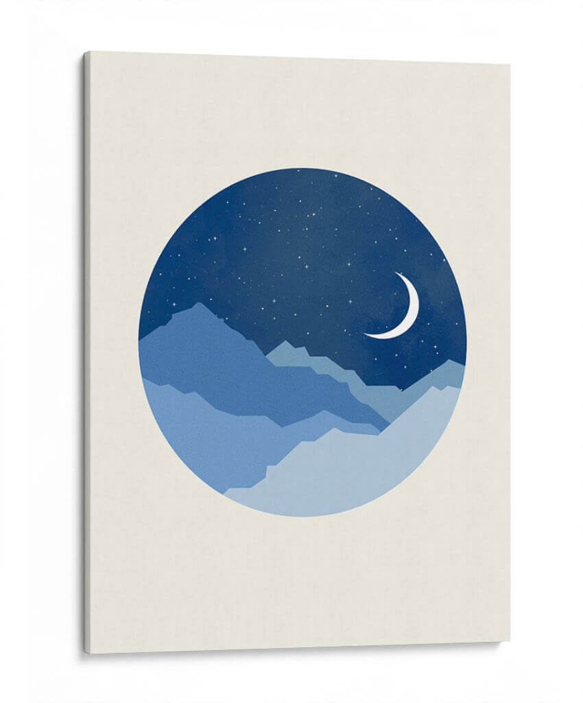 Sumérgete en la serenidad de "Circle Night", un cuadro decorativo que captura la majestuosidad de un paisaje nocturno estilizado. La obra presenta una composición circular que encierra un cielo estrellado profundo, adornado con una luna creciente que irradia una luz sutil. Debajo de este firmamento, se despliegan capas de montañas en tonos azules que van desde el índigo hasta el azul claro, creando una sensación de profundidad y tranquilidad. La paleta de colores, dominada por los azules y un fondo neutro, evoca calma y contemplación, ideal para cualquier espacio que busque un refugio de paz. Este arte de pared minimalista y abstracto es perfecto para añadir un toque de elegancia naturalista a tu sala de estar, dormitorio u oficina. Su diseño limpio y moderno lo convierte en una pieza versátil, capaz de complementar una amplia gama de estilos decorativos, desde el escandinavo hasta el contemporáneo. Deja que "Circle Night" te transporte a un momento de quietud y asombro ante la belleza del universo. Es más que una decoración, es una invitación a la reflexión y al descanso visual en tu hogar.