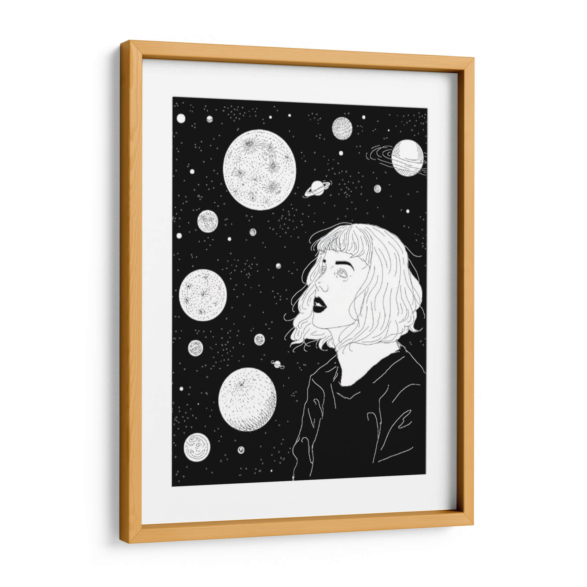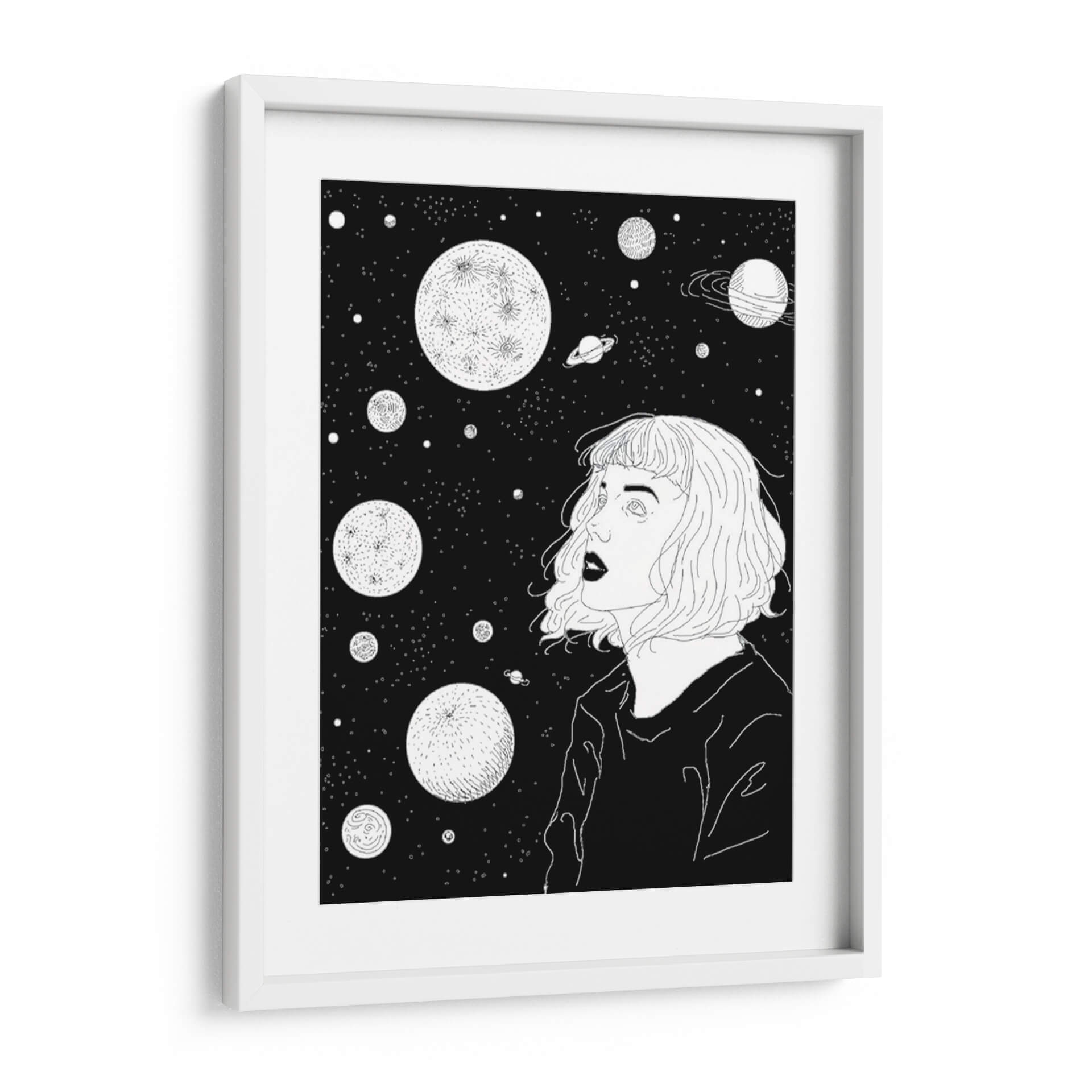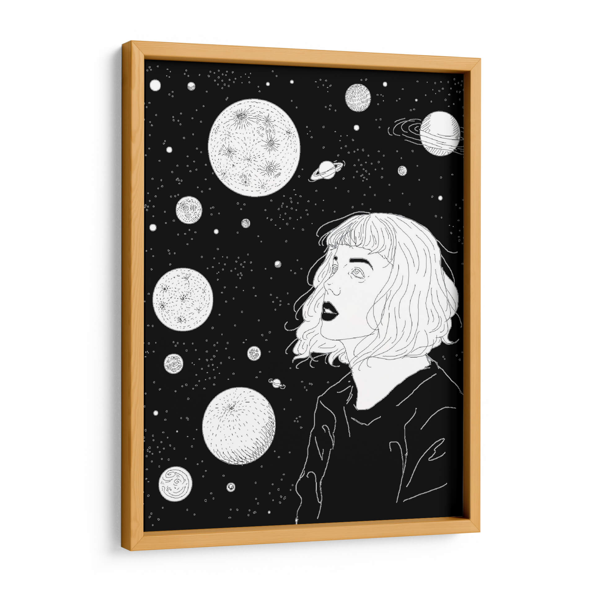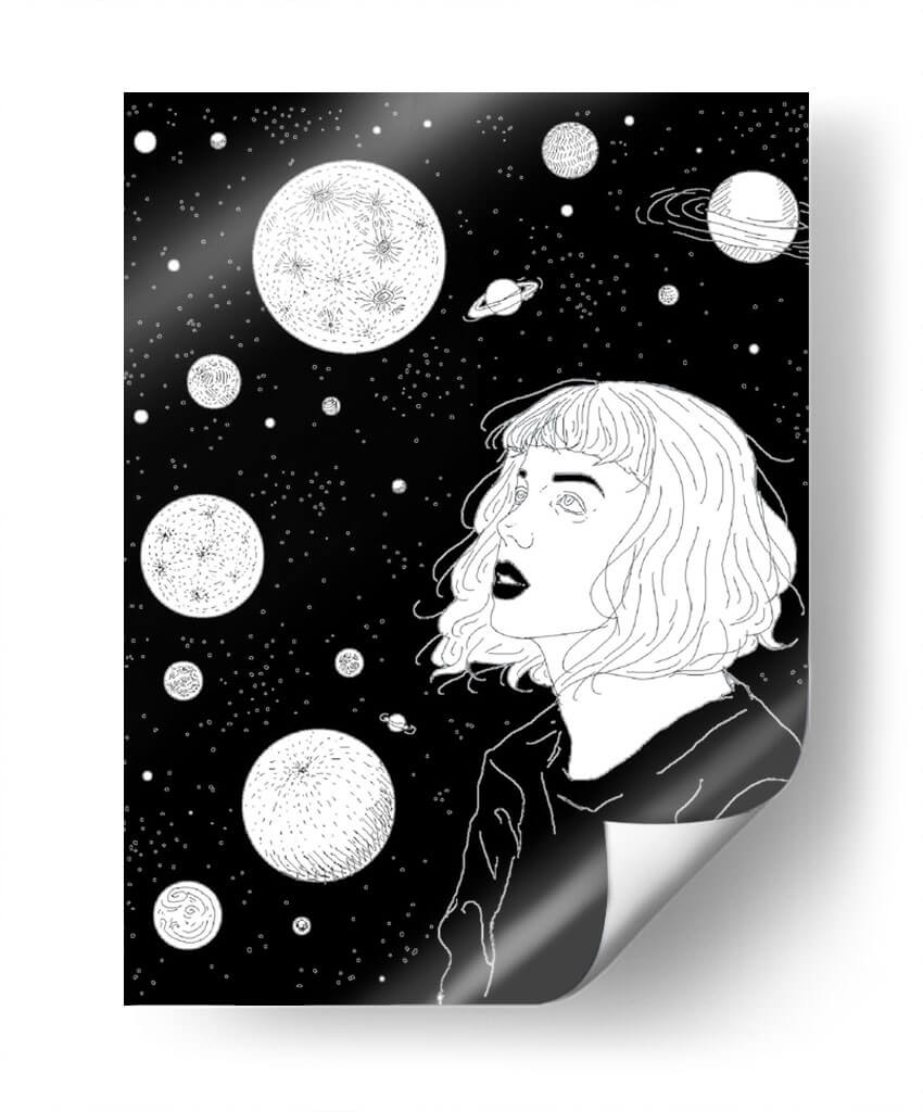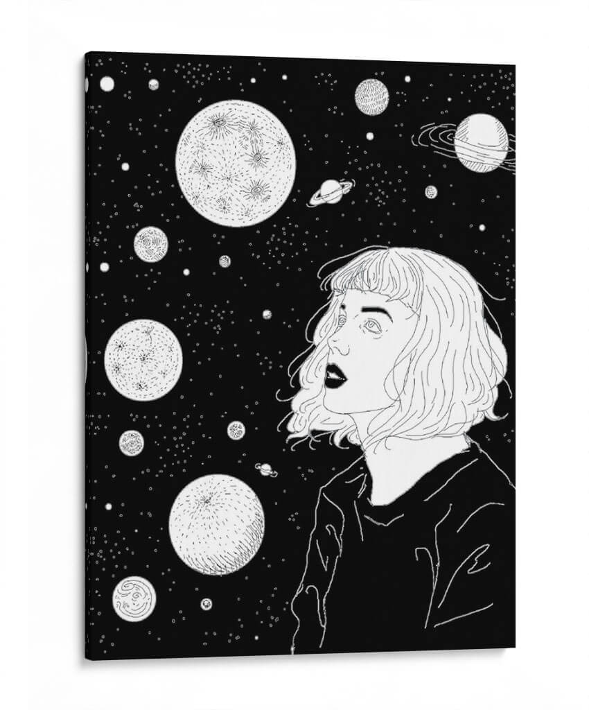 Sumérgete en la inmensidad del cosmos con este cautivador cuadro decorativo, 'Hipnotizada por la Galaxia'. Esta obra de arte de estilo lineal y minimalista presenta a una mujer joven mirando hacia un cielo estrellado, rodeada de planetas y cuerpos celestes. La paleta de colores, exclusivamente en blanco y negro, crea un contraste dramático y una atmósfera de misterio y asombro. Los trazos delicados y la composición limpia invitan a la reflexión sobre nuestro lugar en el universo, evocando una sensación de paz interior y maravilla. Es la pieza decorativa perfecta para aquellos que buscan añadir un toque de intriga y sofisticación a su hogar u oficina. Ideal para espacios modernos, minimalistas o con temática espacial, este cuadro decorativo se convertirá en un punto focal que inspira conversaciones y sueños. Su diseño atemporal y su temática universal lo hacen adaptable a cualquier estilo de decoración, aportando profundidad y un toque artístico único. Deja que esta obra te transporte a un viaje estelar cada día.
