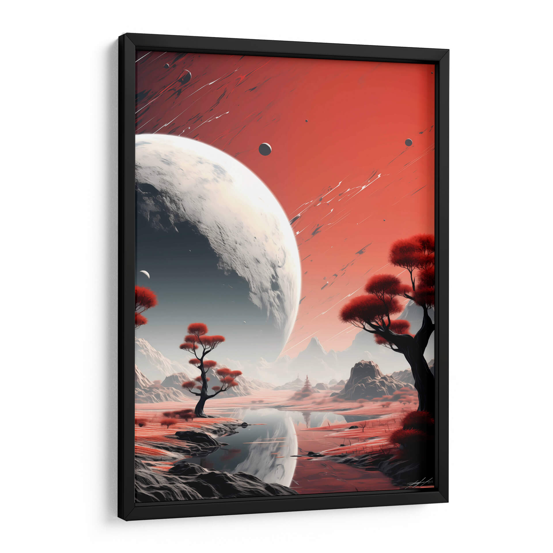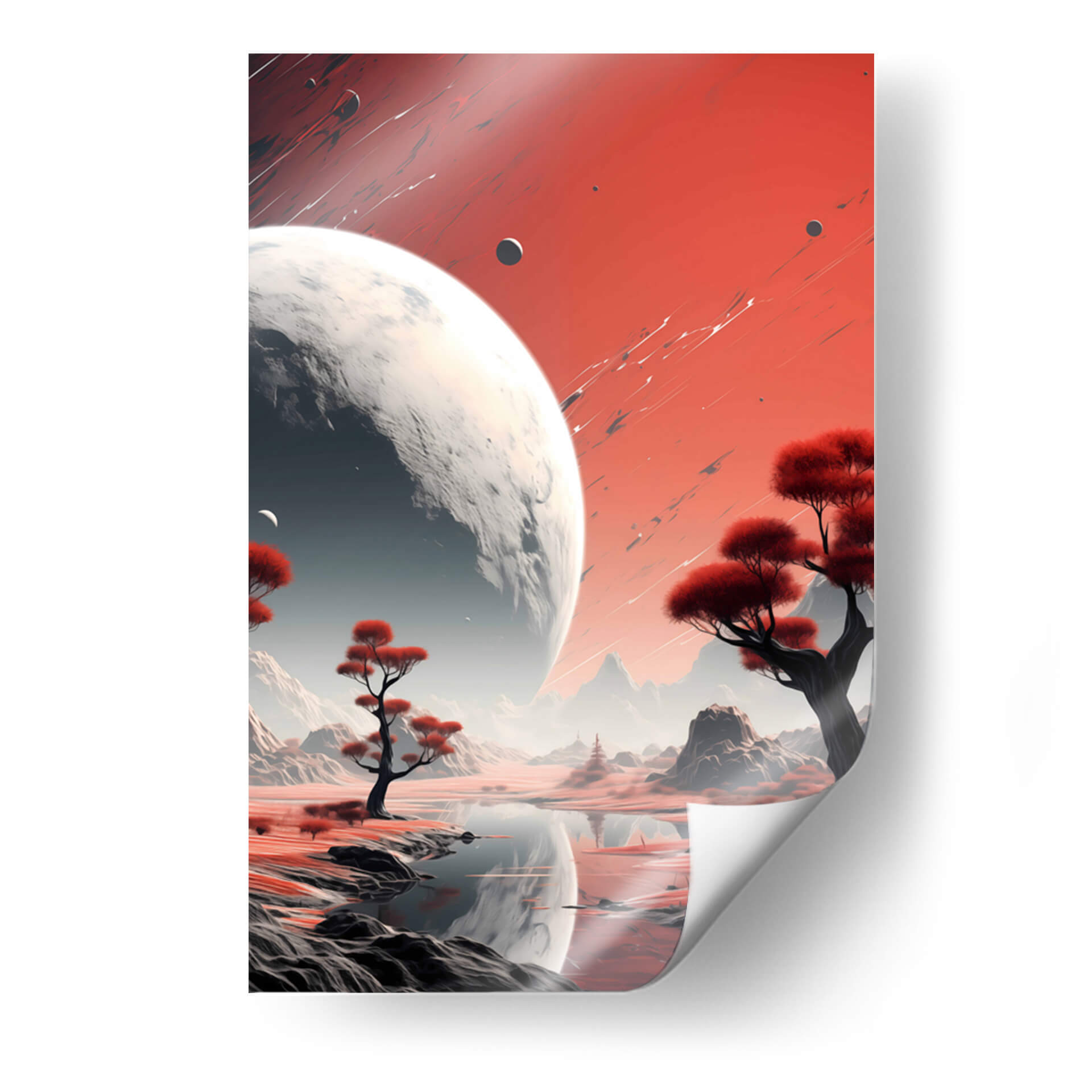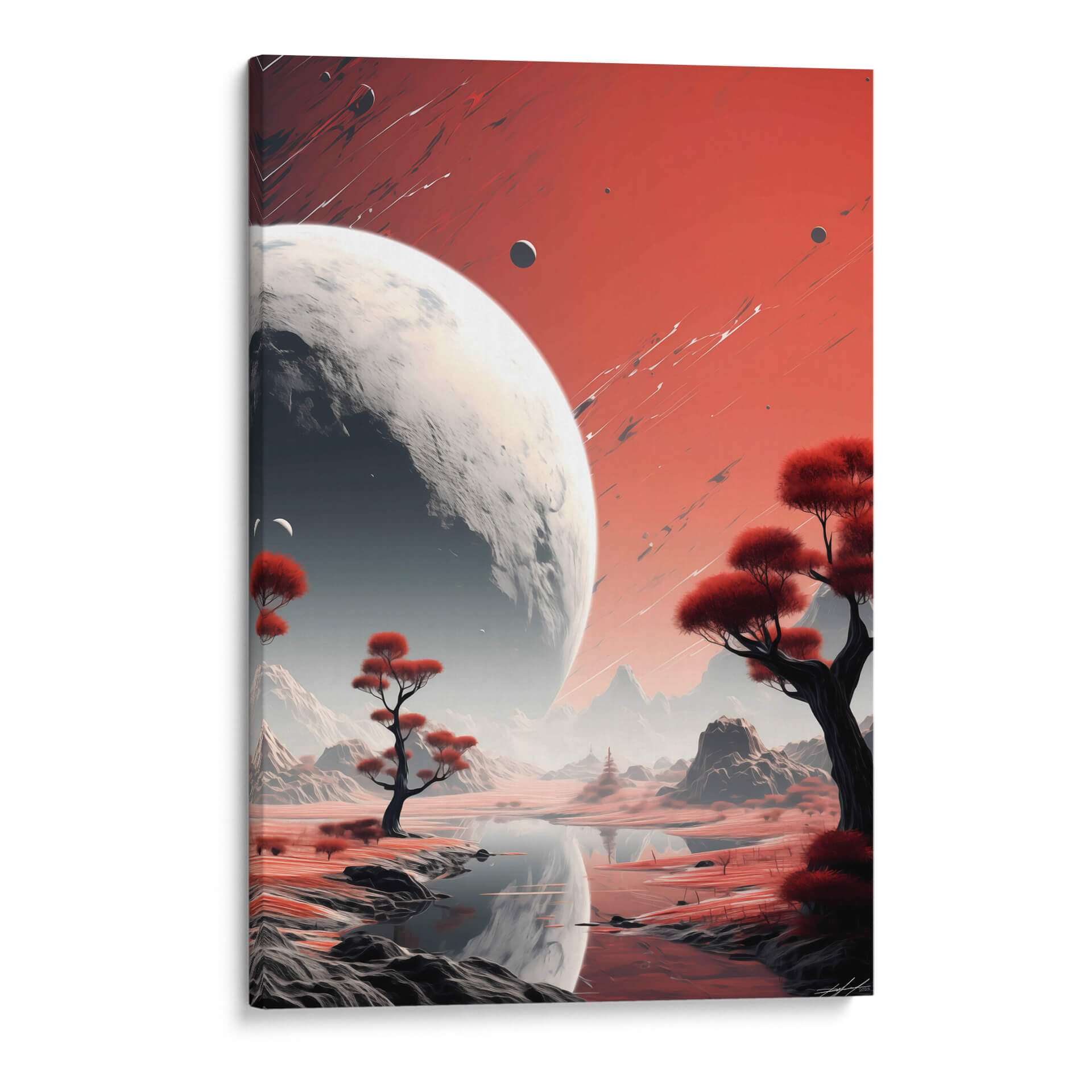 Sumérgete en la majestuosidad cósmica con "Mi Espacio - 16", una obra de arte digital que te transporta a paisajes interplanetarios de ensueño. Este cuadro decorativo presenta una escena dominada por un imponente planeta o luna, con su superficie texturizada y detallada, que se cierne sobre un mundo alienígena de tonos rojizos y ocres. La paleta de colores, con sus vibrantes rojos y contrastes de grises y blancos, crea una atmósfera de misterio y asombro, invitando a la contemplación del universo. Árboles estilizados con follaje carmesí salpican el terreno, reflejándose en las tranquilas aguas de un lago sereno, añadiendo un toque de vida exótica a este paraje extraterrestre. Las montañas de fondo, envueltas en una bruma etérea, sugieren una vasta e inexplorada extensión. La composición, equilibrada y evocadora, con trazos dinámicos en el cielo que añaden energía visual, convierte a "Mi Espacio - 16" en una pieza ideal para salones modernos, estudios de diseño o cualquier espacio que busque inspirar y estimular la imaginación. Este cuadro de arte contemporáneo es perfecto para amantes de la ciencia ficción, la astronomía y aquellos que buscan una decoración de pared única y cautivadora que dialogue con la inmensidad del cosmos.