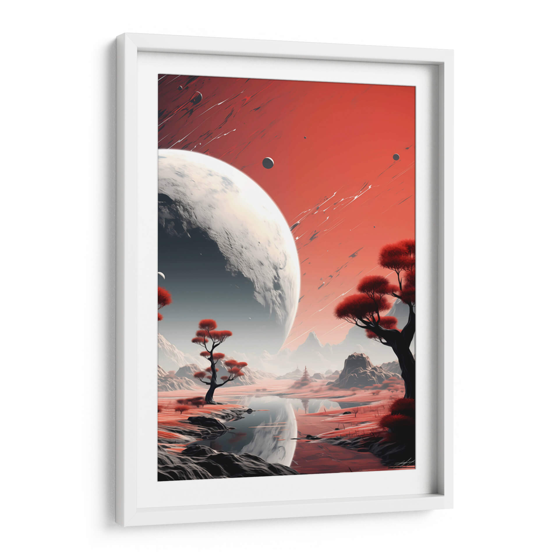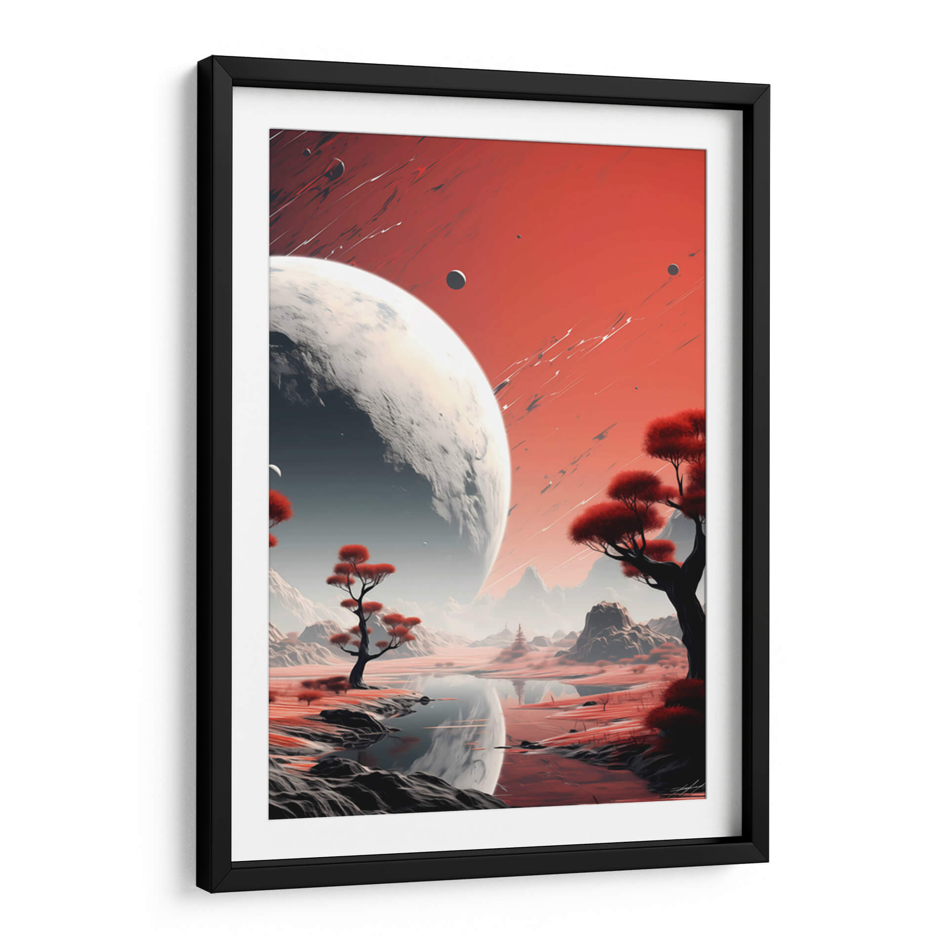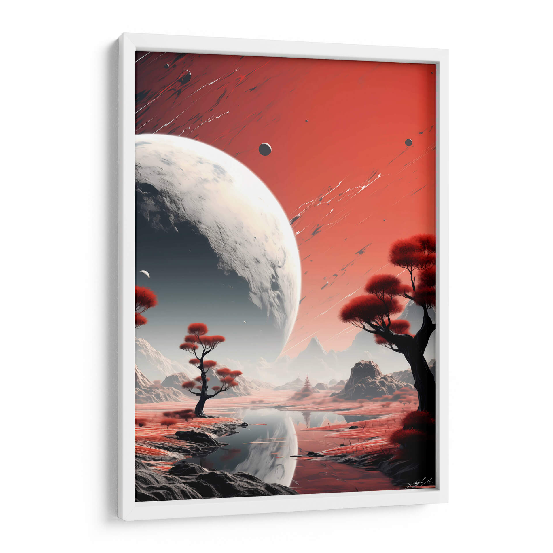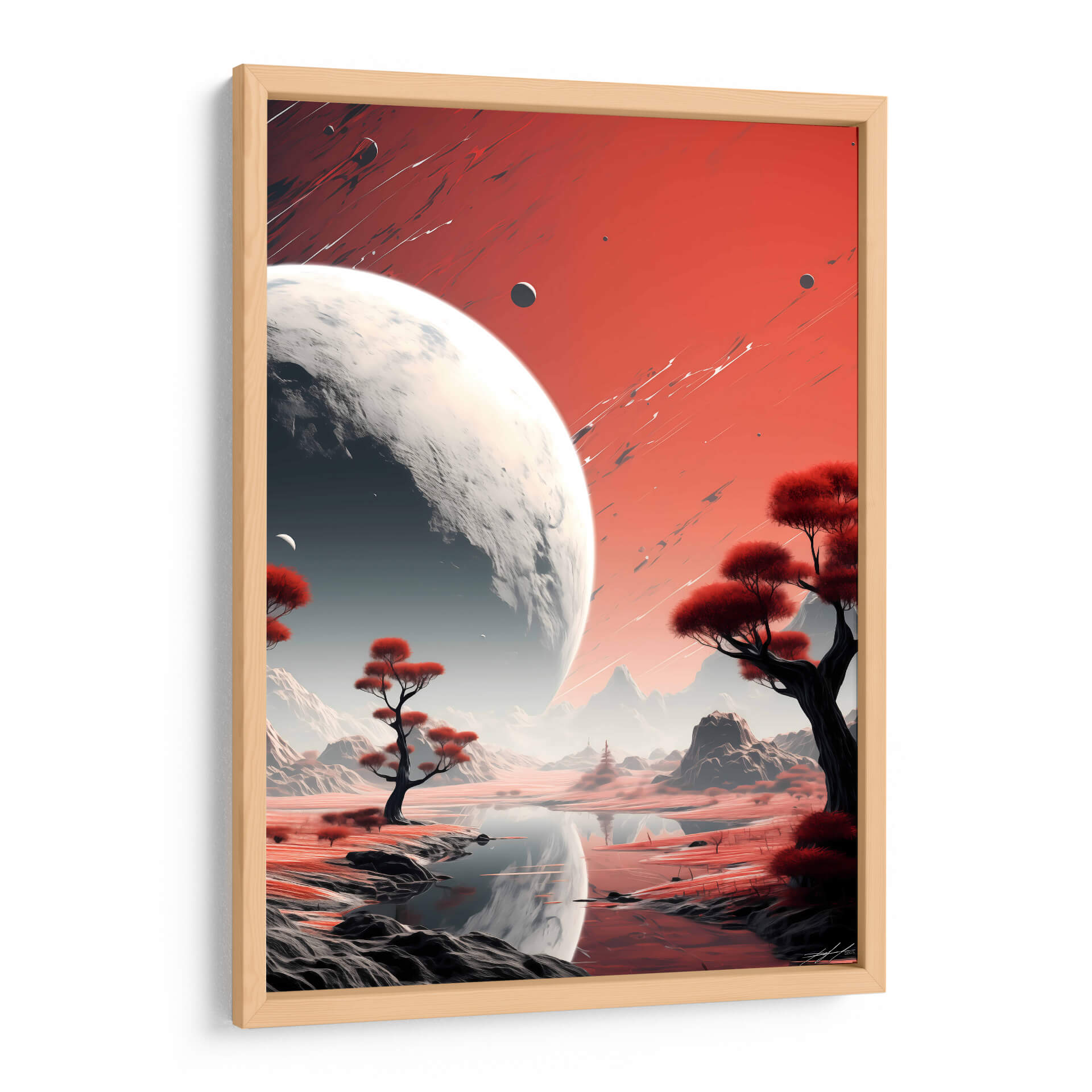 Sumérgete en la majestuosidad cósmica con "Mi Espacio - 16", una obra de arte digital que te transporta a paisajes interplanetarios de ensueño. Este cuadro decorativo presenta una escena dominada por un imponente planeta o luna, con su superficie texturizada y detallada, que se cierne sobre un mundo alienígena de tonos rojizos y ocres. La paleta de colores, con sus vibrantes rojos y contrastes de grises y blancos, crea una atmósfera de misterio y asombro, invitando a la contemplación del universo. Árboles estilizados con follaje carmesí salpican el terreno, reflejándose en las tranquilas aguas de un lago sereno, añadiendo un toque de vida exótica a este paraje extraterrestre. Las montañas de fondo, envueltas en una bruma etérea, sugieren una vasta e inexplorada extensión. La composición, equilibrada y evocadora, con trazos dinámicos en el cielo que añaden energía visual, convierte a "Mi Espacio - 16" en una pieza ideal para salones modernos, estudios de diseño o cualquier espacio que busque inspirar y estimular la imaginación. Este cuadro de arte contemporáneo es perfecto para amantes de la ciencia ficción, la astronomía y aquellos que buscan una decoración de pared única y cautivadora que dialogue con la inmensidad del cosmos.