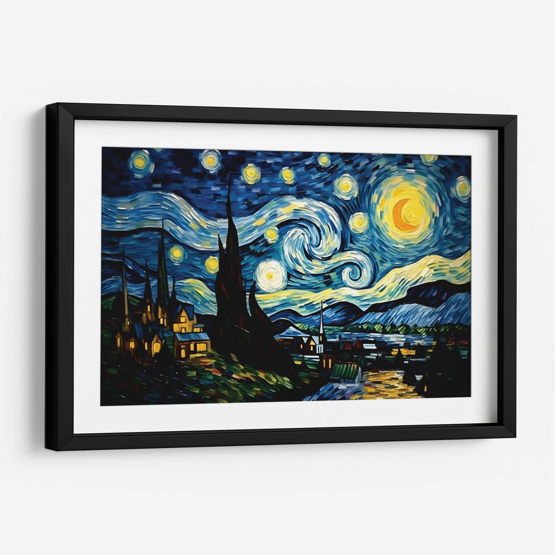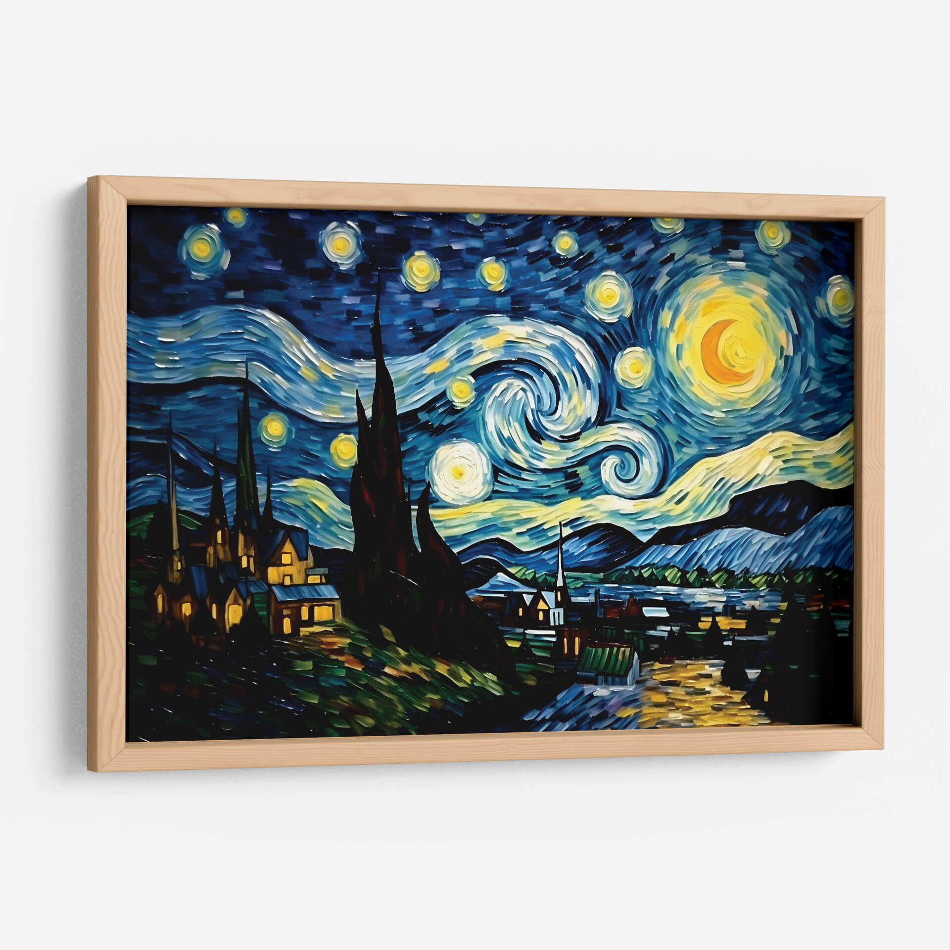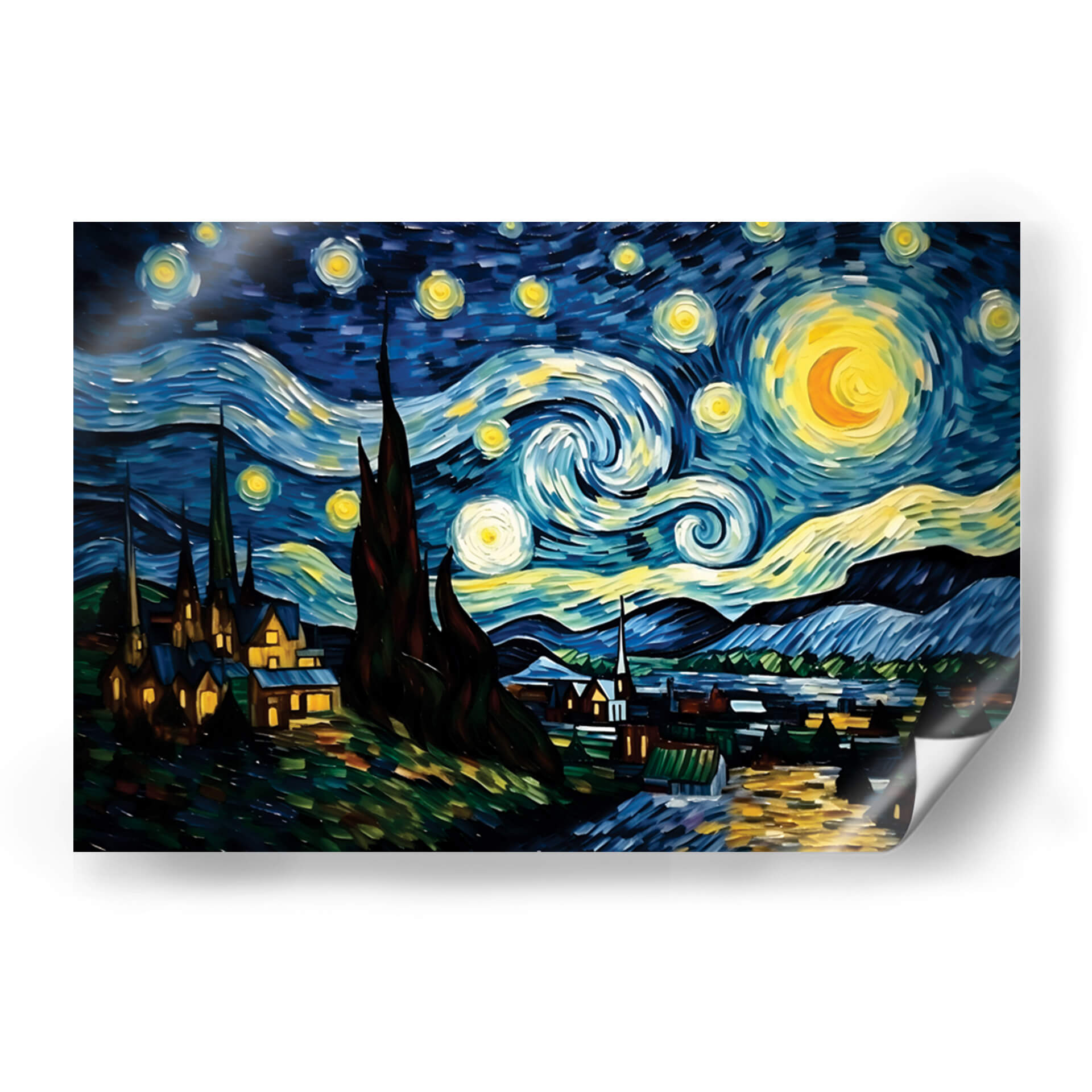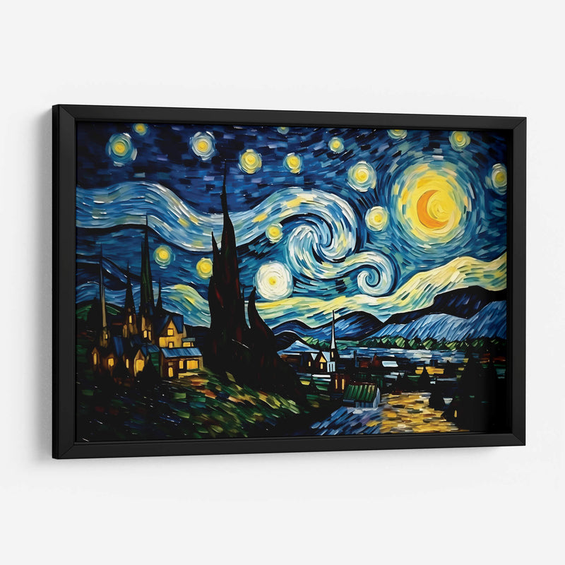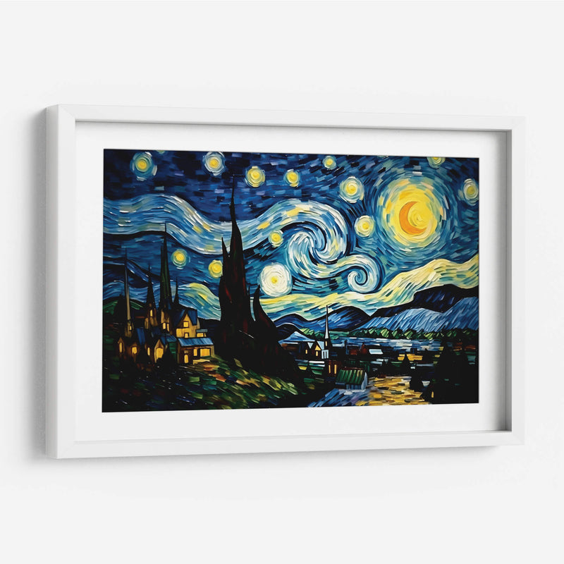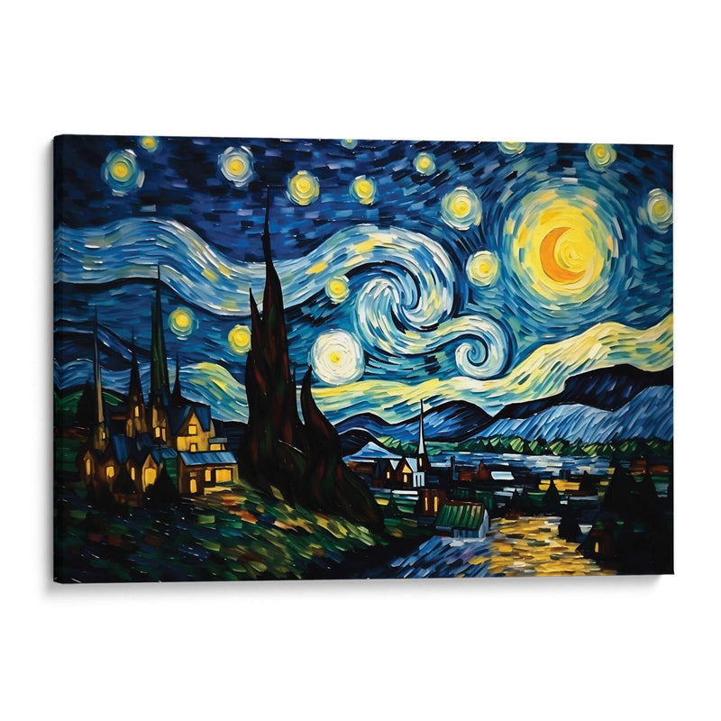 Sumérgete en la magia nocturna con "Mi Noche Estrellada" de Dav Madrid, un cuadro decorativo que captura la esencia de un cielo estrellado vibrante y un paisaje nocturno lleno de misterio. Los trazos audaces y la paleta de colores intensos, dominada por profundos azules, amarillos luminosos y toques de verde y naranja, crean una atmósfera de ensueño y contemplación. La obra presenta un cielo turbulento con espirales de luz y estrellas que giran, un gran astro o luna creciente con un brillo deslumbrante, y siluetas oscuras de cipreses que se elevan hacia el firmamento. Debajo, un pintoresco pueblo se ilumina con luces cálidas, contrastando con la oscuridad del paisaje y la energía celestial. Este cuadro decorativo es una interpretación contemporánea de un tema clásico, ideal para infundir un sentido de asombro y serenidad en cualquier espacio. Perfecto para salas de estar, dormitorios o estudios, "Mi Noche Estrellada" invita a la reflexión y añade un toque de arte expresivo y emotivo a tu decoración. Su estilo distintivo y su poderosa narrativa visual lo convierten en una pieza central que cautivará a todos los espectadores y transformará tu hogar.
