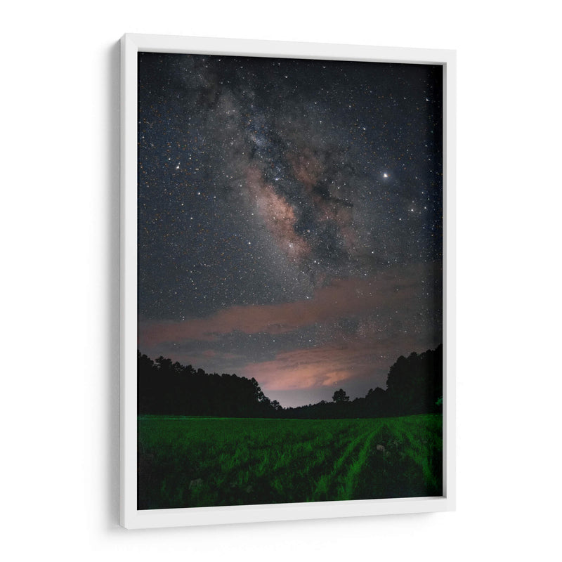 Sumérgete en la inmensidad del cosmos con este impresionante cuadro decorativo titulado 'Vía Láctea' del artista Enrique Estrada. La obra captura la majestuosidad de nuestra galaxia extendiéndose sobre un paisaje terrenal, creando un contraste cautivador entre lo cercano y lo infinito. Los tonos oscuros del cielo nocturno, salpicados por innumerables estrellas brillantes y las nebulosas rojizas y púrpuras de la Vía Láctea, evocan una sensación de misterio y asombro. Debajo, un campo de hierba verde vibrante, con sutiles texturas y una línea de árboles oscuros perfilándose en el horizonte, ancla la composición, aportando una conexión palpable con la naturaleza. La iluminación sutil sugiere el crepúsculo o el amanecer, añadiendo una capa de serenidad y paz. Este cuadro es perfecto para inspirar contemplación y añadir un toque de maravilla cósmica a cualquier espacio, ya sea una sala de estar moderna, un estudio o un dormitorio. Transforma tu hogar en un observatorio personal con esta pieza que invita a la reflexión y al viaje interior, una verdadera joya de arte de pared contemporáneo.