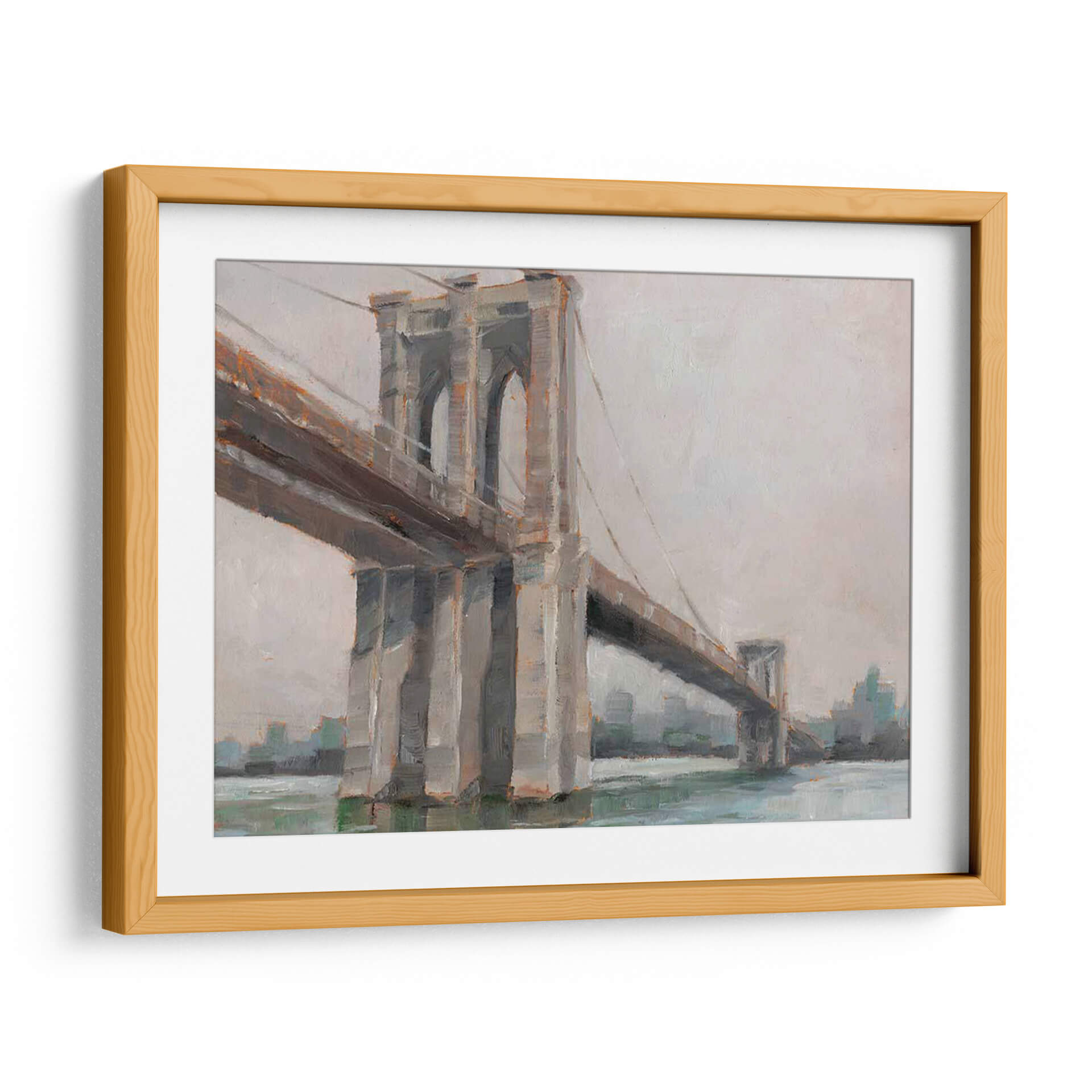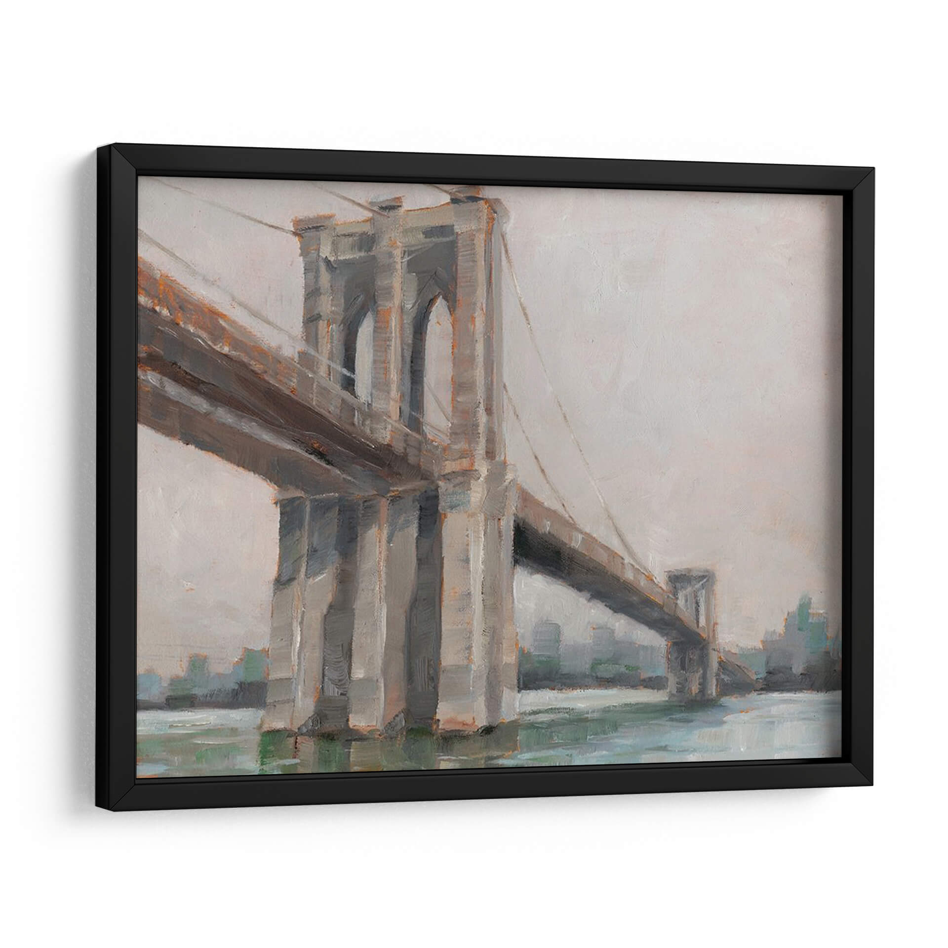 Sumérgete en la majestuosidad urbana con "Ante El East River I", una obra de arte que captura la icónica silueta del Puente de Brooklyn con una perspectiva evocadora. El artista Ethan Harper nos transporta a las orillas del East River, presentando una vista imponente de la estructura arquitectónica que se alza contra un cielo nublado y sereno. La paleta de colores, dominada por tonos grises, ocres sutiles y toques de verde agua en el río, crea una atmósfera de calma y contemplación, ideal para espacios que buscan un toque de sofisticación y serenidad. Las pinceladas visibles y la técnica impresionista añaden textura y profundidad, invitando al espectador a apreciar los detalles sutiles y la calidad artesanal de la pieza. Este cuadro decorativo es perfecto para añadir un punto focal inspirador a tu sala de estar, estudio u oficina, evocando la energía y el espíritu de la ciudad de Nueva York sin sacrificar la tranquilidad. "Ante El East River I" es más que una simple imagen; es una invitación a la reflexión y un testimonio del arte contemporáneo que embellece cualquier ambiente con su presencia única.