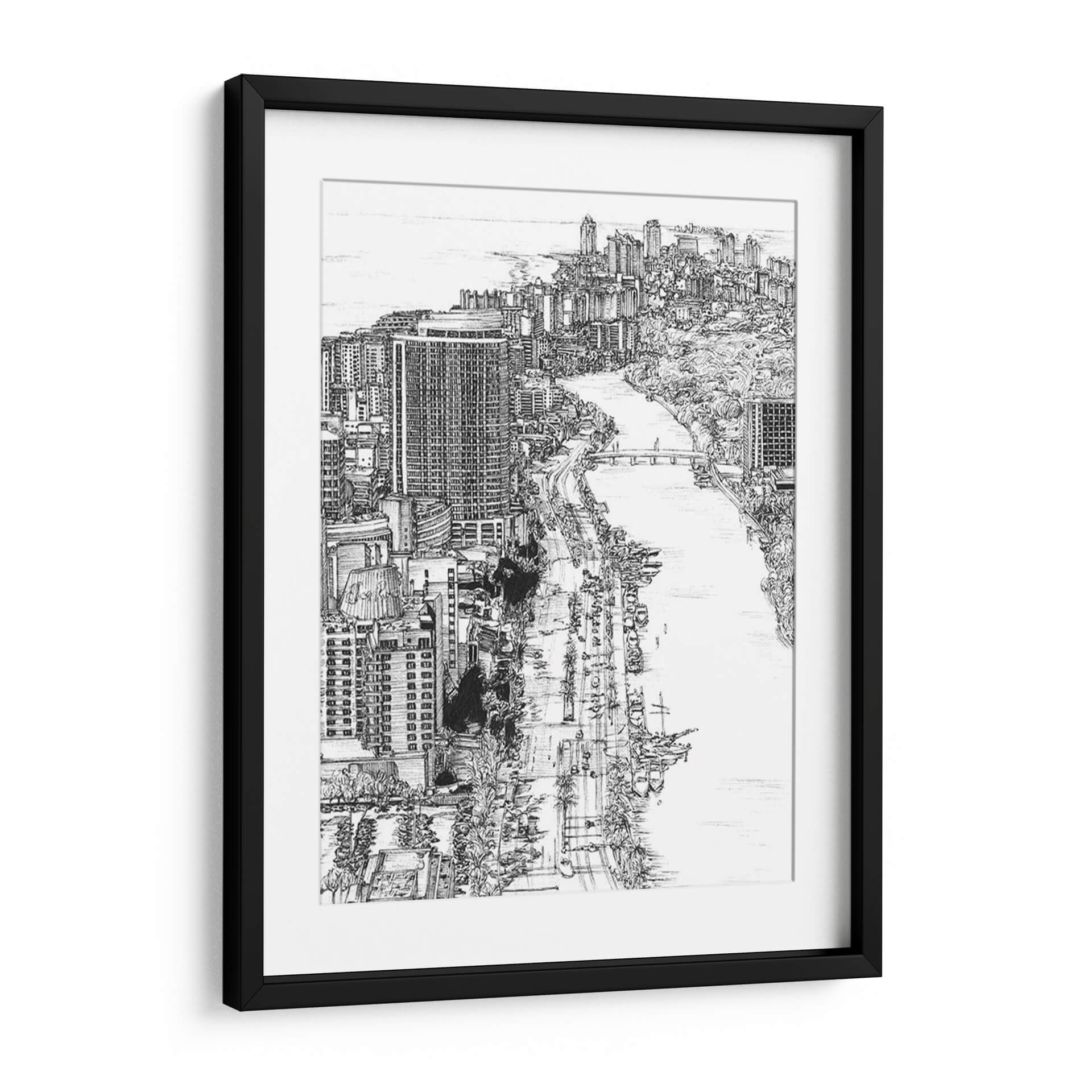 Capture la esencia vibrante de Miami con esta impresionante obra de arte urbana, titulada 'Bandw Nosotros Paisaje Urbano-Miami' y creada por la talentosa Melissa Wang. Este cuadro decorativo en blanco y negro ofrece una perspectiva detallada y evocadora de la ciudad, destacando la imponente arquitectura de rascacielos que se alza junto a un sereno río, bordeado por frondosos árboles y una bulliciosa calle. La técnica de dibujo a mano alzada, con trazos precisos y un juego de luces y sombras magistral, dota a la pieza de una profundidad y un realismo cautivadores. Es la decoración de pared perfecta para quienes buscan añadir un toque de sofisticación y carácter a su hogar u oficina. Imagina este lienzo como un punto focal en tu sala de estar, aportando una energía urbana y un aire de descubrimiento a tu espacio. Su diseño atemporal y su estilo gráfico lo convierten en una adición versátil para cualquier decoración contemporánea, moderna o incluso minimalista, invitando a la contemplación y al aprecio por la belleza de los paisajes urbanos.