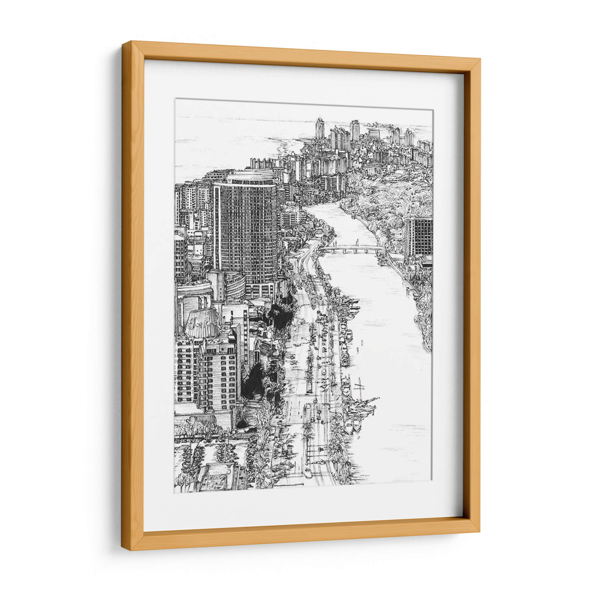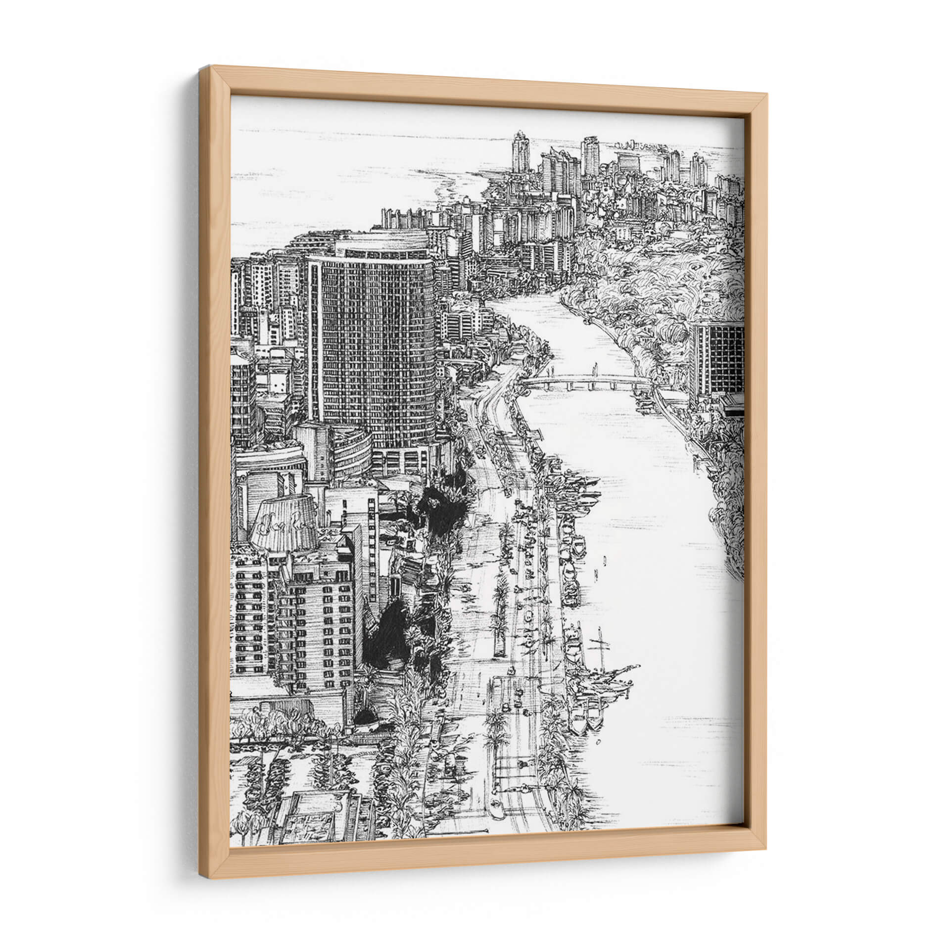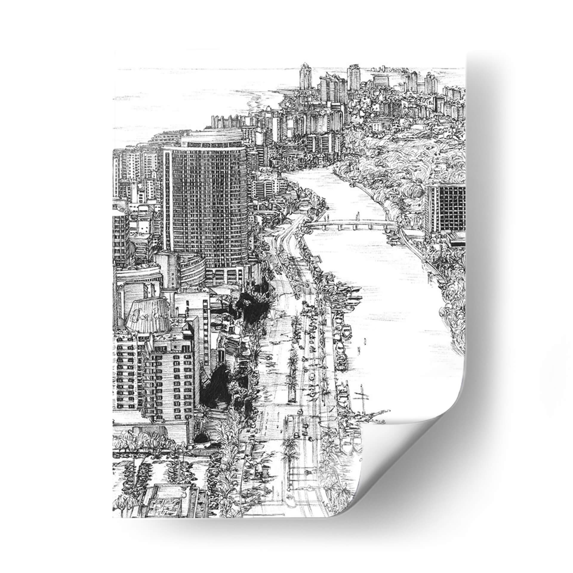 Esta pieza no es solo una imagen, es una ventana a la dinámica vida de Miami, capturada con una sensibilidad artística excepcional. La obra invita a perderse en sus detalles, desde los vehículos en la carretera hasta las embarcaciones en el agua, todo ello con una elegancia monocromática que realza su impacto visual. Melissa Wang demuestra su maestría en la representación de la complejidad urbana con una delicadeza que transforma lo cotidiano en extraordinario. Añade este cuadro decorativo a tu colección y transforma tu pared en una galería personal que celebra la arquitectura y la vida citadina.