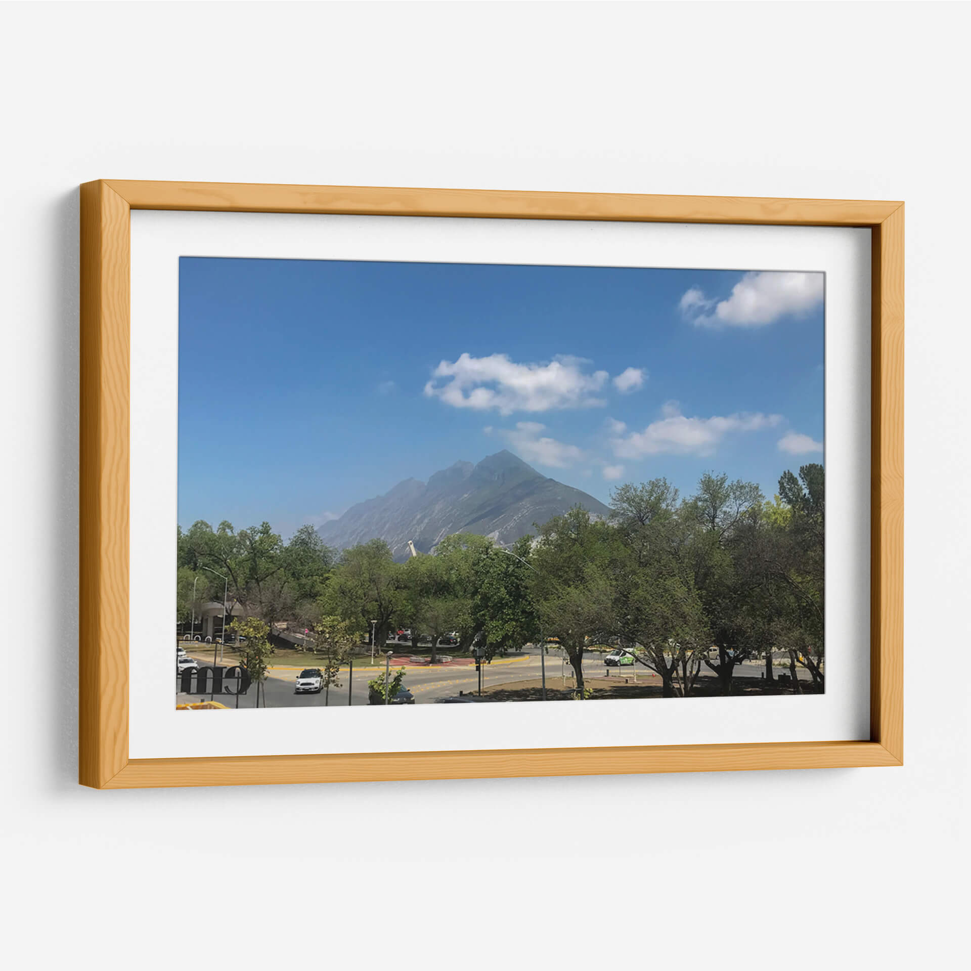 Captura la majestuosidad de la naturaleza y la vida urbana con este evocador cuadro decorativo, "Cerro de la Silla 1" de Aimee Wilde. La obra presenta una imponente montaña que se eleva majestuosamente bajo un cielo azul vibrante, salpicado de nubes algodonosas. En primer plano, una frondosa arboleda urbana crea un contraste intrigante entre lo natural y lo civilizado, con árboles de verdes intensos que enmarcan el paisaje. Se aprecian sutiles toques de vida urbana con la presencia de calles, vehículos y estructuras, integrándose armónicamente en la escena. La paleta de colores se centra en los azules profundos del cielo, los verdes variados de la vegetación y los tonos grises y ocres de la montaña, creando una atmósfera de serenidad y admiración. Este cuadro es ideal para quienes buscan infundir a sus espacios una sensación de grandeza natural y conexión con el entorno. Perfecto para salas de estar, oficinas o cualquier lugar donde se desee un punto focal que inspire calma y refleje la belleza del mundo que nos rodea. Una pieza que invita a la contemplación y añade un toque de elegancia contemporánea a tu decoración.