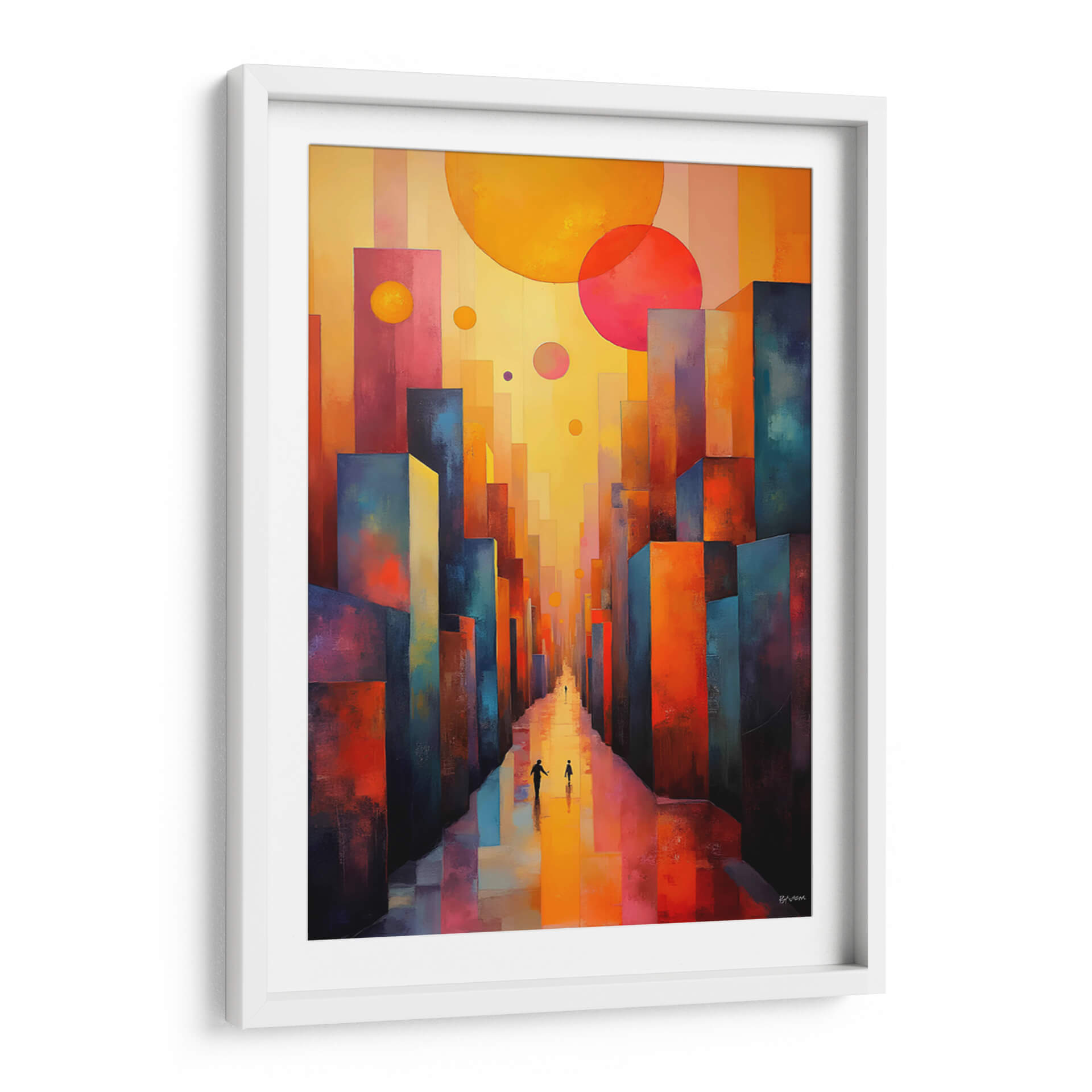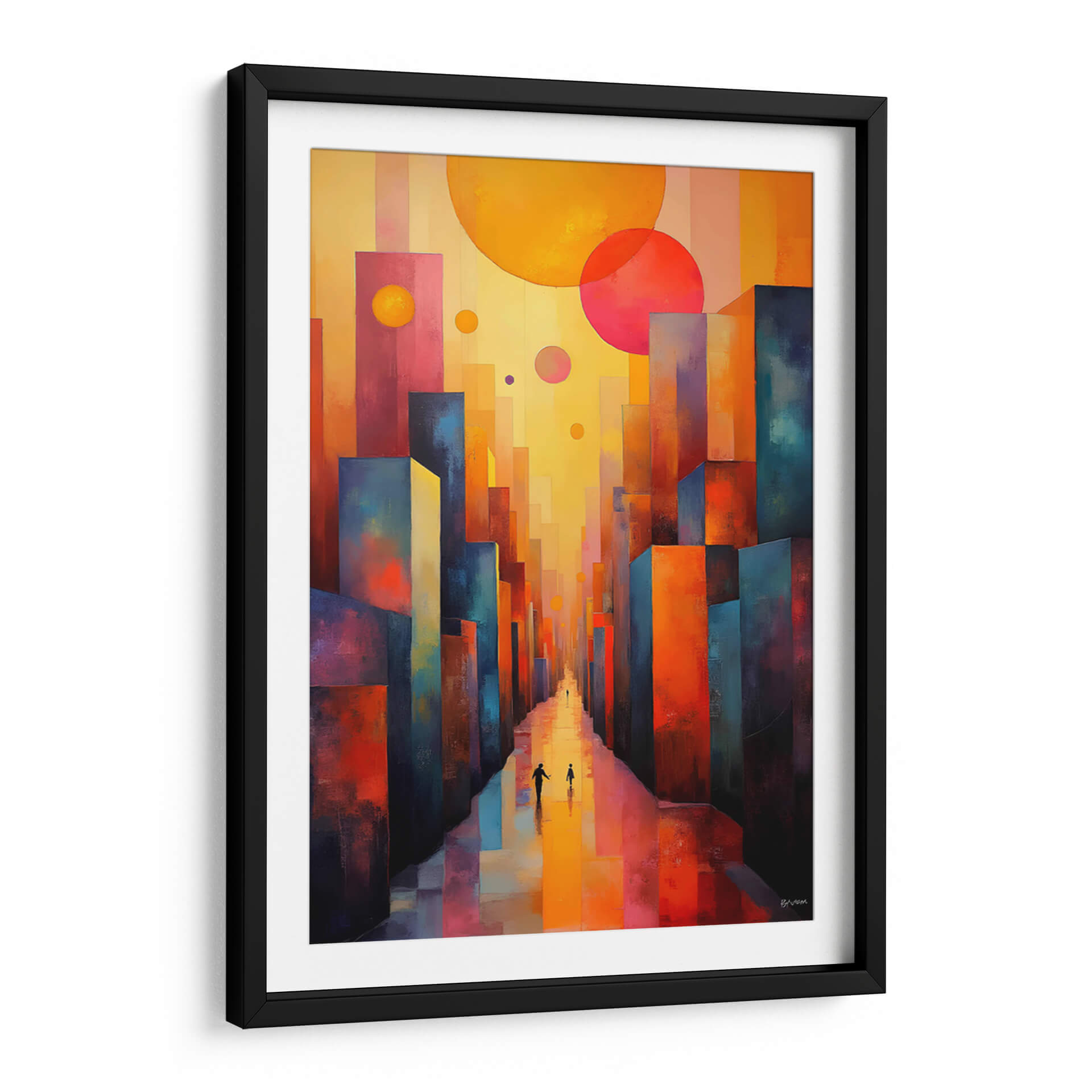 Sumérgete en la vibrante y enigmática atmósfera de "Ciudad KleeTurner", una obra de arte contemporáneo que captura la esencia de una metrópolis moderna con un toque de ensueño. Este cuadro decorativo presenta una perspectiva arquitectónica audaz, donde rascacielos estilizados emergen en una sinfonía de colores cálidos y fríos. La paleta de colores, dominada por naranjas, amarillos, rojos intensos y azules profundos, crea un contraste dinámico y visualmente cautivador. Las formas geométricas se entrelazan para evocar la energía pulsante de la ciudad, mientras que las esferas de luz difusa añaden una dimensión onírica y etérea. La presencia de dos figuras solitarias caminando por una calle reflectante sugiere una introspección o un viaje personal dentro del bullicio urbano. "Ciudad KleeTurner" es ideal para añadir un punto focal de color y carácter a salas de estar modernas, estudios creativos u oficinas. Su estilo abstracto y evocador invita a la contemplación, transformando cualquier espacio en una galería personal llena de inspiración y sofisticación. Descubre el poder del arte para redefinir tu entorno y conectar con emociones profundas.