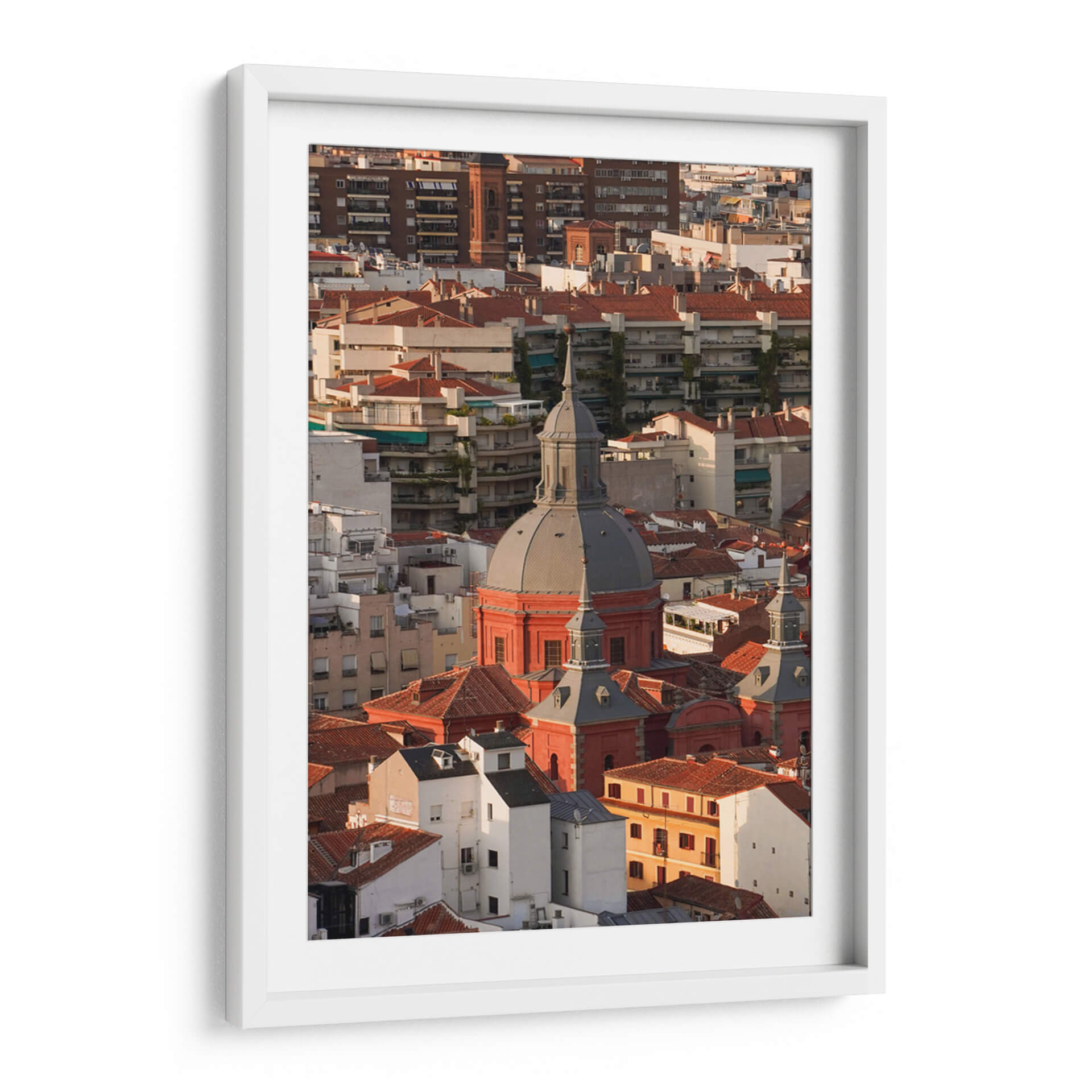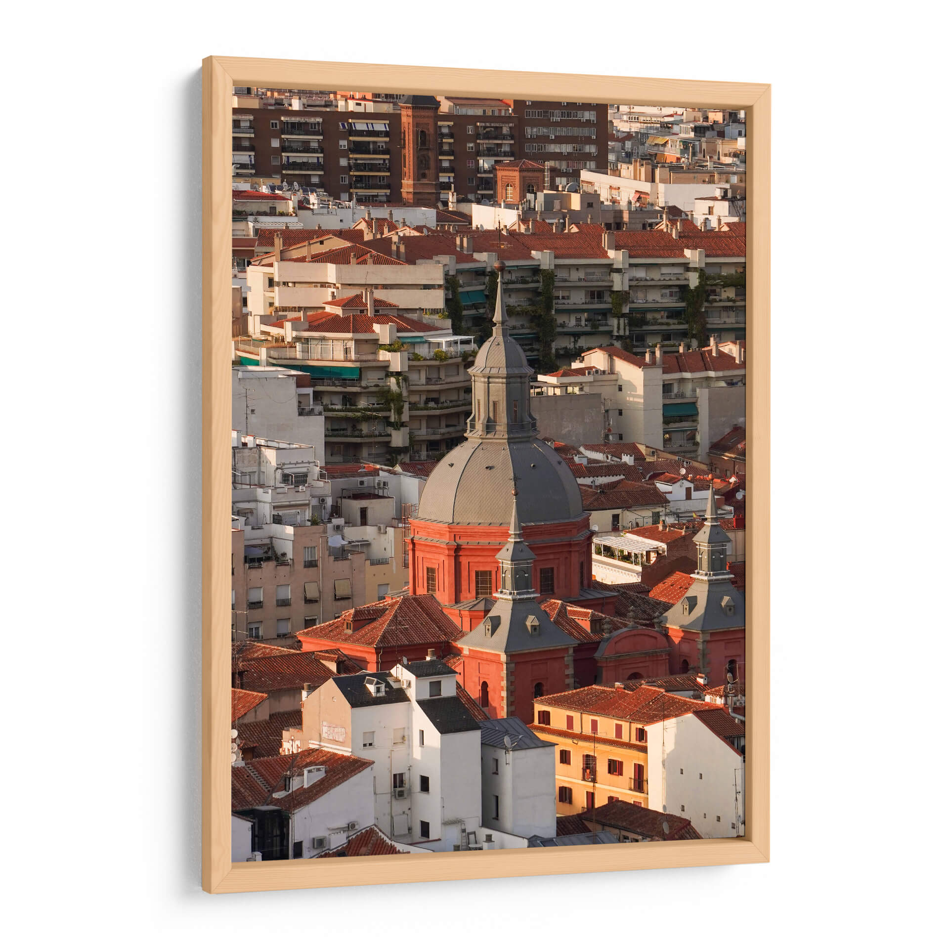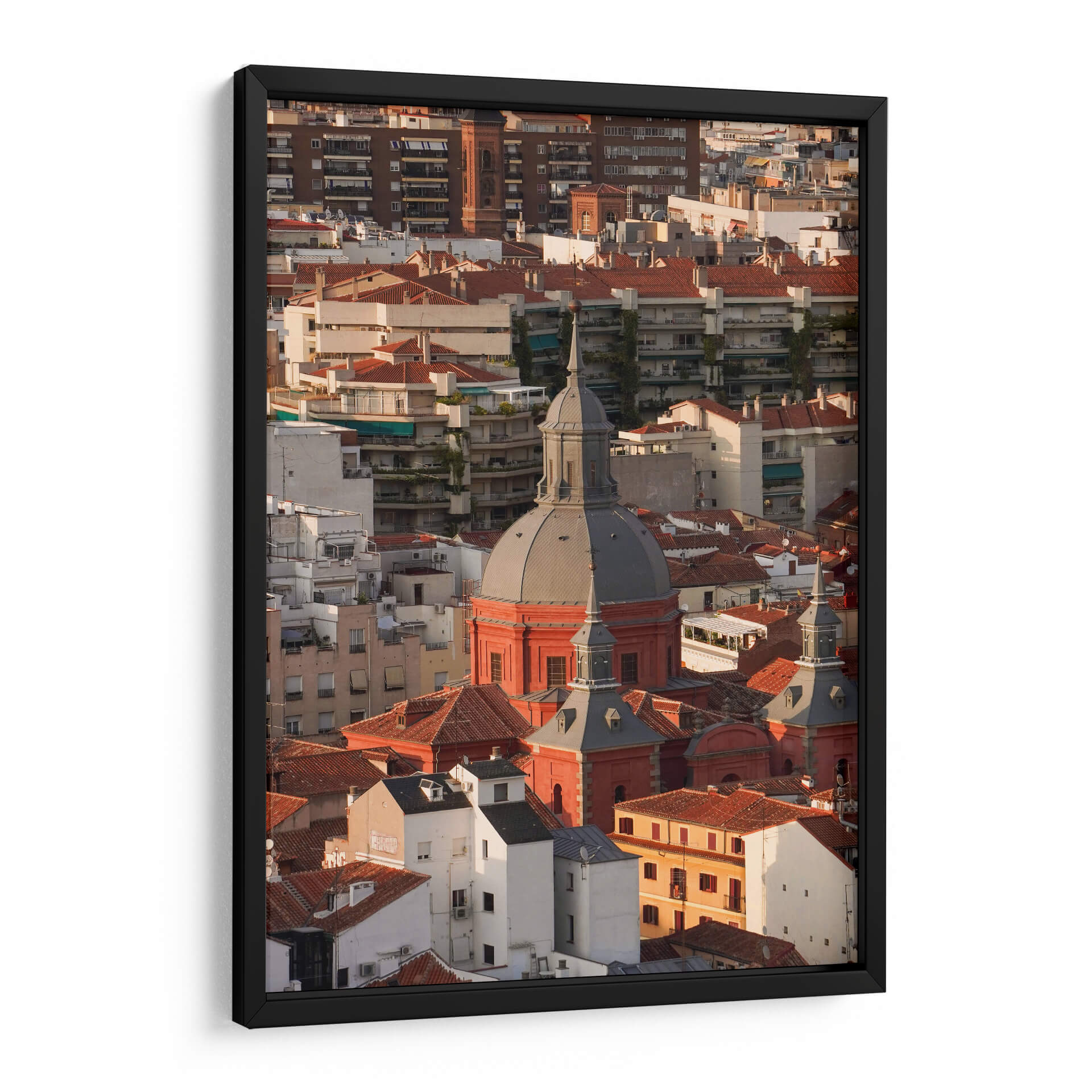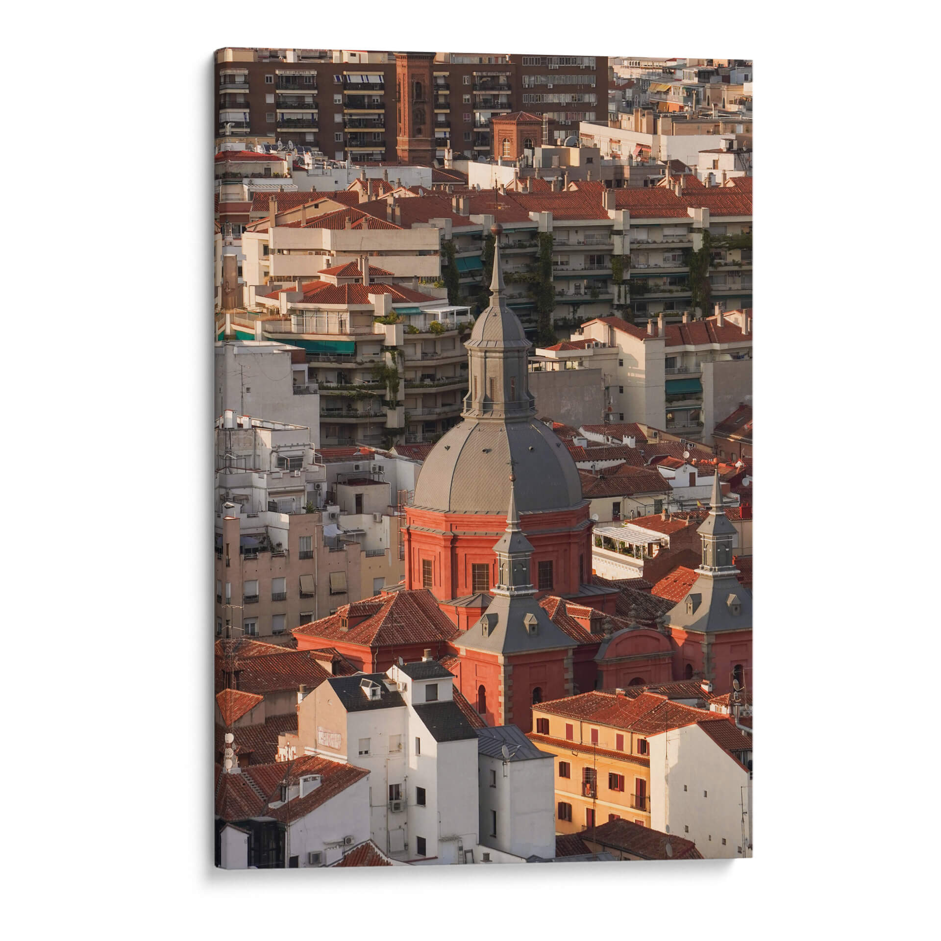 Captura la esencia de la arquitectura madrileña con este impresionante cuadro decorativo "Cúpula de Madrid" de Christian Castro. La obra ofrece una perspectiva aérea detallada de la ciudad, centrada en la majestuosa cúpula de un edificio histórico, rodeada por un mar de tejados de terracota y edificios de apartamentos con fachadas de tonos cálidos y blancos. La luz del atardecer baña la escena, creando un juego de luces y sombras que realza las texturas y volúmenes de la arquitectura, dotando a la pieza de una atmósfera serena y evocadora. Los colores predominantes, ocres, rojos teja y blancos, junto con los grises de la cúpula, crean una paleta armónica y sofisticada. Este cuadro decorativo es ideal para añadir un toque de elegancia urbana y calidez a salones, estudios o recibidores. Su composición detallada y su inspiración arquitectónica lo convierten en una pieza perfecta para amantes de las ciudades, la historia y el arte contemporáneo que buscan una decoración con carácter y personalidad.