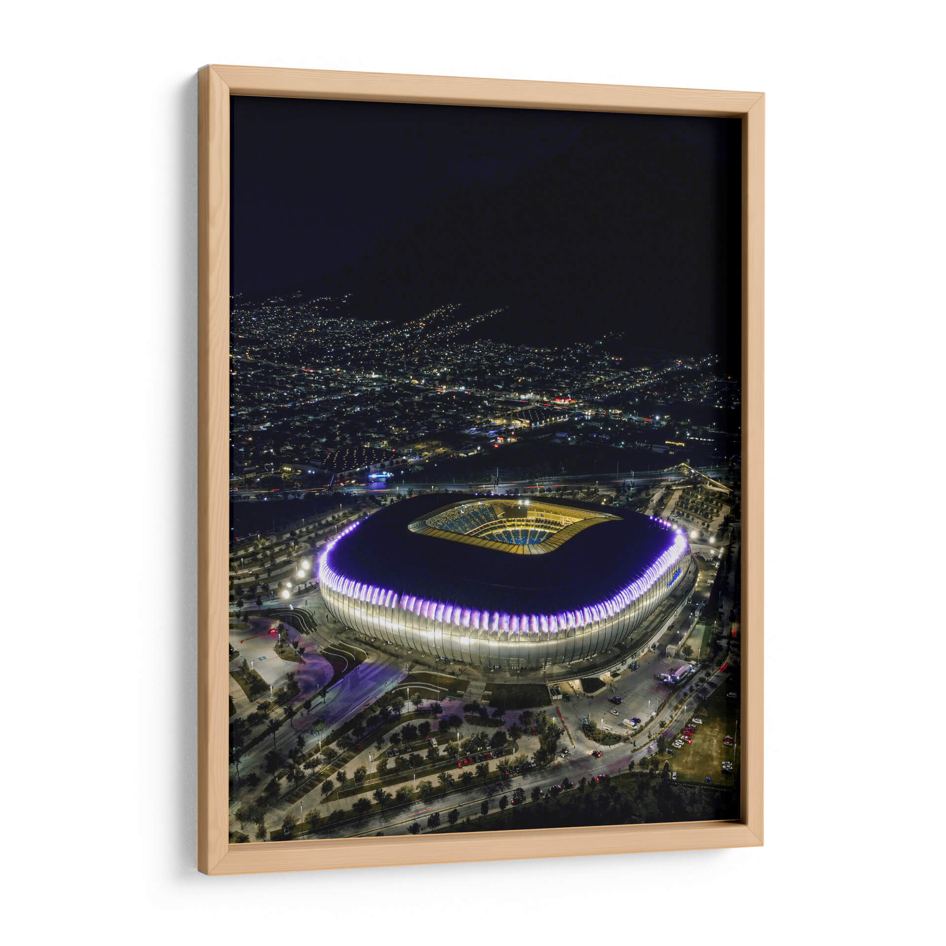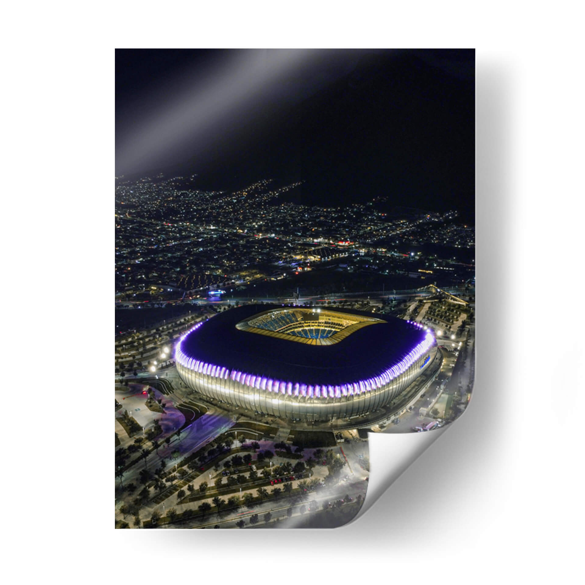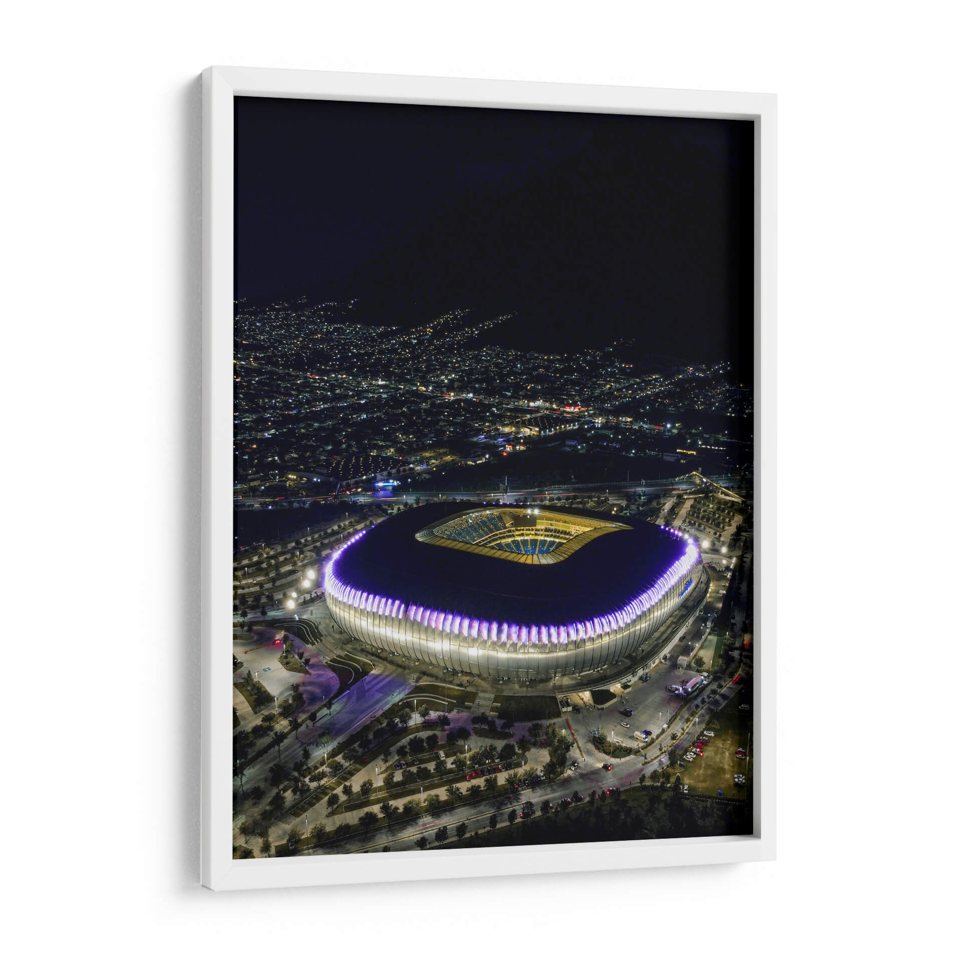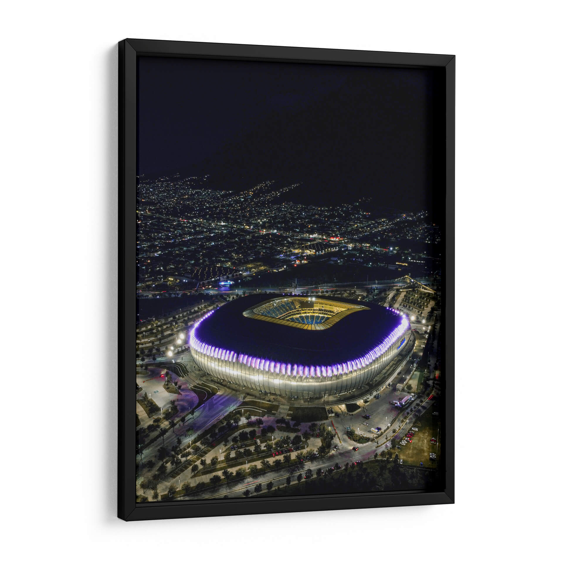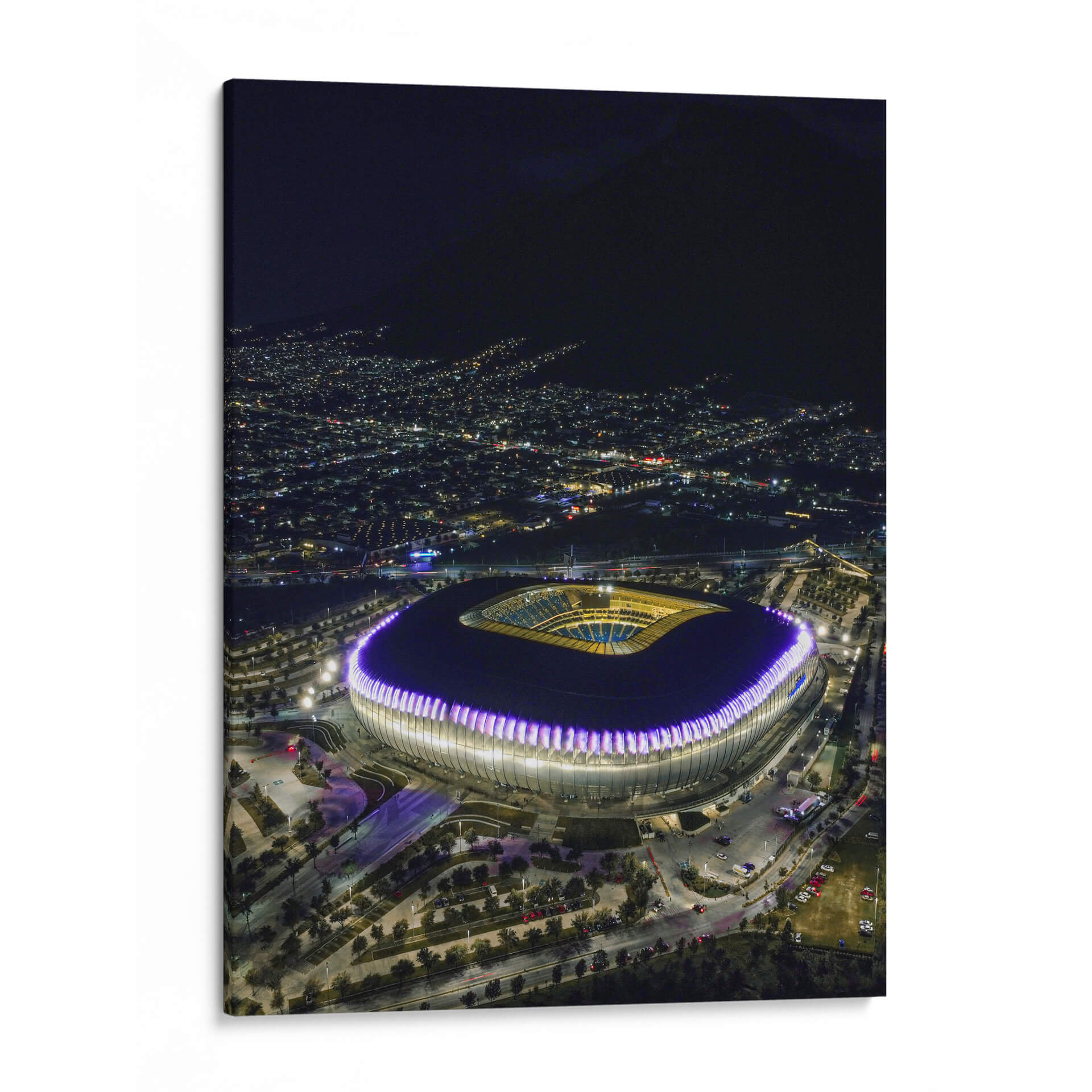 Captura la majestuosidad y la energía de la noche con este impresionante cuadro decorativo del Estadio BBVA. Desde una perspectiva aérea, la obra revela la imponente arquitectura del estadio, resaltada por la iluminación nocturna que baña su contorno en vibrantes tonos púrpuras. La ciudad que se extiende en el horizonte, salpicada de luces cálidas, contrasta con la oscuridad del cielo, creando una atmósfera de gran profundidad y realismo. Los detalles del campo y los alrededores, como las calles, los árboles y los vehículos, añaden un toque de vida a la escena, invitando al espectador a sumergirse en la vitalidad de este icónico lugar. El uso de la fotografía aérea y la iluminación nocturna le confieren un carácter moderno y dinámico, ideal para espacios que buscan un toque de sofisticación y un guiño a la pasión deportiva o a la arquitectura urbana. Este cuadro decorativo es perfecto para salas de estar, estudios u oficinas, aportando un punto focal cautivador y una conversación garantizada. La calidad de la imagen y la composición evocan la emoción y la grandeza de los grandes eventos, transformando cualquier pared en una ventana a un momento electrizante.