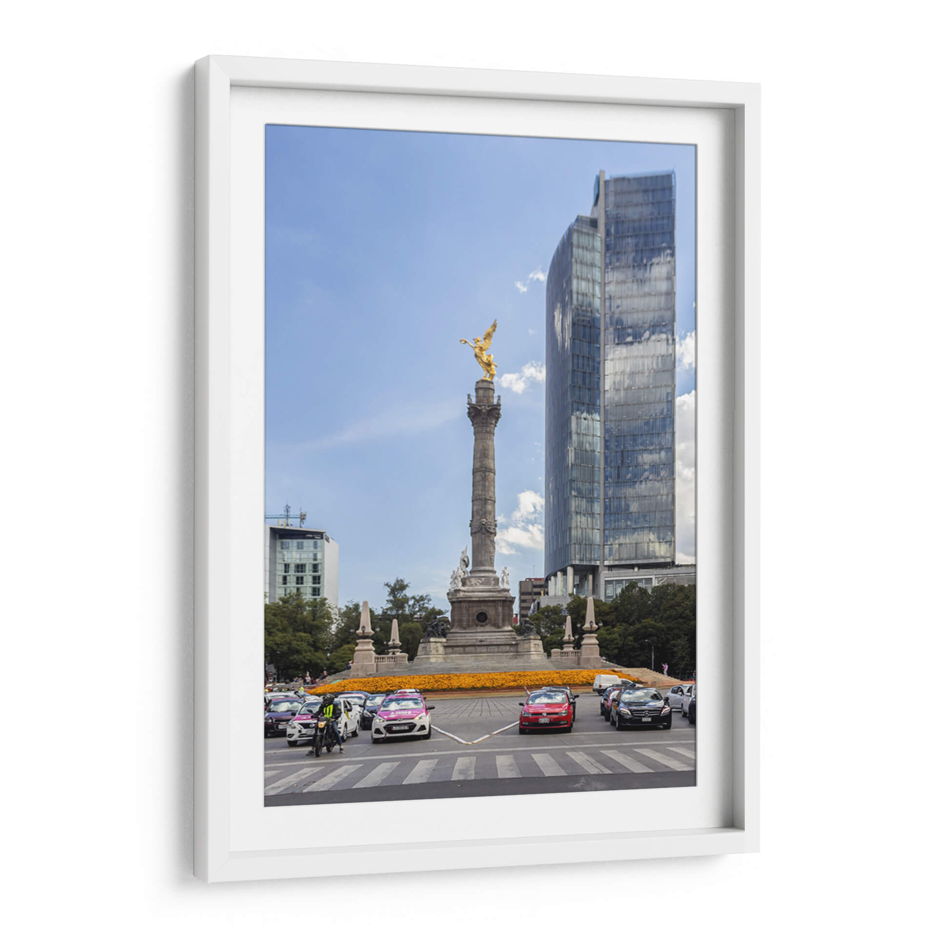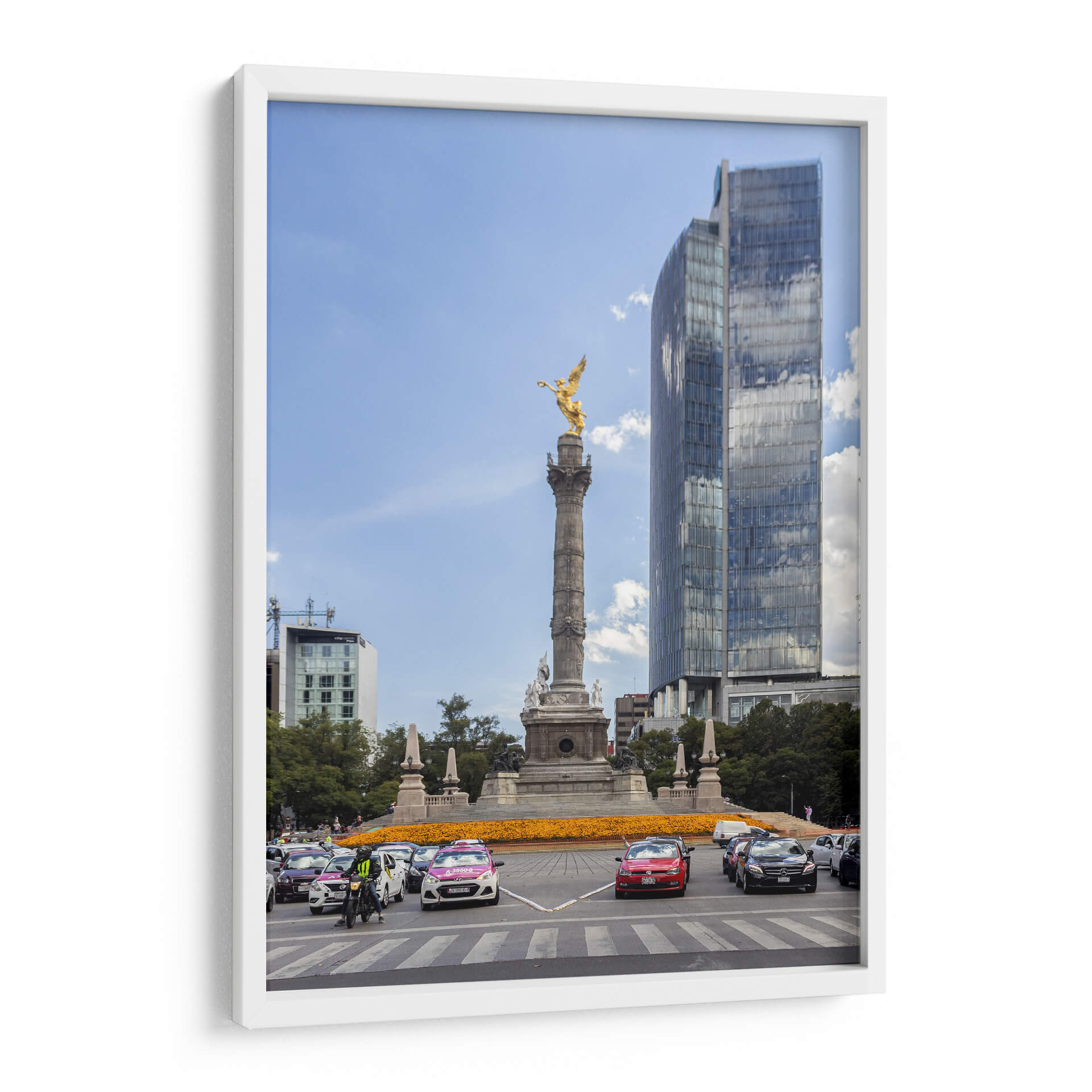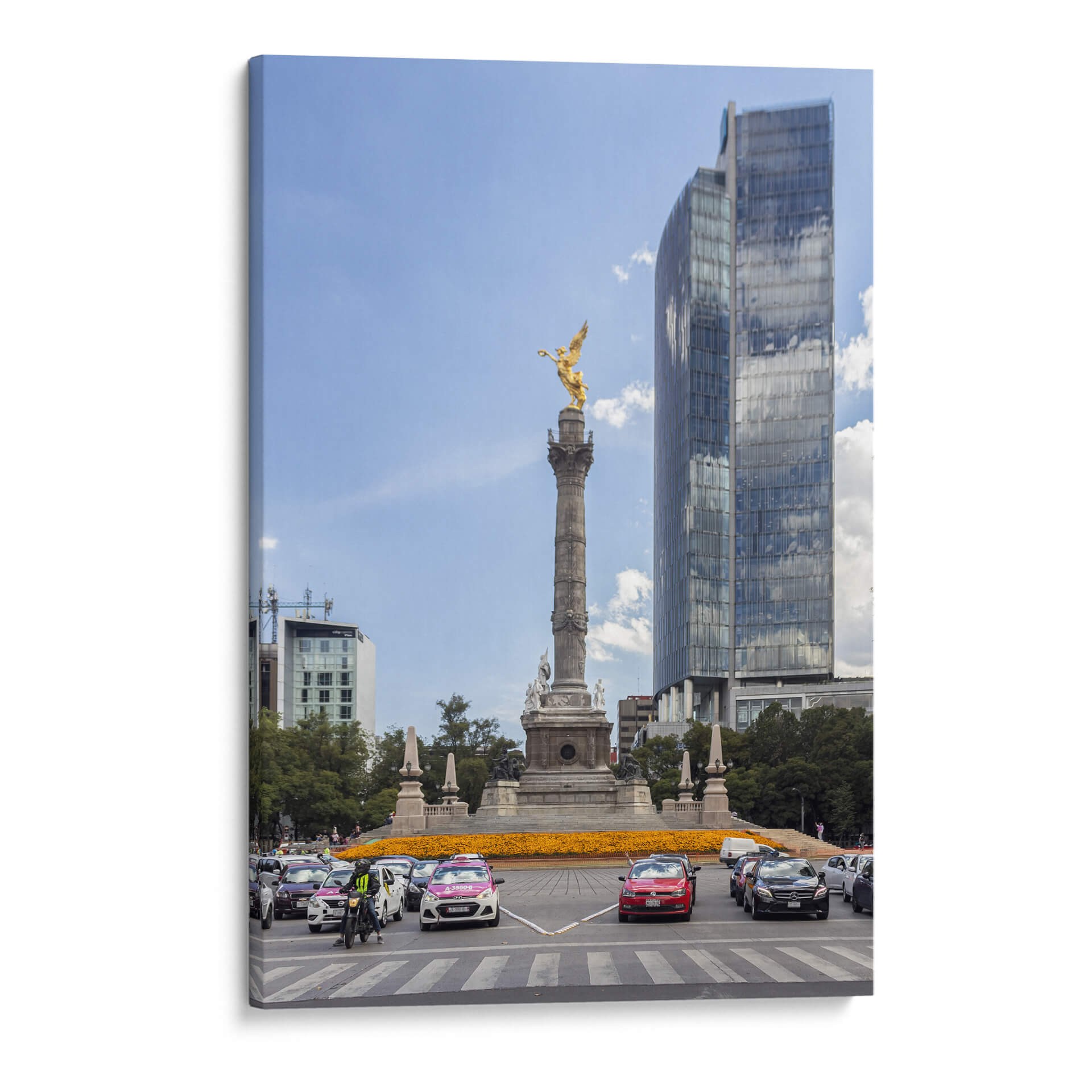 Capture la esencia vibrante de la ciudad con 'Glorieta Alada I' de Bernardo Miranda, un cuadro decorativo que evoca la majestuosidad y el dinamismo urbano. Esta obra maestra visual presenta una icónica glorieta coronada por una figura alada dorada, un símbolo de poder y libertad, que se alza contra un cielo azul despejado, salpicado de nubes algodonosas. La composición se enriquece con la presencia de edificios modernos de cristal que reflejan el entorno, creando un juego de luces y texturas fascinante. En la base, un tráfico animado de vehículos y un mar de flores anaranjadas aportan color y vida, sugiriendo la energía incesante de la metrópoli. La paleta de colores, dominada por el azul del cielo, el dorado de la escultura y los tonos cálidos de las flores y los autos, crea un equilibrio visual cautivador. Este cuadro decorativo es ideal para añadir un toque de sofisticación urbana y un punto de conversación a cualquier sala de estar, oficina o espacio que busque inspirar grandeza y movimiento. Bernardo Miranda ha logrado capturar un momento efímero de la vida urbana, transformándolo en una pieza de arte atemporal que resonará con los amantes de la arquitectura y la cultura de la ciudad.