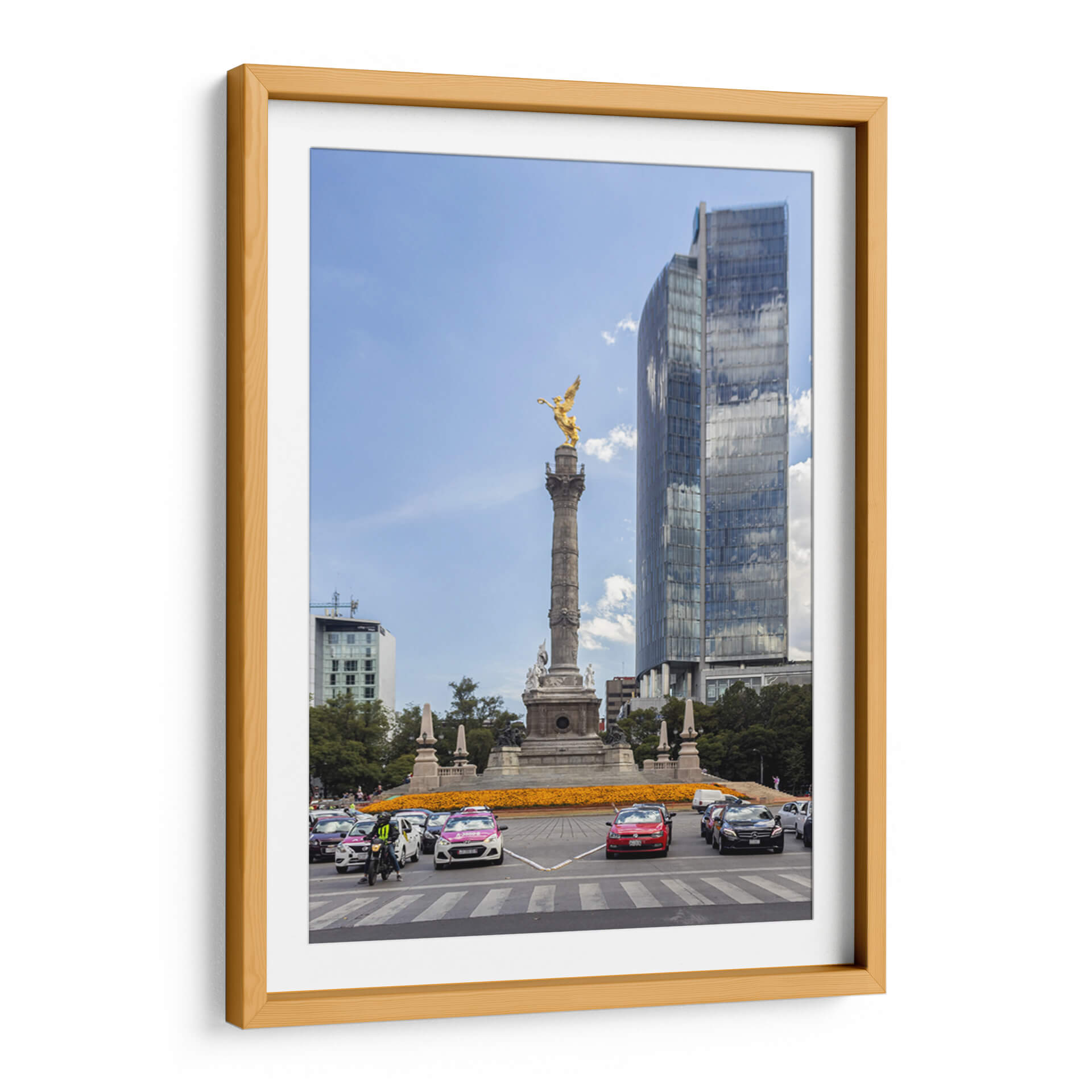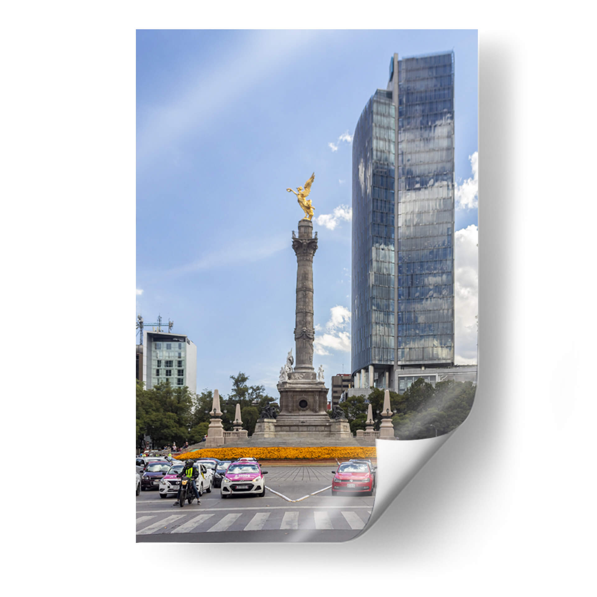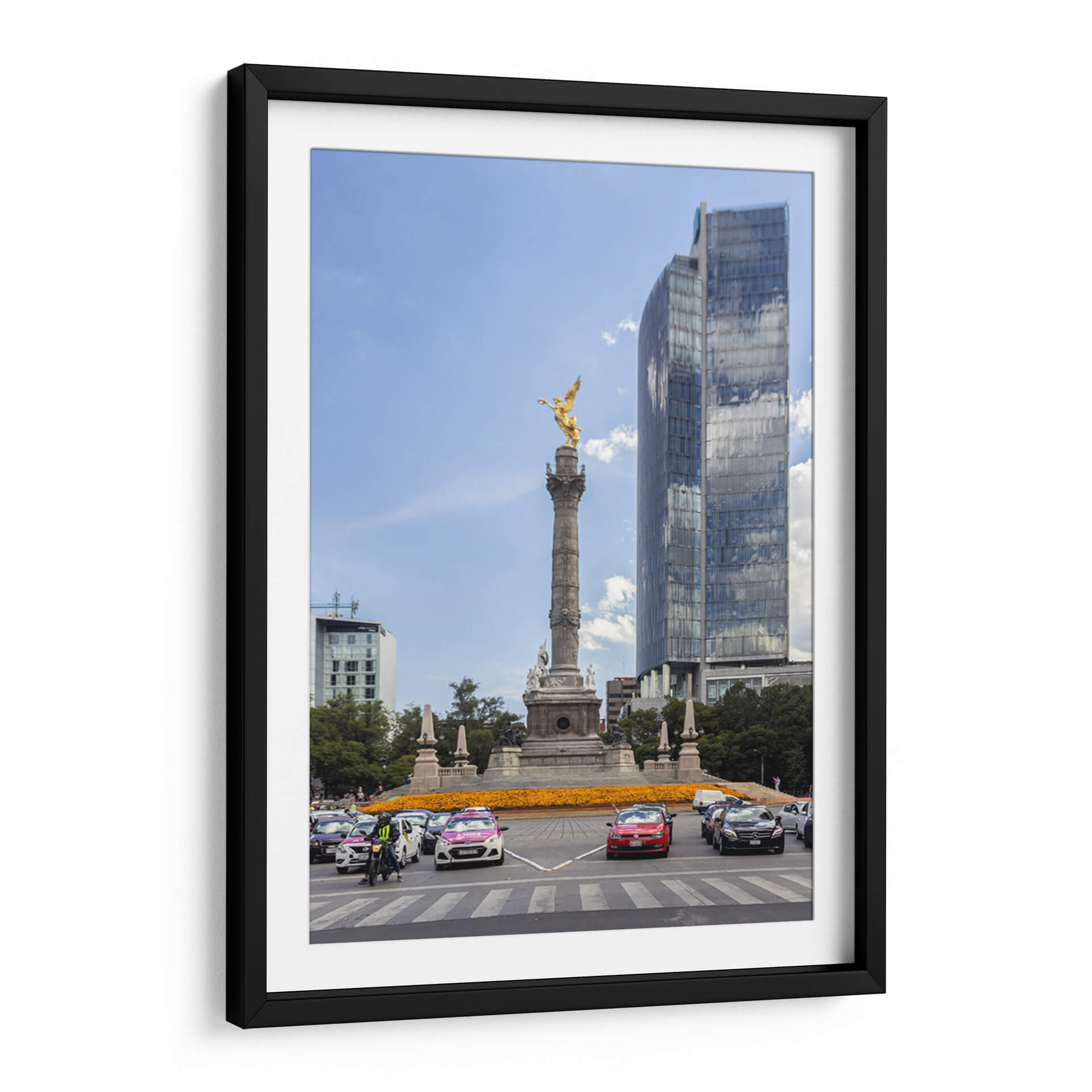 Capture la esencia vibrante de la ciudad con 'Glorieta Alada I' de Bernardo Miranda, un cuadro decorativo que evoca la majestuosidad y el dinamismo urbano. Esta obra maestra visual presenta una icónica glorieta coronada por una figura alada dorada, un símbolo de poder y libertad, que se alza contra un cielo azul despejado, salpicado de nubes algodonosas. La composición se enriquece con la presencia de edificios modernos de cristal que reflejan el entorno, creando un juego de luces y texturas fascinante. En la base, un tráfico animado de vehículos y un mar de flores anaranjadas aportan color y vida, sugiriendo la energía incesante de la metrópoli. La paleta de colores, dominada por el azul del cielo, el dorado de la escultura y los tonos cálidos de las flores y los autos, crea un equilibrio visual cautivador. Este cuadro decorativo es ideal para añadir un toque de sofisticación urbana y un punto de conversación a cualquier sala de estar, oficina o espacio que busque inspirar grandeza y movimiento. Bernardo Miranda ha logrado capturar un momento efímero de la vida urbana, transformándolo en una pieza de arte atemporal que resonará con los amantes de la arquitectura y la cultura de la ciudad.