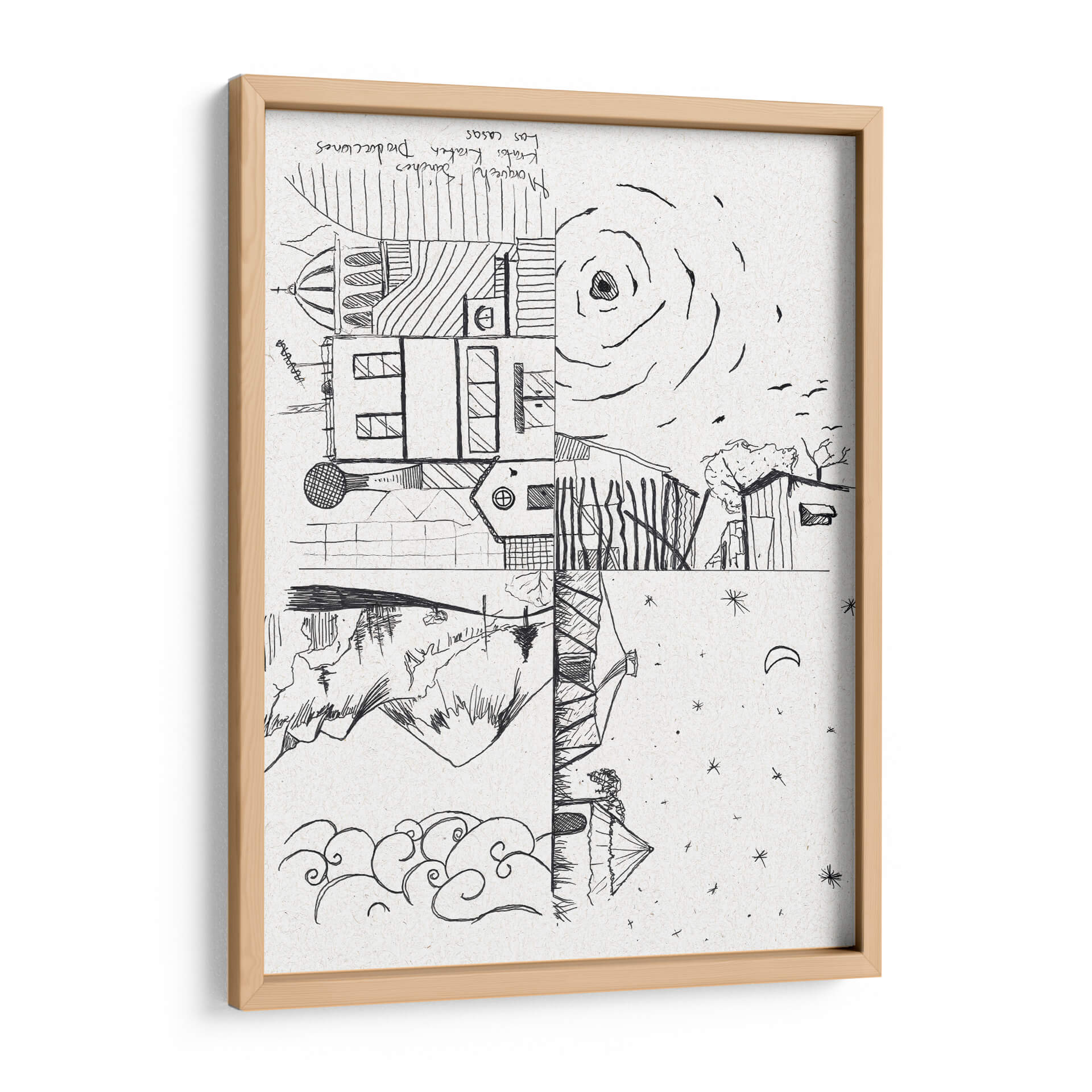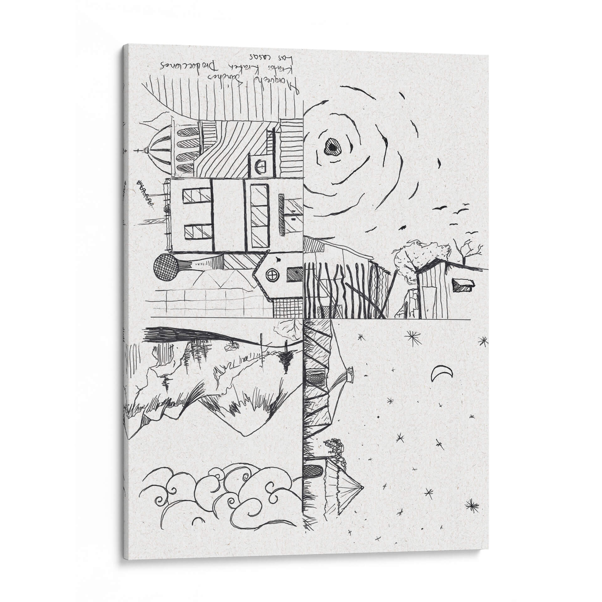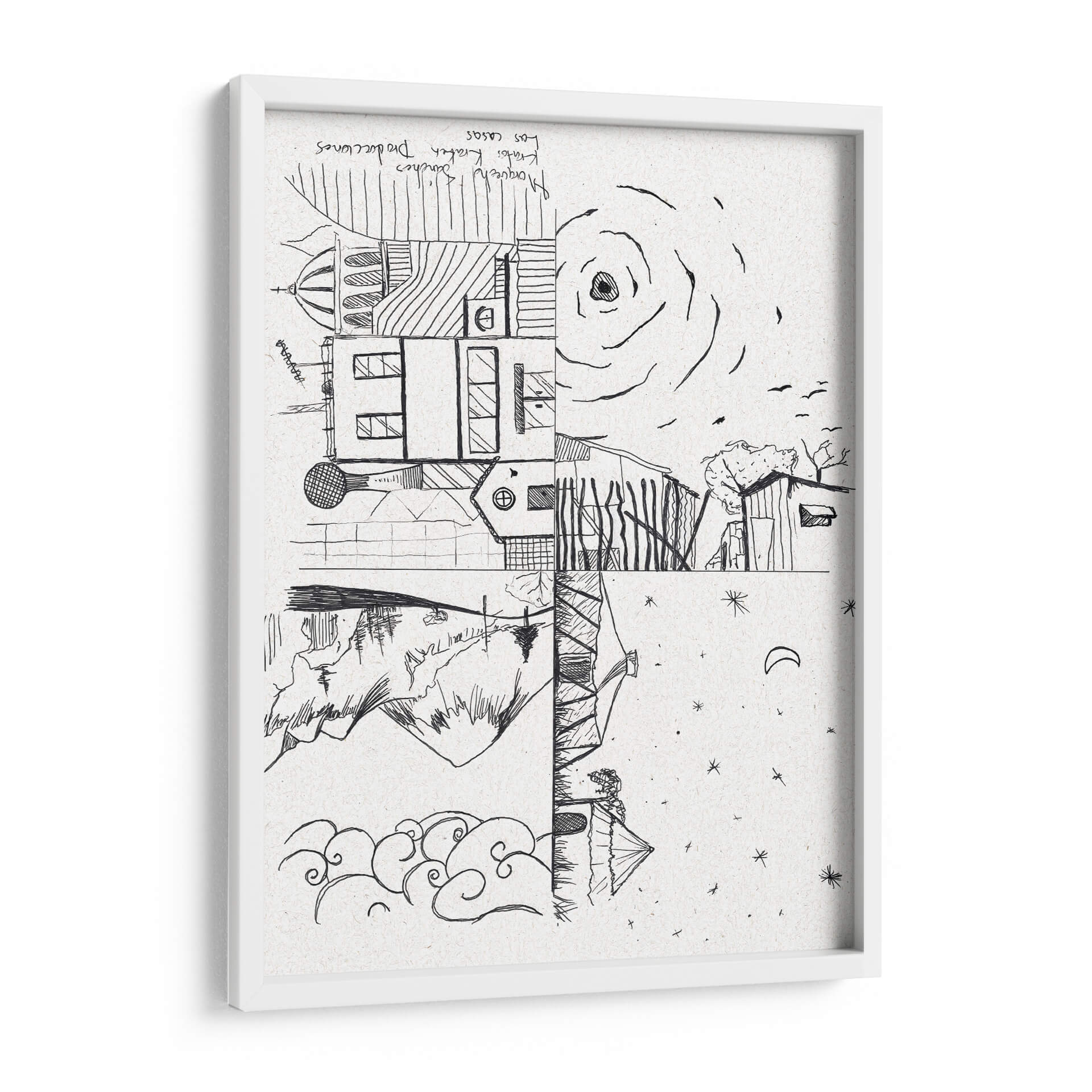 Descubre 'Las Casas', una obra de arte evocadora y conceptual del artista Morquecho Sánchez, que invita a la reflexión sobre la arquitectura y la naturaleza. Esta pieza, realizada en un estilo lineal y audaz, presenta una composición dividida que yuxtapone elementos arquitectónicos detallados con paisajes naturales y celestes. La paleta monocromática en blanco y negro, con el sutil relieve del soporte de textura de papel, realza la pureza de las líneas y la profundidad del dibujo. La parte superior muestra edificios con cúpulas y ventanas, junto a un sol estilizado y pájaros volando, sugiriendo un día brillante. La sección inferior contrasta con montañas escarpadas, un reflejo en el agua y un cielo nocturno salpicado de estrellas y una luna creciente. La obra transmite una dualidad interesante entre lo construido y lo orgánico, lo diurno y lo nocturno, generando una atmósfera de contemplación y misterio. "Las Casas" es perfecta para añadir un toque de originalidad y profundidad a tu sala de estar, estudio u oficina, estimulando la conversación y la imaginación. Su diseño versátil se adapta a interiores modernos y minimalistas, así como a espacios más eclécticos que buscan una pieza con carácter. Añade esta singular representación de la vida y el entorno a tu colección de arte.