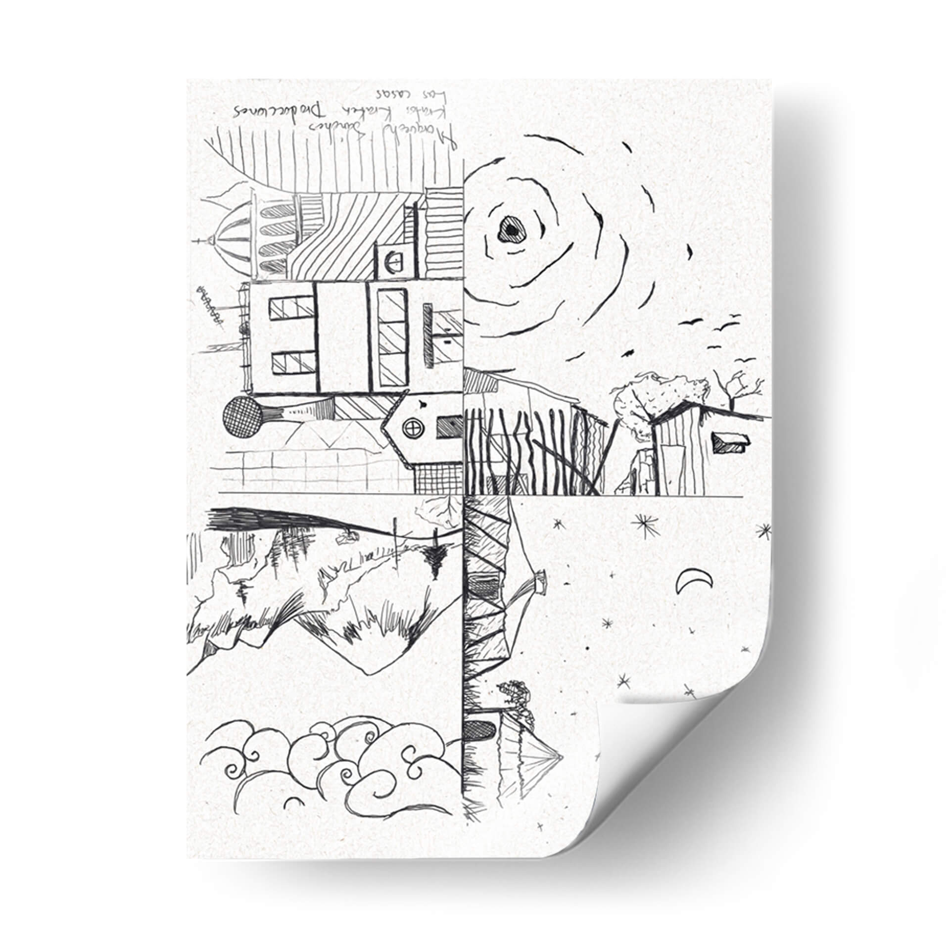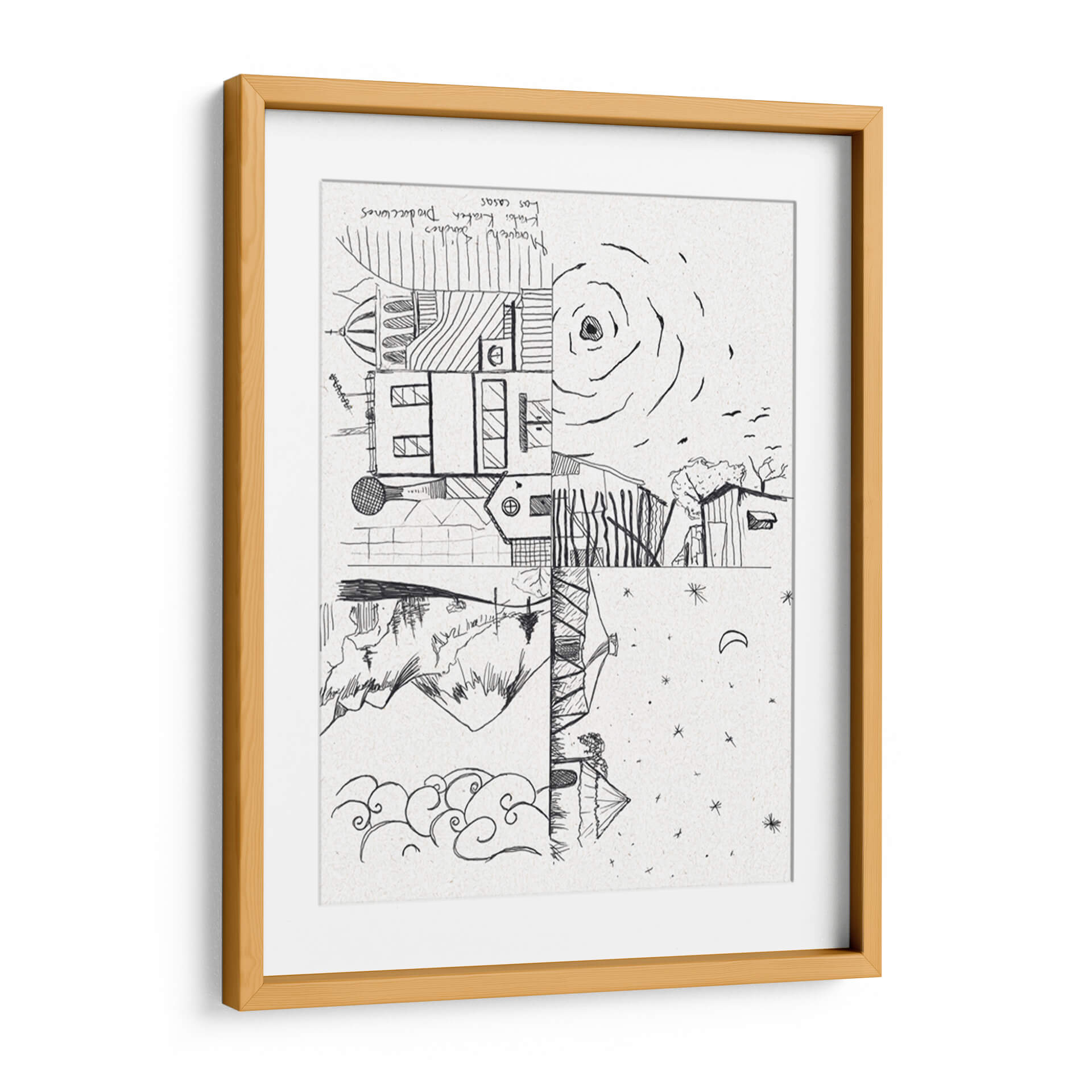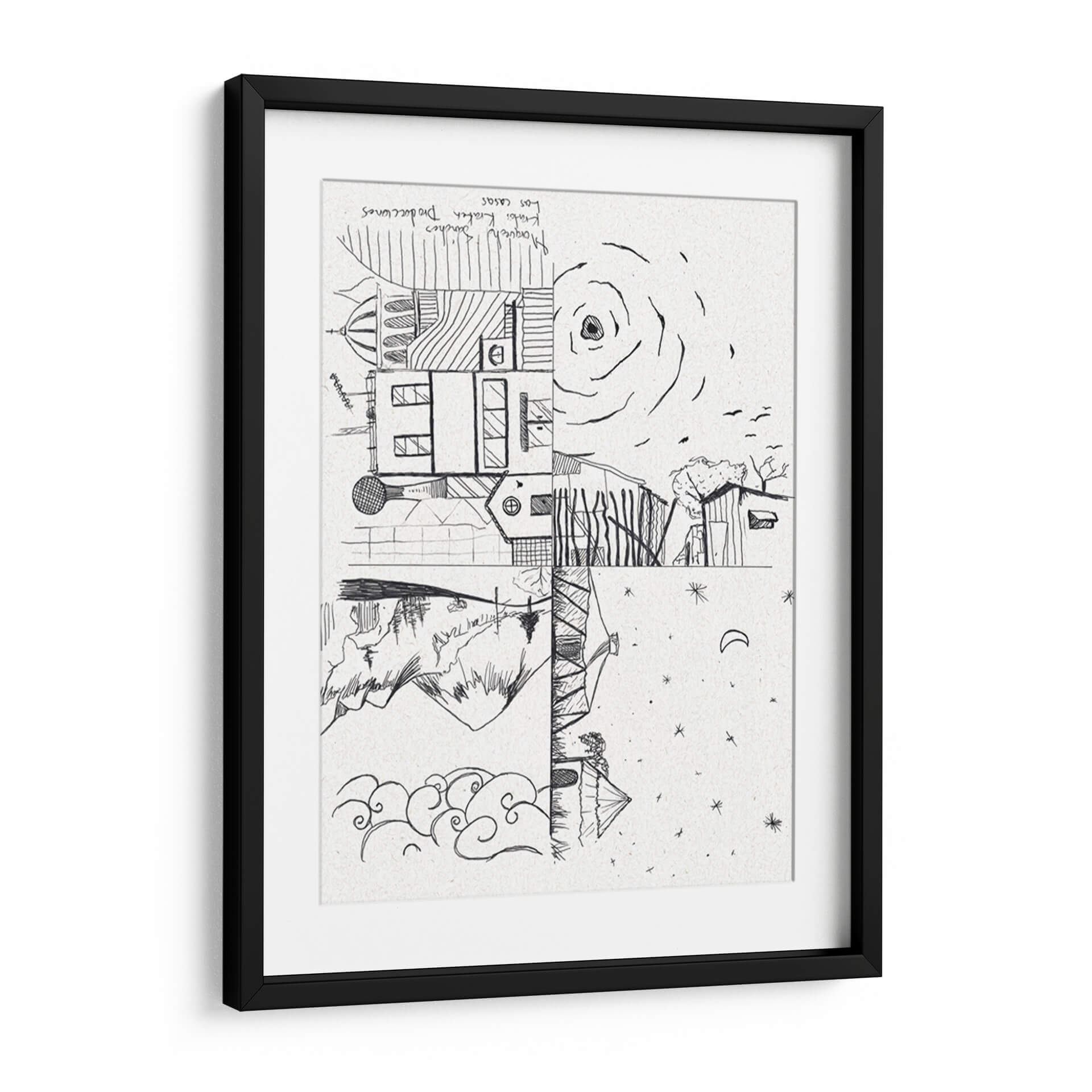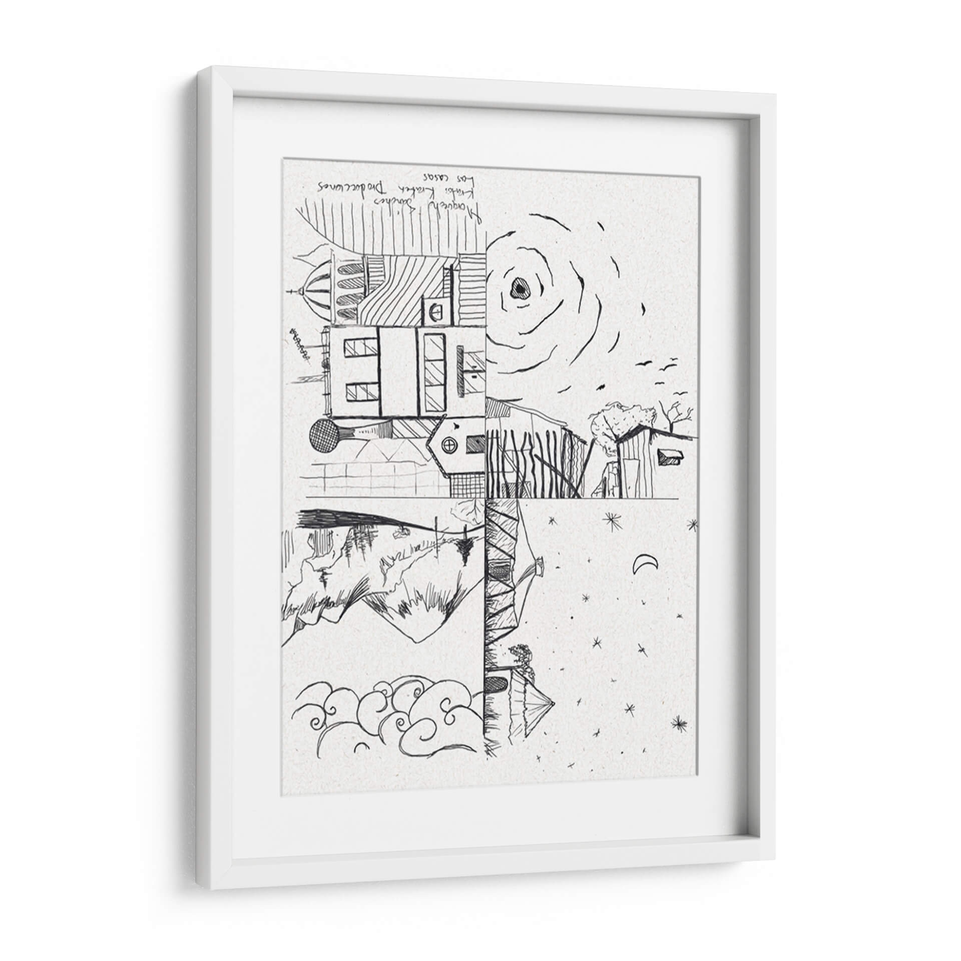 Descubre 'Las Casas', una obra de arte evocadora y conceptual del artista Morquecho Sánchez, que invita a la reflexión sobre la arquitectura y la naturaleza. Esta pieza, realizada en un estilo lineal y audaz, presenta una composición dividida que yuxtapone elementos arquitectónicos detallados con paisajes naturales y celestes. La paleta monocromática en blanco y negro, con el sutil relieve del soporte de textura de papel, realza la pureza de las líneas y la profundidad del dibujo. La parte superior muestra edificios con cúpulas y ventanas, junto a un sol estilizado y pájaros volando, sugiriendo un día brillante. La sección inferior contrasta con montañas escarpadas, un reflejo en el agua y un cielo nocturno salpicado de estrellas y una luna creciente. La obra transmite una dualidad interesante entre lo construido y lo orgánico, lo diurno y lo nocturno, generando una atmósfera de contemplación y misterio. "Las Casas" es perfecta para añadir un toque de originalidad y profundidad a tu sala de estar, estudio u oficina, estimulando la conversación y la imaginación. Su diseño versátil se adapta a interiores modernos y minimalistas, así como a espacios más eclécticos que buscan una pieza con carácter. Añade esta singular representación de la vida y el entorno a tu colección de arte.