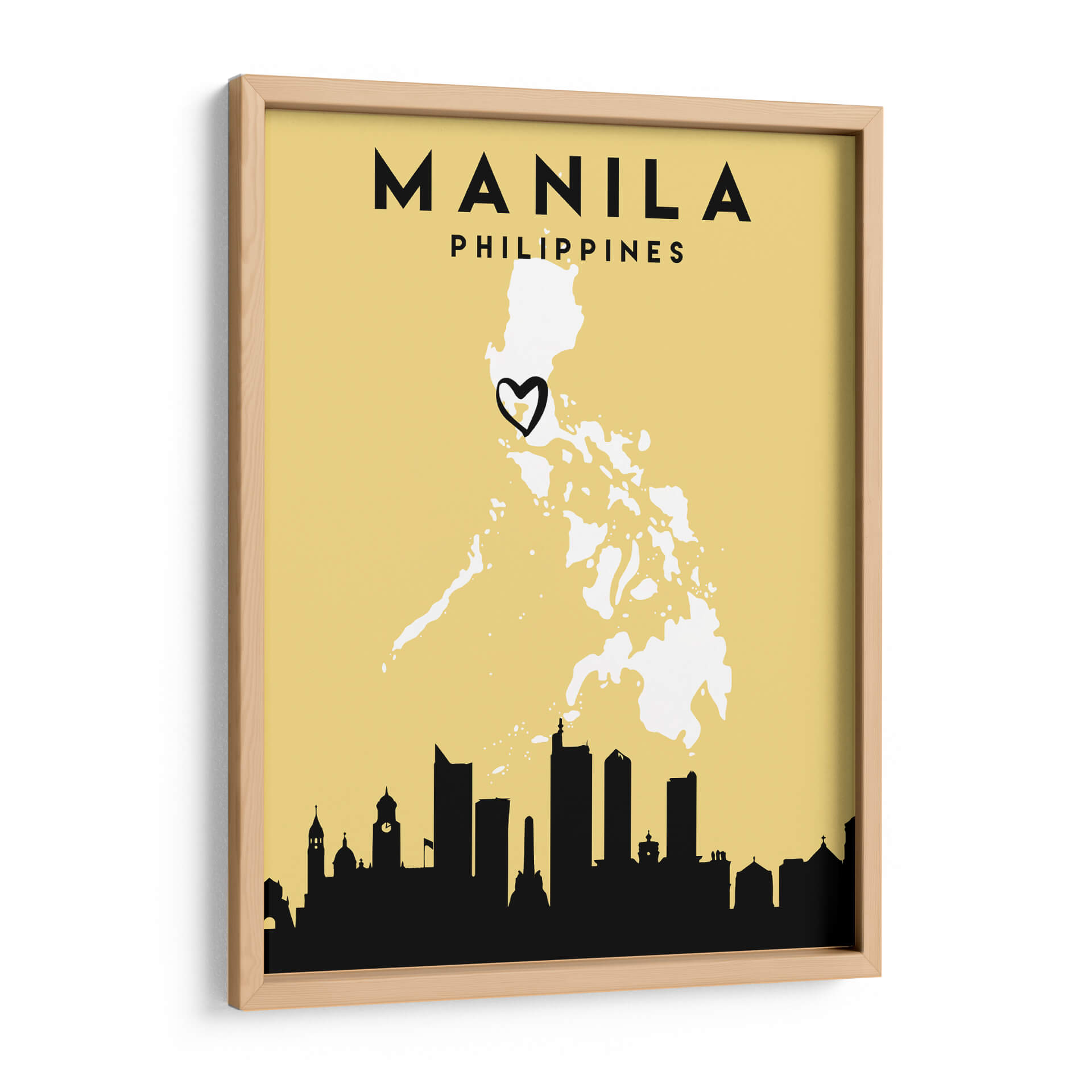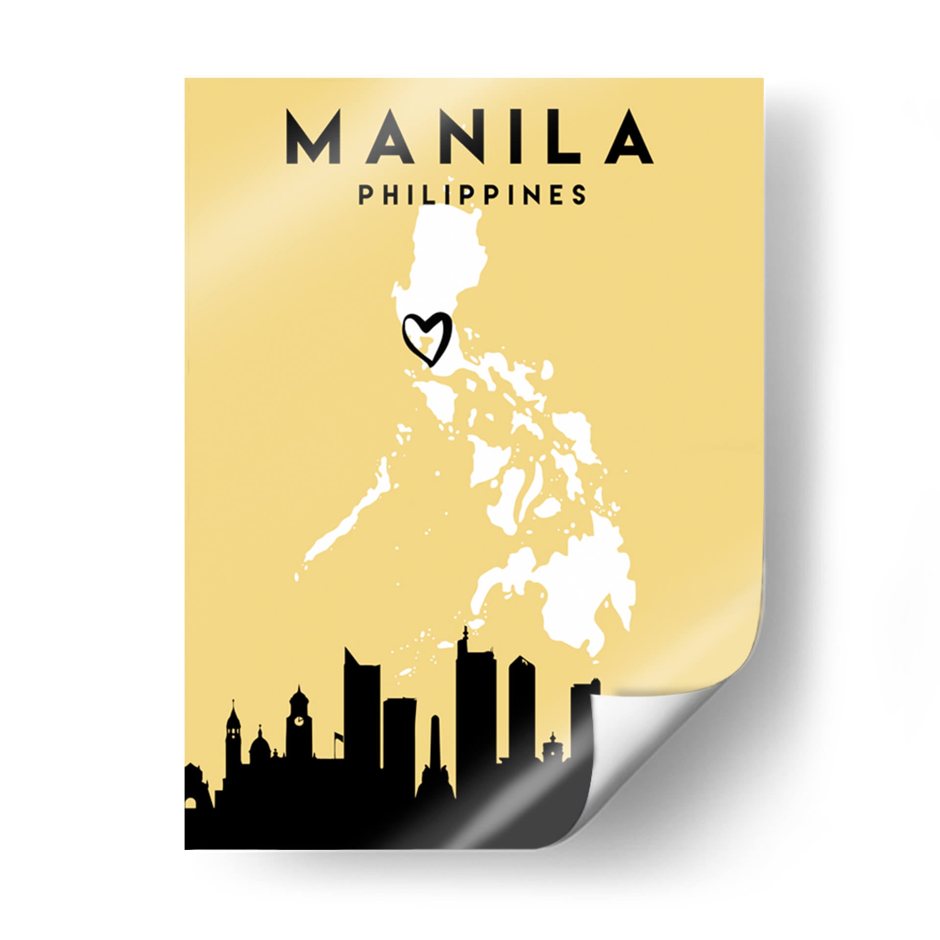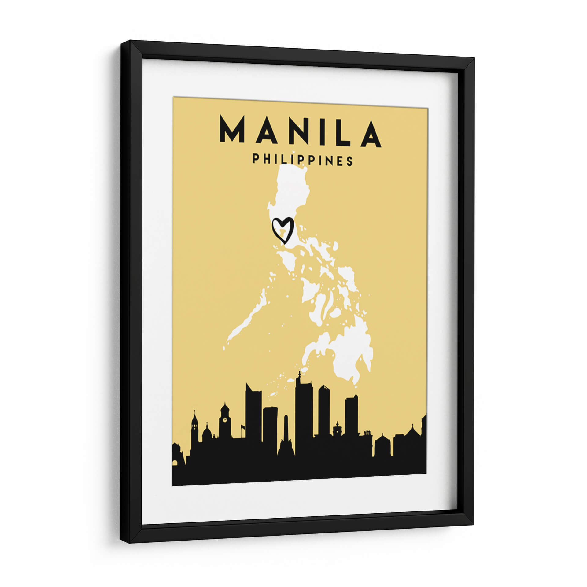 Celebra tu conexión con Manila con este cautivador cuadro decorativo, una oda visual a la vibrante capital de Filipinas. La obra presenta el contorno estilizado del archipiélago filipino en blanco nítido sobre un fondo amarillo dorado, evocando calidez y optimismo. Un corazón negro dibujado a mano marca la ubicación de Manila, añadiendo un toque personal y emotivo que resuena con el concepto de 'Mapas de amor de la ciudad'. La silueta urbana de Manila, representada en negro profundo, se extiende a lo largo de la base, capturando la esencia de su horizonte icónico con una mezcla de edificios modernos y estructuras clásicas, sugiriendo la rica historia y el dinámico presente de la ciudad. Este diseño gráfico minimalista, con su fuerte contraste y paleta de colores limitada, es ideal para añadir un toque de sofisticación moderna y un punto de interés cultural a cualquier espacio. Perfecto para aquellos que aman viajar, tienen un vínculo especial con Manila o buscan una pieza de arte que cuente una historia de pertenencia y aprecio por los lugares.