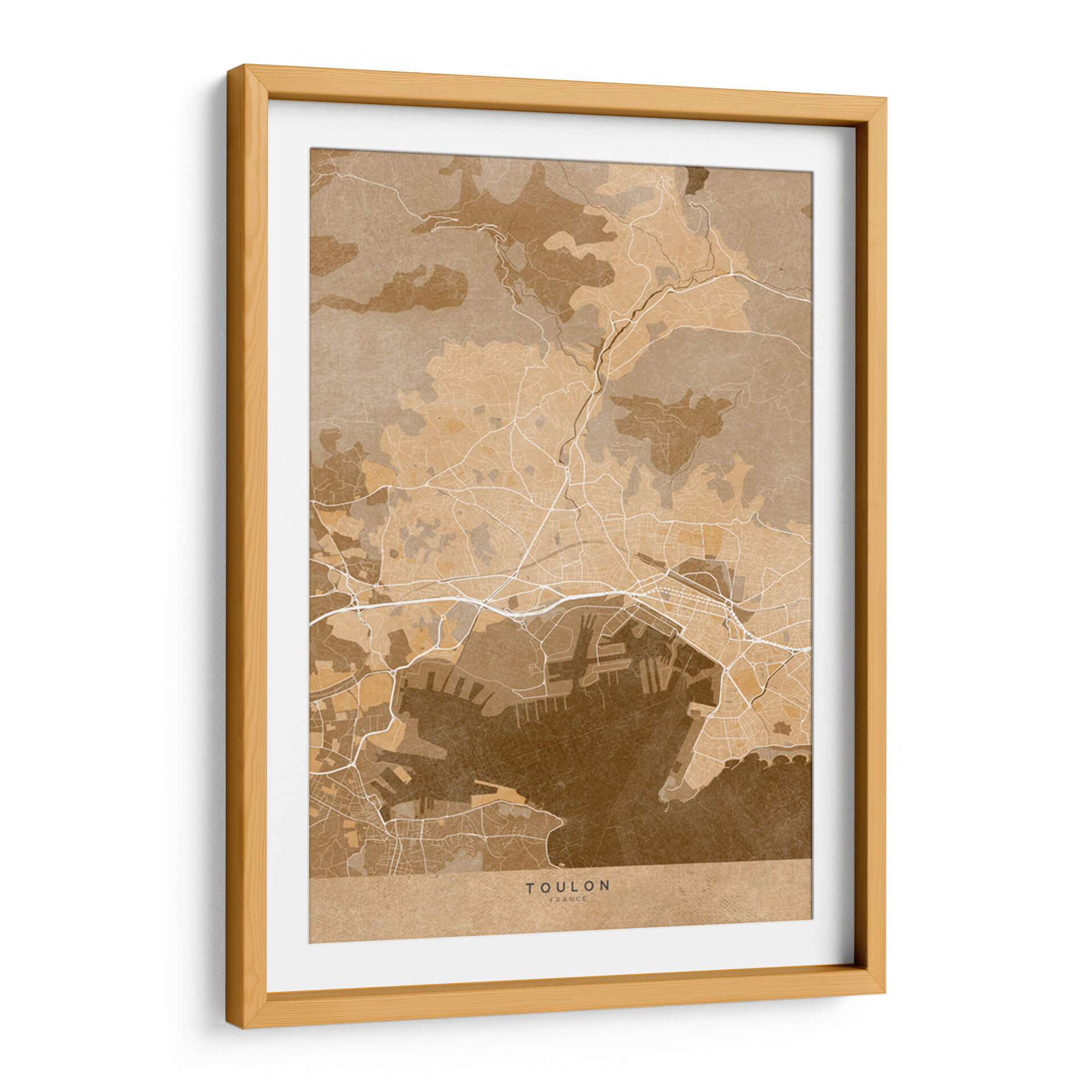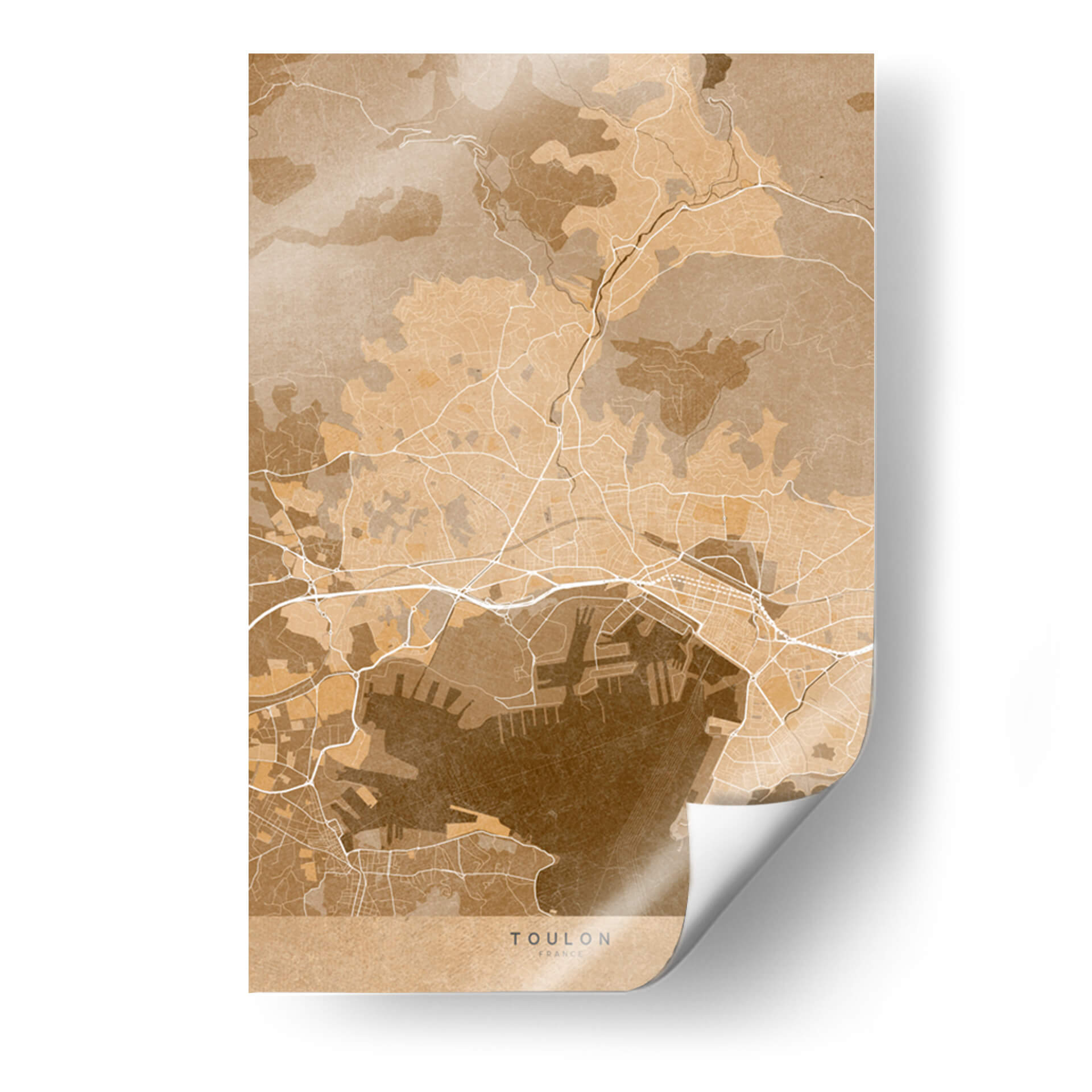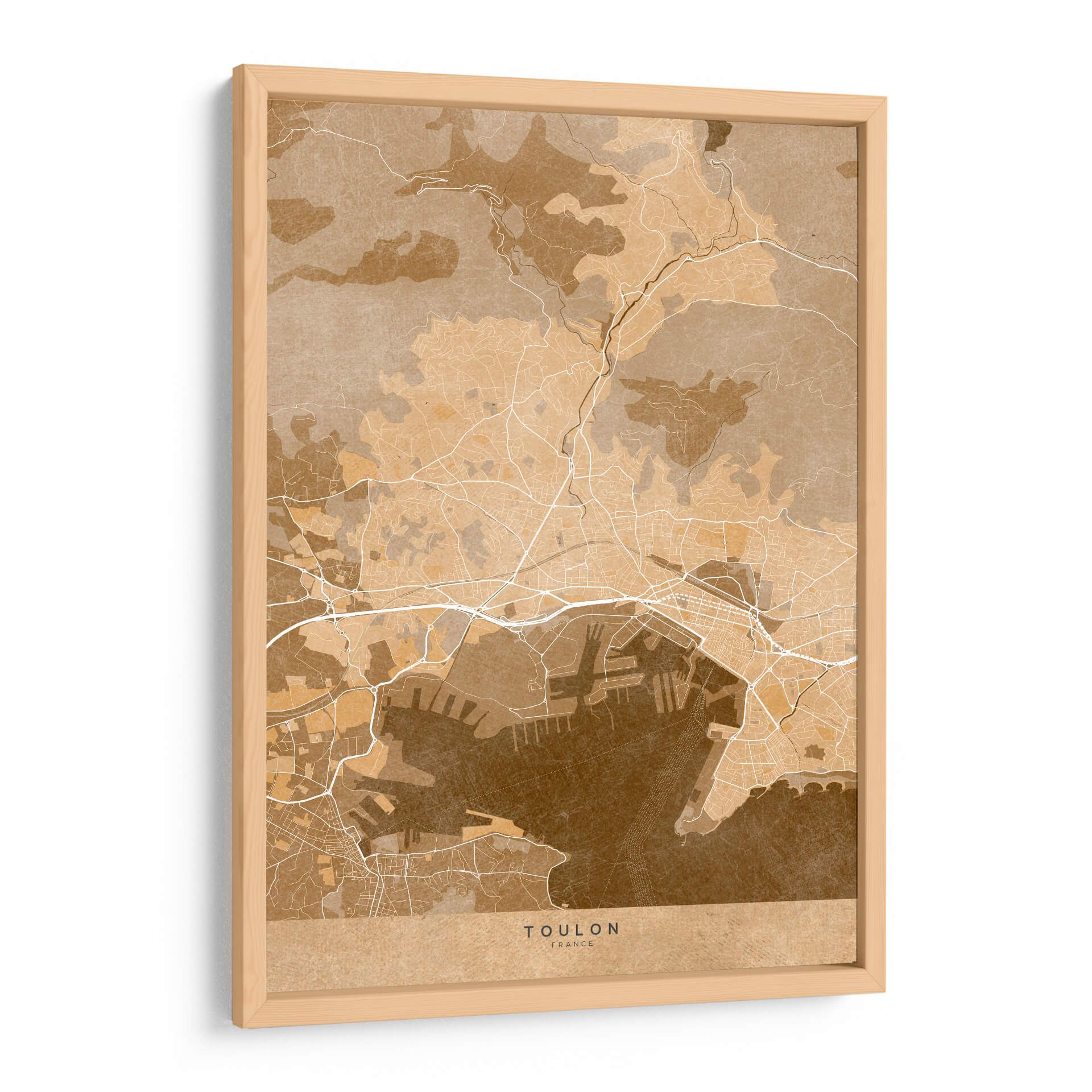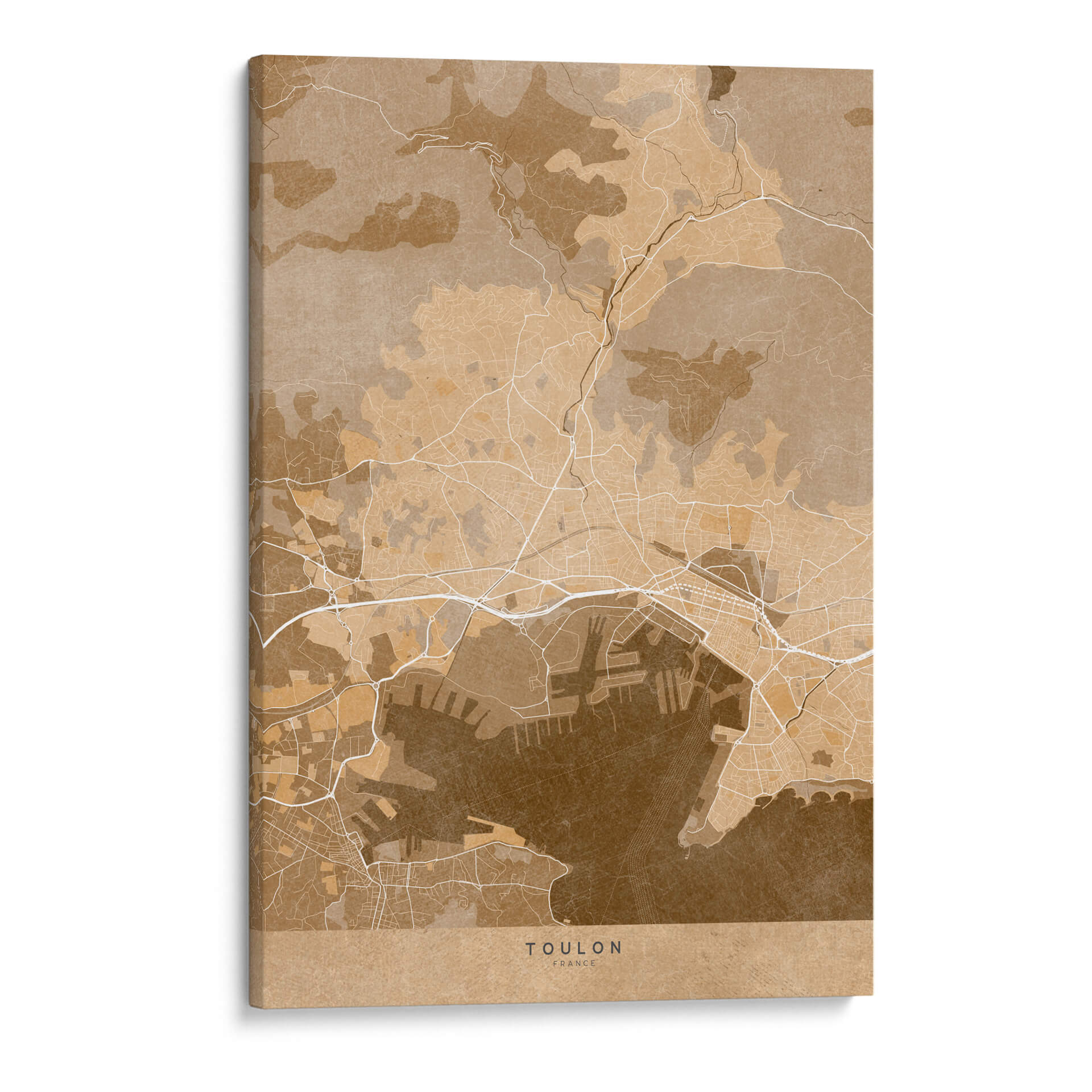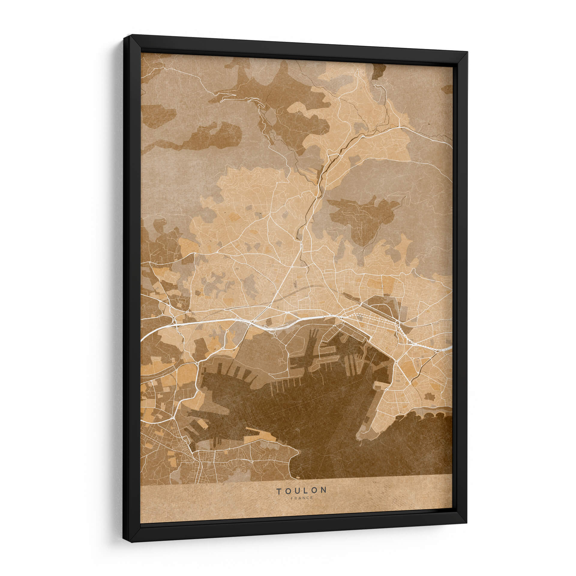 Transporta tu imaginación a la costa mediterránea con este evocador cuadro decorativo de Toulon, Francia, presentado en un cálido estilo vintage sepia. La obra de Rosana Laiz Blursbyai captura la intrincada red de calles, el bullicioso puerto y la topografía circundante de esta histórica ciudad francesa, todo ello renderizado con una paleta de colores terrosos y sepia que emana una sensación de nostalgia y sofisticación. Cada línea y contorno de este mapa estilizado invita a explorar, creando un punto focal único que fomenta la conversación y añade profundidad a cualquier habitación. Perfecto para amantes de la geografía, viajeros y aquellos que aprecian el arte con una narrativa sutil, este cuadro decorativo es ideal para salones, estudios u oficinas donde se desee un toque de elegancia atemporal y un guiño al encanto del viejo mundo. Su diseño versátil se integra sin esfuerzo en decoraciones contemporáneas y clásicas, aportando un aire de aventura y descubrimiento. Añade esta pieza distintiva a tu colección de arte de pared y deja que Toulon te inspire cada día.