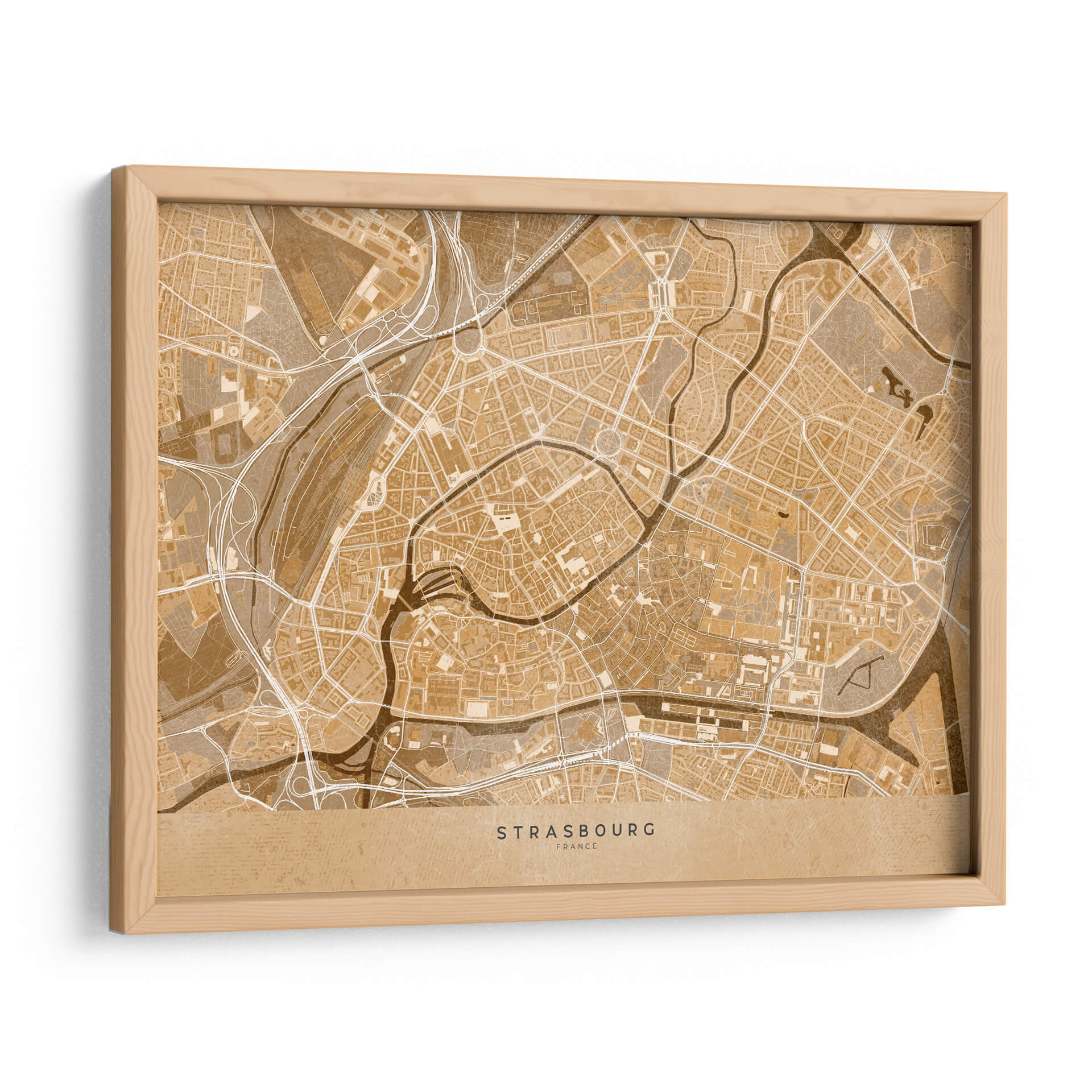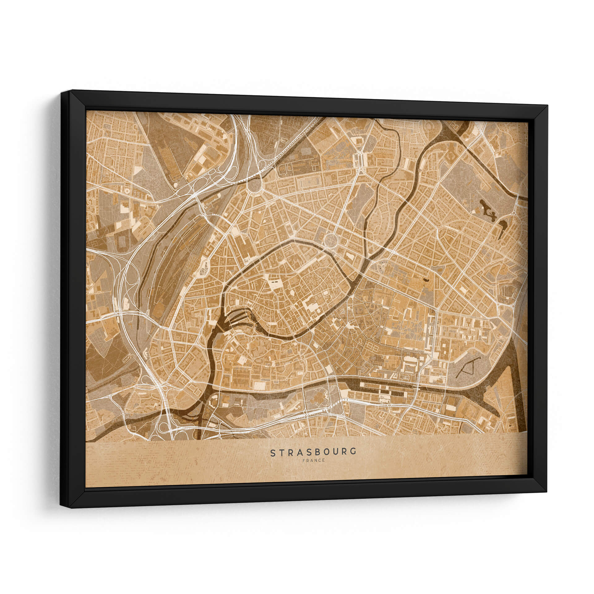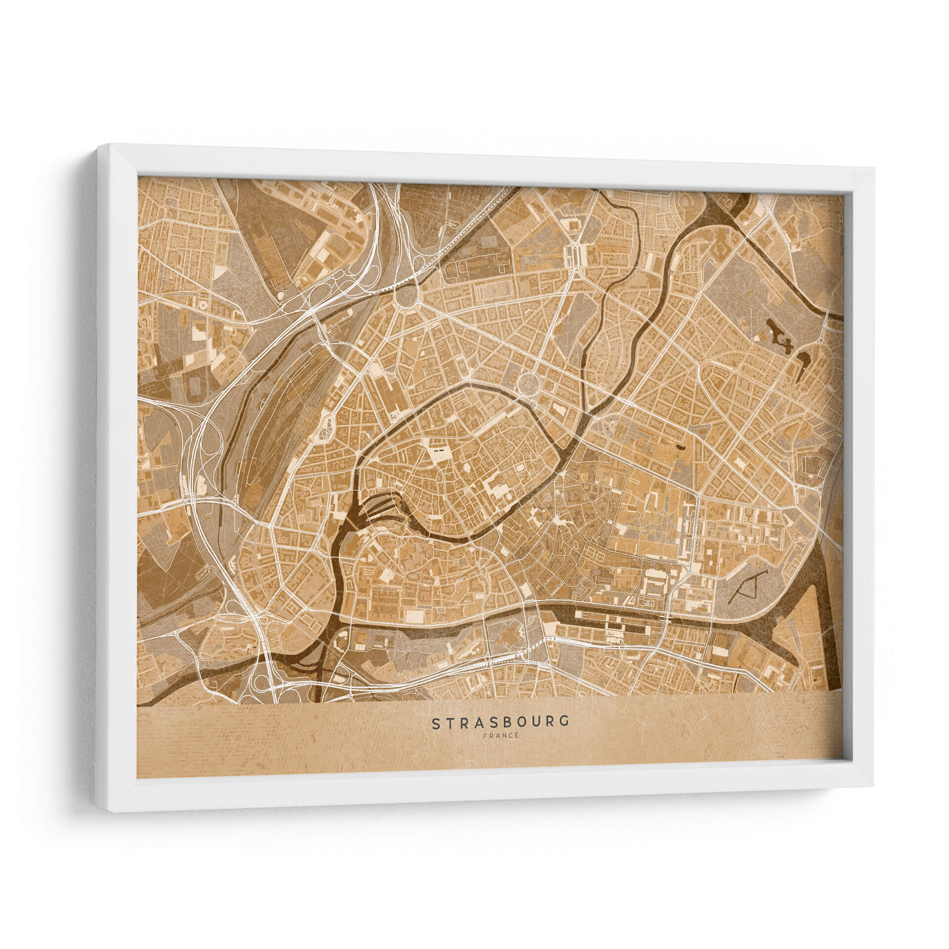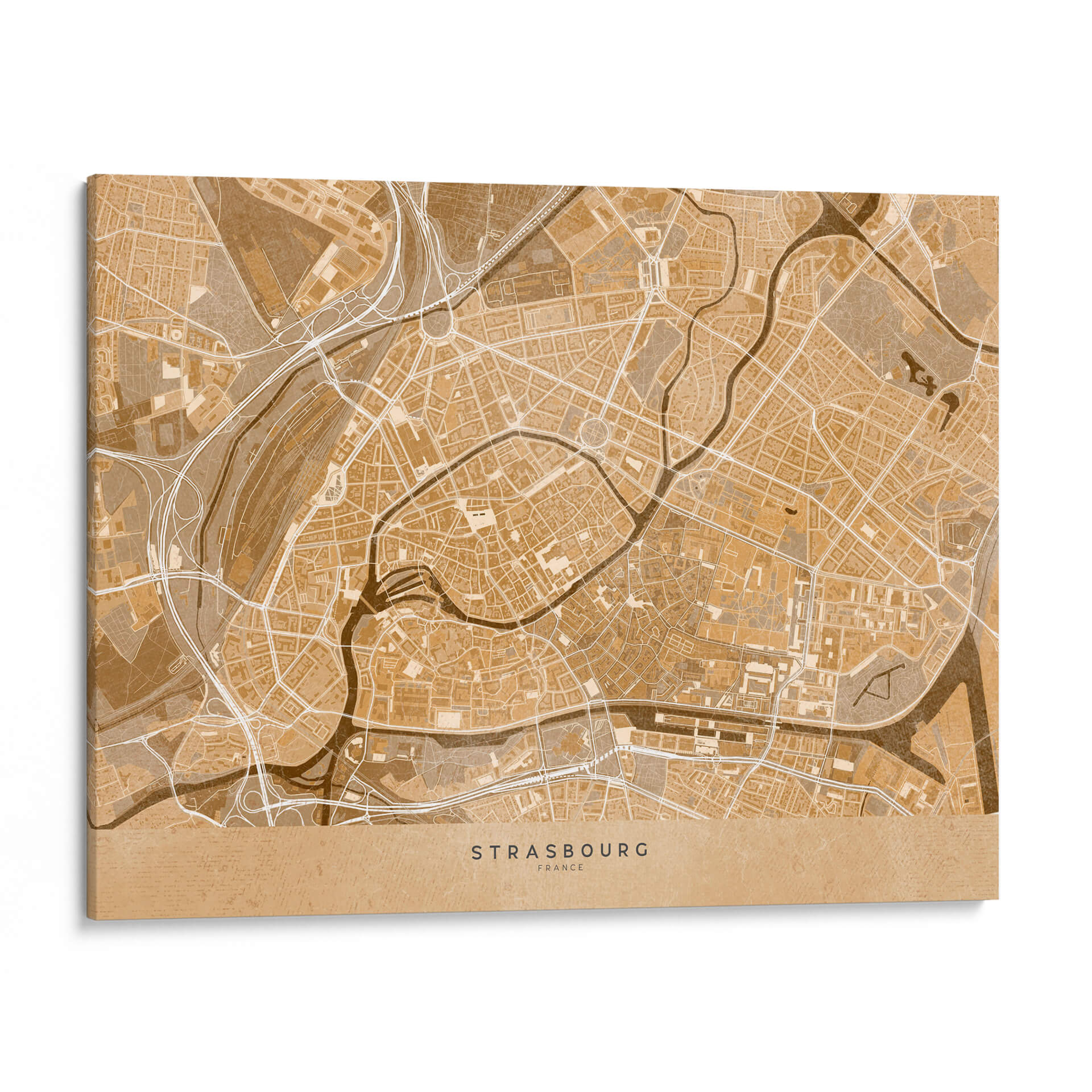 Sumérgete en la esencia de una ciudad histórica con este cautivador mapa vintage sepia del centro de Estrasburgo, Francia. Diseñado por Rosana Laiz Blursbyai, este cuadro decorativo traslada la intrincada red de calles, ríos sinuosos y la arquitectura detallada de esta joya alsaciana a tu espacio. La paleta de colores en tonos sepia evoca una sensación de nostalgia y calidez, perfecta para añadir un toque de elegancia atemporal a cualquier habitación. Su estilo gráfico y detallado, que recuerda a los mapas antiguos, lo convierte en una pieza de conversación única. Ideal para amantes de la geografía, viajeros empedernidos o cualquiera que aprecie el diseño sofisticado y la conexión con lugares significativos. Este mapa de Estrasburgo es una ventana a la historia y la cultura, aportando carácter y profundidad a tu sala de estar, oficina o dormitorio. Transforma tus paredes con esta obra que combina arte, historia y estilo de una manera incomparable, creando un ambiente acogedor y lleno de personalidad. Es una adición perfecta para quienes buscan decorar con piezas que cuenten una historia y evocan un sentido de aventura y pertenencia.