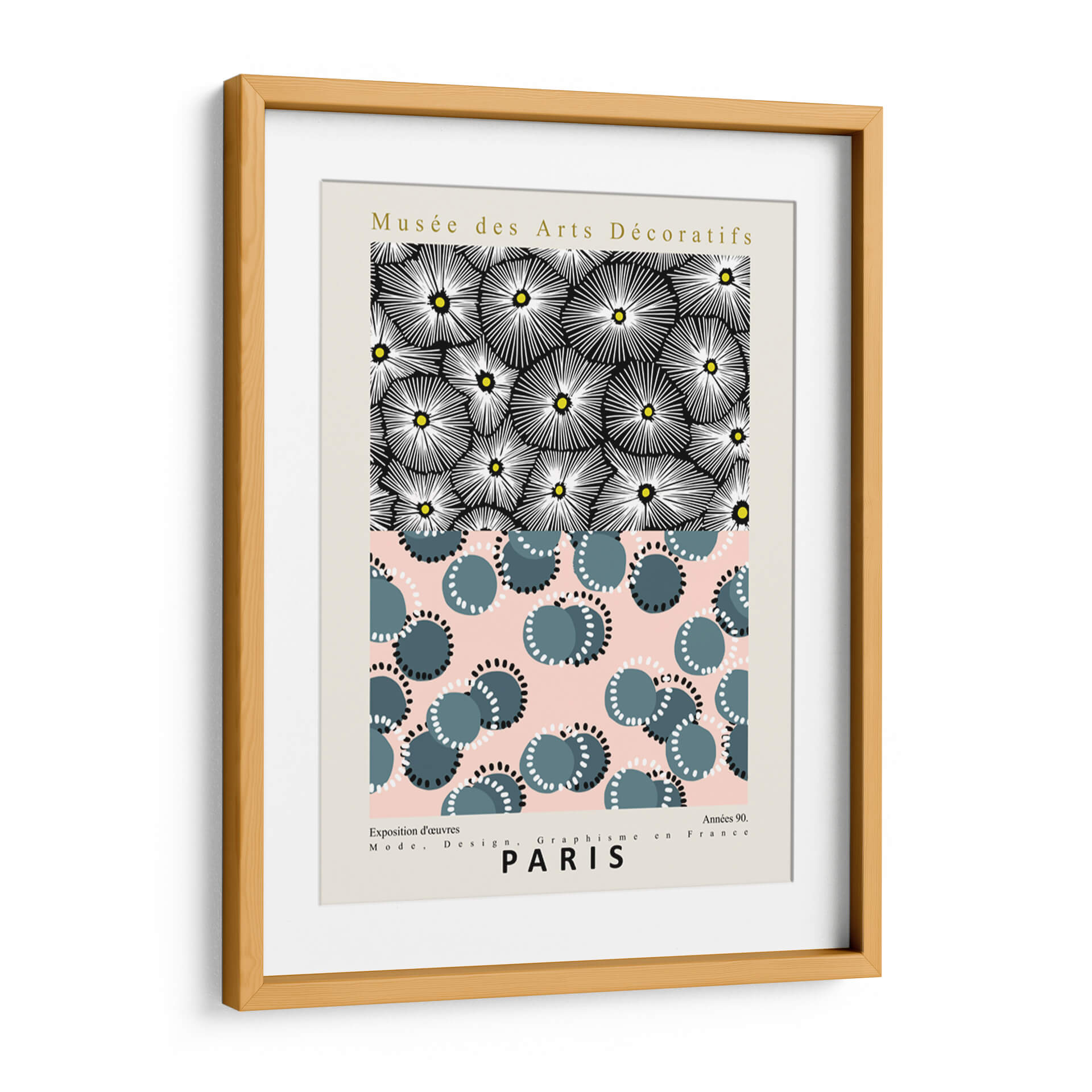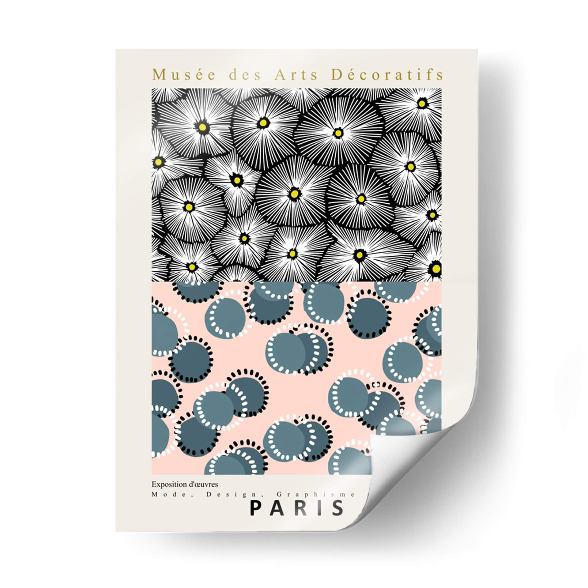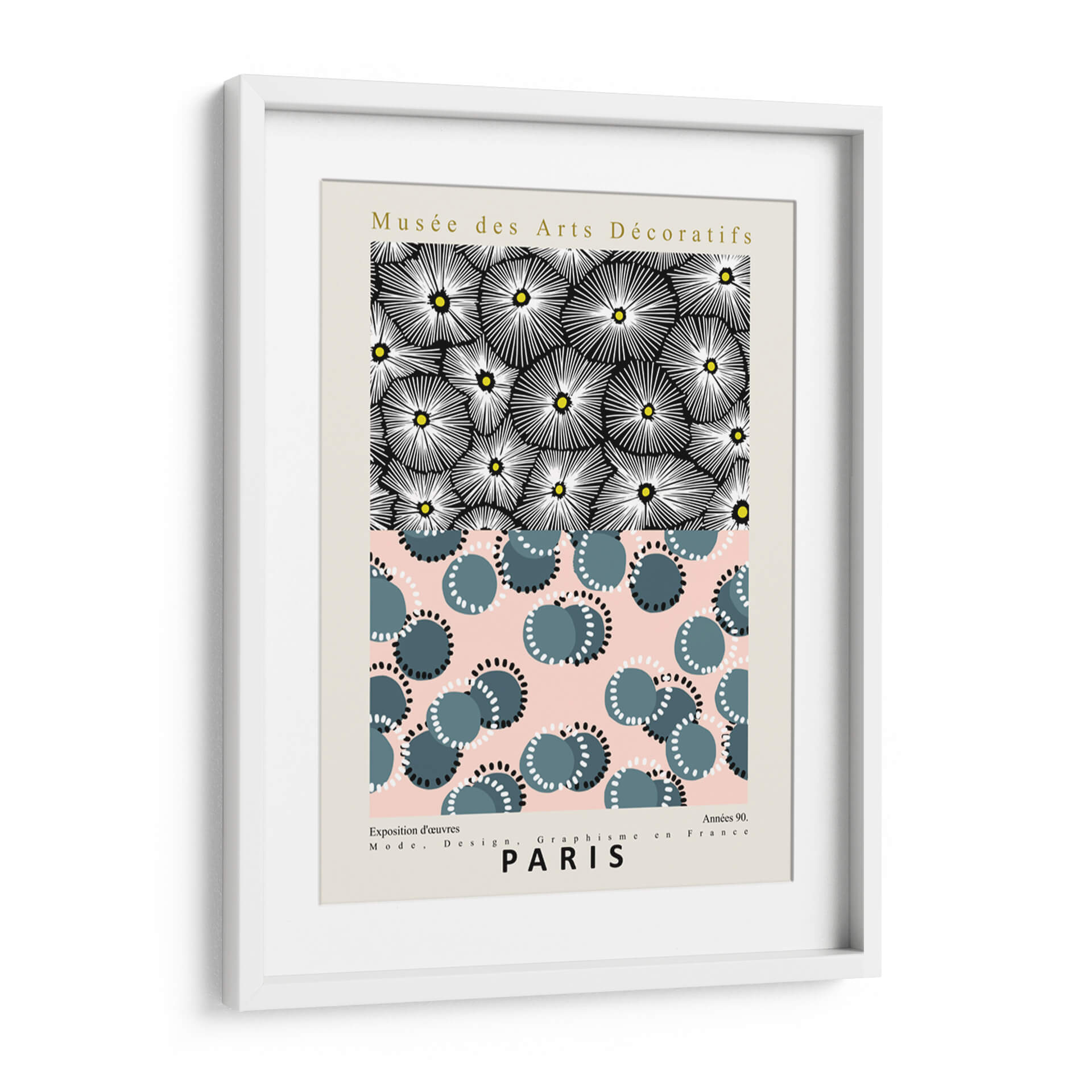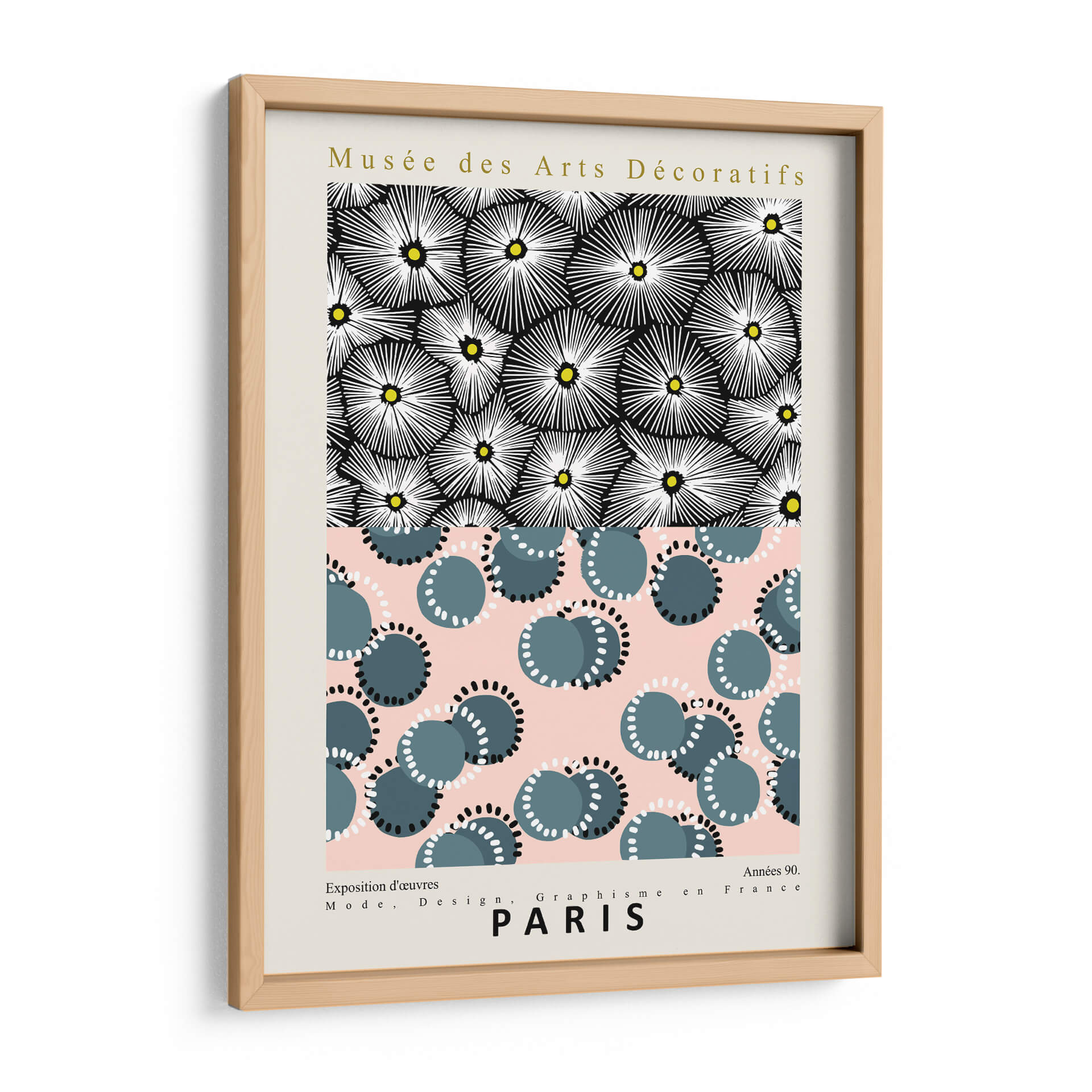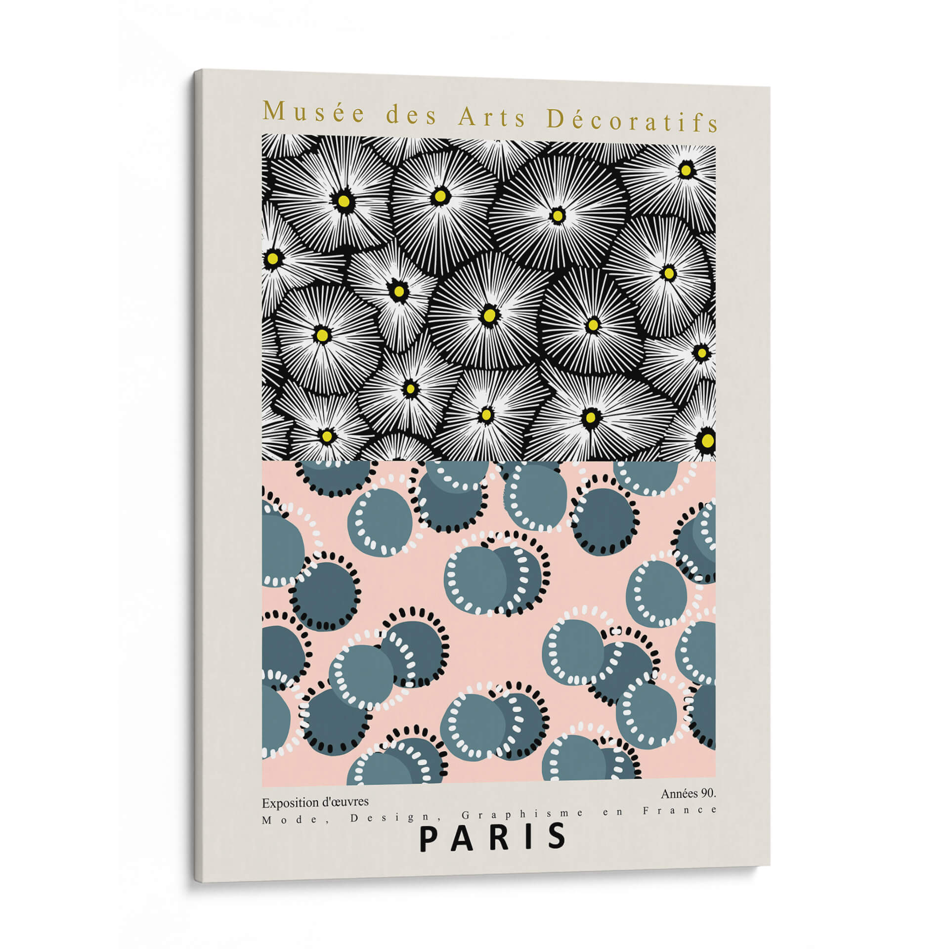 Este vibrante cuadro decorativo, inspirado en el Musée des Arts Décoratifs de París y la década de los 90, fusiona el diseño gráfico con la moda y el arte. La obra se divide en dos secciones contrastantes: la superior presenta un patrón repetitivo de figuras blancas con centros amarillos sobre un fondo negro, evocando la delicadeza de las flores o estrellas estilizadas. La sección inferior, sobre un suave fondo rosa, despliega formas orgánicas en tonos azulados, rodeadas de pequeños puntos blancos y negros, sugiriendo una sensación lúdica y moderna. La composición general es audaz y gráfica, con un fuerte contraste visual que atrae la mirada. Los elementos repetitivos y la paleta de colores equilibrada entre el blanco, negro, rosa y azul crean una pieza dinámica que puede añadir un toque de sofisticación y originalidad a cualquier espacio, ya sea una sala de estar contemporánea, una oficina de diseño o un dormitorio con estilo. Es una obra que celebra la estética del diseño gráfico y la efervescencia creativa de París en los años noventa, perfecta para quienes buscan una decoración de pared con carácter y un guiño a la historia del arte aplicado.
