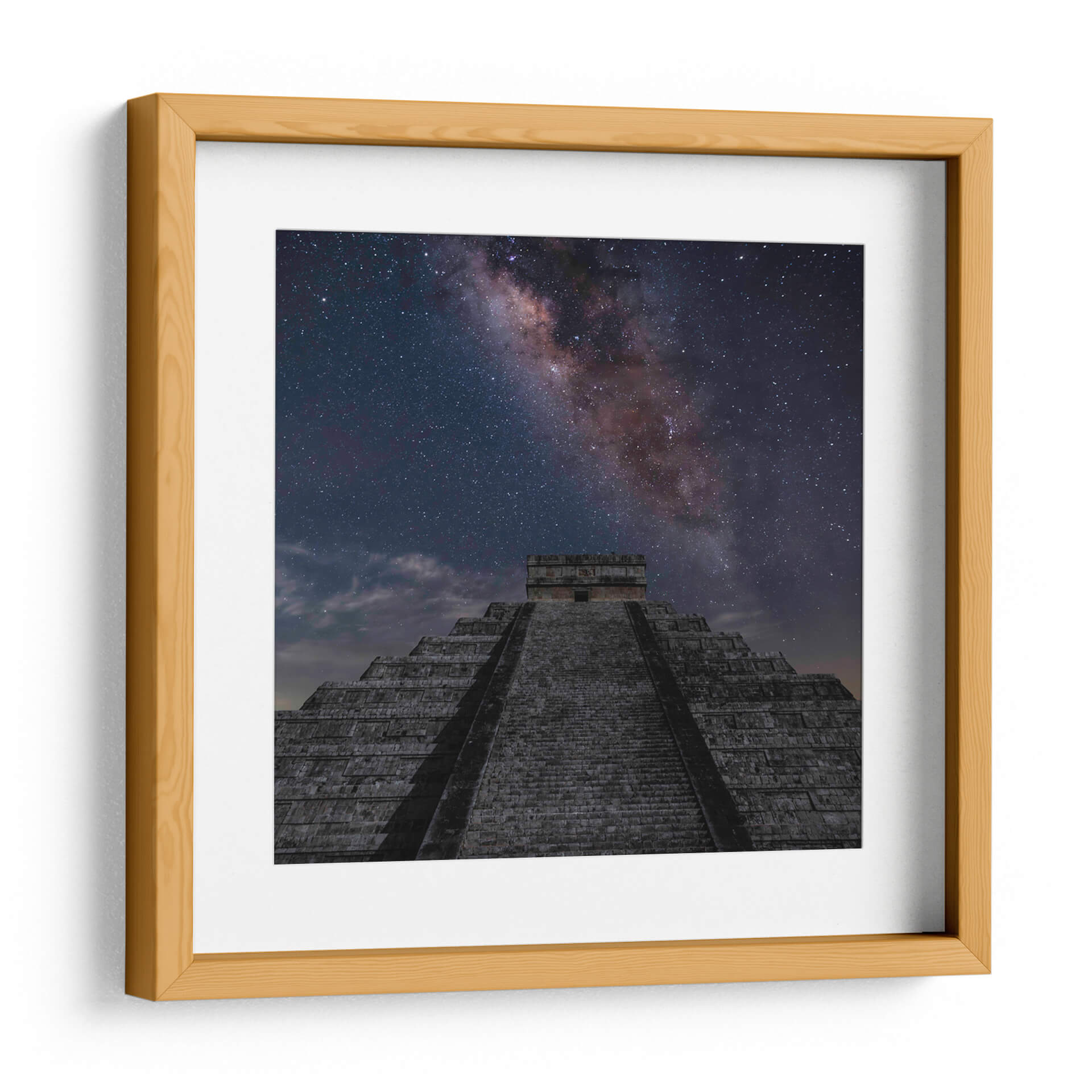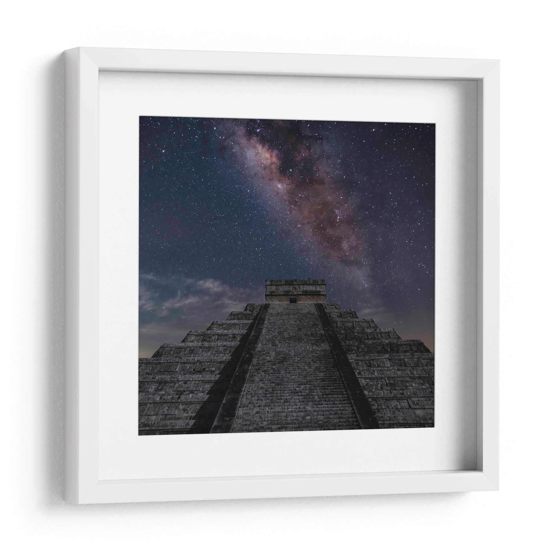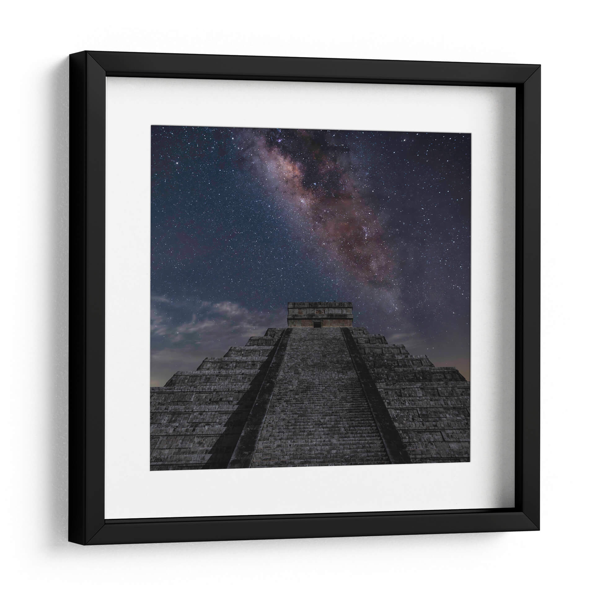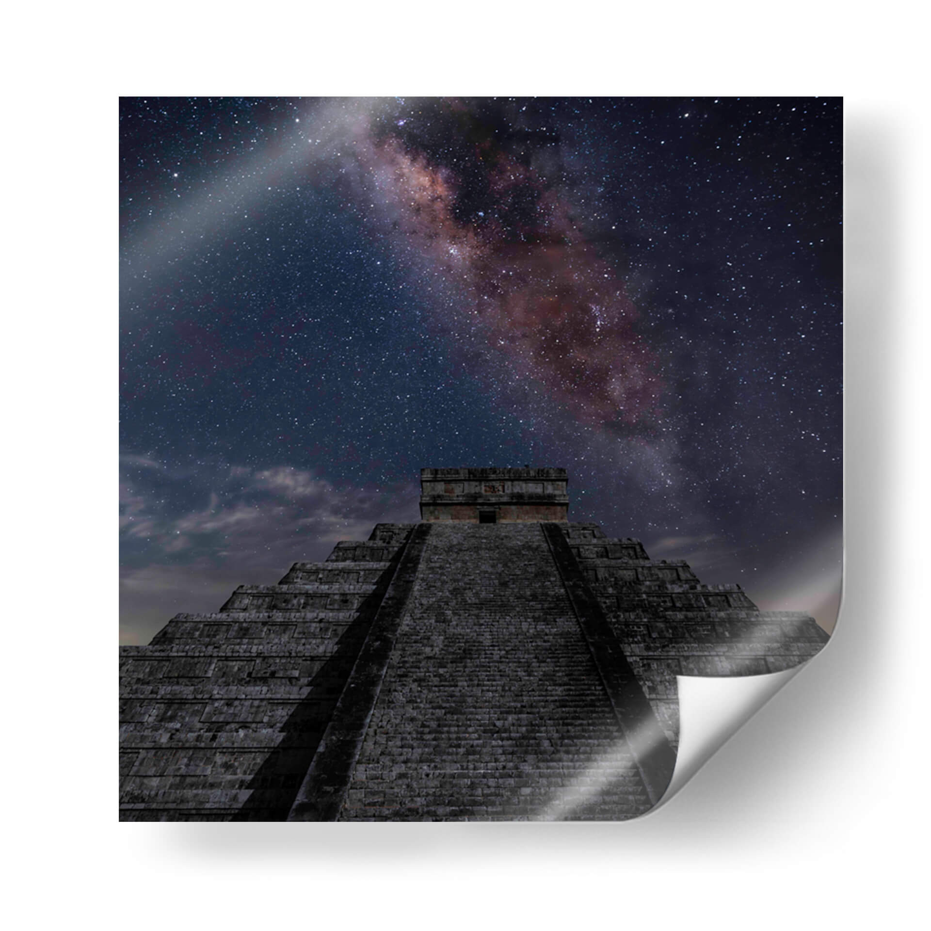Sumérgete en la majestuosidad del cosmos y la historia con este cautivador cuadro decorativo, "Pirámide de Kukulcán 02". La obra transporta al espectador a una noche estrellada, donde la imponente estructura de la pirámide se alza bajo un cielo nocturno espectacular, atravesado por la Vía Láctea en todo su esplendor. Los tonos oscuros y profundos del cielo, salpicados de innumerables estrellas brillantes y las nebulosas de color rojizo y violeta de la galaxia, crean un contraste dramático con las texturas de piedra grisácea de la antigua edificación. La composición, que asciende desde la base de la pirámide hacia el infinito estrellado, evoca una sensación de asombro, misterio y la conexión entre la humanidad y el universo. Este cuadro decorativo es ideal para inspirar reflexión y añadir un toque de grandeza a cualquier espacio, ya sea una sala de estar moderna, un estudio o una oficina que busque un punto focal único y evocador. La paleta de colores, dominada por el azul profundo, el negro, el gris y los toques cálidos de la Vía Láctea, se integra armónicamente en diversos estilos decorativos, aportando profundidad y un aire de sofisticación cósmica.