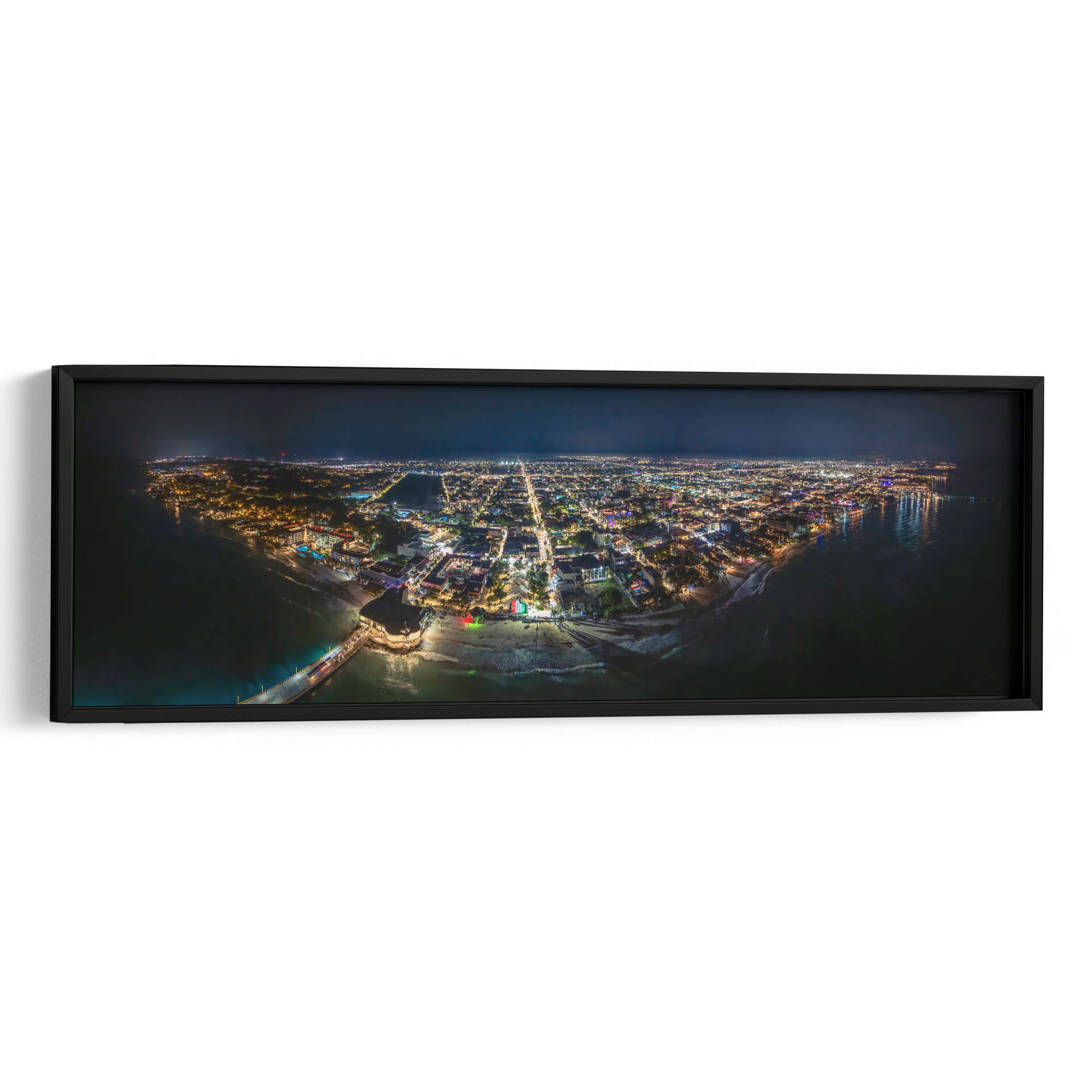Captura la vibrante energía de Playa del Carmen al anochecer con este impresionante cuadro decorativo panorámico. La obra maestra de Fernando Lopez te transporta a la Riviera Maya, sumergiéndote en un mar de luces que dan vida a la costa. Desde una perspectiva aérea, se despliega una vista espectacular de la ciudad iluminada, con el resplandor de los edificios, las calles y el paseo marítimo reflejándose en el oscuro océano. Los tonos azules profundos del mar contrastan con las cálidas luces amarillas, naranjas y blancas de la urbe, creando una atmósfera de sofisticación y vida nocturna. La composición panorámica amplifica la sensación de amplitud y detalle, permitiendo apreciar la extensión de este paraíso caribeño. Este cuadro decorativo es ideal para añadir un toque de modernidad y escapismo a tu sala de estar, oficina o dormitorio, evocando la magia de las vacaciones y el encanto de un destino exótico. Transforma tu espacio en un santuario de recuerdos y sueños con esta fotografía nocturna de Playa del Carmen, una pieza que habla de aventura y serenidad a partes iguales.