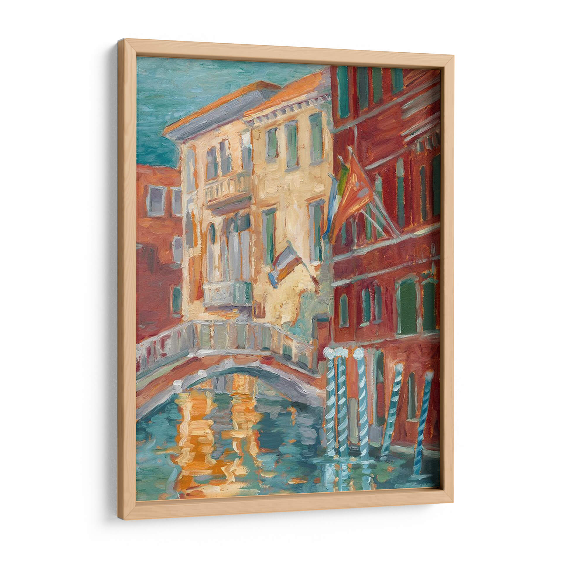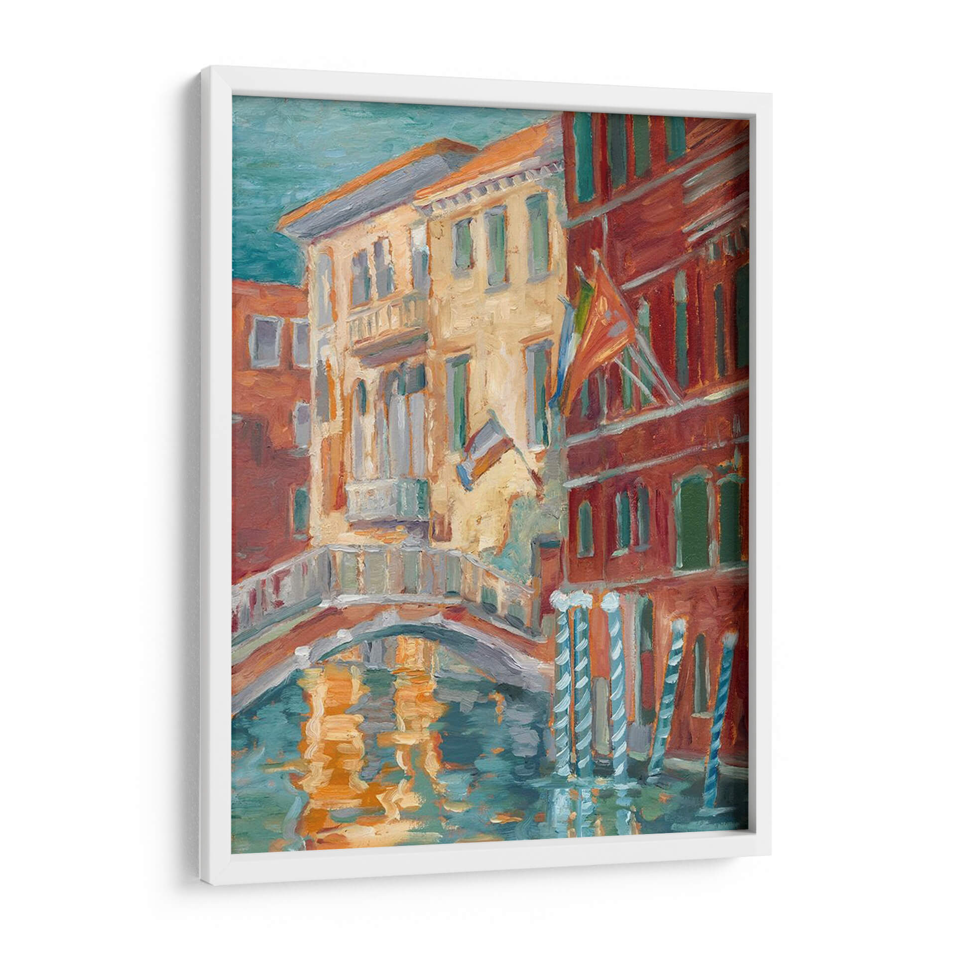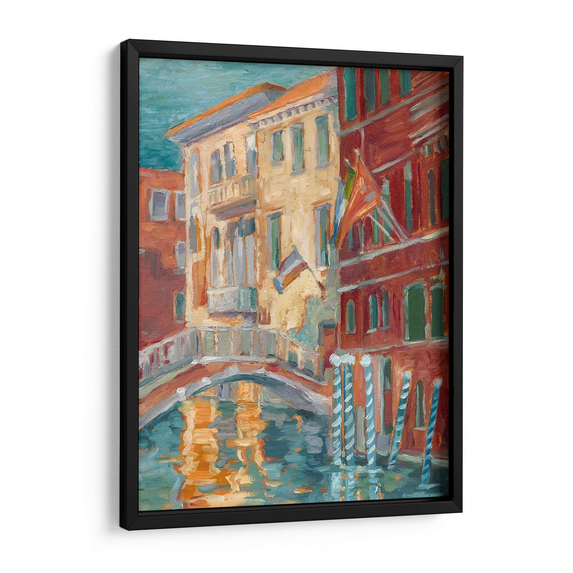 Sumérgete en la vibrante atmósfera de "Puesta De Sol En El Canal I", una obra de Ethan Harper que captura la esencia de un pintoresco canal veneciano al atardecer. Los cálidos tonos ocres y rojizos de los edificios históricos contrastan maravillosamente con el azul verdoso del agua, creando una paleta de colores rica y envolvente. La técnica impresionista del artista da vida a las fachadas detalladas y al reflejo danzante de la luz sobre la superficie del canal, evocando una sensación de calma y nostalgia. Este cuadro decorativo es perfecto para añadir un toque de encanto europeo y sofisticación a cualquier hogar u oficina. Imagina este lienzo aportando serenidad a tu sala de estar o creando un punto focal inspirador en tu estudio. La composición, con su puente arqueado y la textura evocadora de la pintura, invita a la contemplación y transporta al espectador a un momento de tranquilidad atemporal, ideal para quienes buscan arte que transmita calidez y belleza.